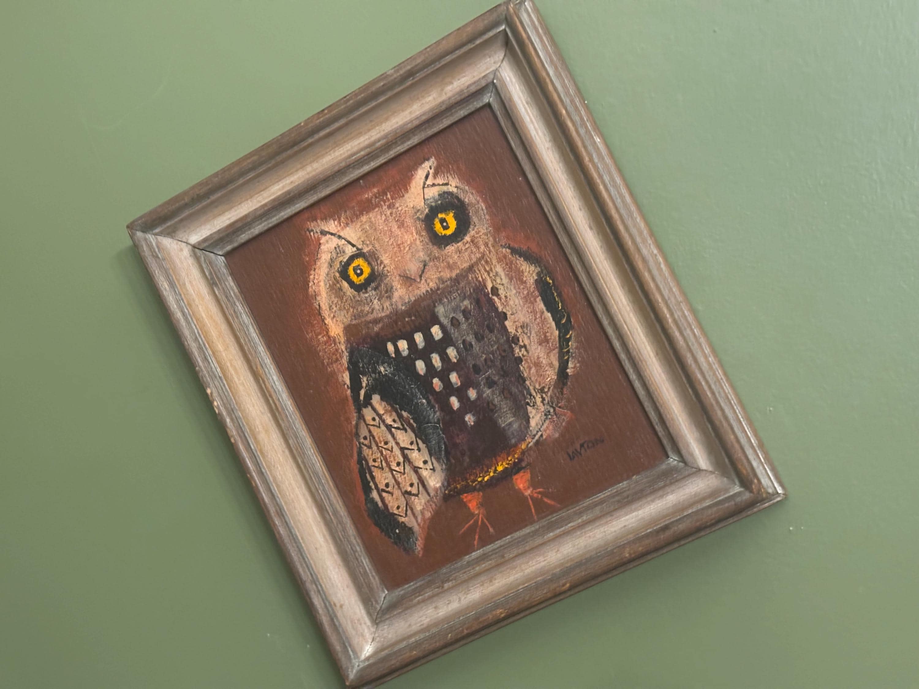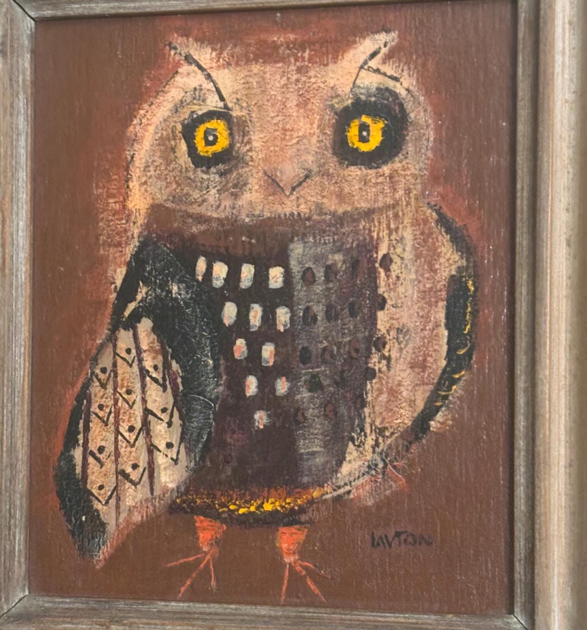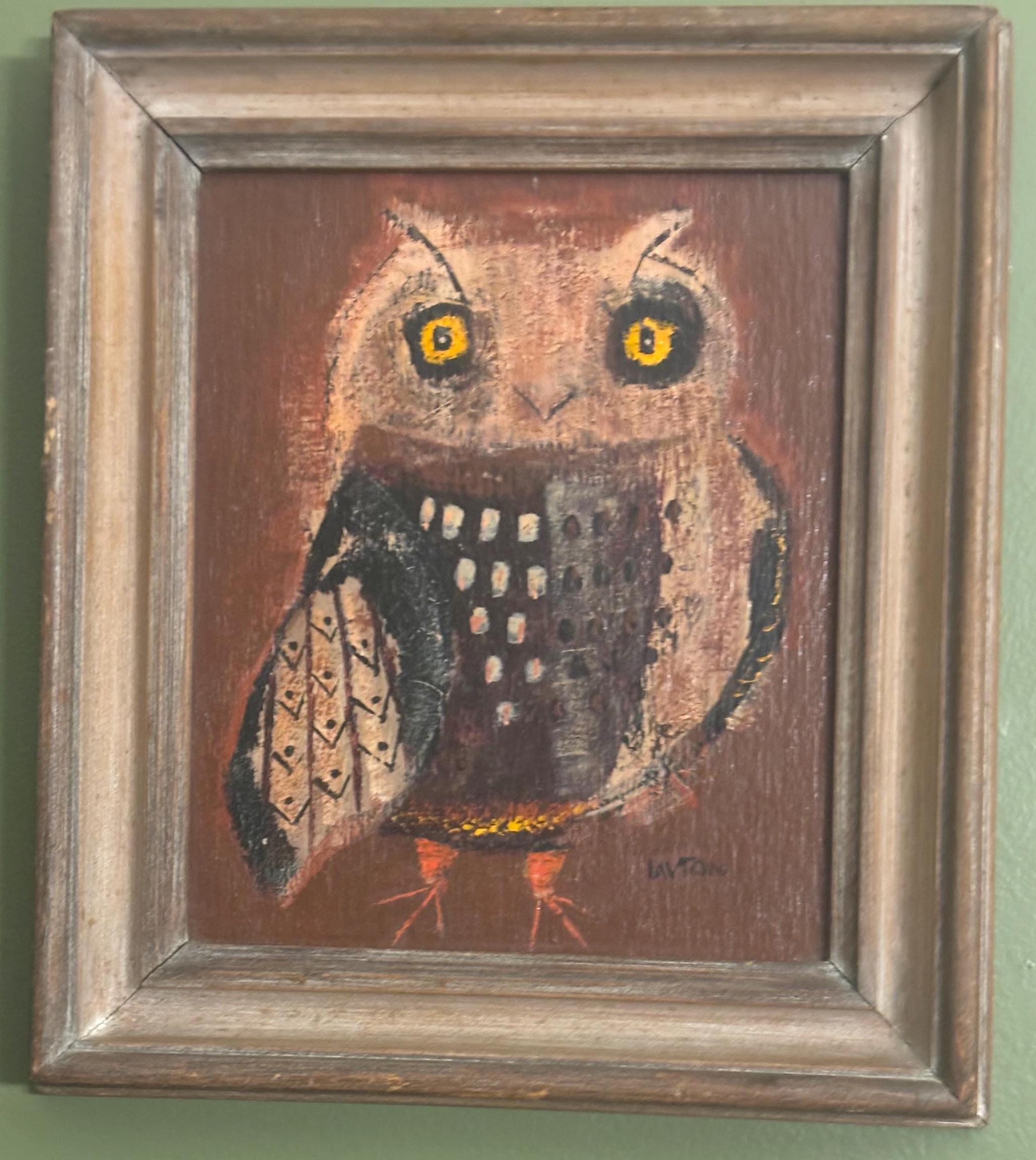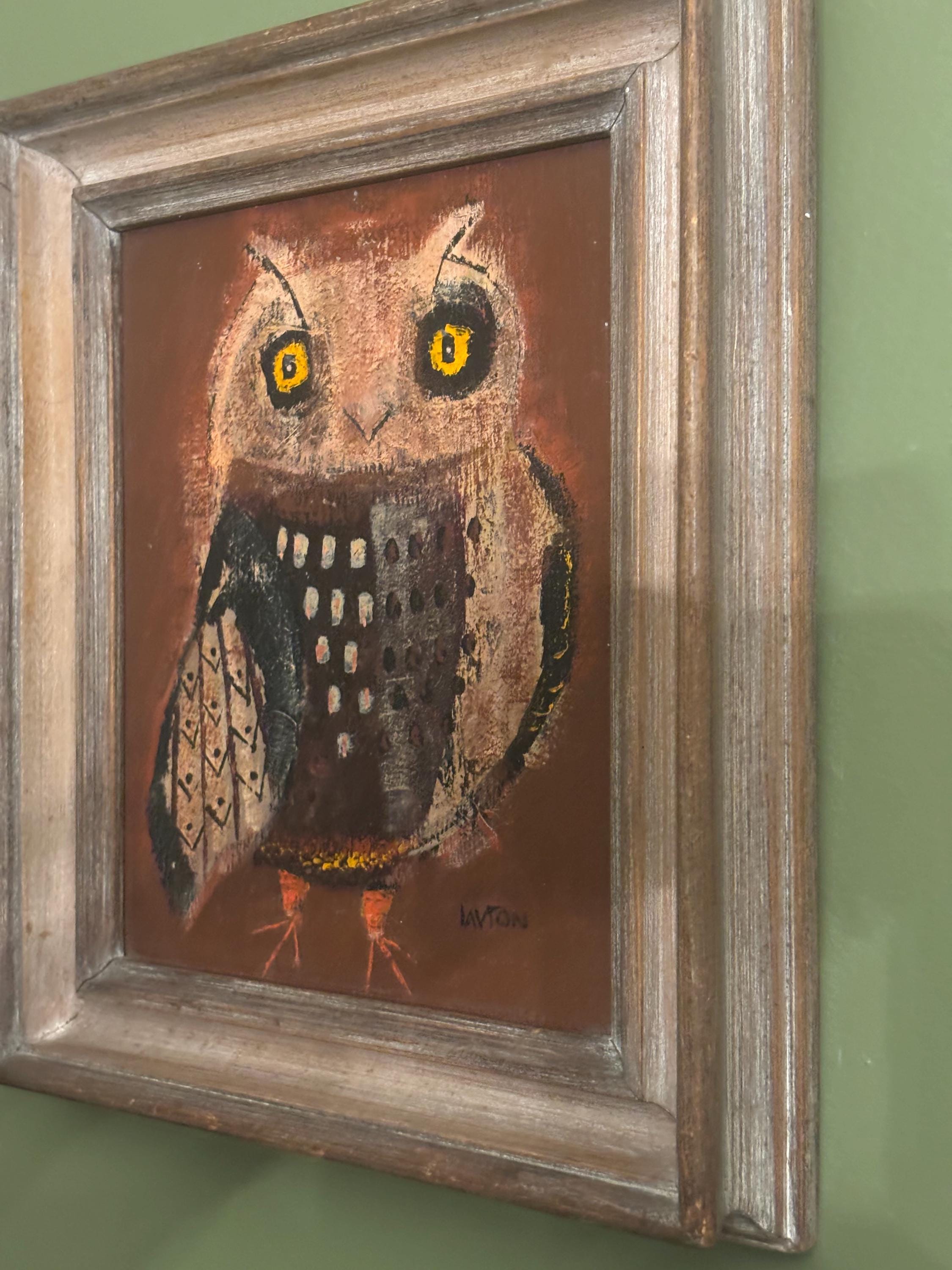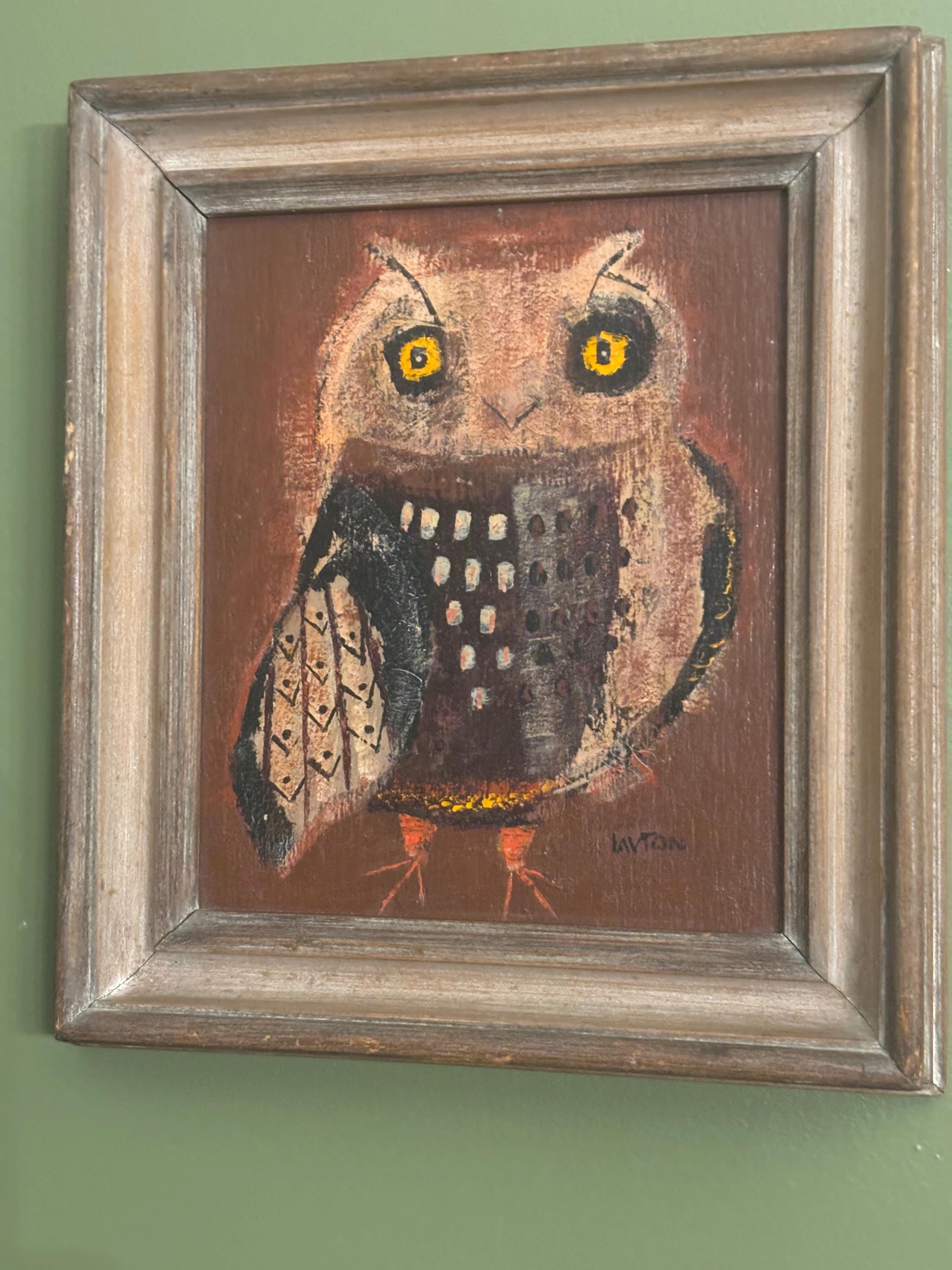 We are delighted to be featuring this Vintage "Winky Owl" by Margaret Layton. It appears to be an original, framed painting signed Layton. It measures approximately 20" high, 11 3/4" wide, 1 1/2" deep.