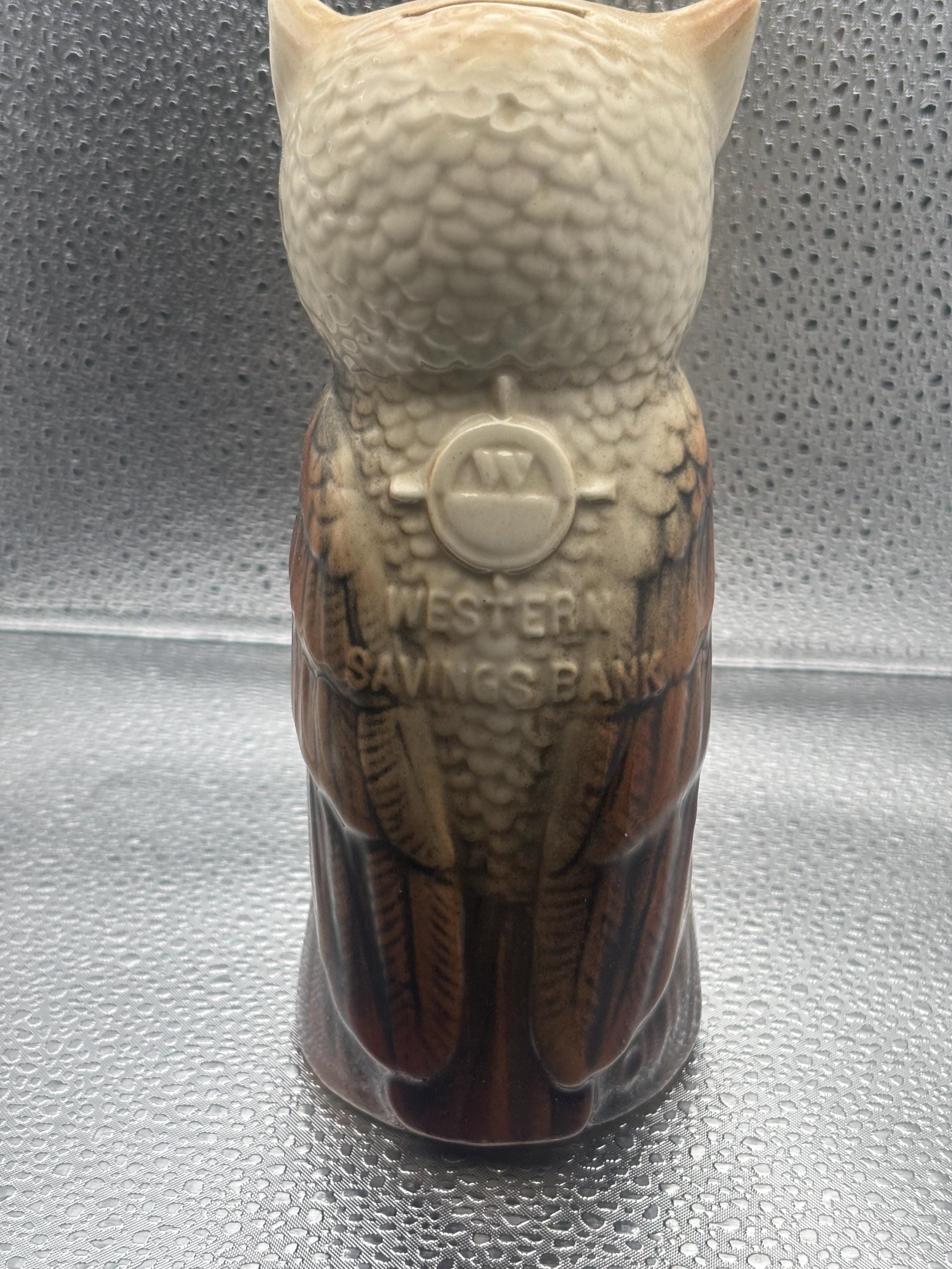 We are delighted to be featuring this Vintage Western Savings Bank Ceramic Owl Bank. It does not have its stopper, as shown in pictures.
