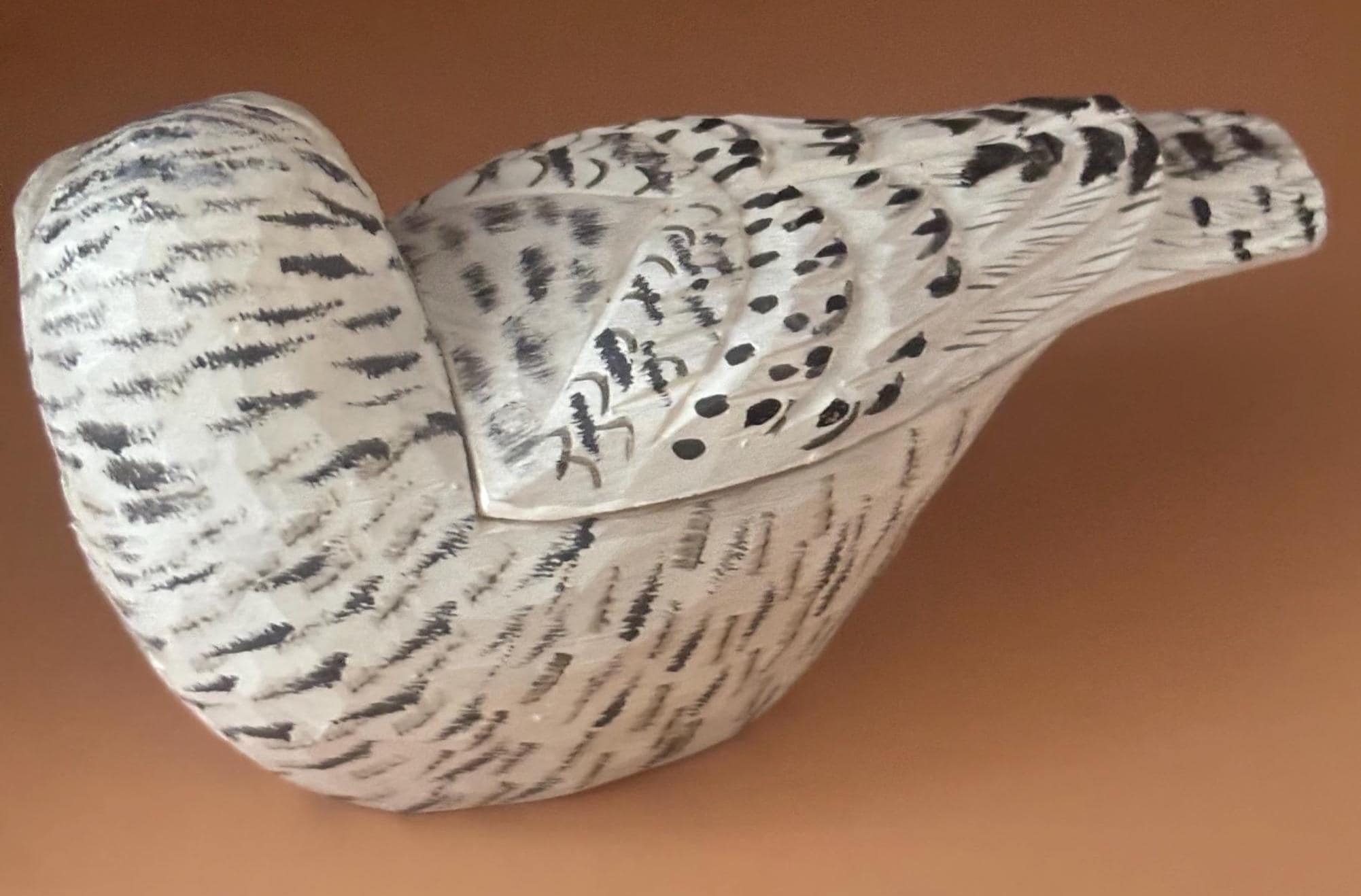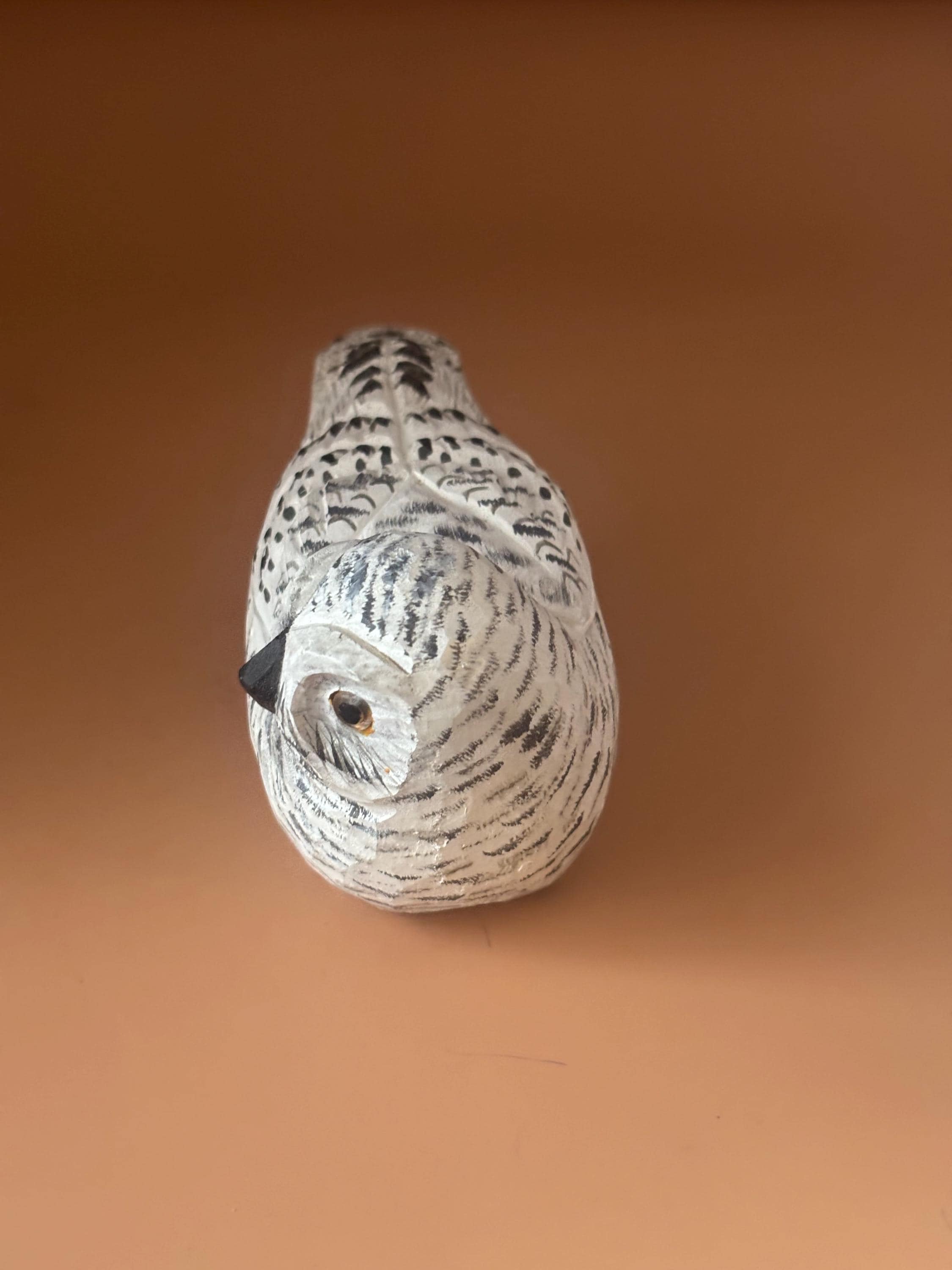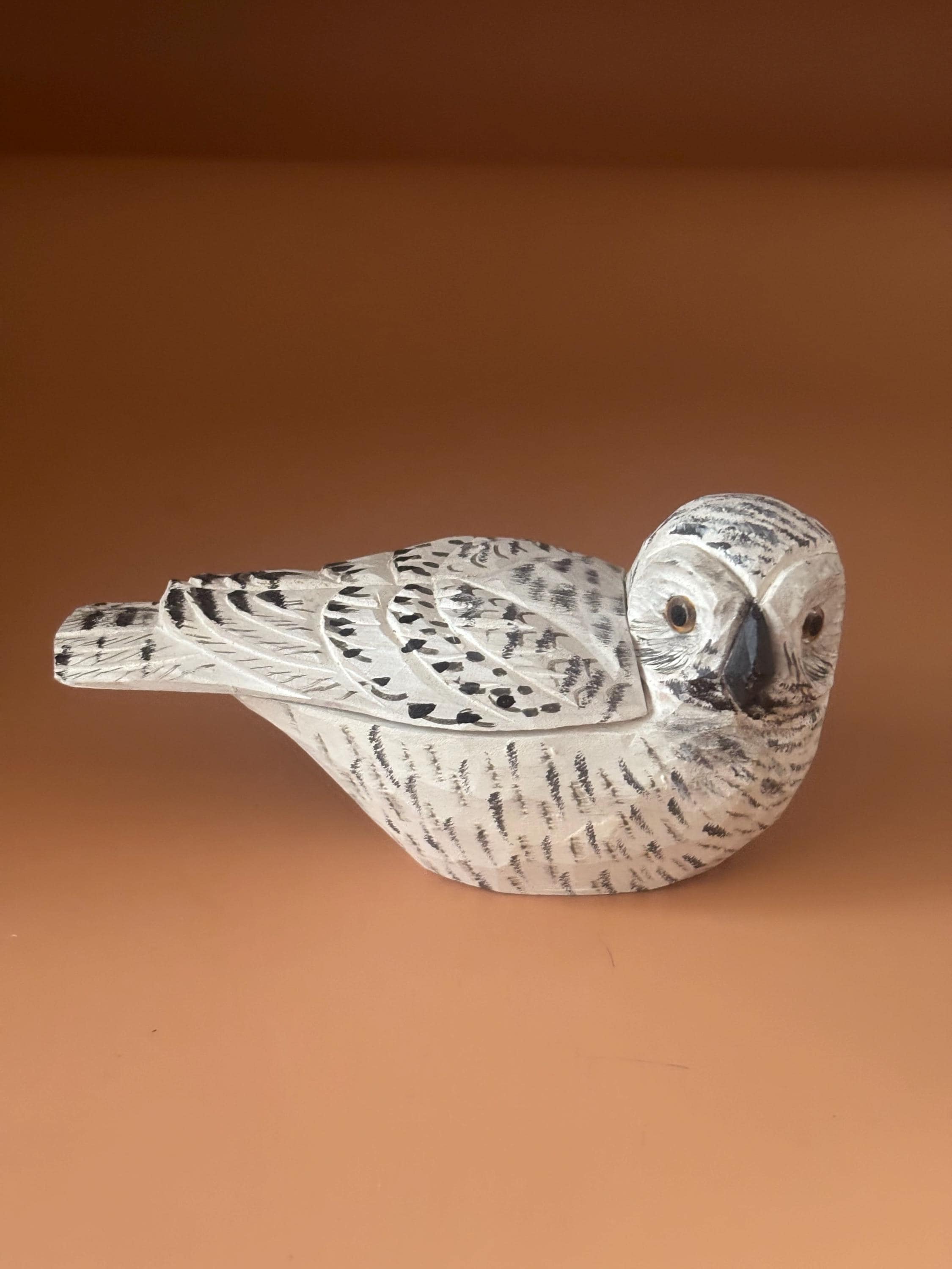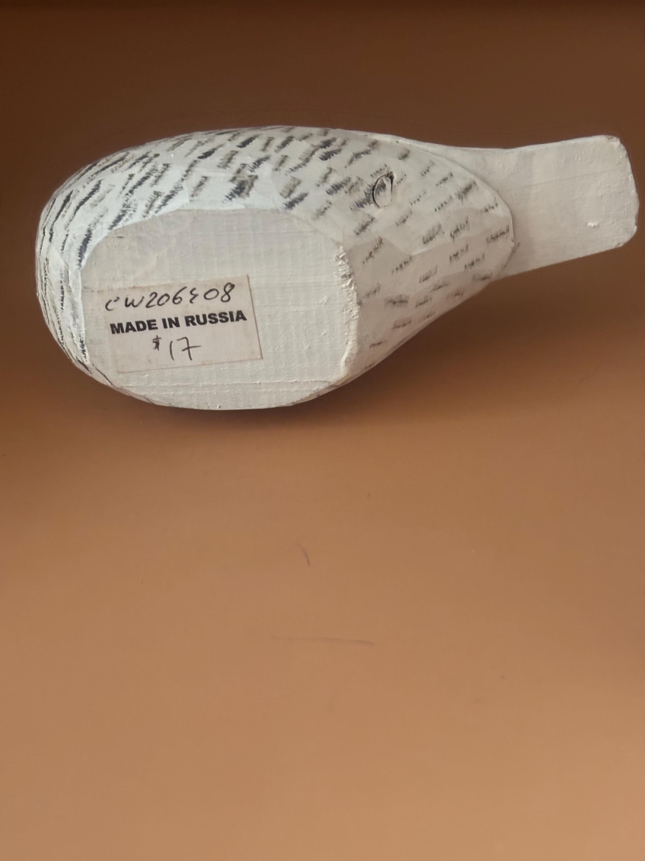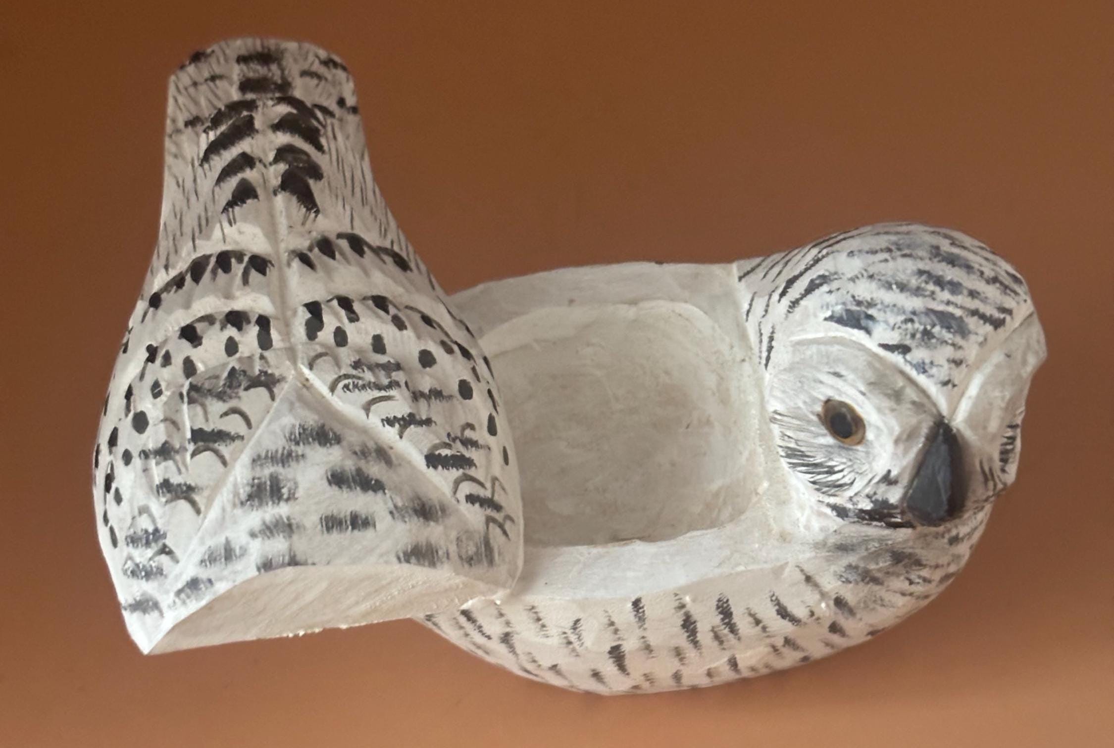 We are delighted to be featuring this Vintage Hand Carved Wooden Snow Owl with Sliding Trinket Box. Hand Painted and in wonderful, original condition. It has its original tag on the bottom. Made in Russia. It measures approximately 5" long, 2 1/4" high.