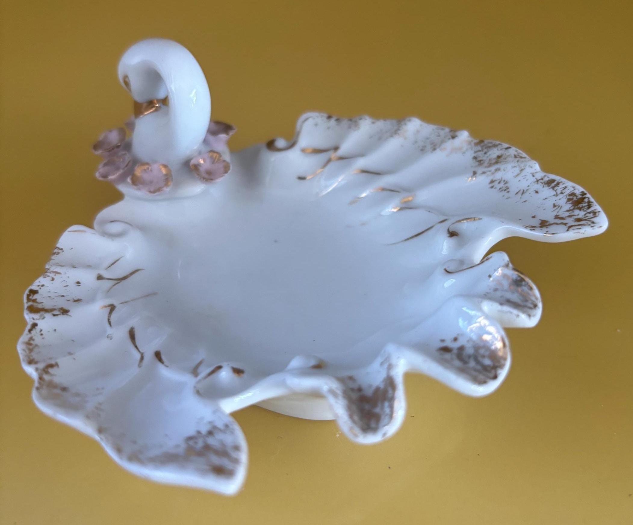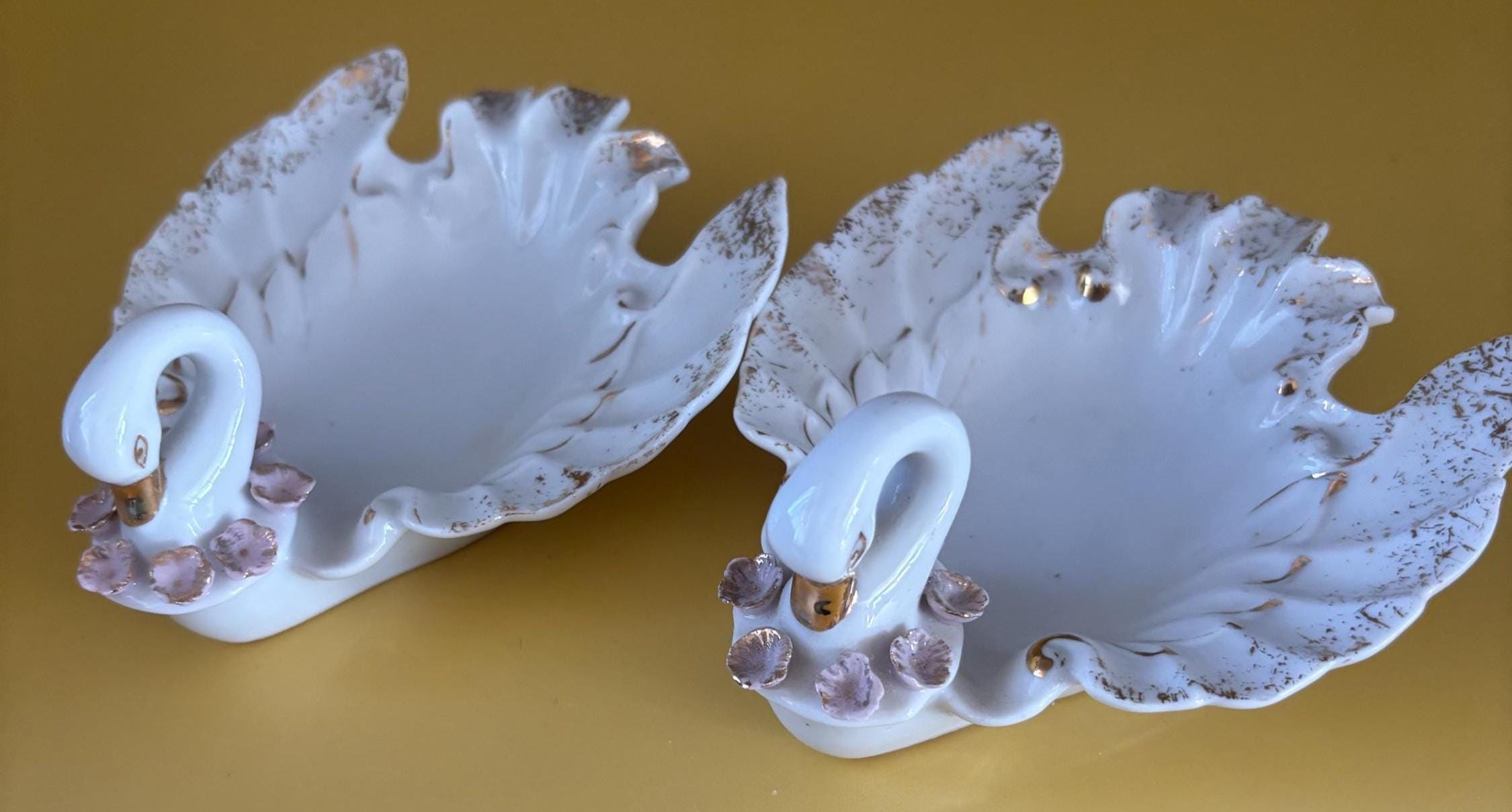 We have a lovely Vintage Swan Trinket Dish by Lefton China. It is numbered 954B. It measues approximately 4" wide, 1" high. This is for ONE, but we have TWO available at this time.