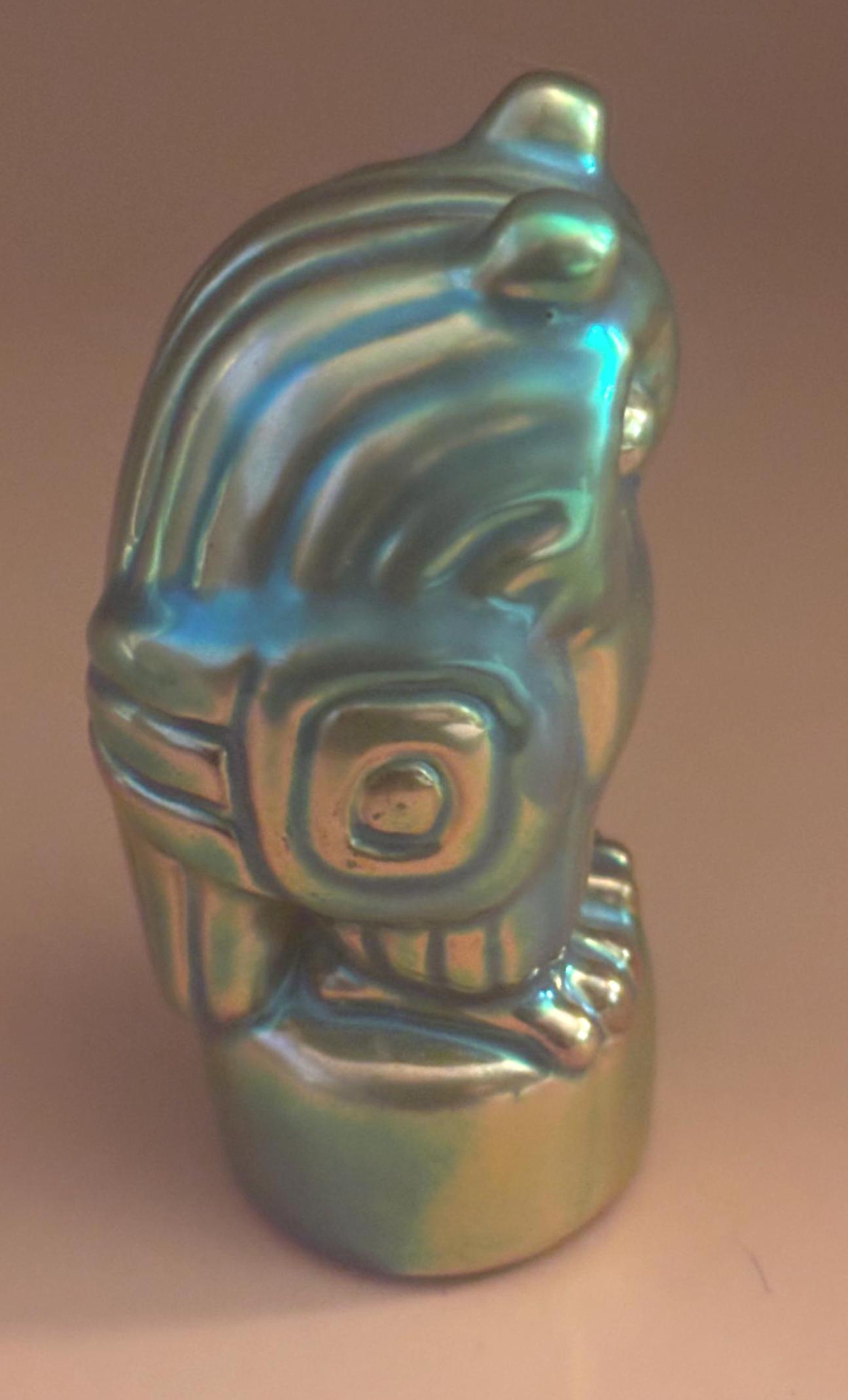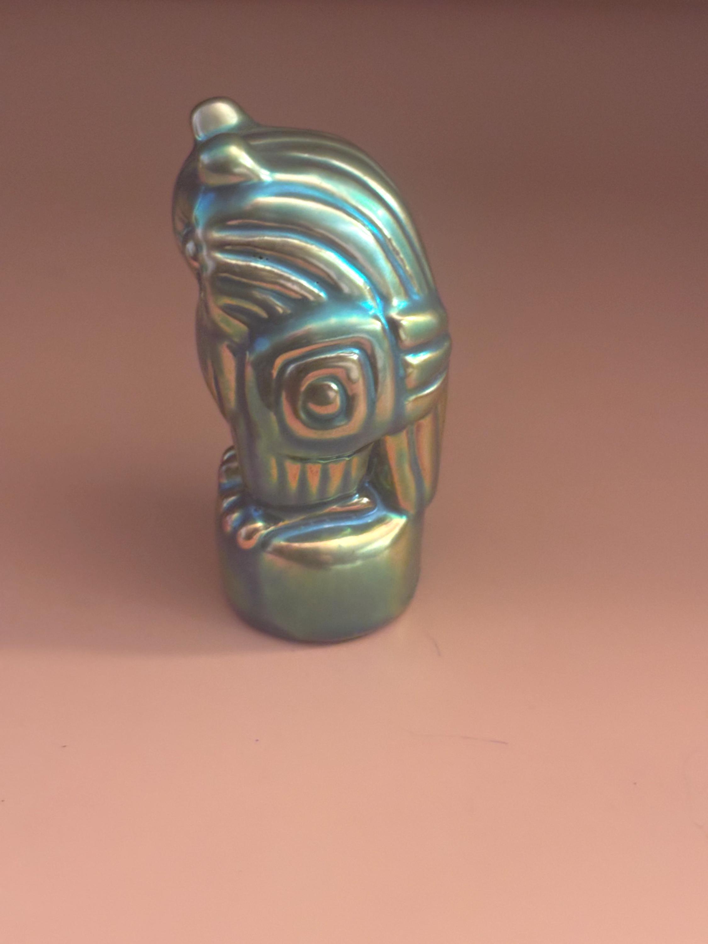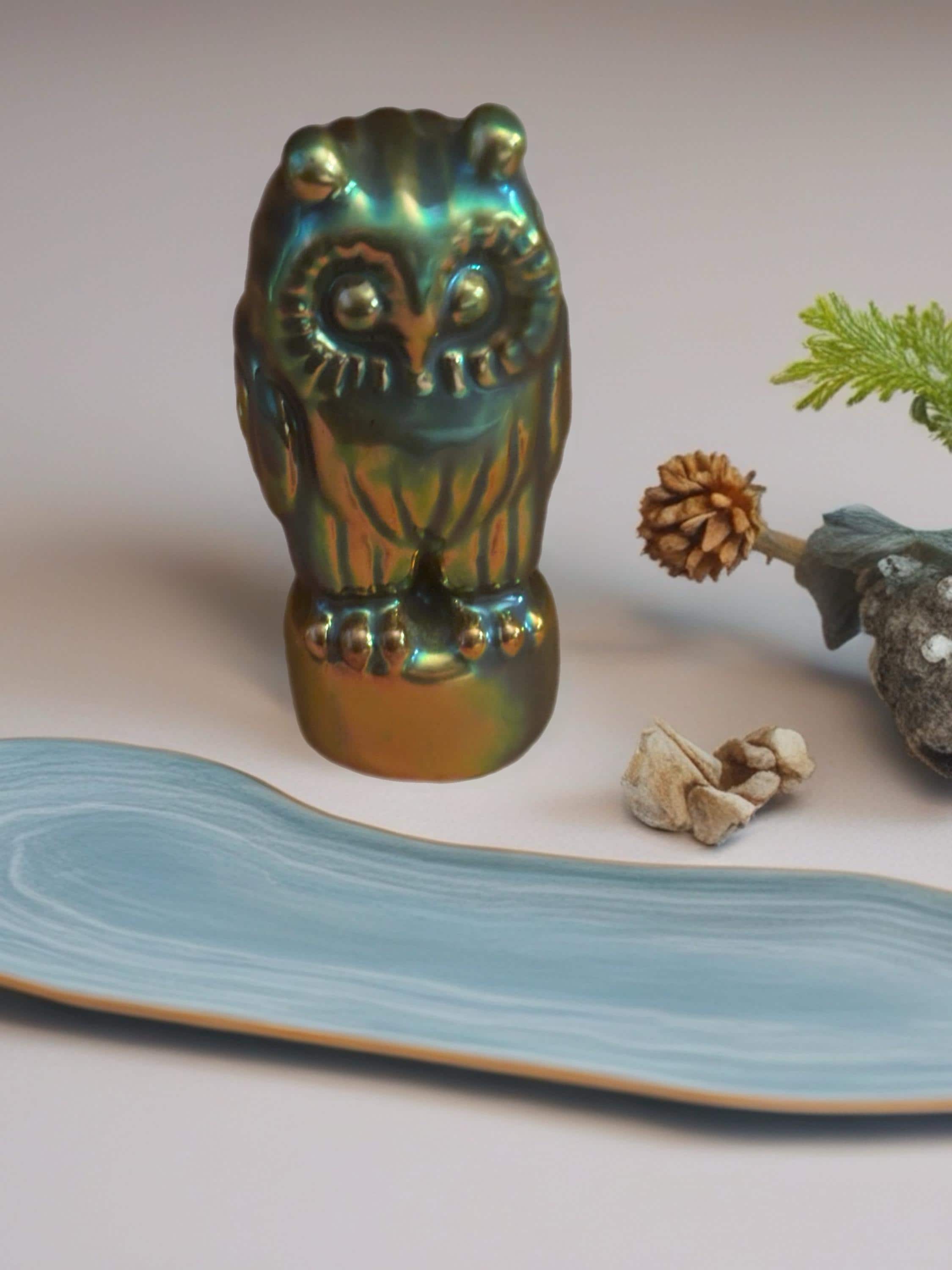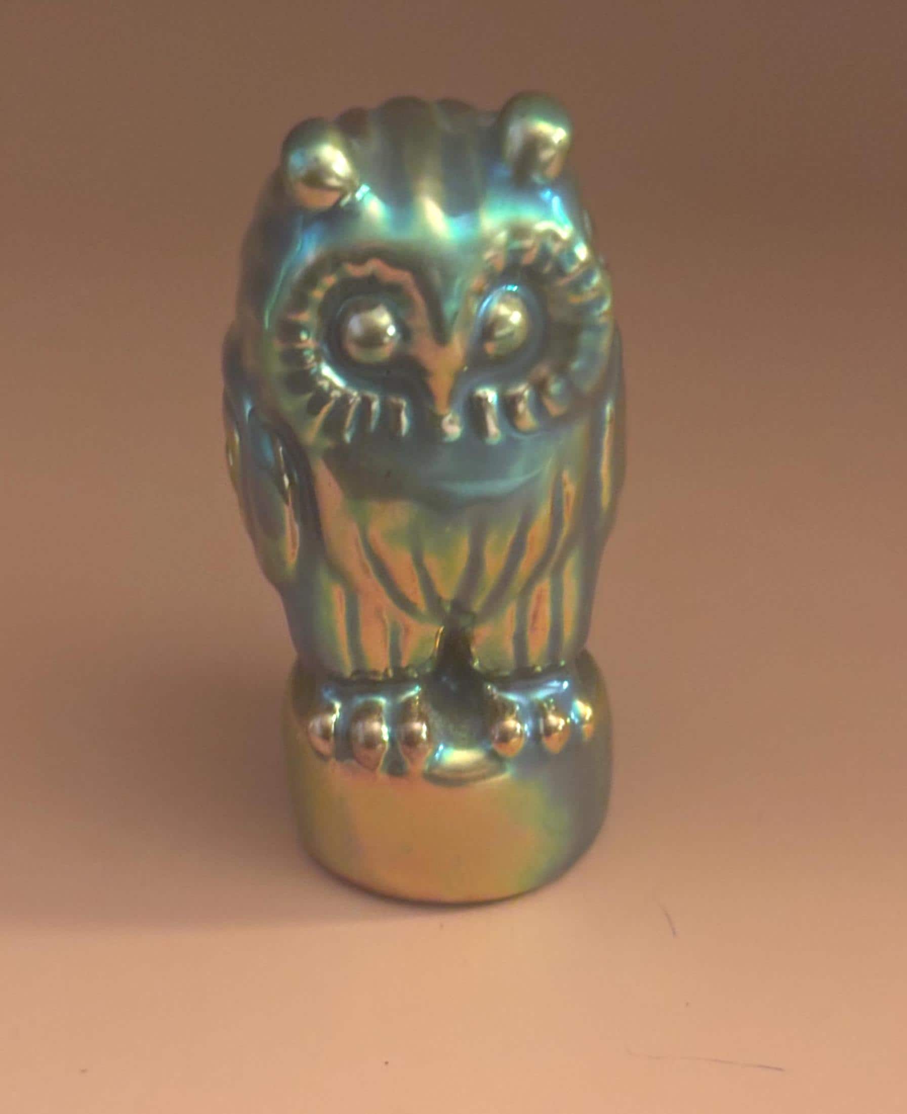 We have a gorgeous Antique Zsolnay Hungariam Porcelain Owl Figurine with a Green Iridescent Glaze. It is dated 1868. Attributed to Judit Nador, an artist. It measures approximately 3 1/4" high.
