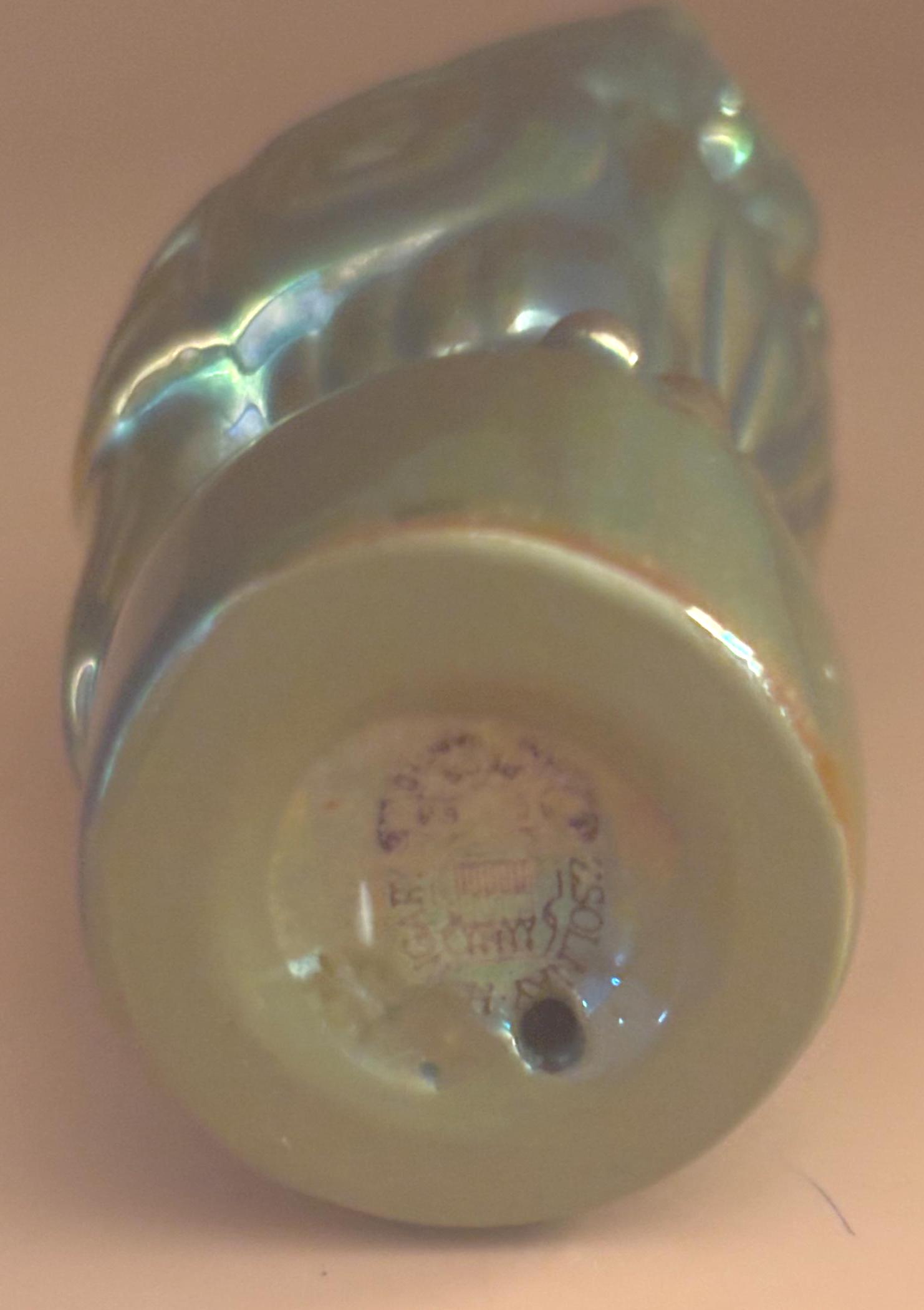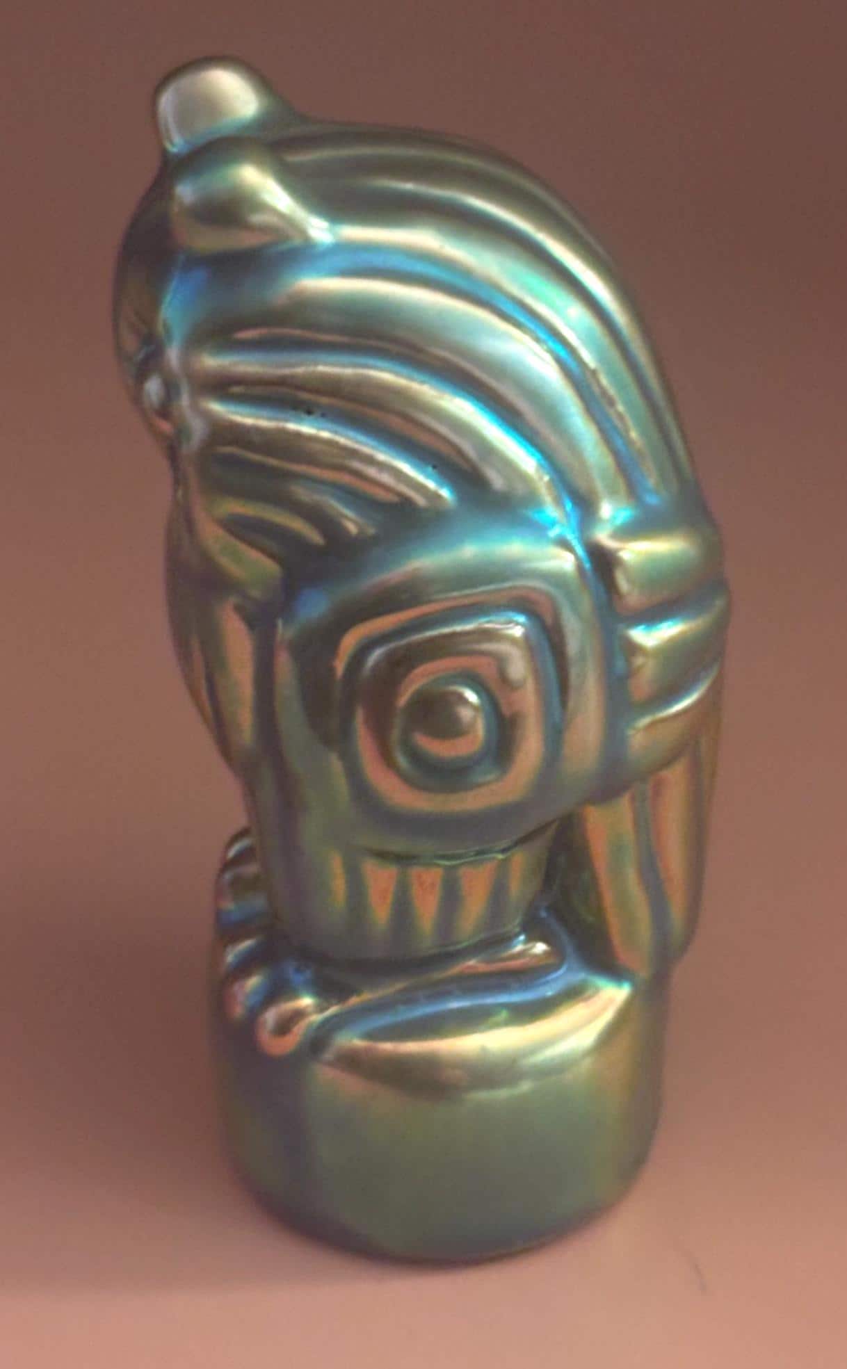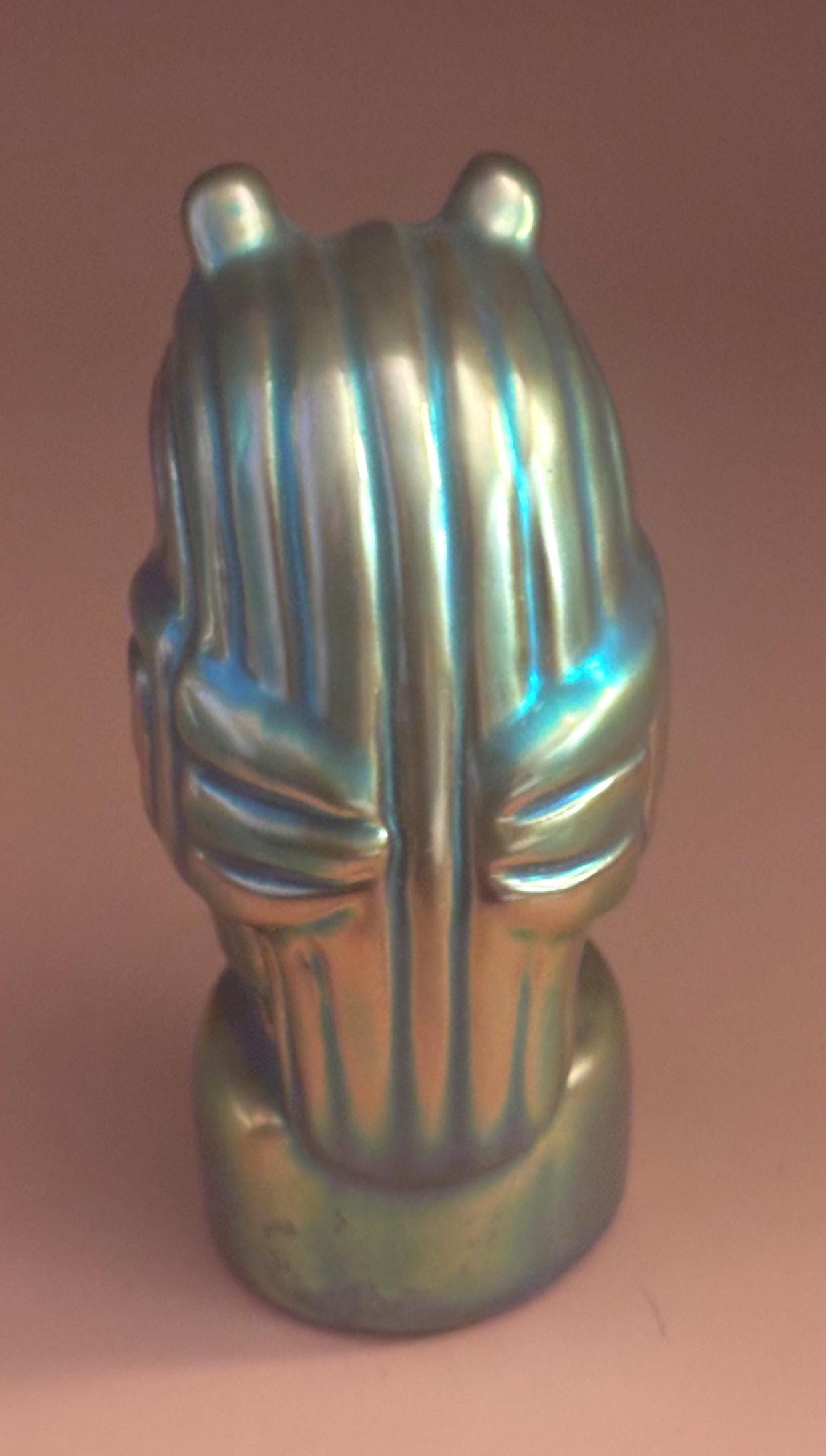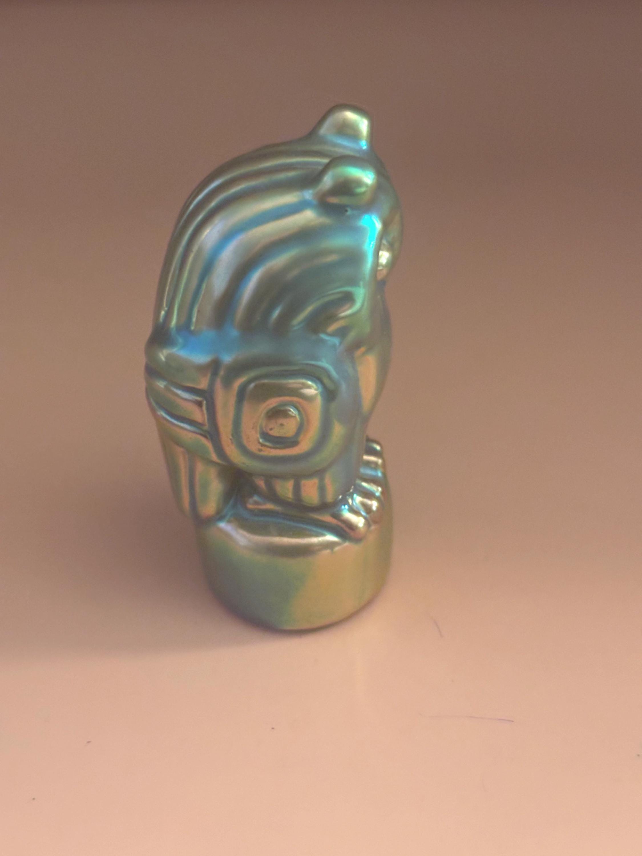 We have a gorgeous Antique Zsolnay Hungariam Porcelain Owl Figurine with a Green Iridescent Glaze. It is dated 1868. Attributed to Judit Nador, an artist. It measures approximately 3 1/4" high.
