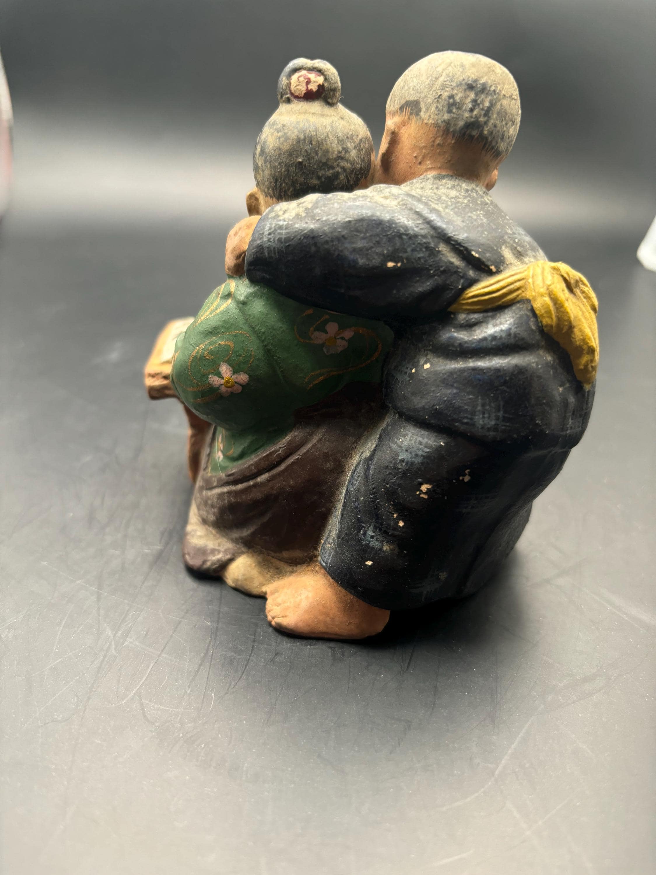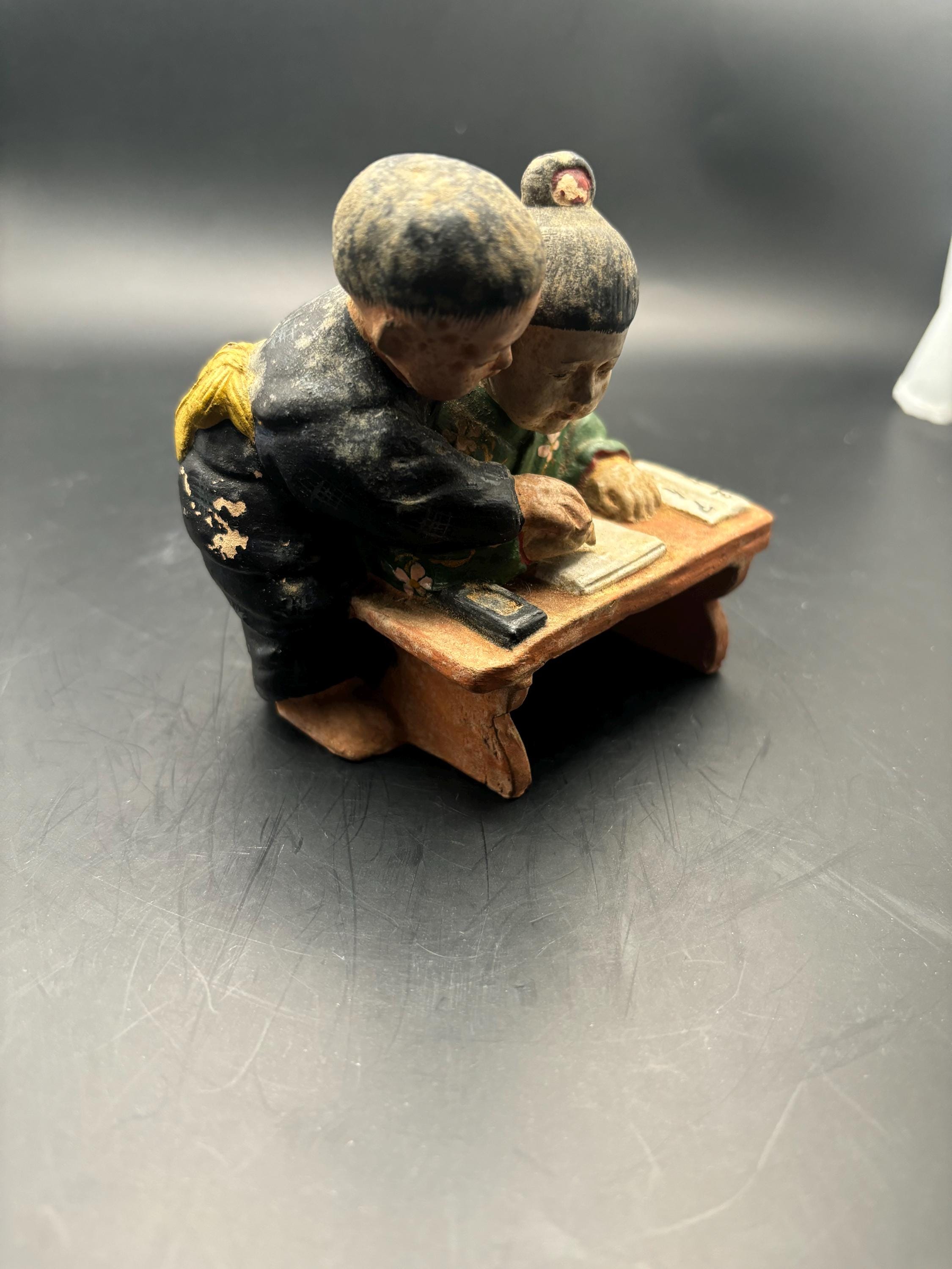 We have an extraordinary Antique Chinese Shiwan Mudman Figurine, Student Teacher Statue. It measures approximately 4" at its widest, 4" high.