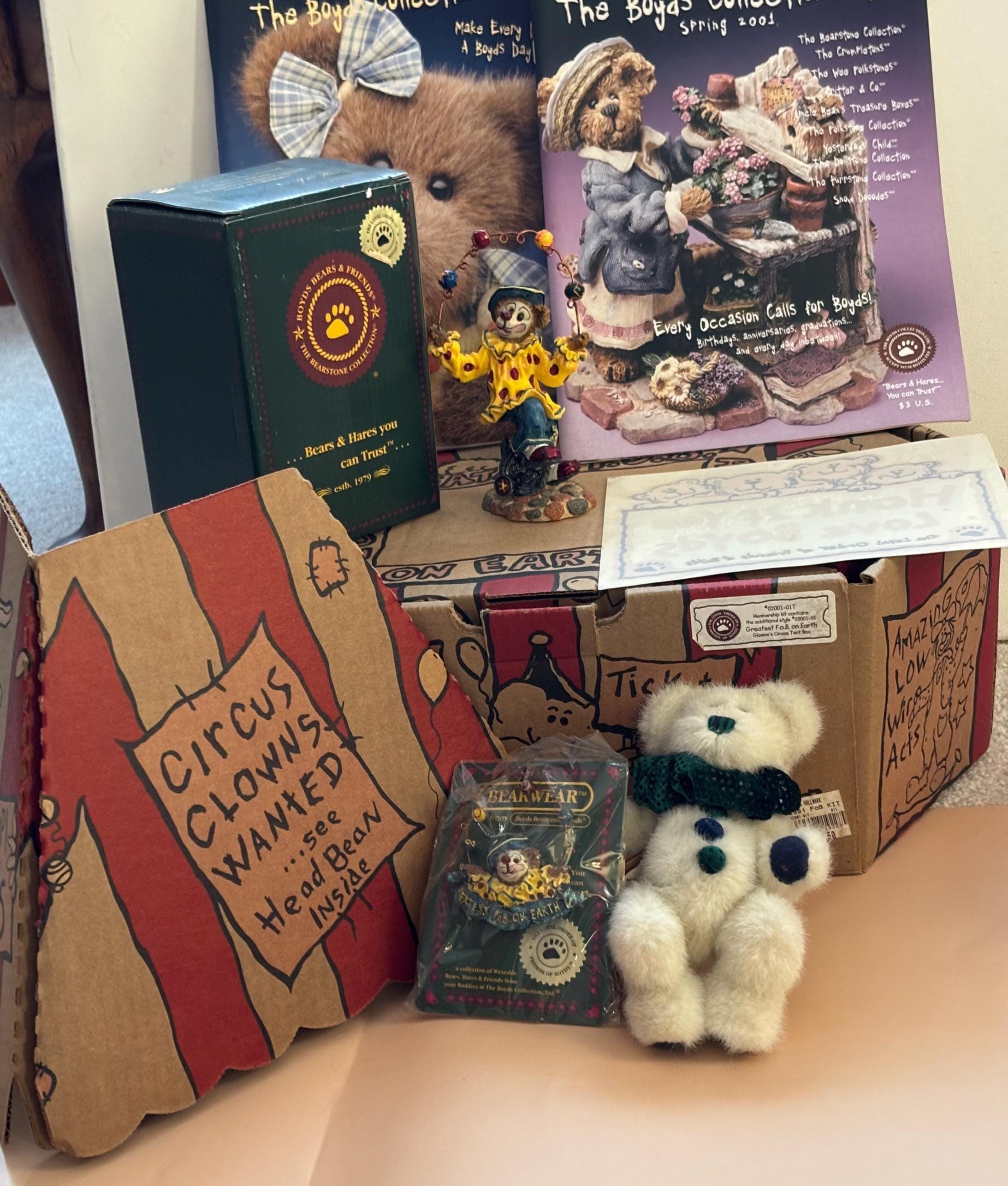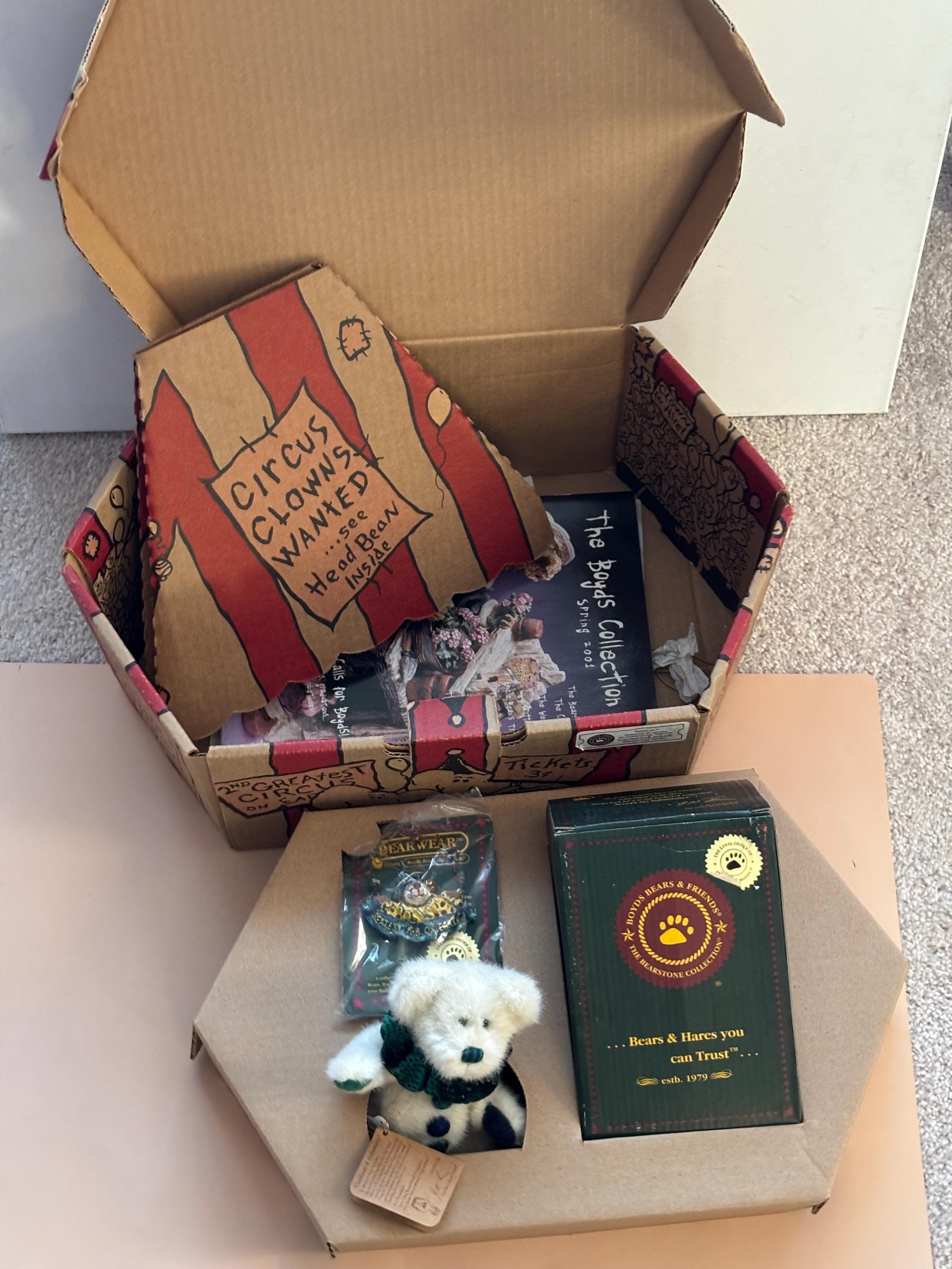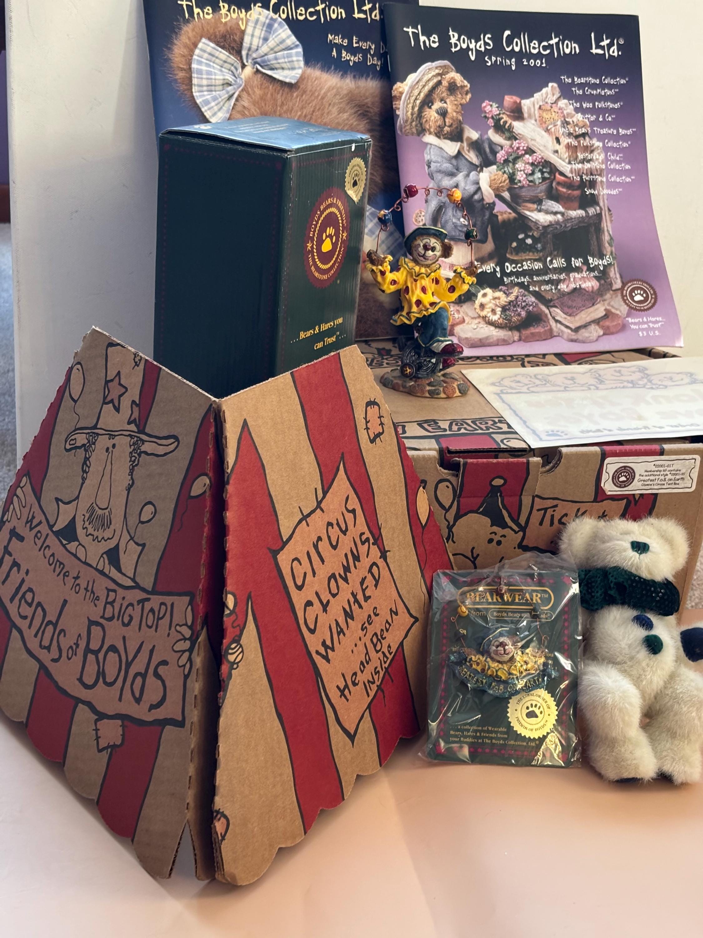 We are delighted to be featuring the Vintage Boyds Bears The Greatest FOB on Earth Collectors Kt. Featuring a circus themed box containing a plush bear, a resin figurine and a pin. This includes its original box. It is in Very Good Condition.