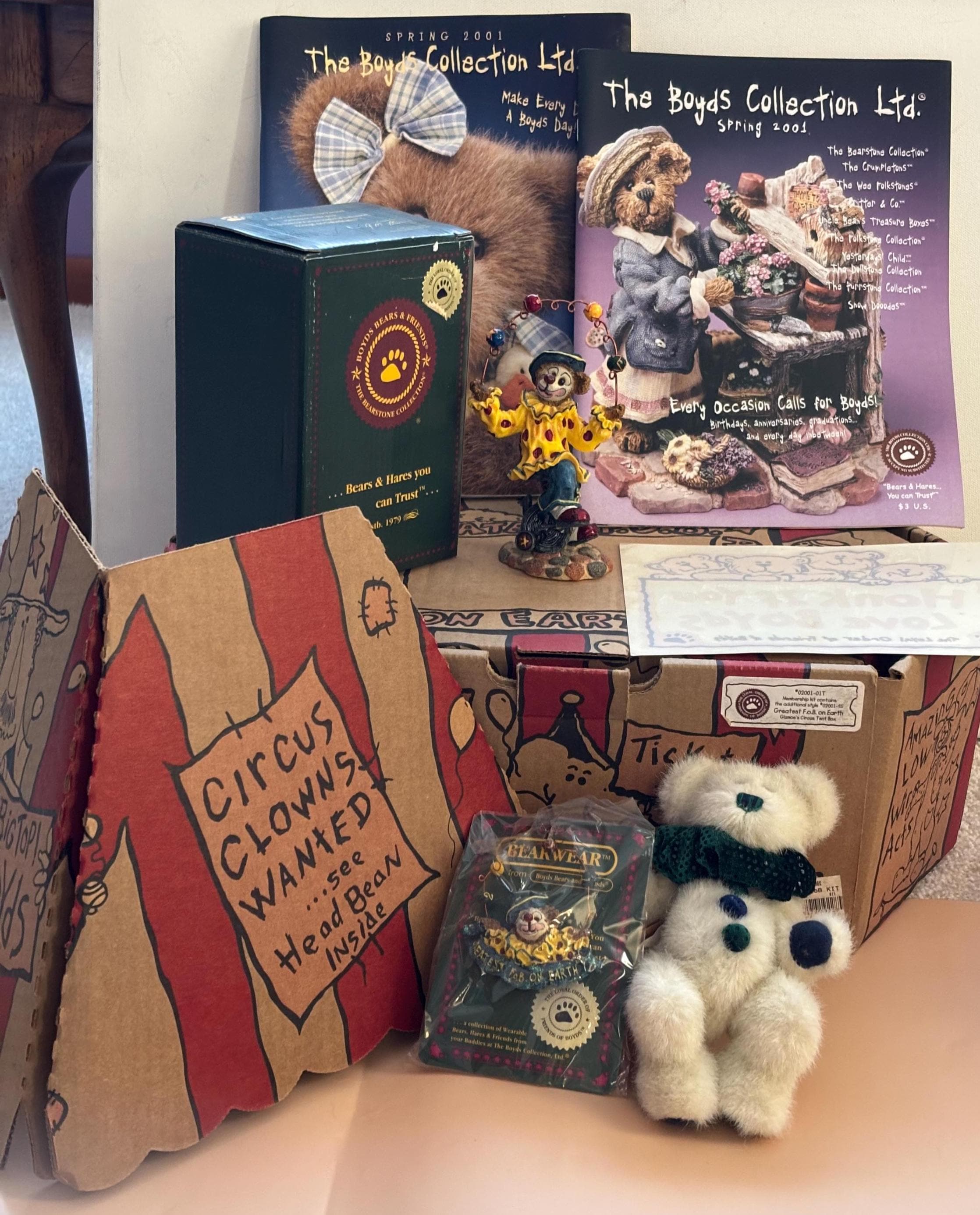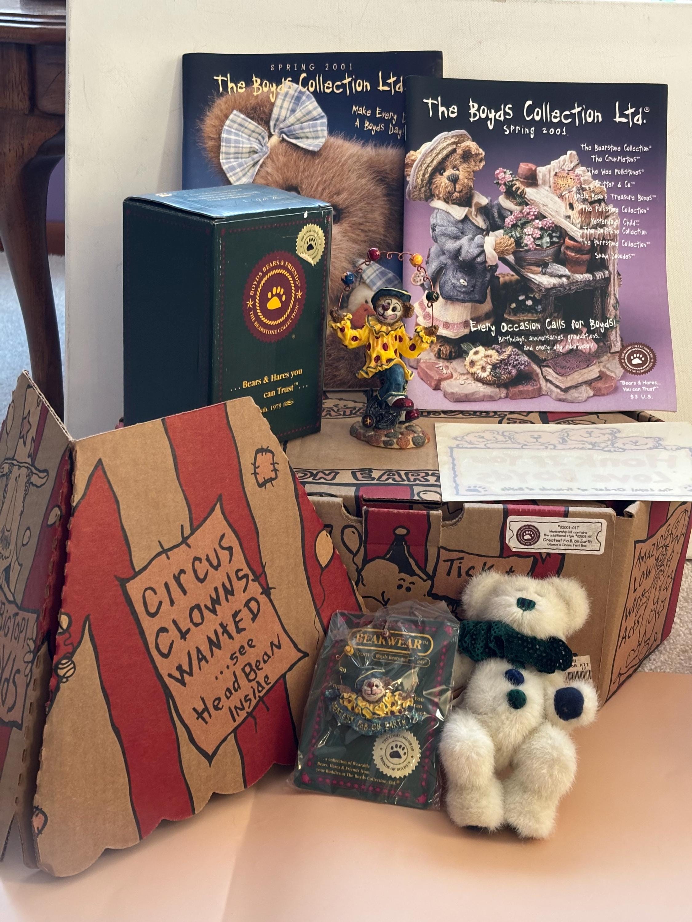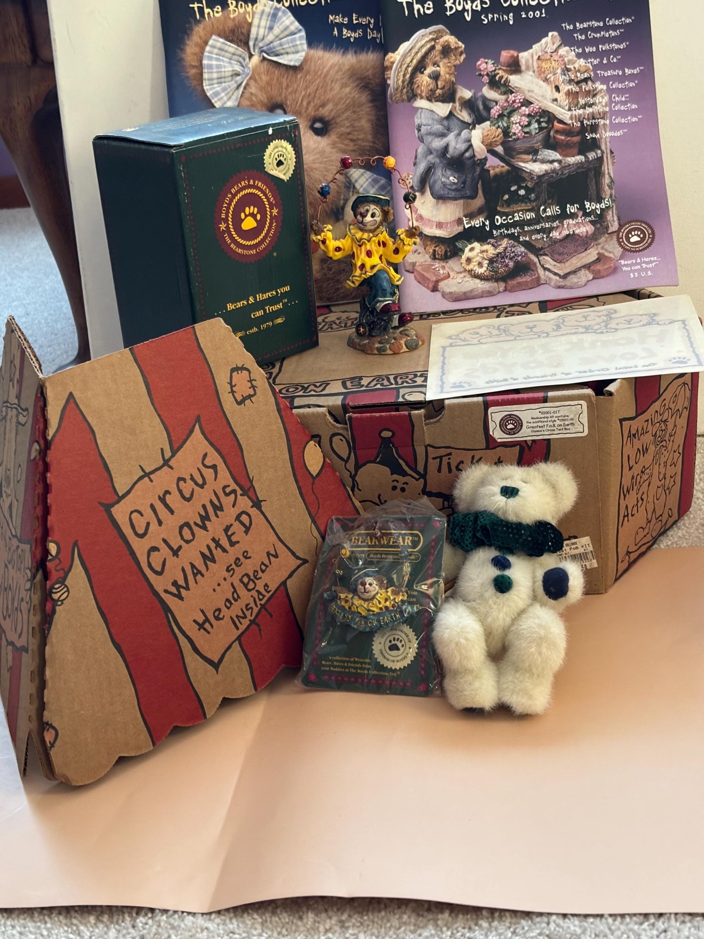 We are delighted to be featuring the Vintage Boyds Bears The Greatest FOB on Earth Collectors Kt. Featuring a circus themed box containing a plush bear, a resin figurine and a pin. This includes its original box. It is in Very Good Condition.