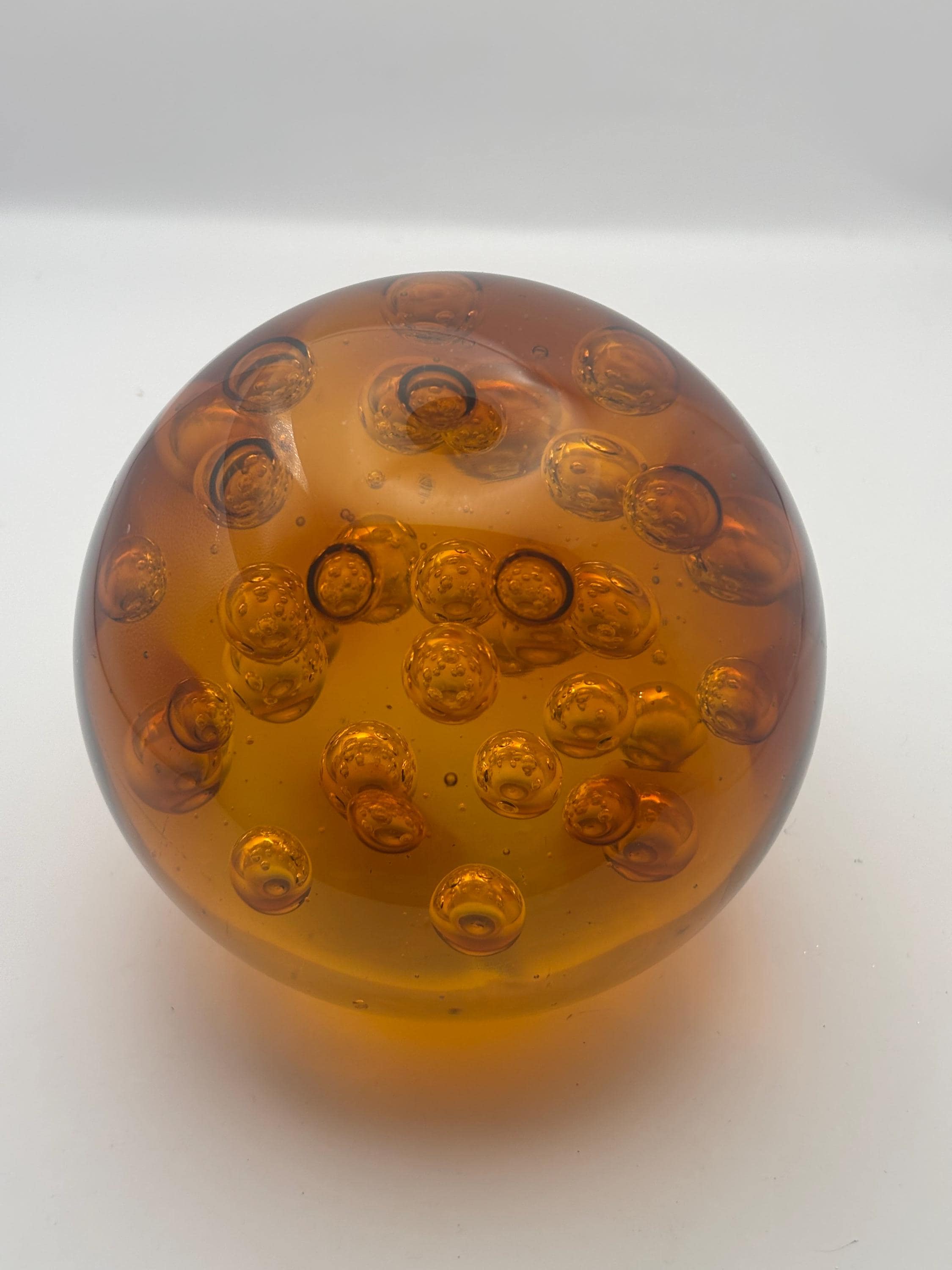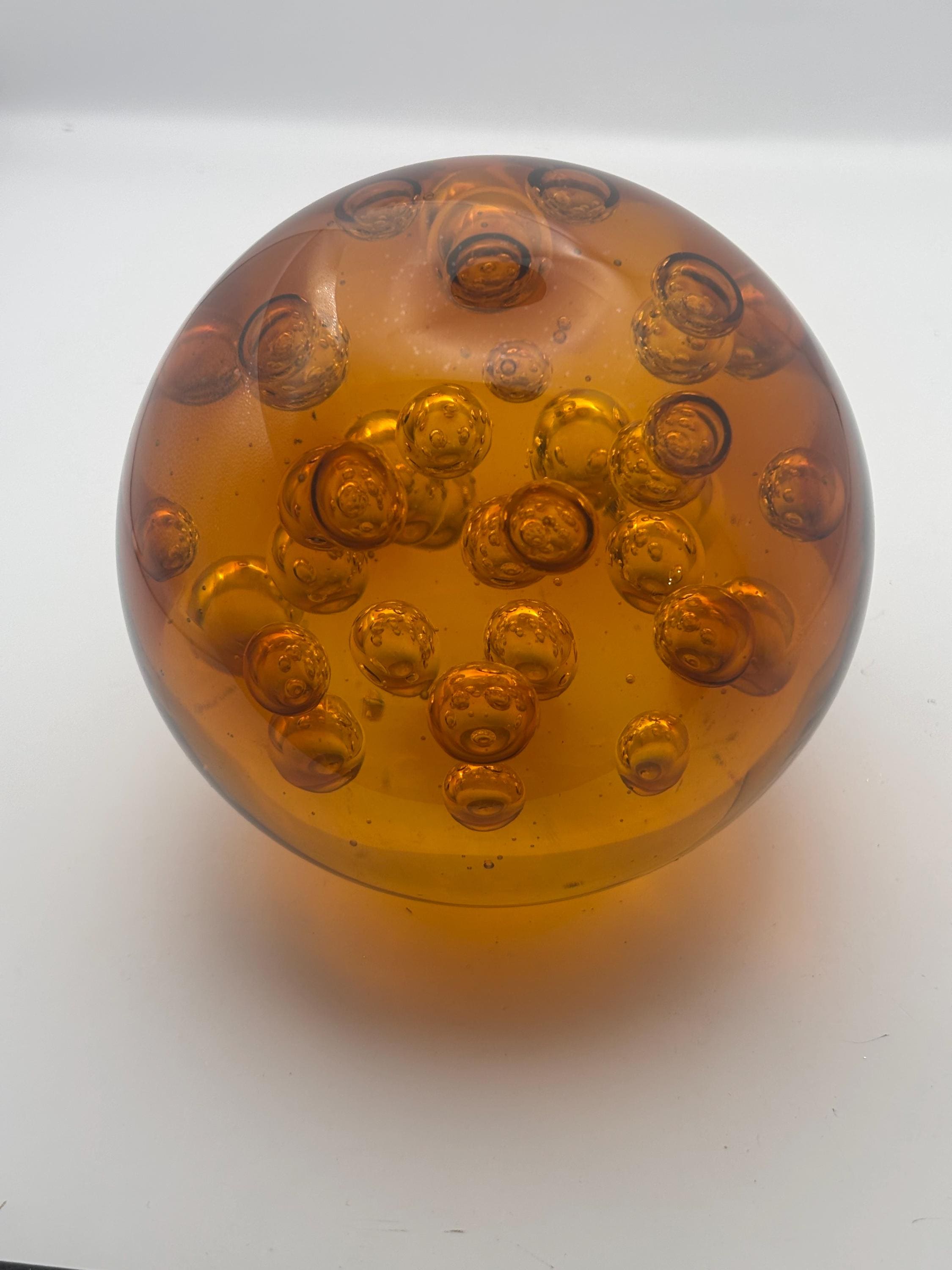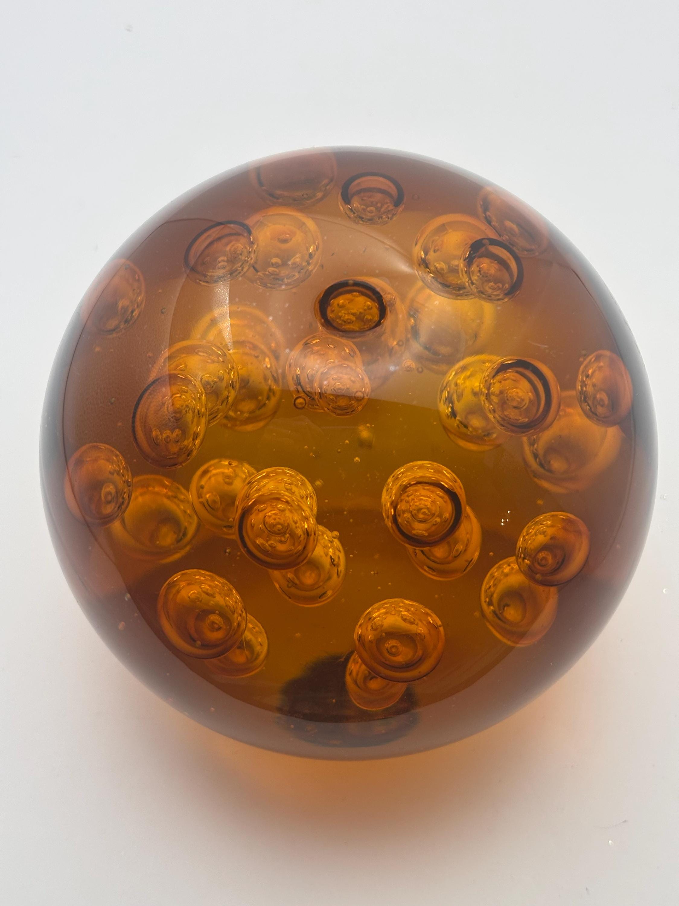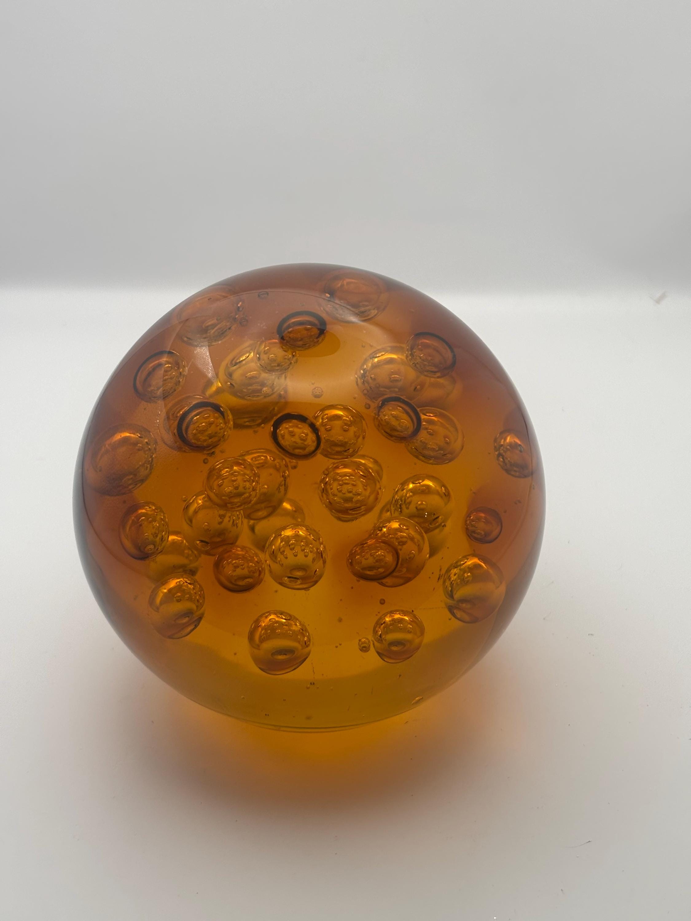 We have a gorgeous Murano Bullicante Amber Glass Paperweight. Gorgeous Controlled Bubbles. It is a truly phenomenal piece of art!