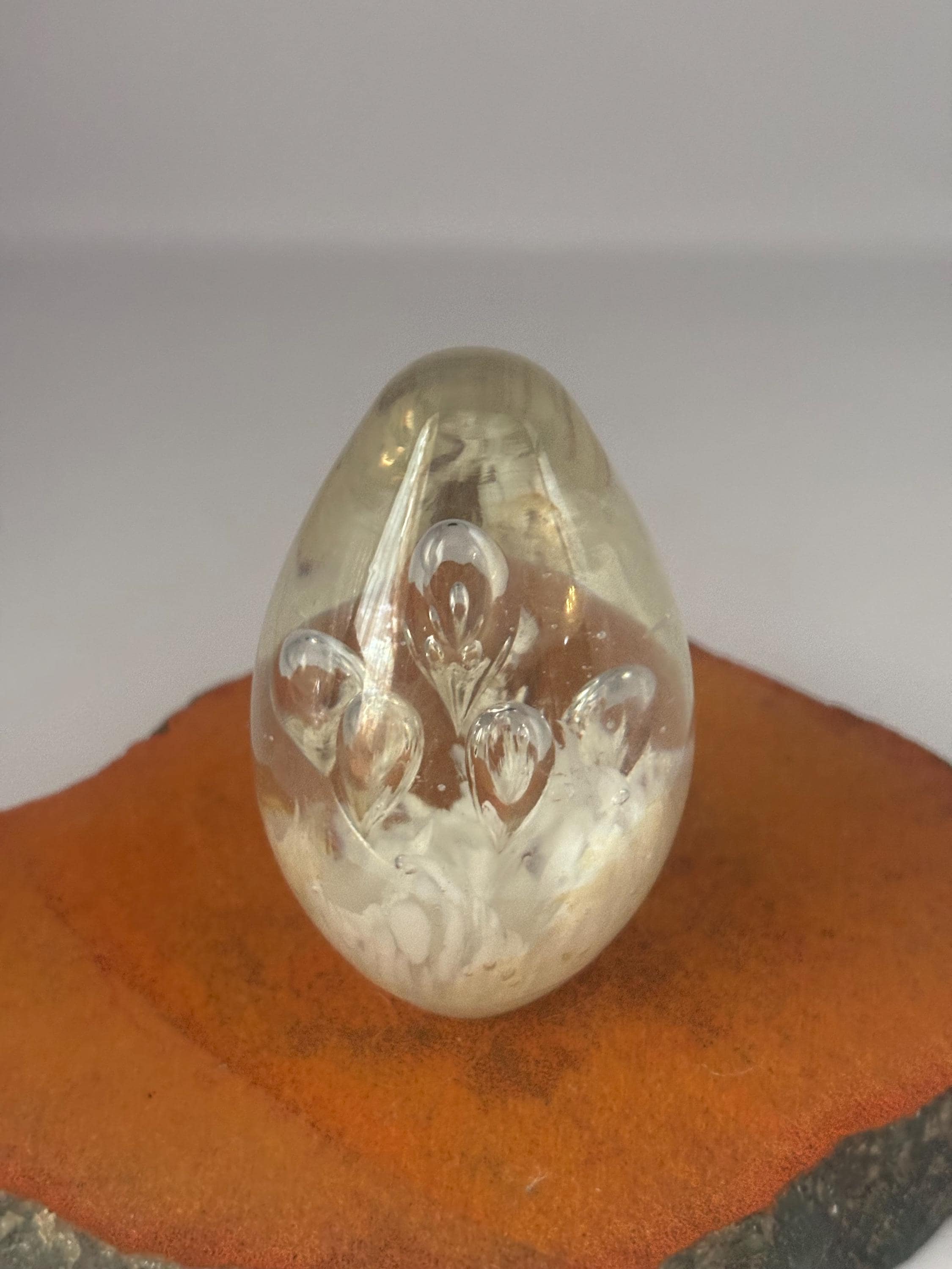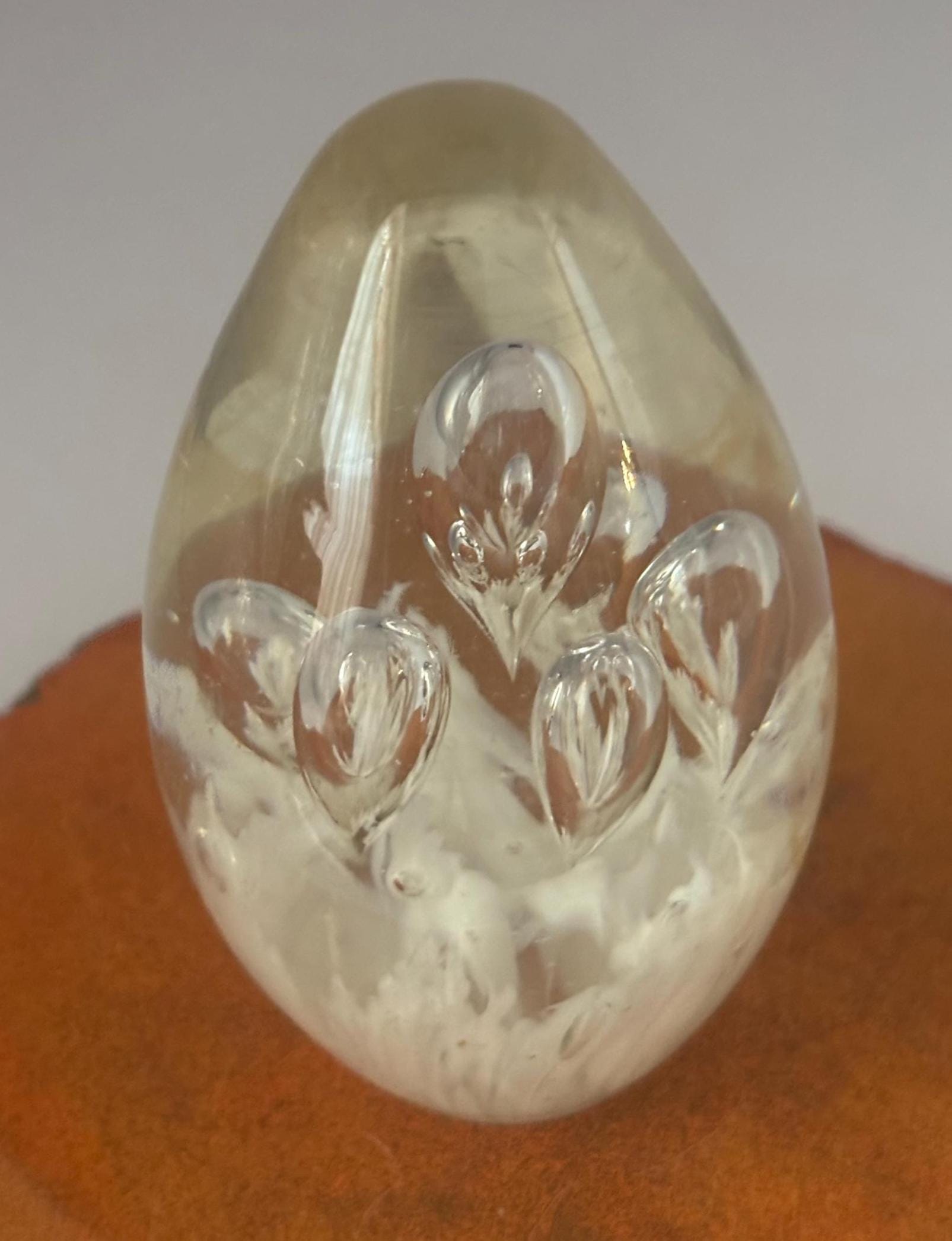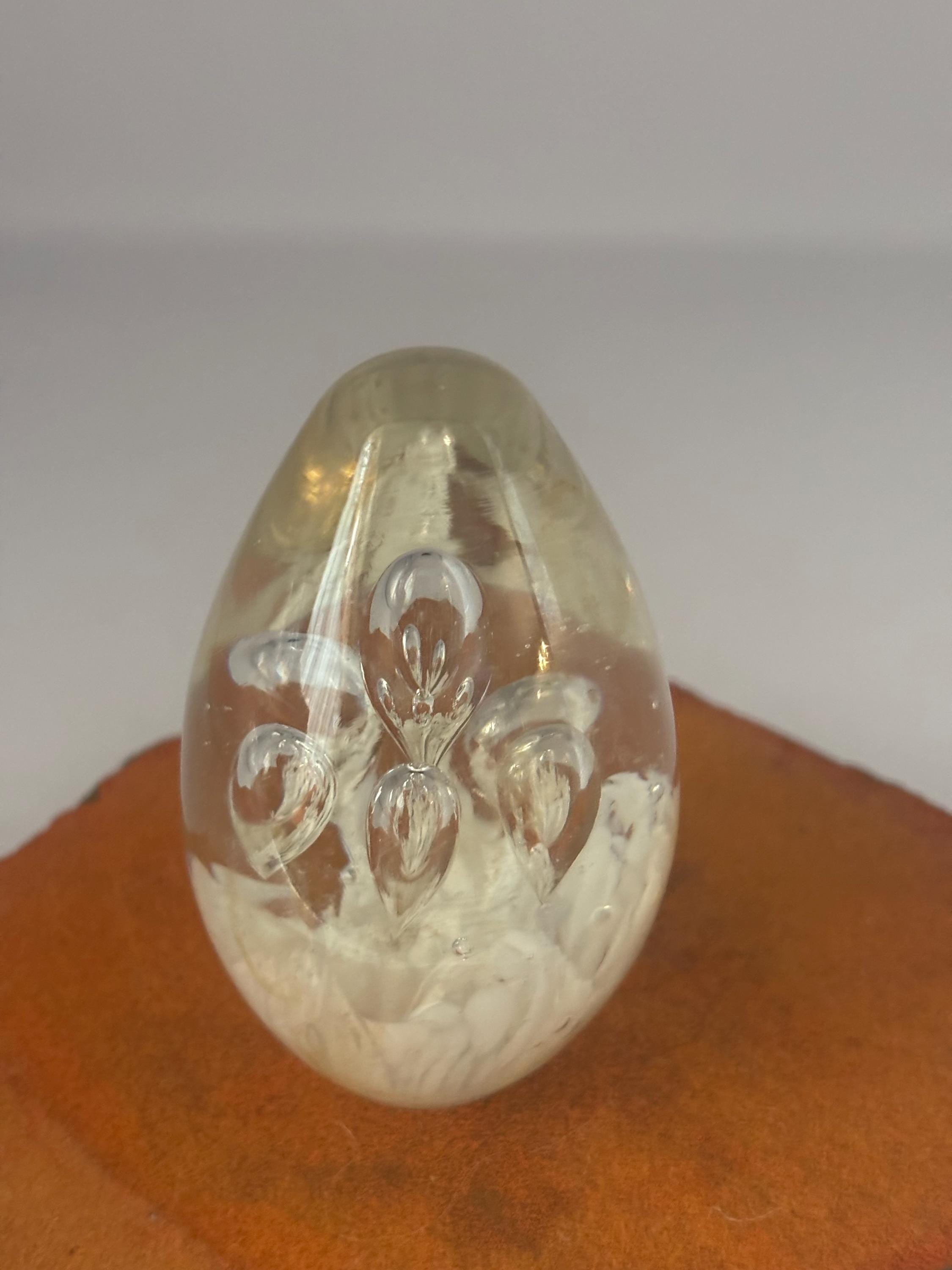 We have a gorgeous Vintage Egg Bullicante Paperweight. It features controlled air bubbles and a white inclusion at the base. This style of internal bubble design is referred to as bullicante. It is a truly lovely piece of art and would make a great gift.