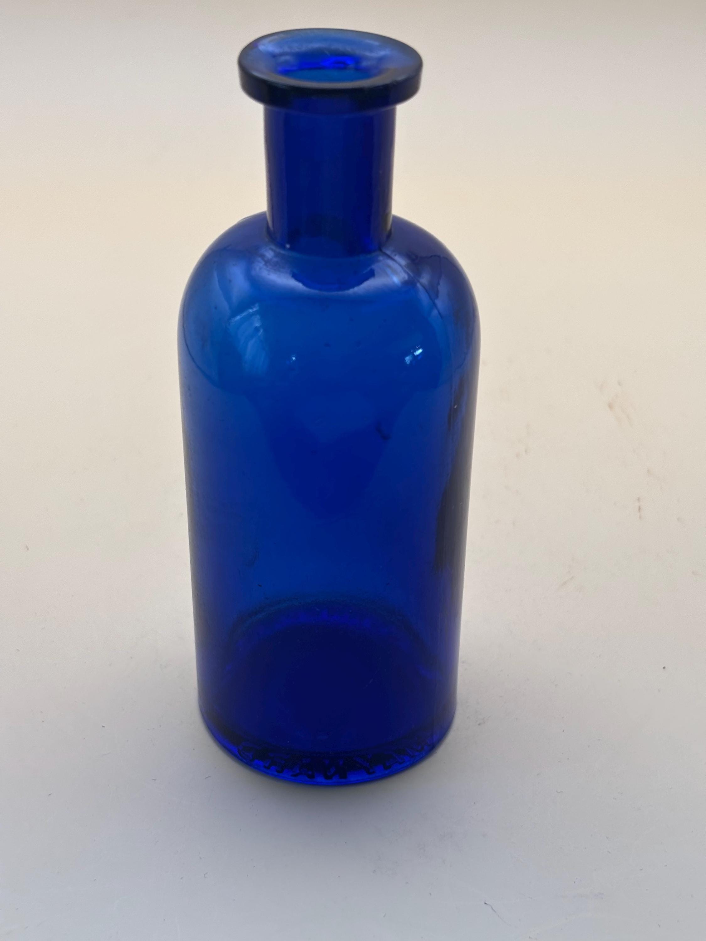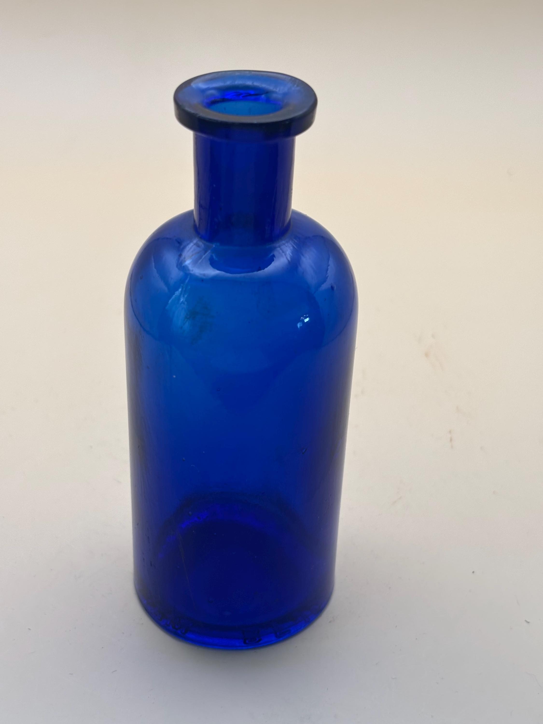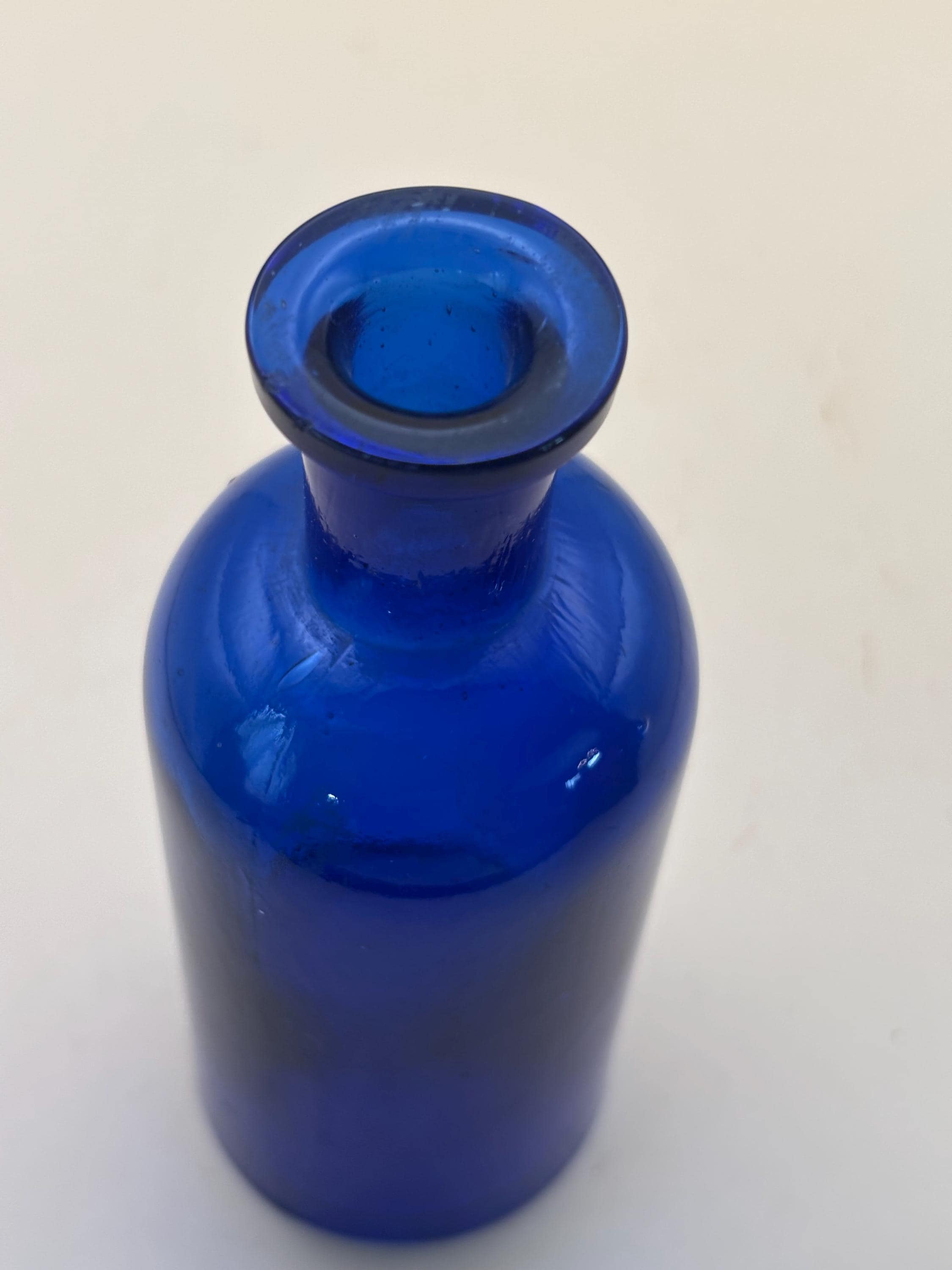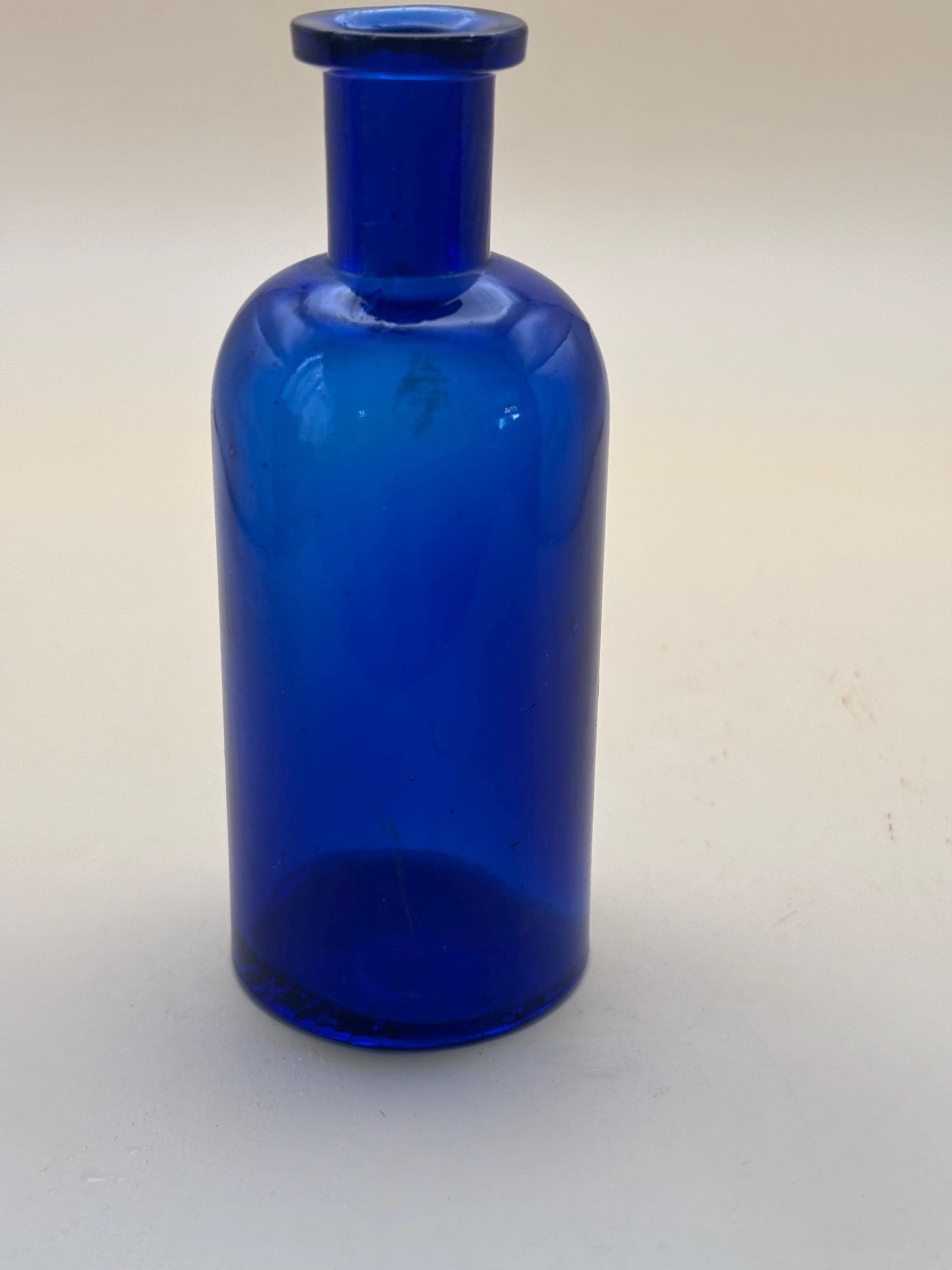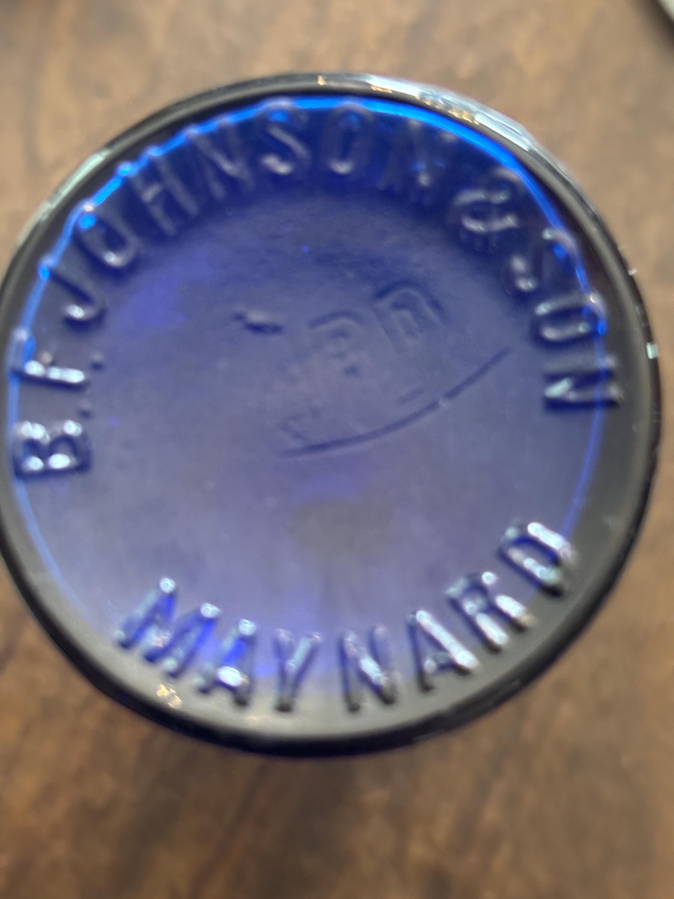 We have a gorgeous Antique Cobalt Blue Apothecary Wide Mouth Bottle. It is signed on bottle BF Johnson & Son, Maynard.