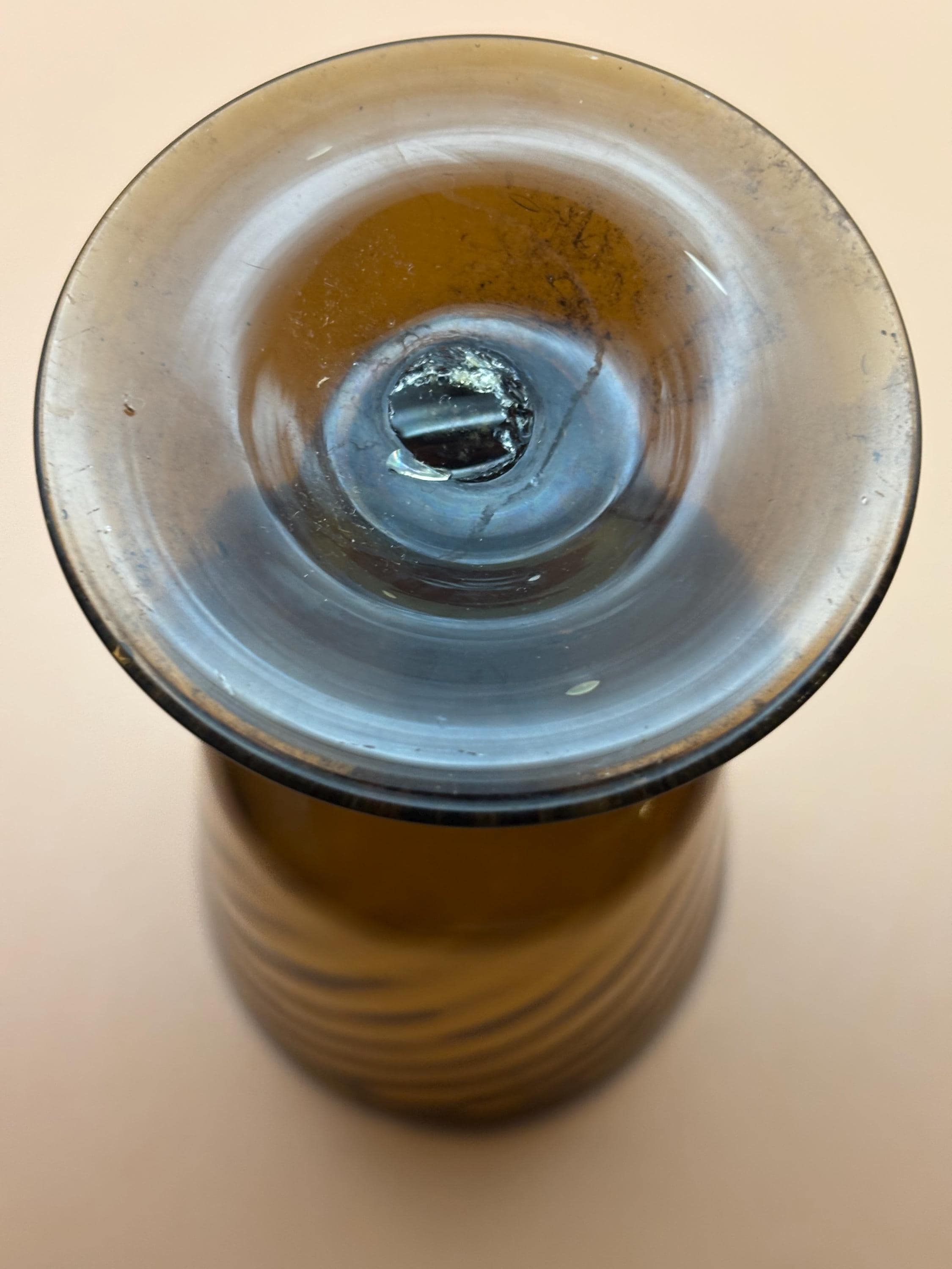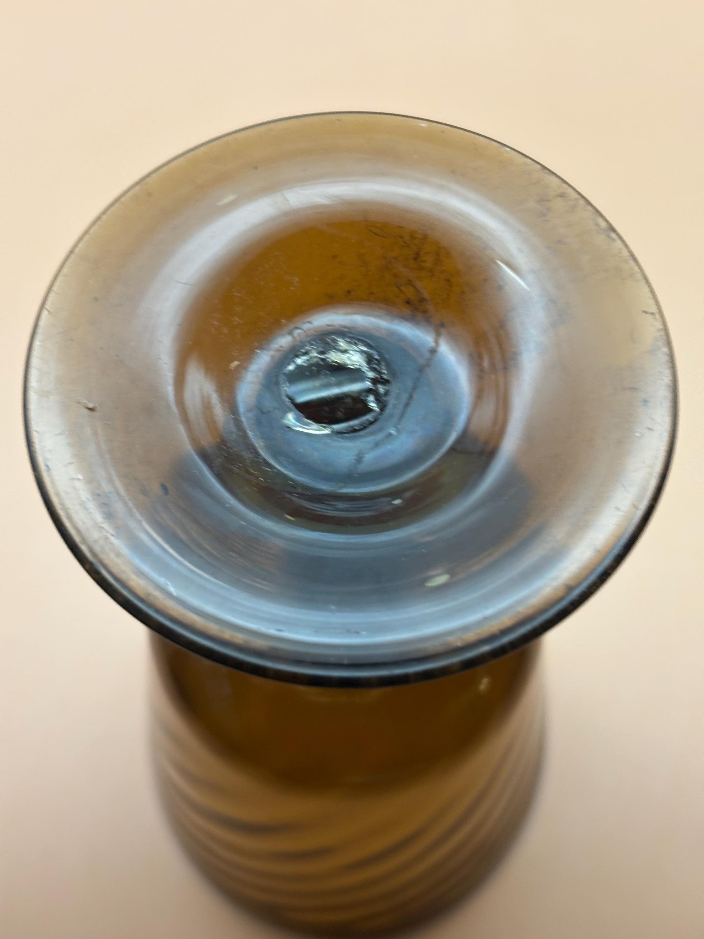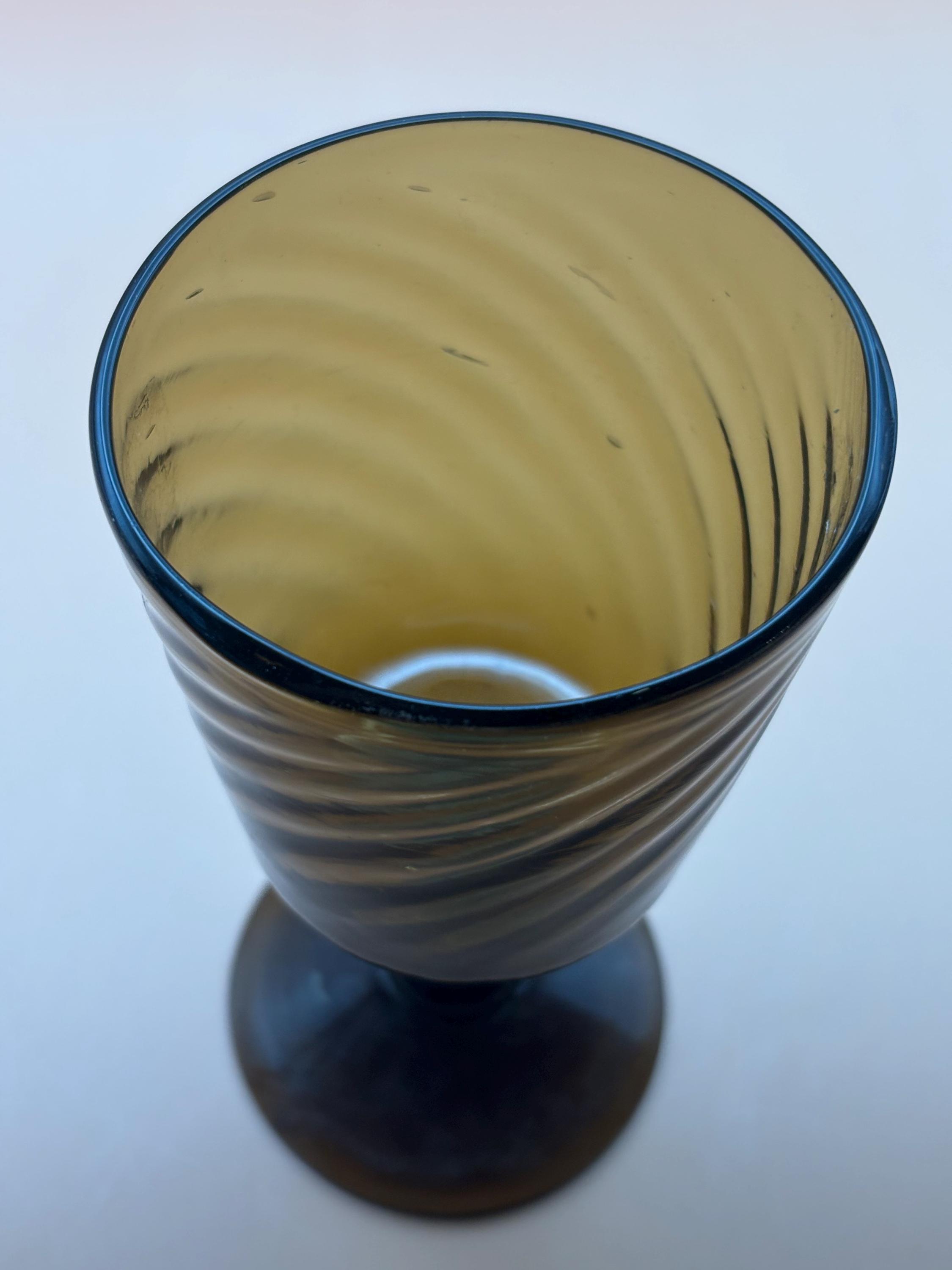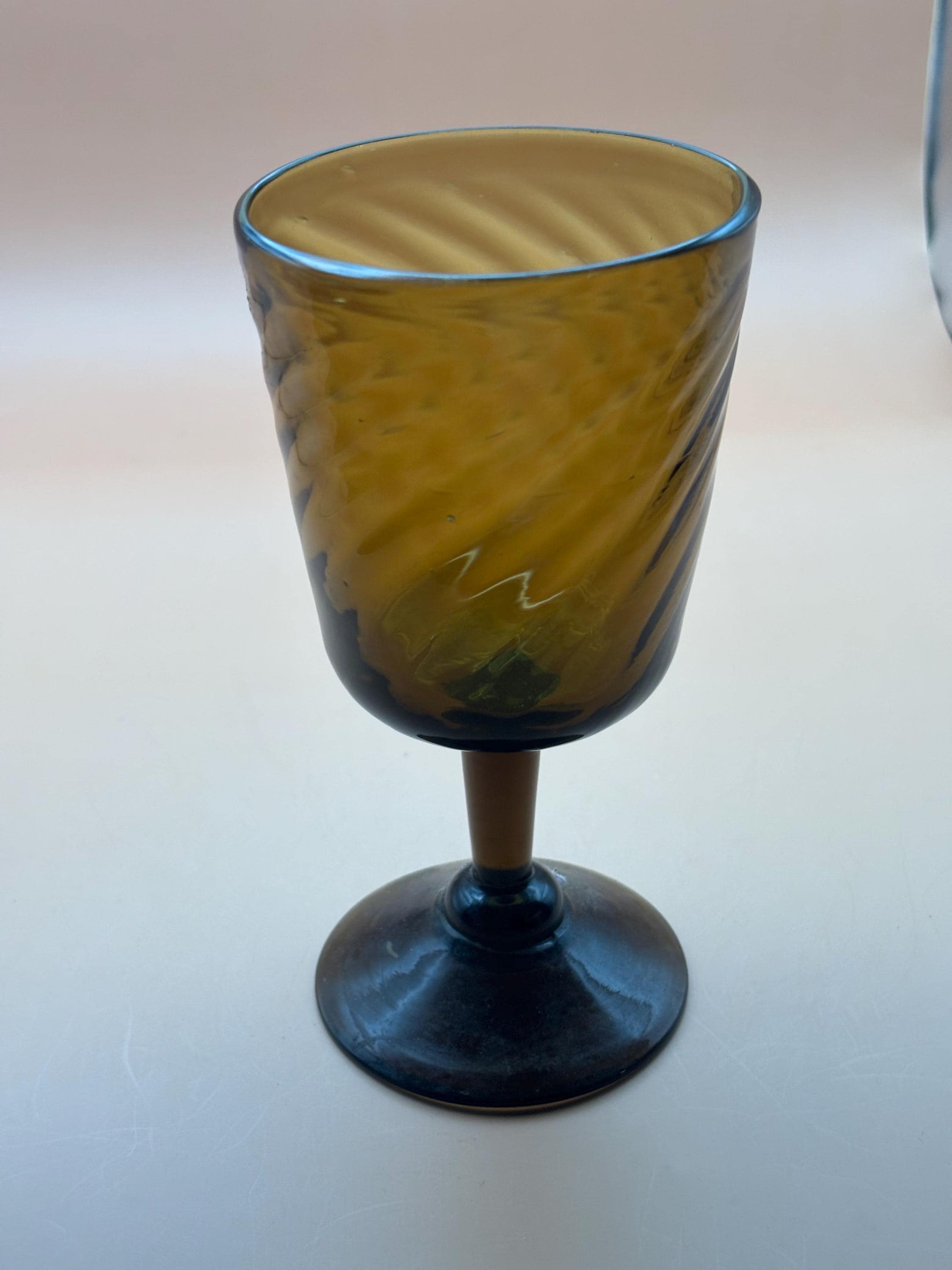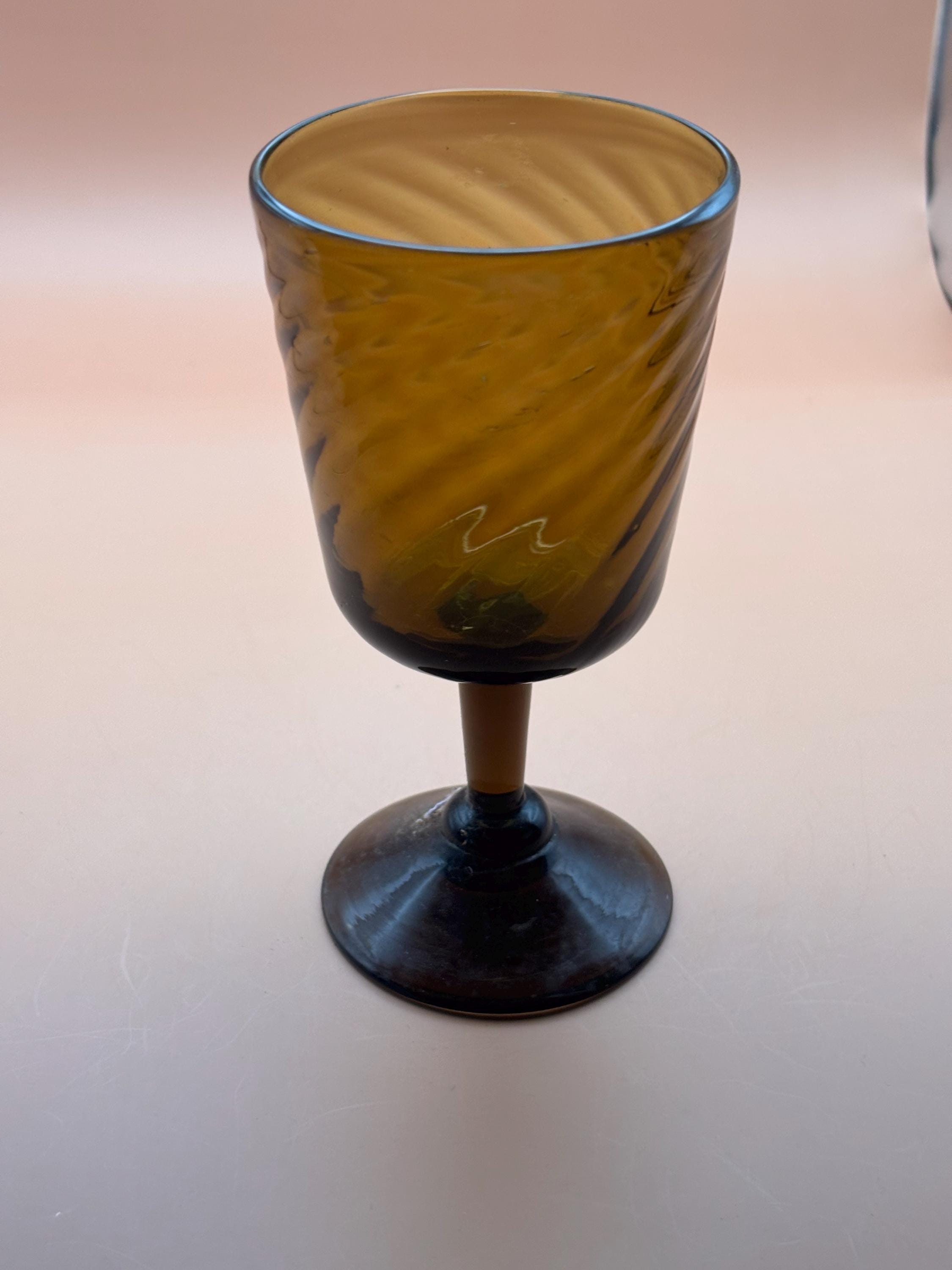 We have a Hand Blown Amber Glass Goblet. It measures approximately 6 1/4" high, 3" in diameter.
