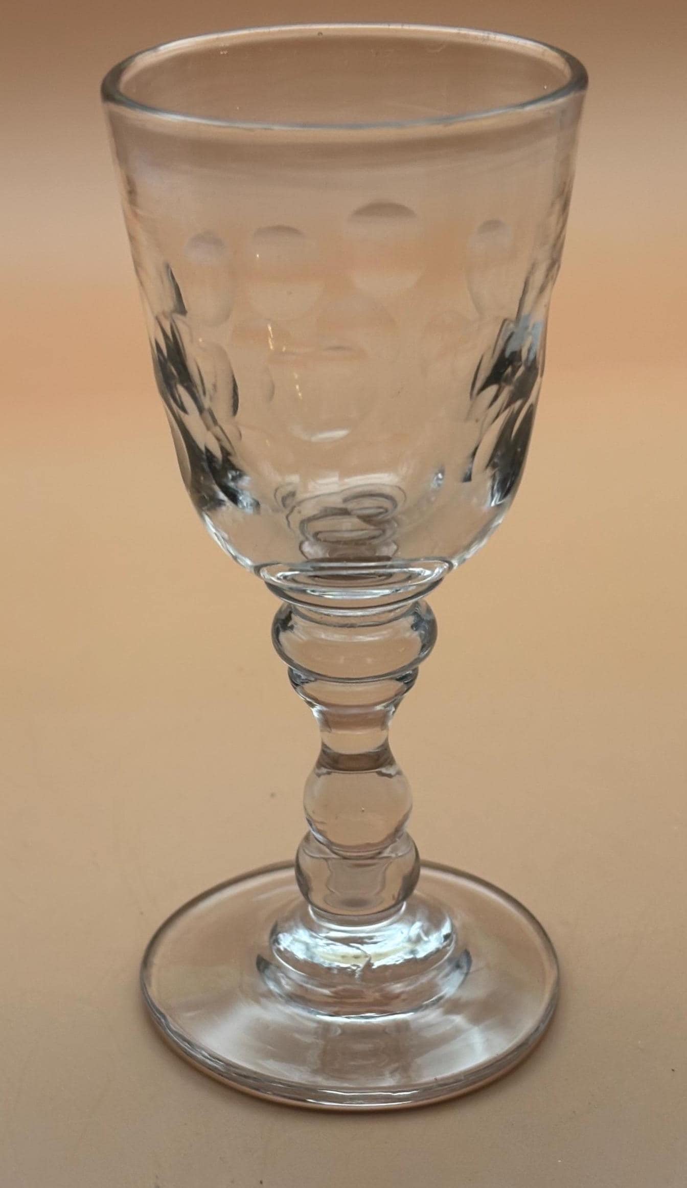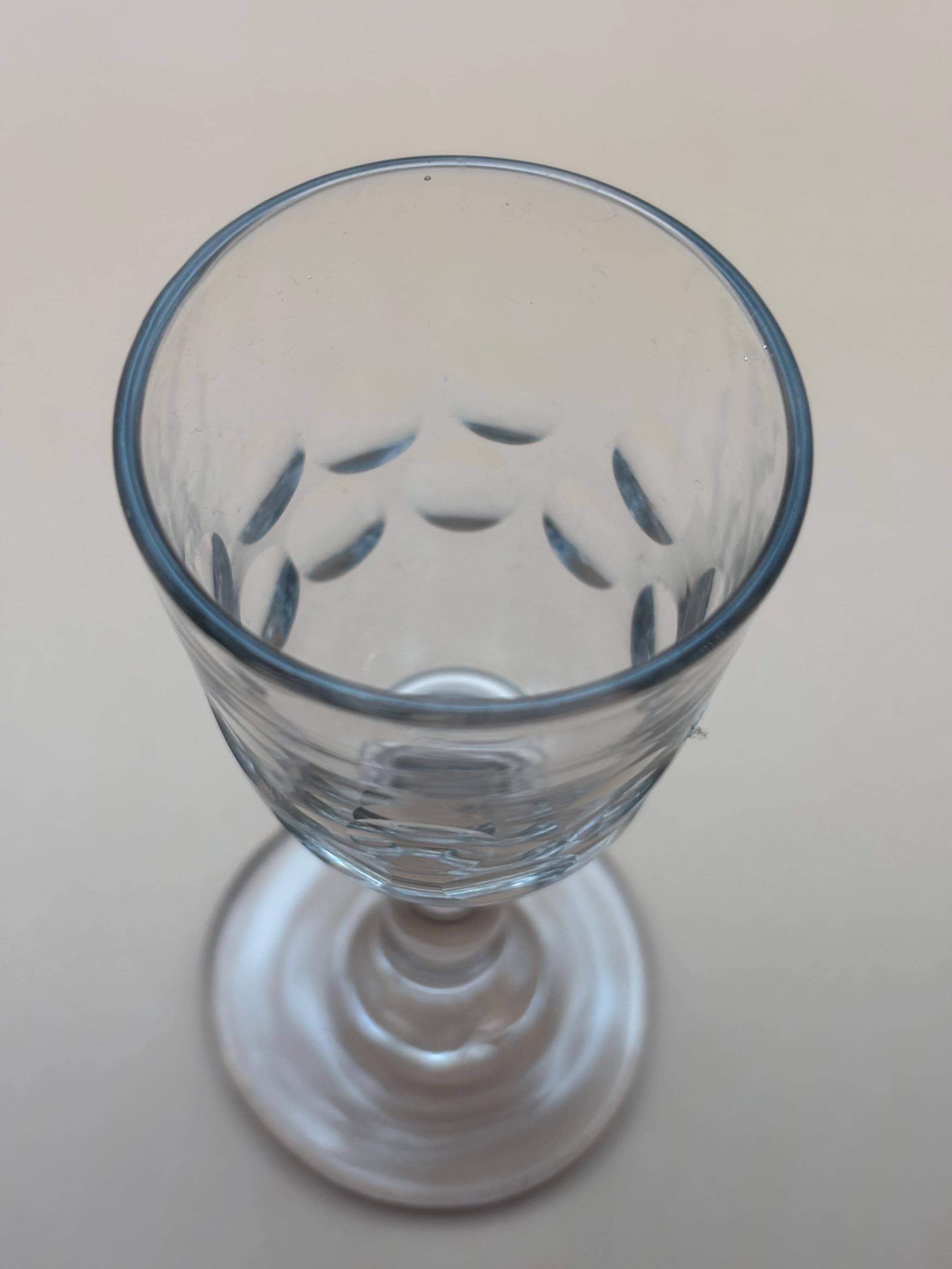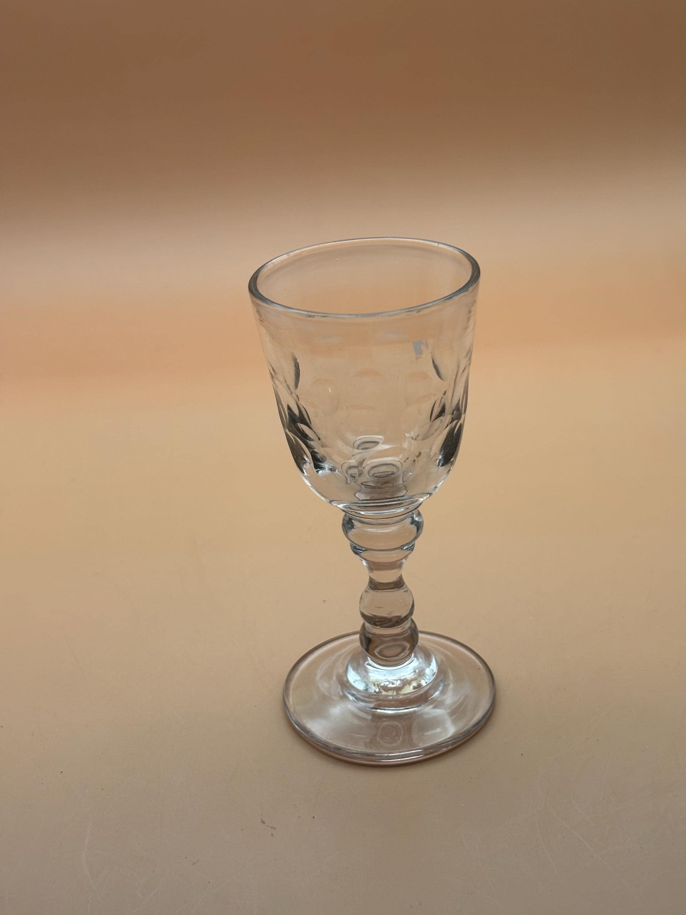 We have a Baccarat Shot or Codial Glass. It measures approximately 2" at its opening, 4 1/2" high.