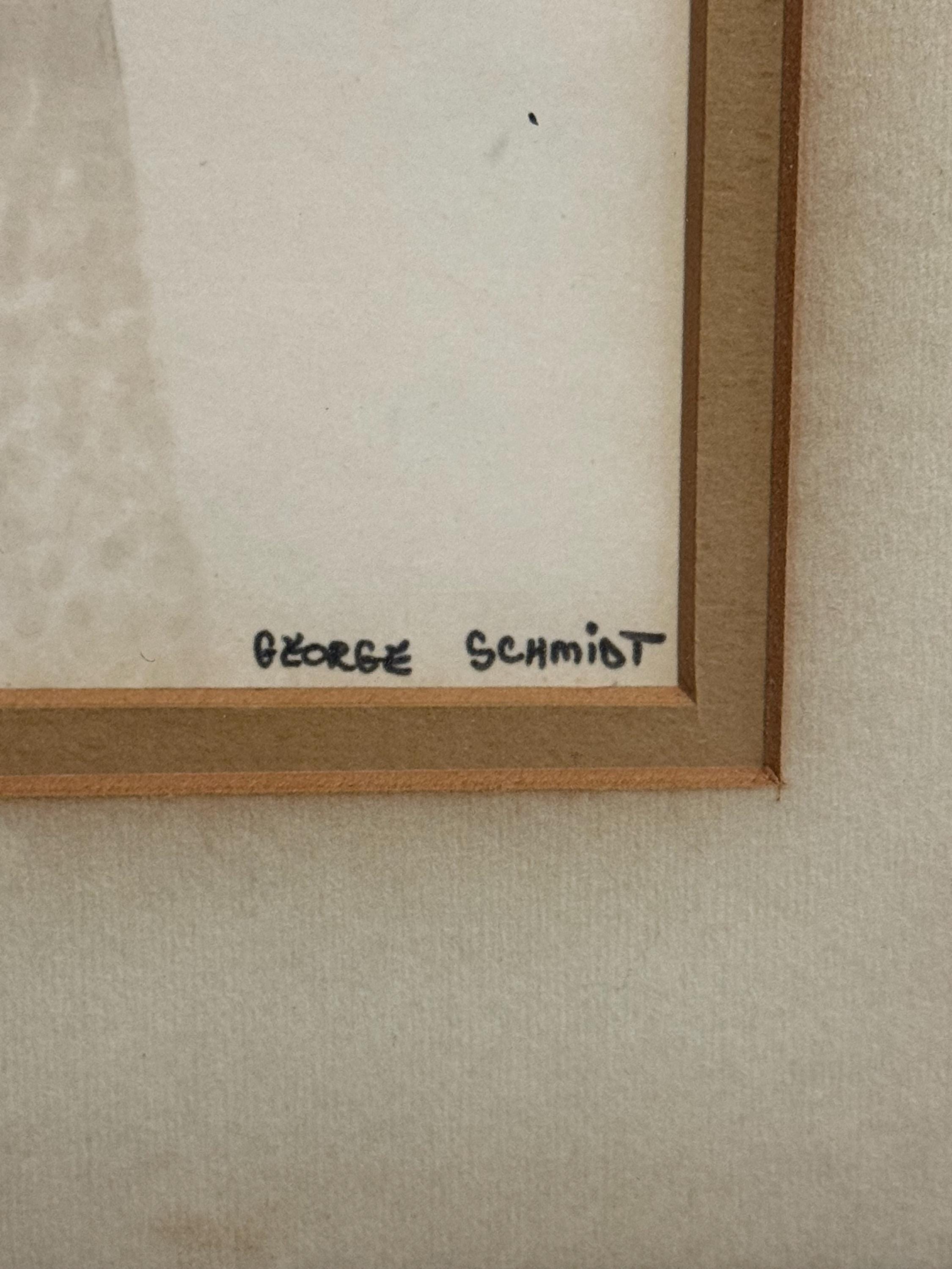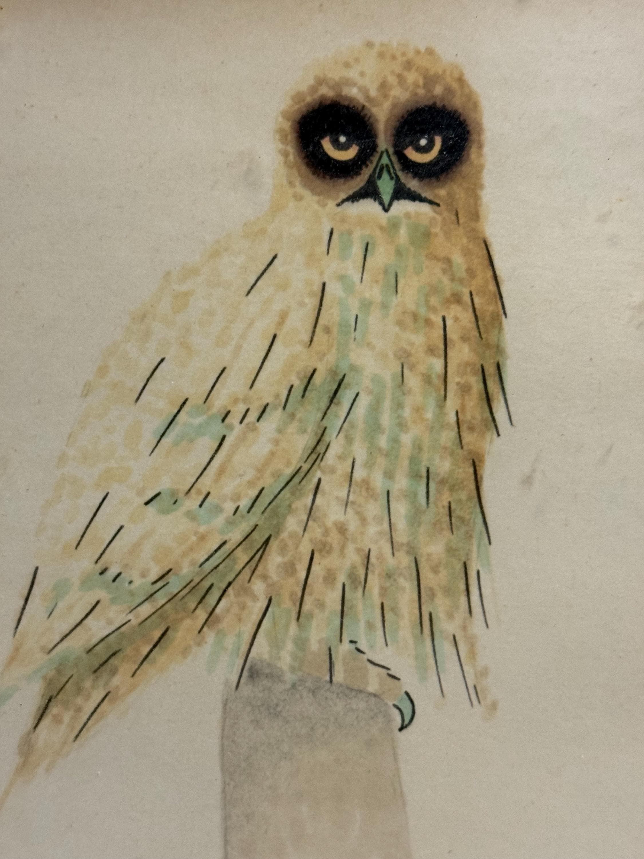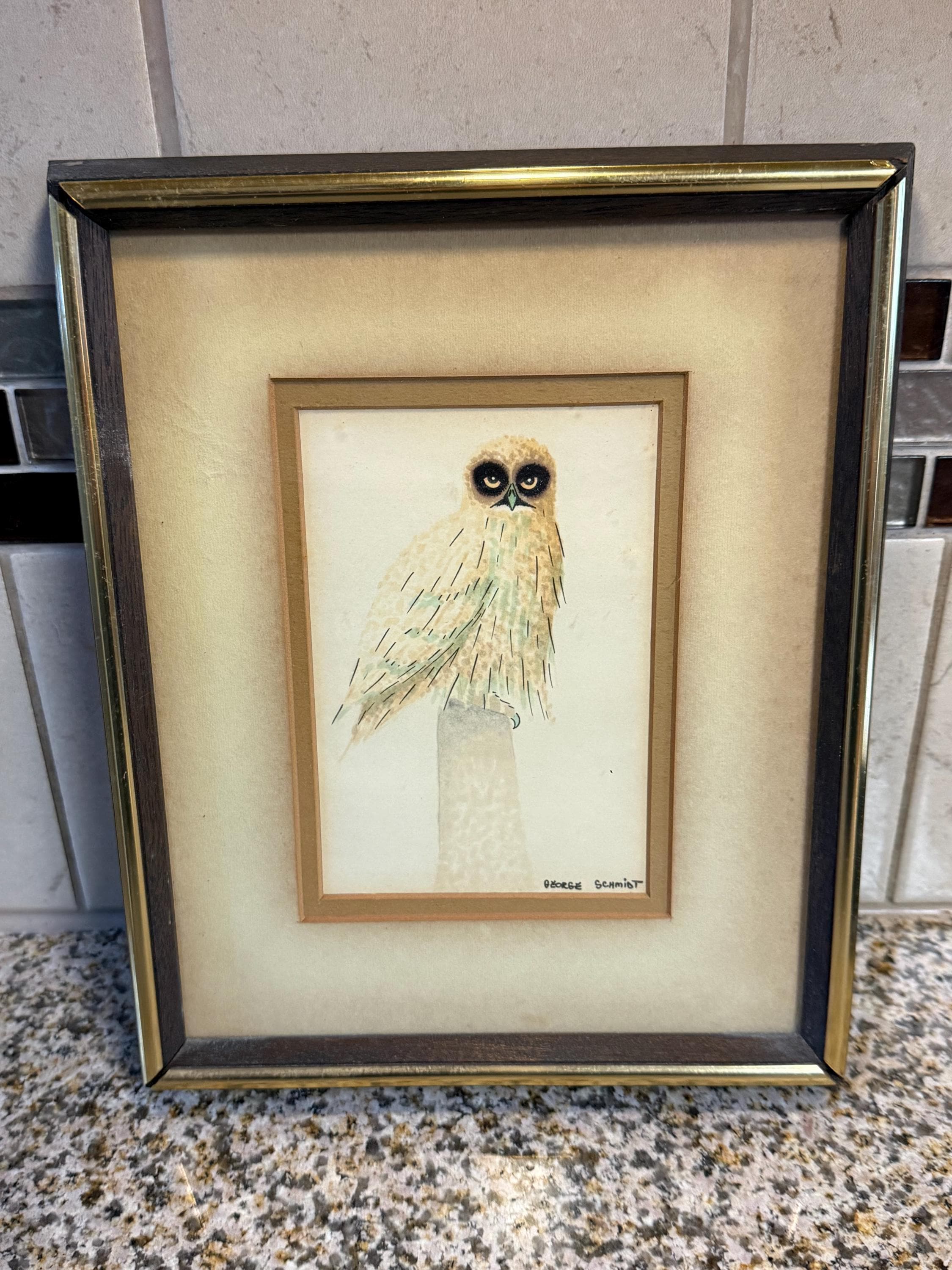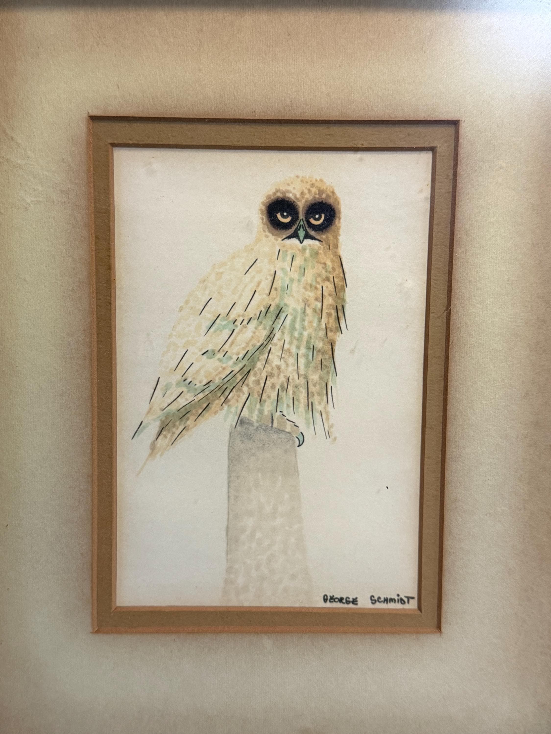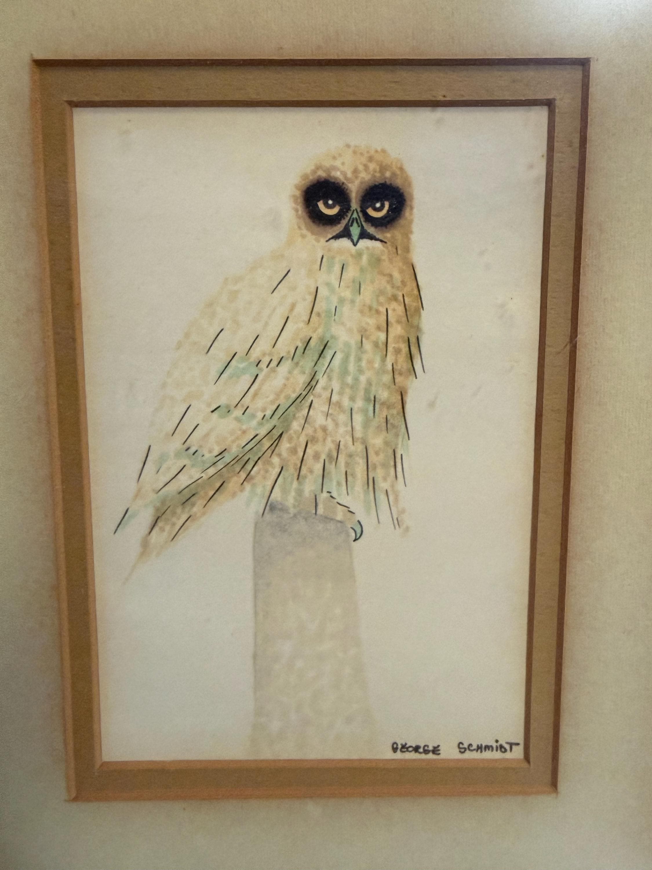 Discover this charming Vintage Short Eared Owl Watercolor by George Schmidt. It is framed and in excellent condition. The frame and the piece together measures approximately 11" high, 9" wide.