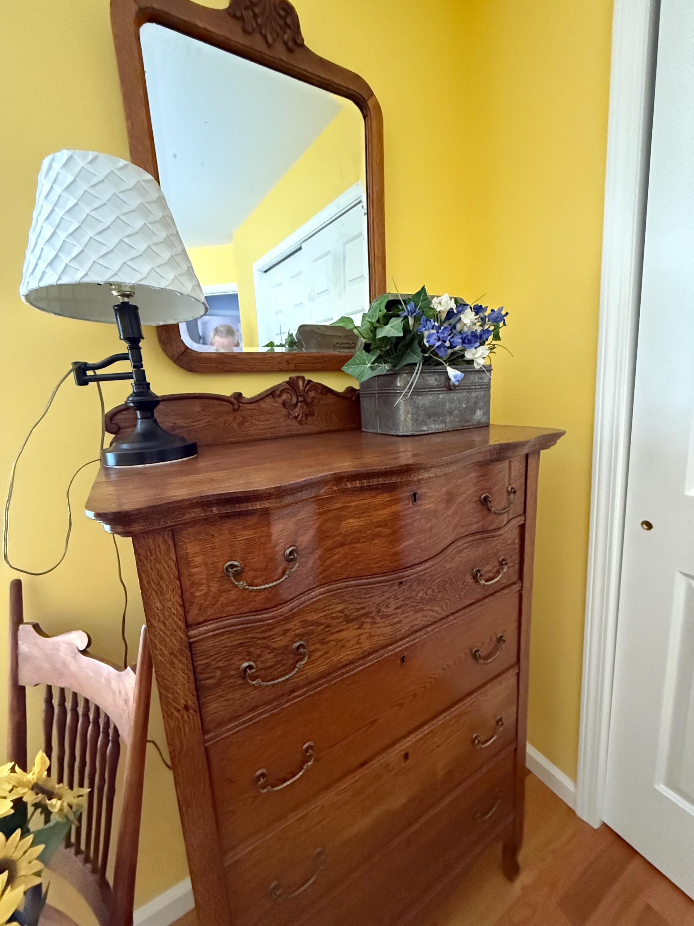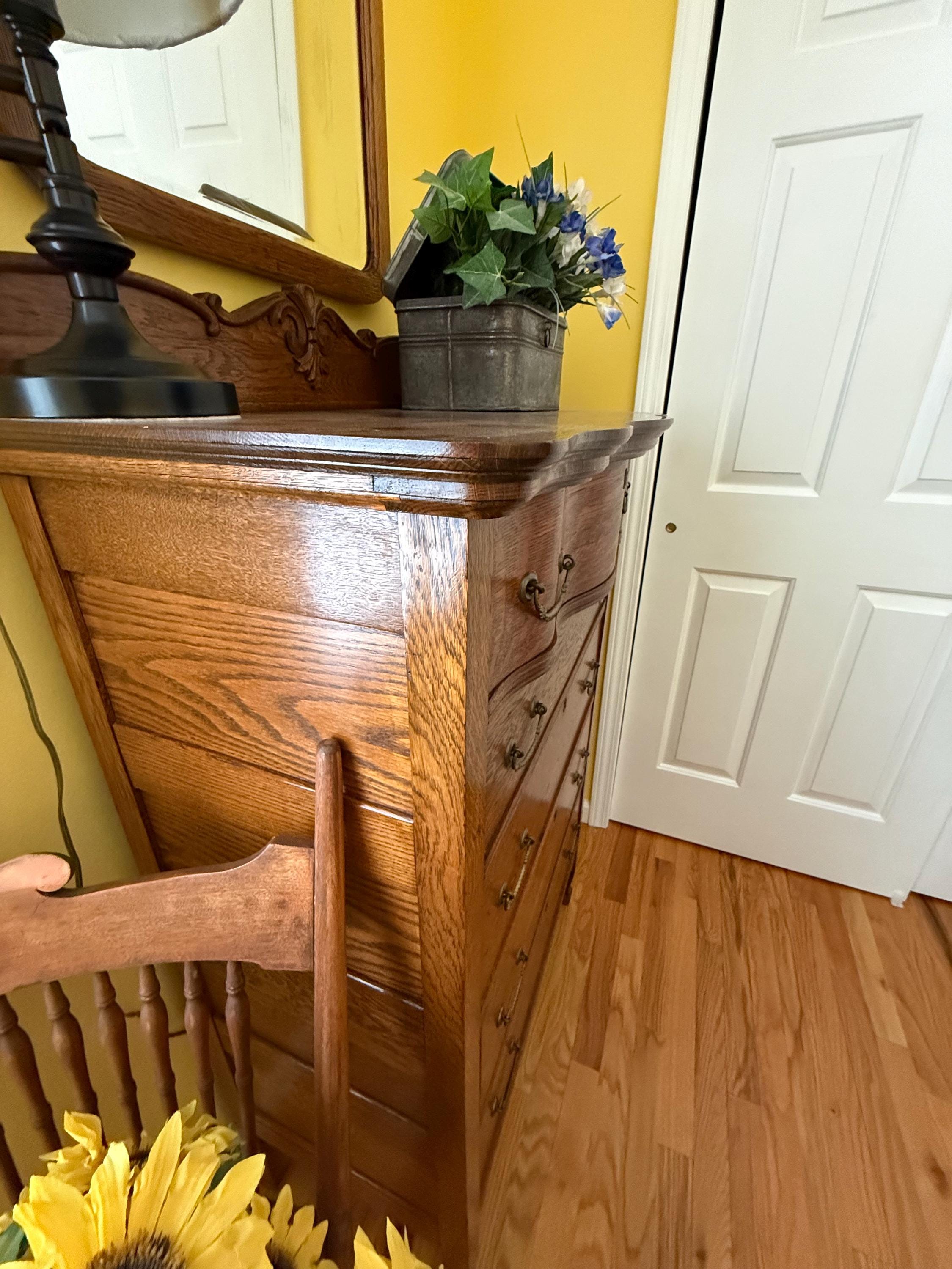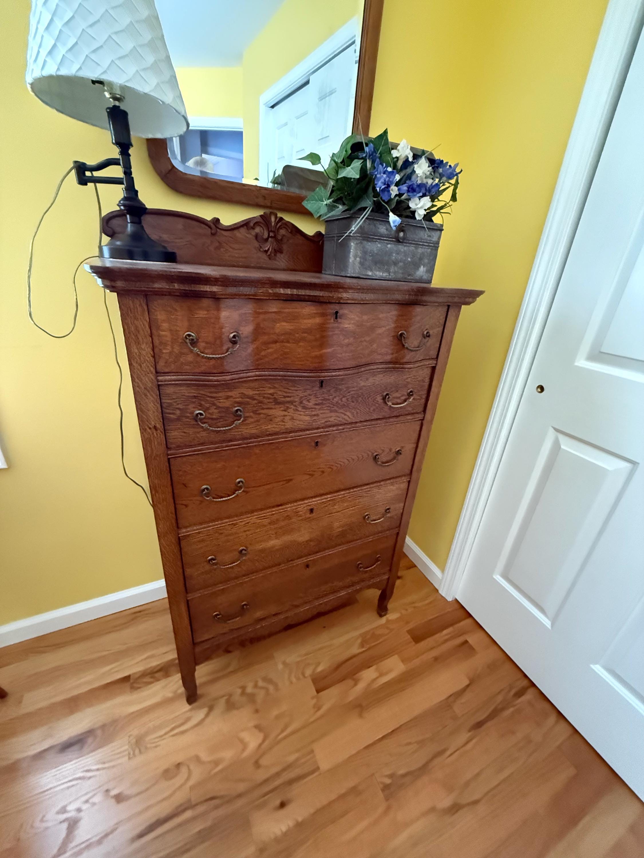 We have a very sweet Antique Early American Tiger Oak Dresser with Harp Mounted Serpentine Mirror & Original Hardware. It is in nice condition.