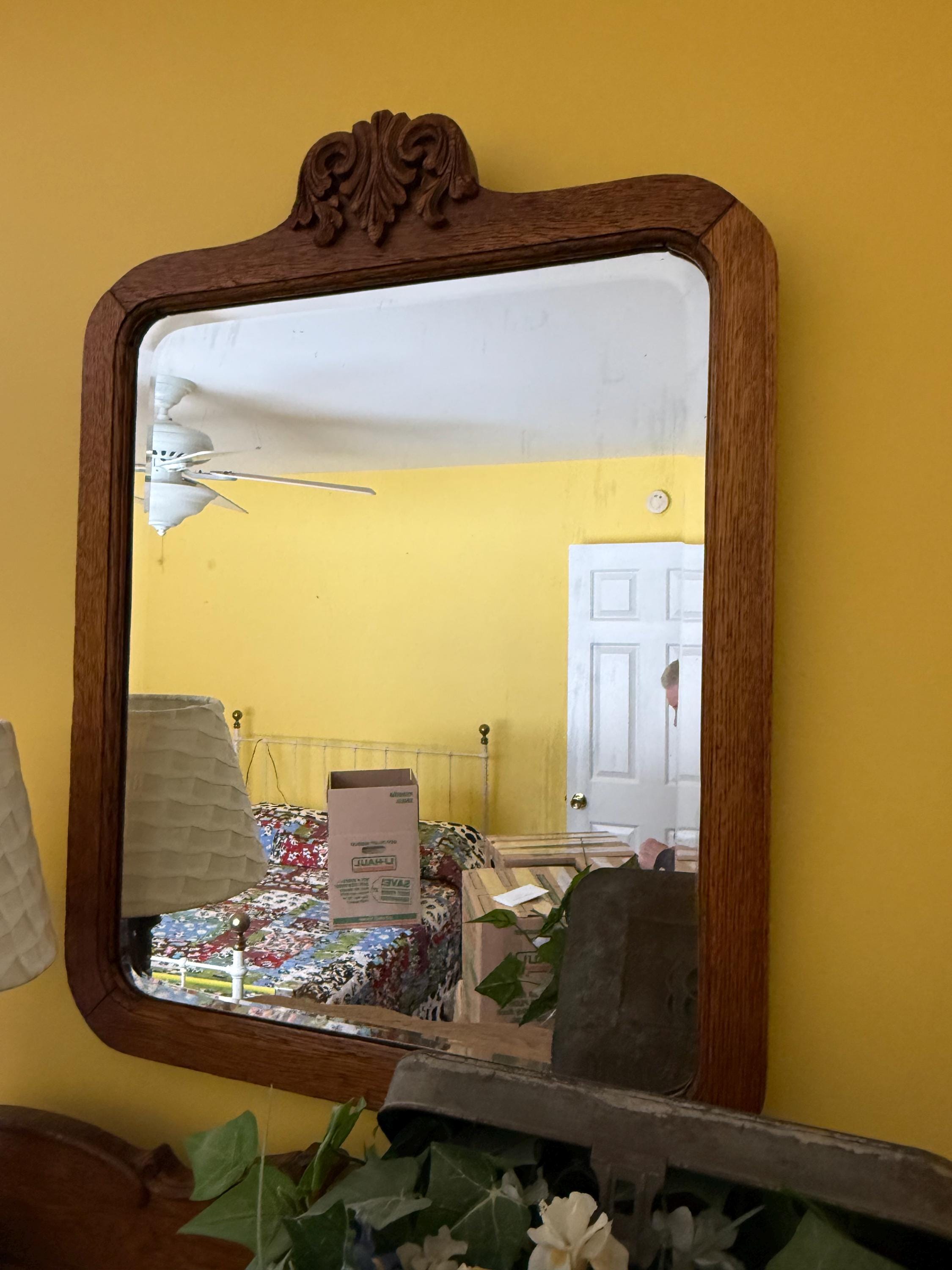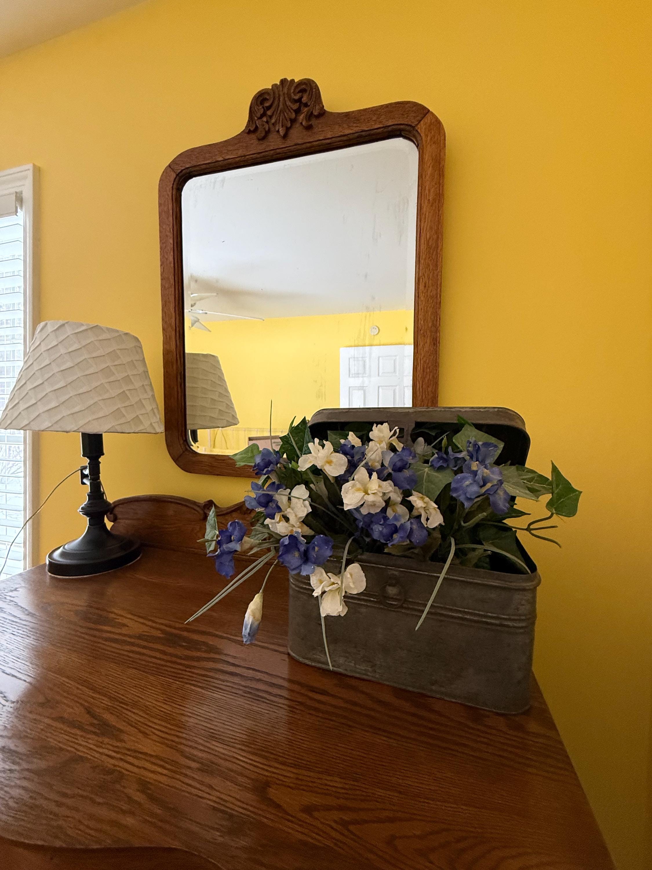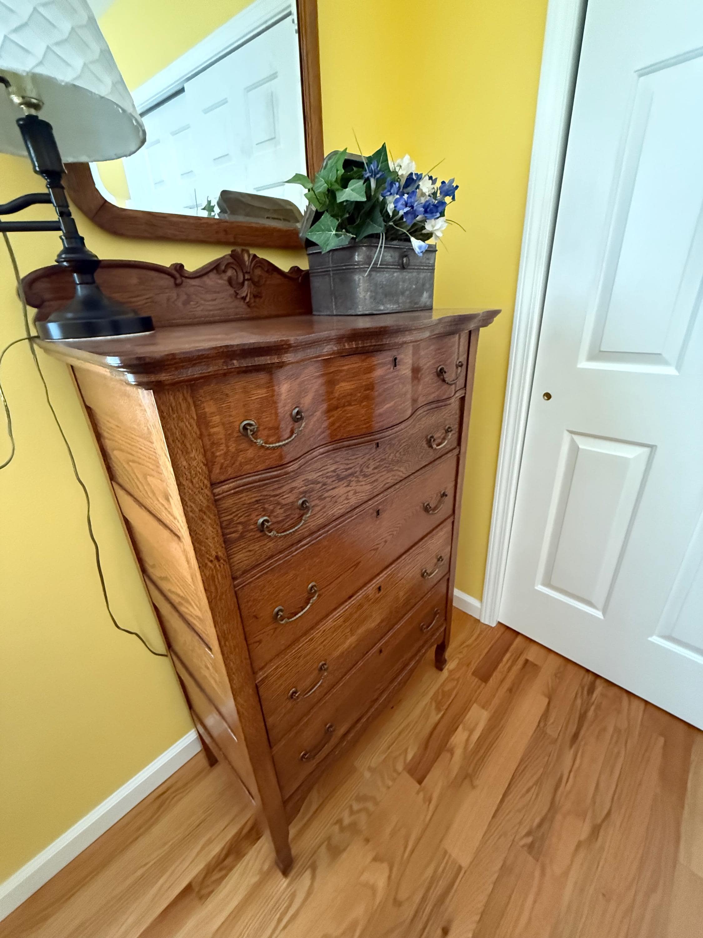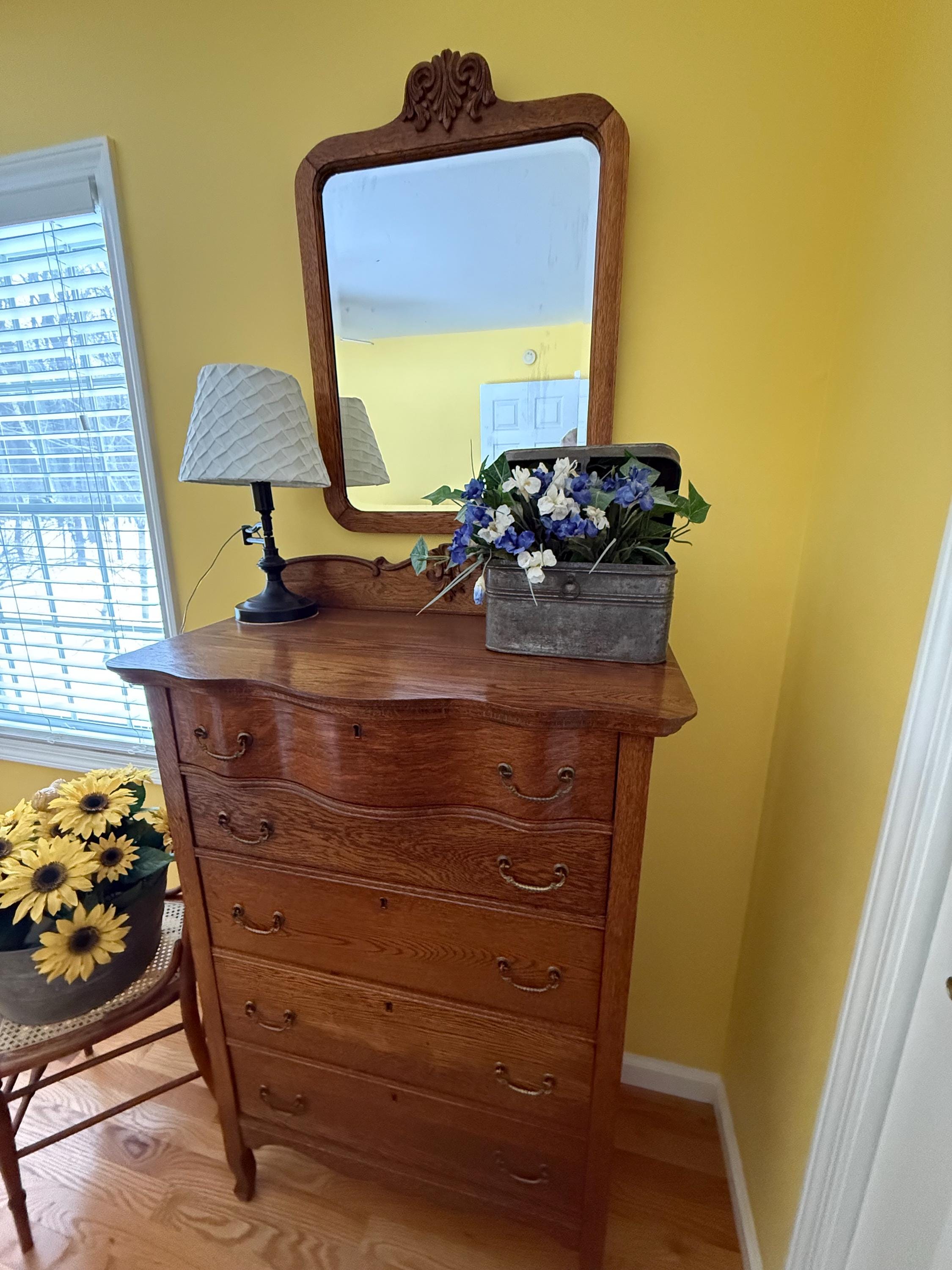 We have a very sweet Antique Early American Tiger Oak Dresser with Harp Mounted Serpentine Mirror & Original Hardware. It is in nice condition.