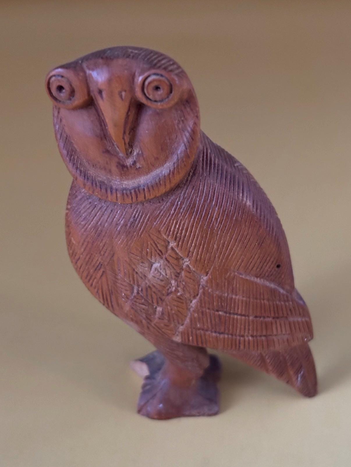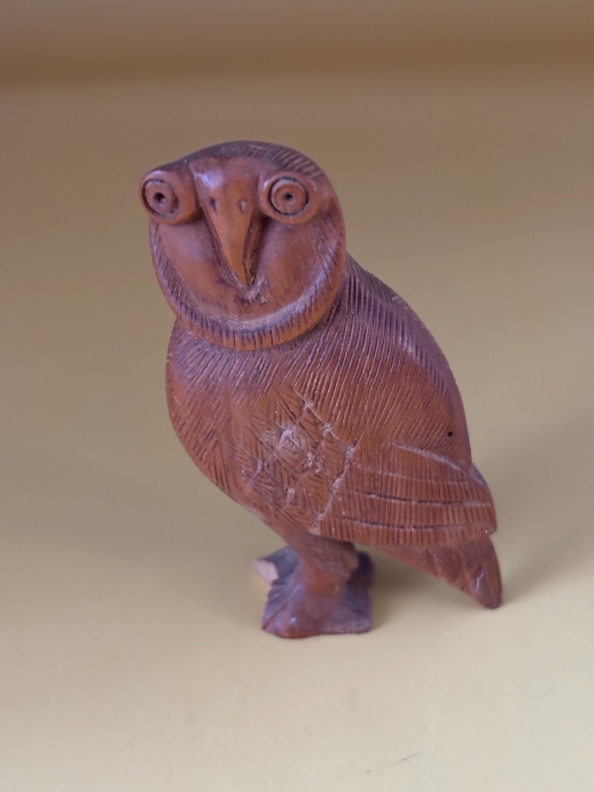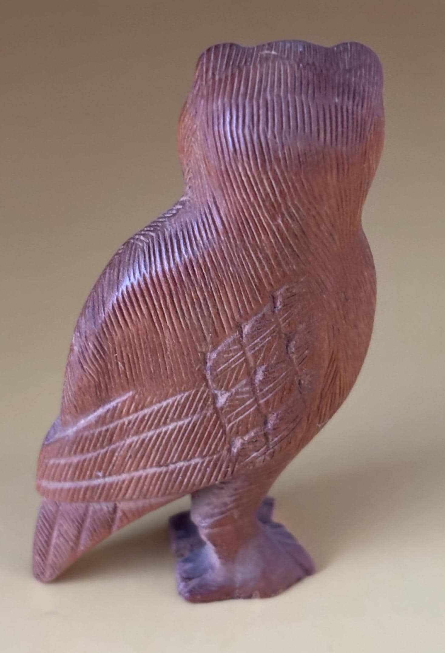 We have a gorgeous Vintage Hand Carved Indian Rosewood Owl Figurine. It is inscribed on the bottom India. I cannot find another one like this owl. A very sweet gift that will be sure to keep giving day after day.