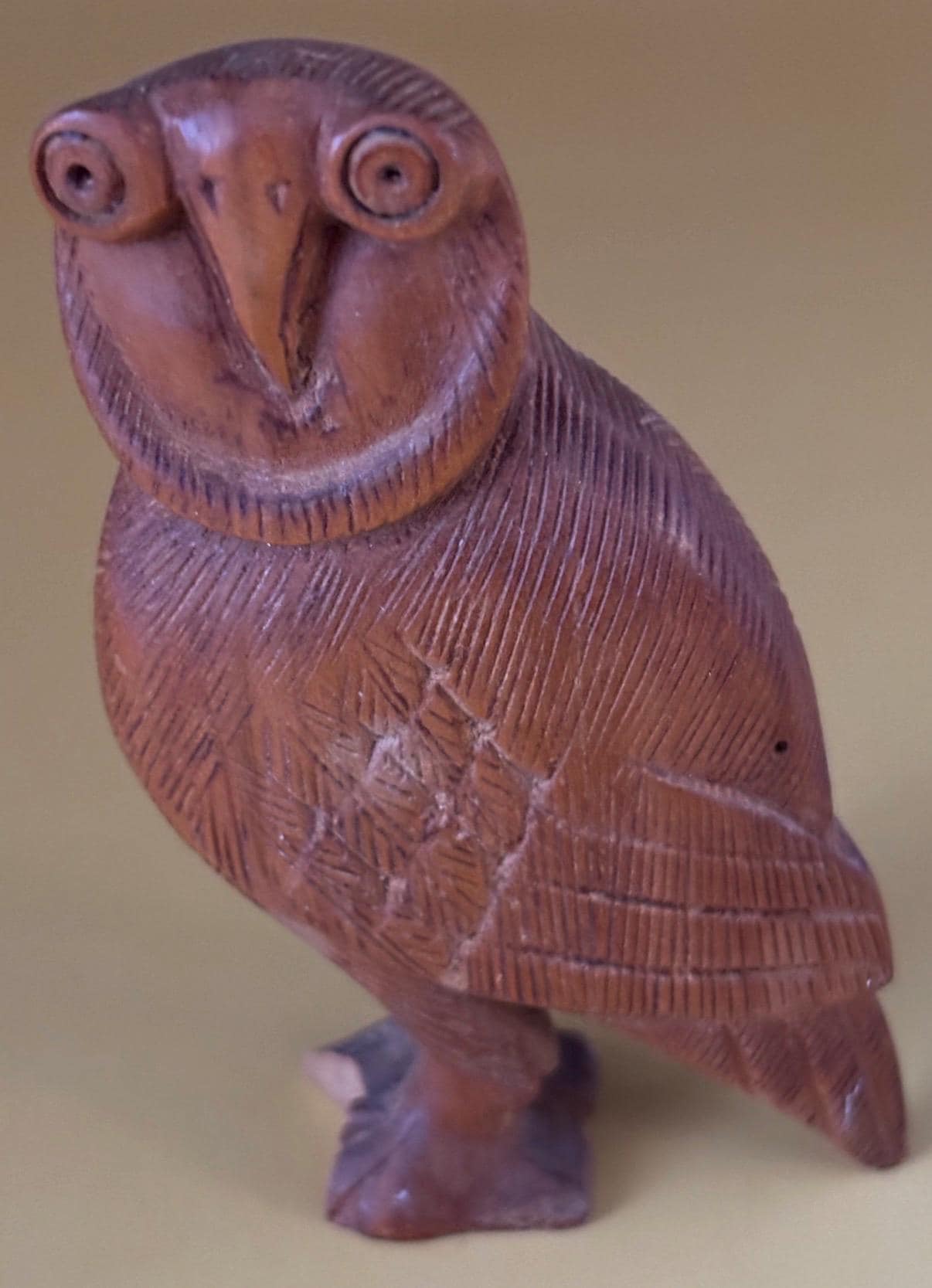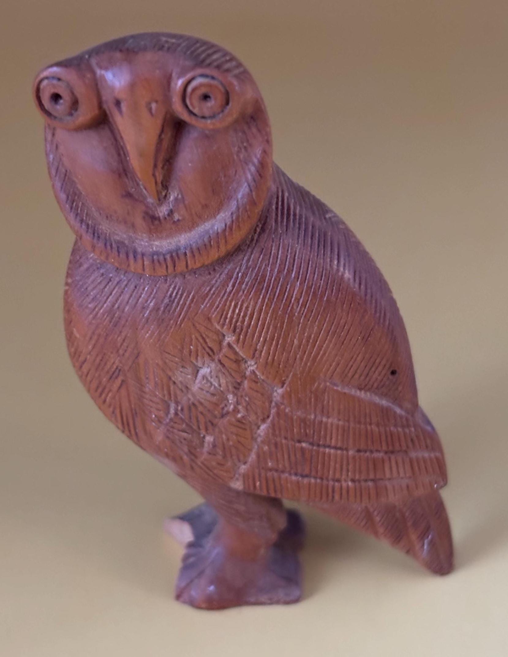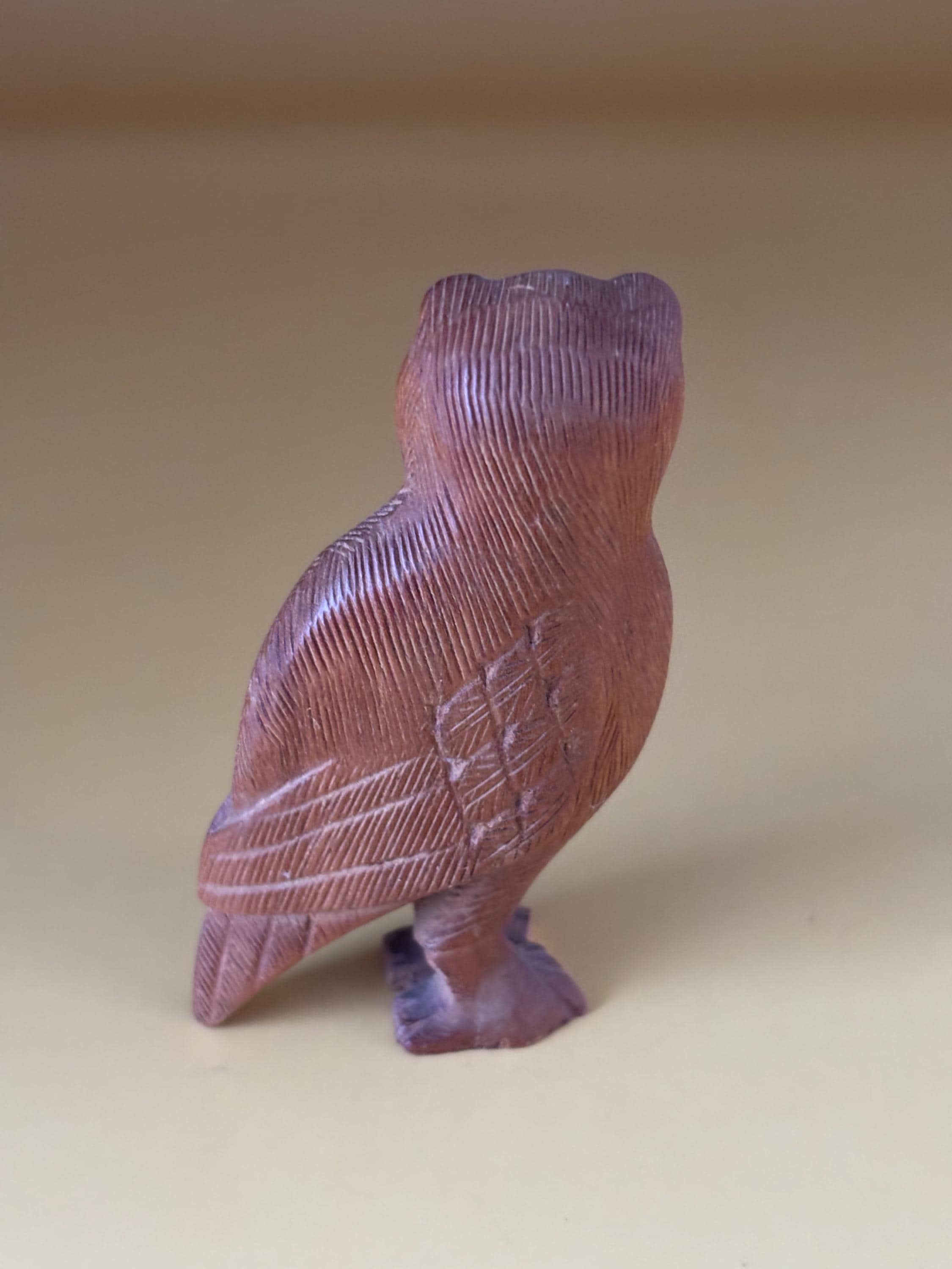 We have a gorgeous Vintage Hand Carved Indian Rosewood Owl Figurine. It is inscribed on the bottom India. I cannot find another one like this owl. A very sweet gift that will be sure to keep giving day after day.
