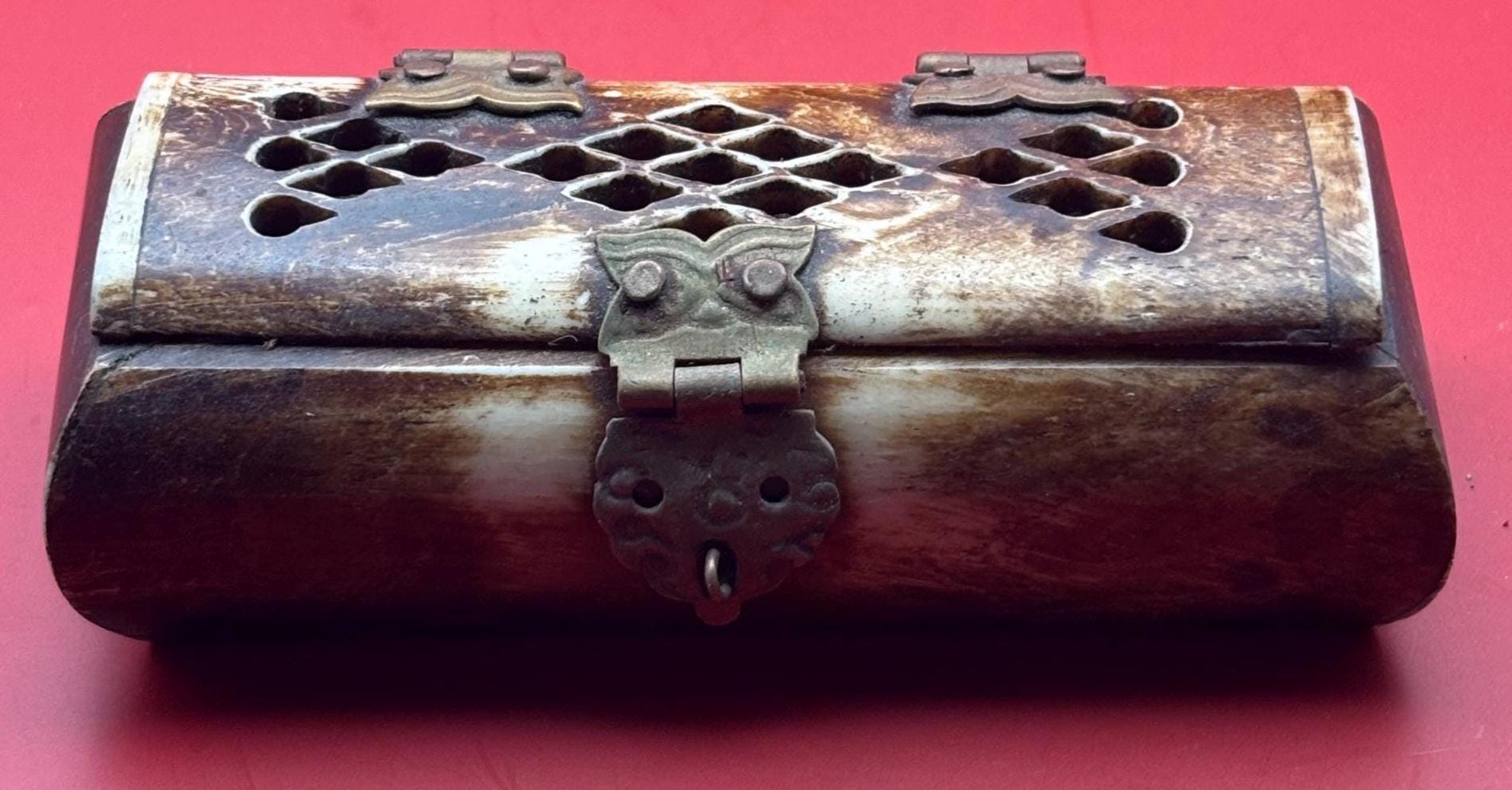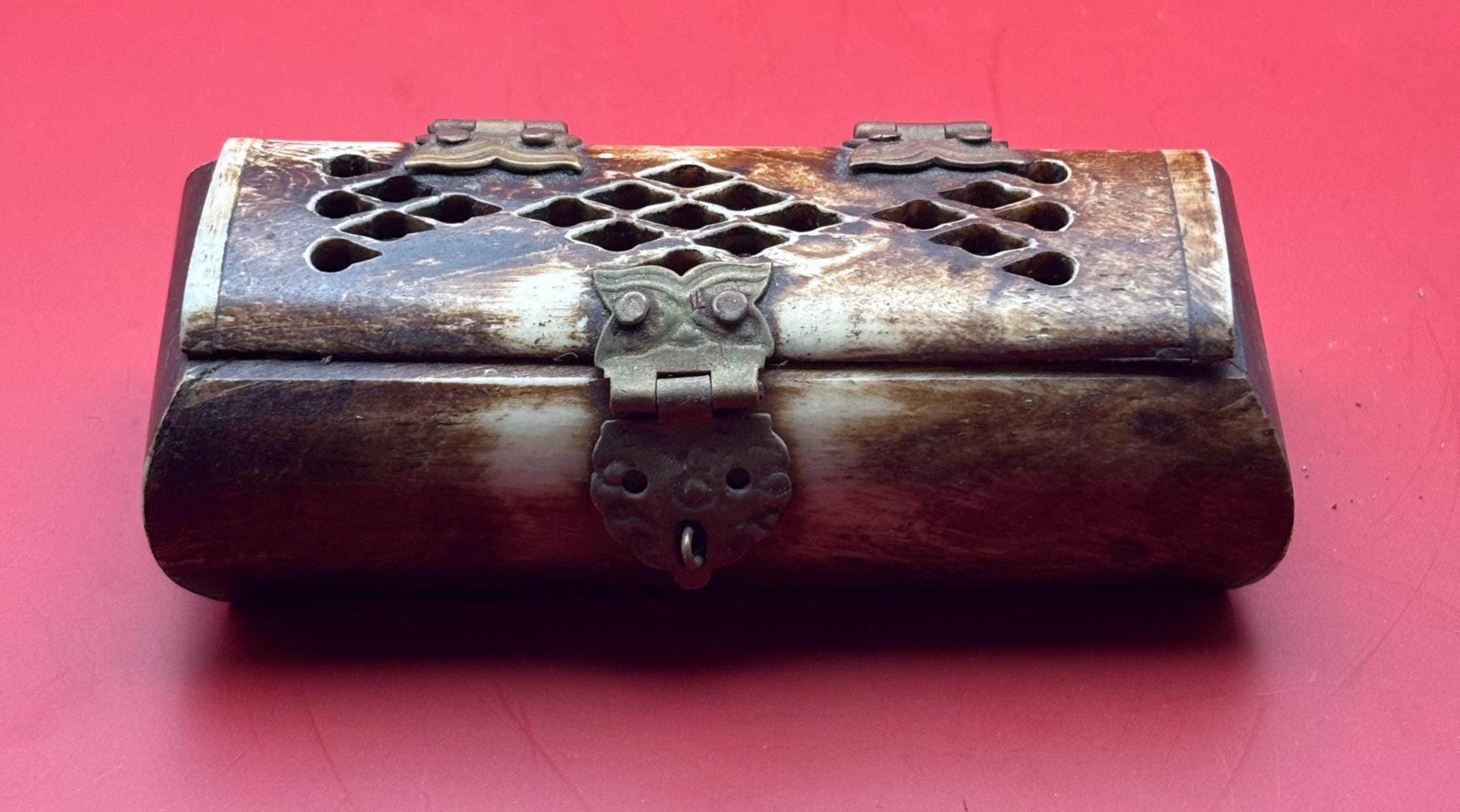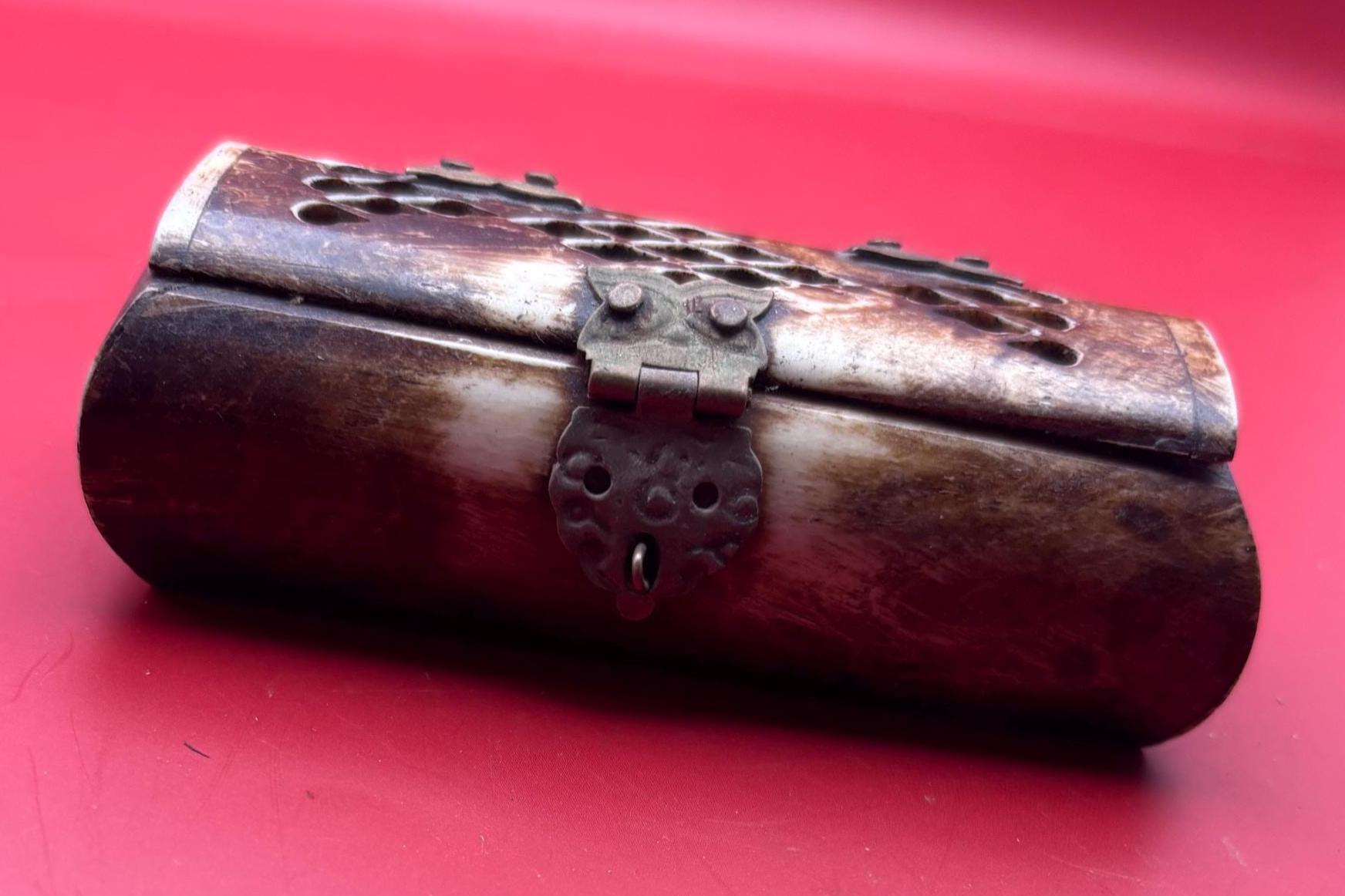We LOVE this Vintage Owl Trinket Box featuring Owl Hinges! A lovely piece, and a perfect addition for owl lovers and vintage enthusiasts alike. Crafted from bone with intricate brass accents, this miniature jewelry box exudes timeless elegance and unique character. Its adorable owl motif on the lid adds a whimsical touch, making it both a functional storage piece and a decorative collectible.