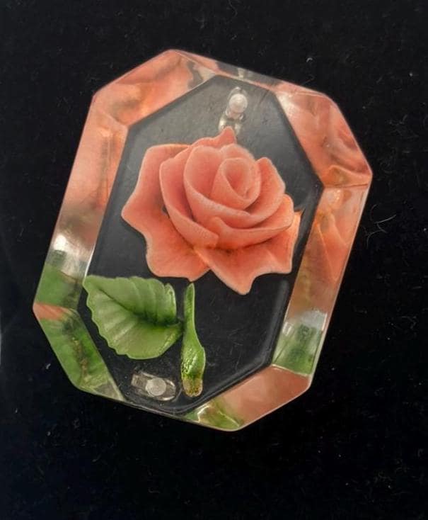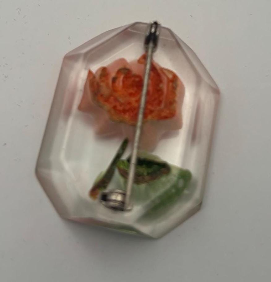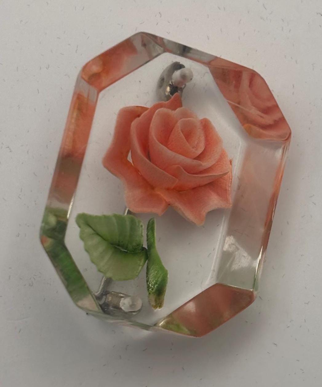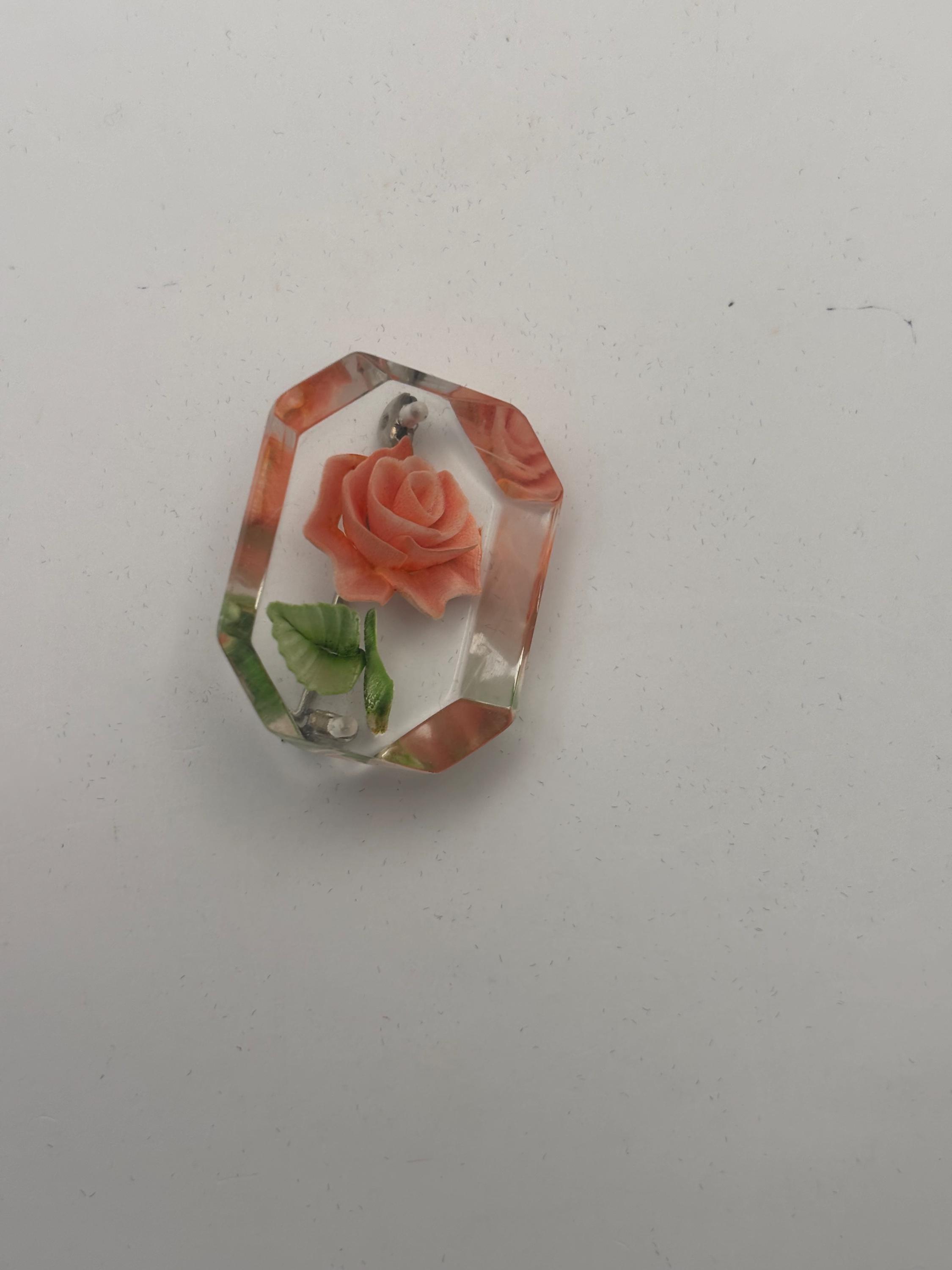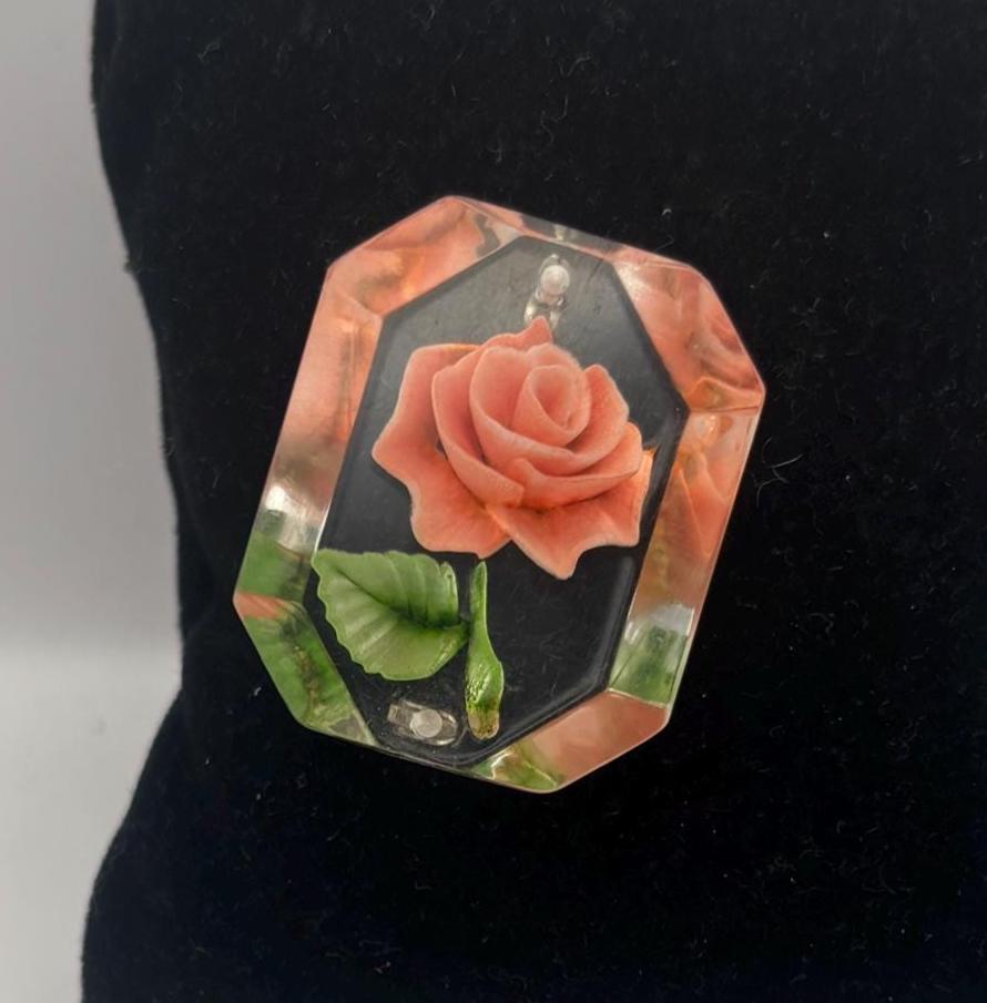We have a lovely Vintage Rose Reverse Carved Lucite Brooch.