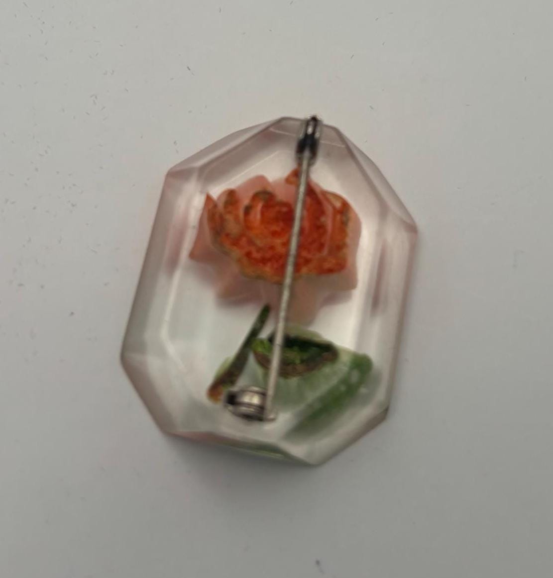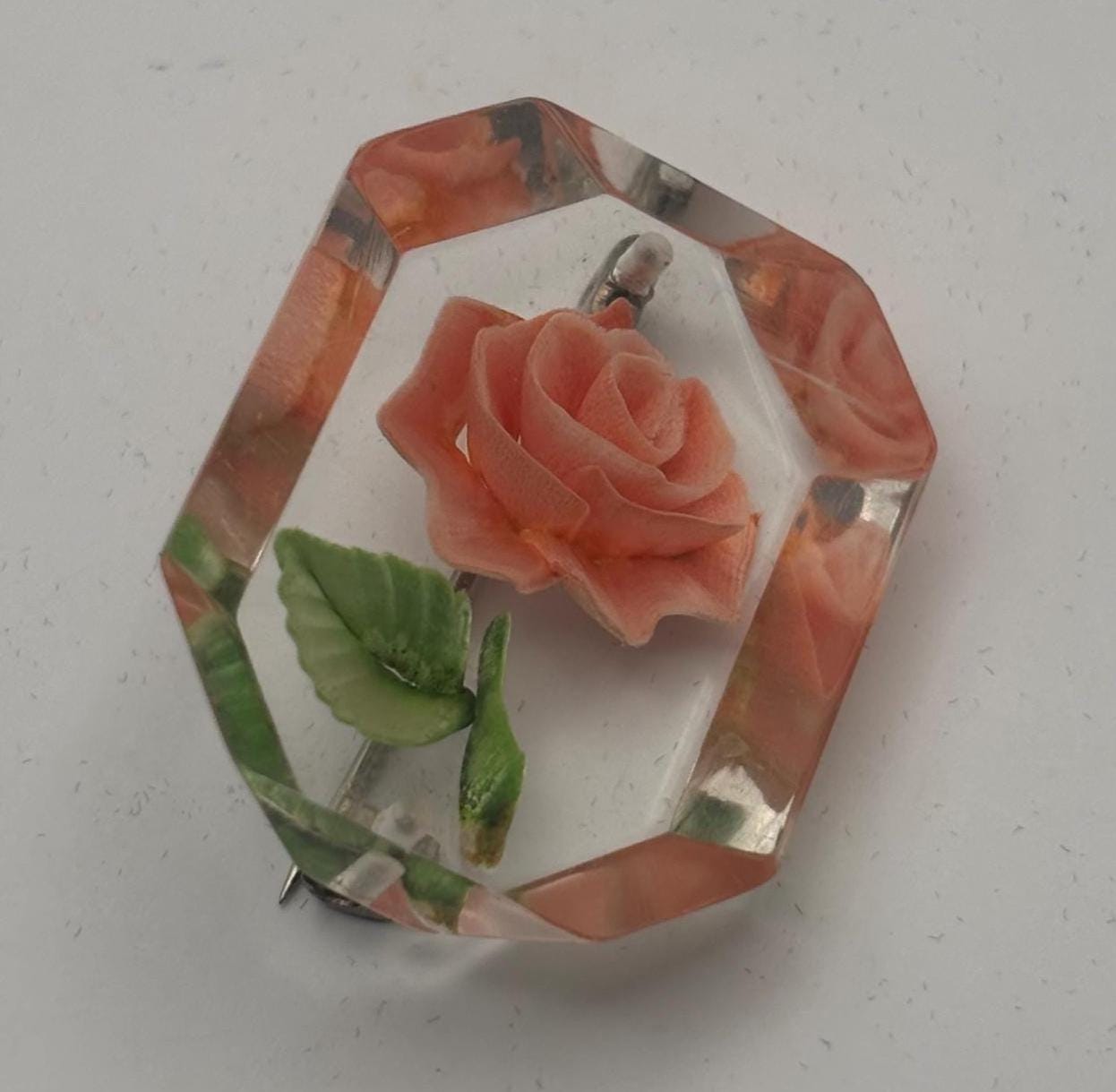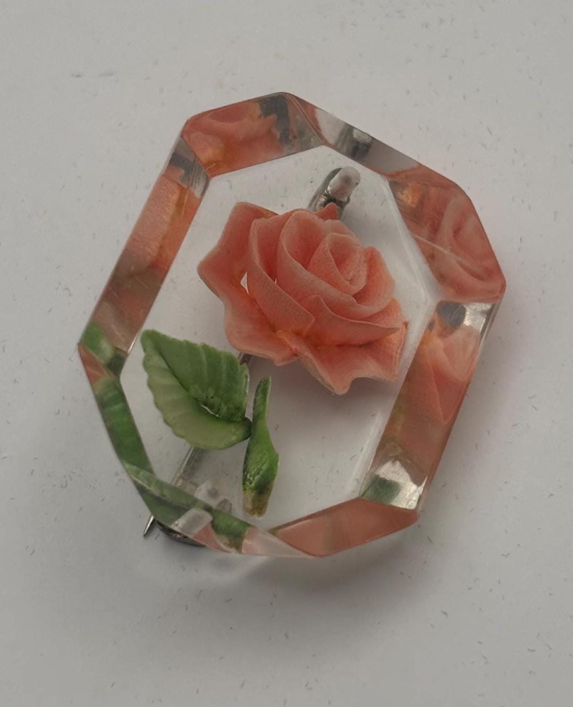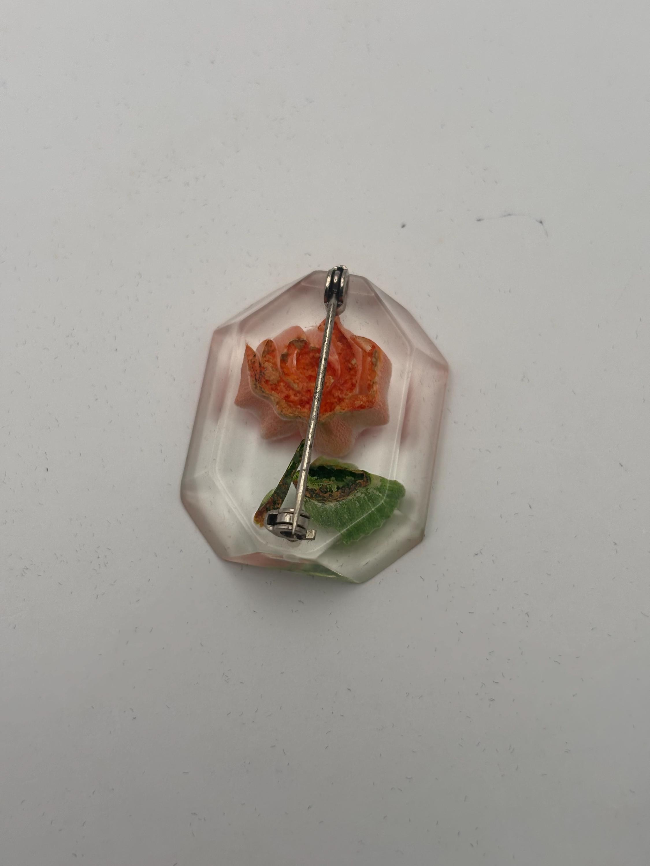 We have a lovely Vintage Rose Reverse Carved Lucite Brooch.
