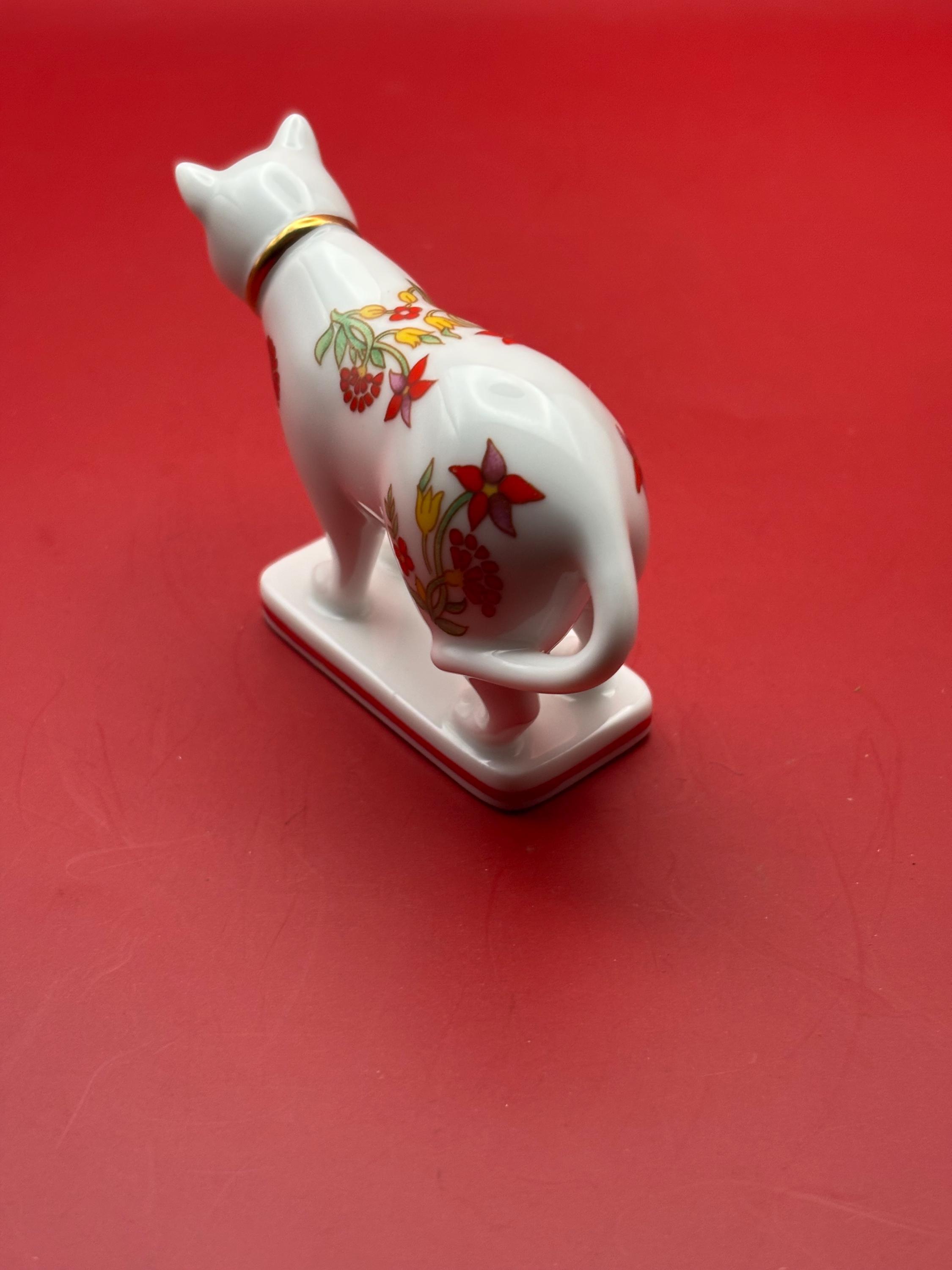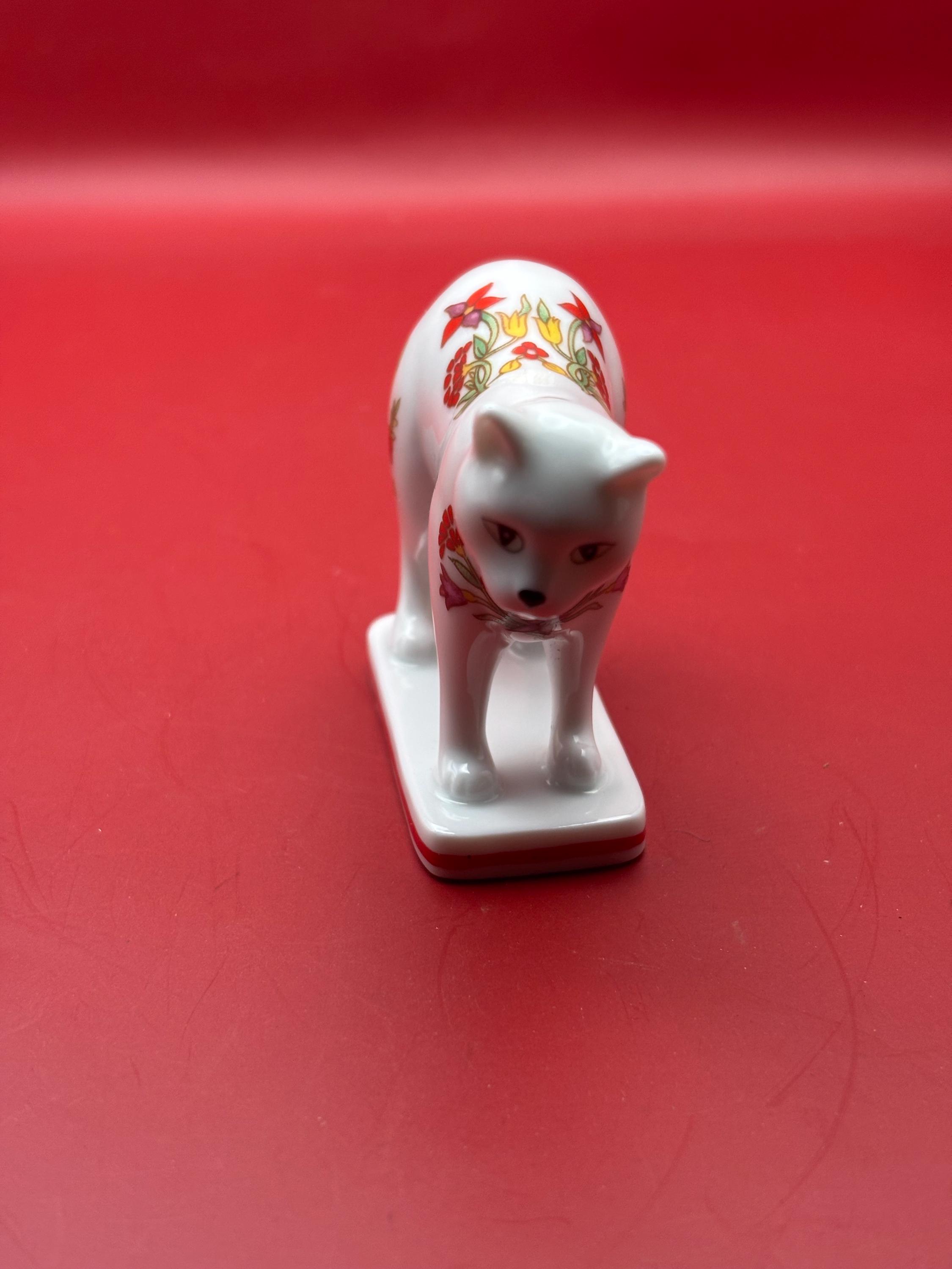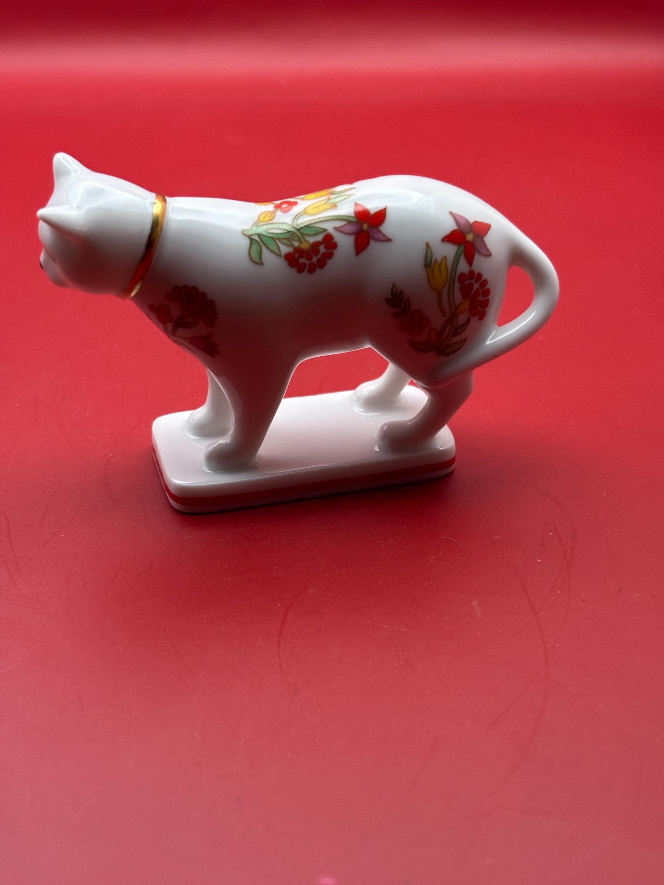 This Vintage Kakiemon Porcelain Cat is a charming collectible featuring a white porcelain body adorned with intricate hand-painted floral designs in red, yellow, and blue. Standing 2 inches tall and 3.5 inches long, this delicate figurine showcases the exquisite craftsmanship and timeless style typical of Kakiemon porcelain. The cat is mounted on a rectangular base with a subtle red trim, adding to its refined appearance.