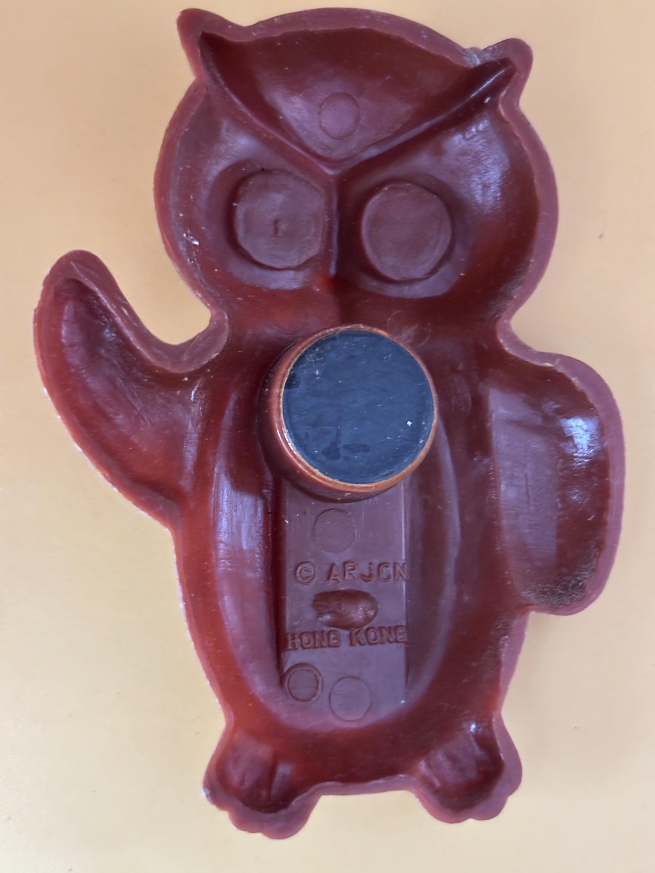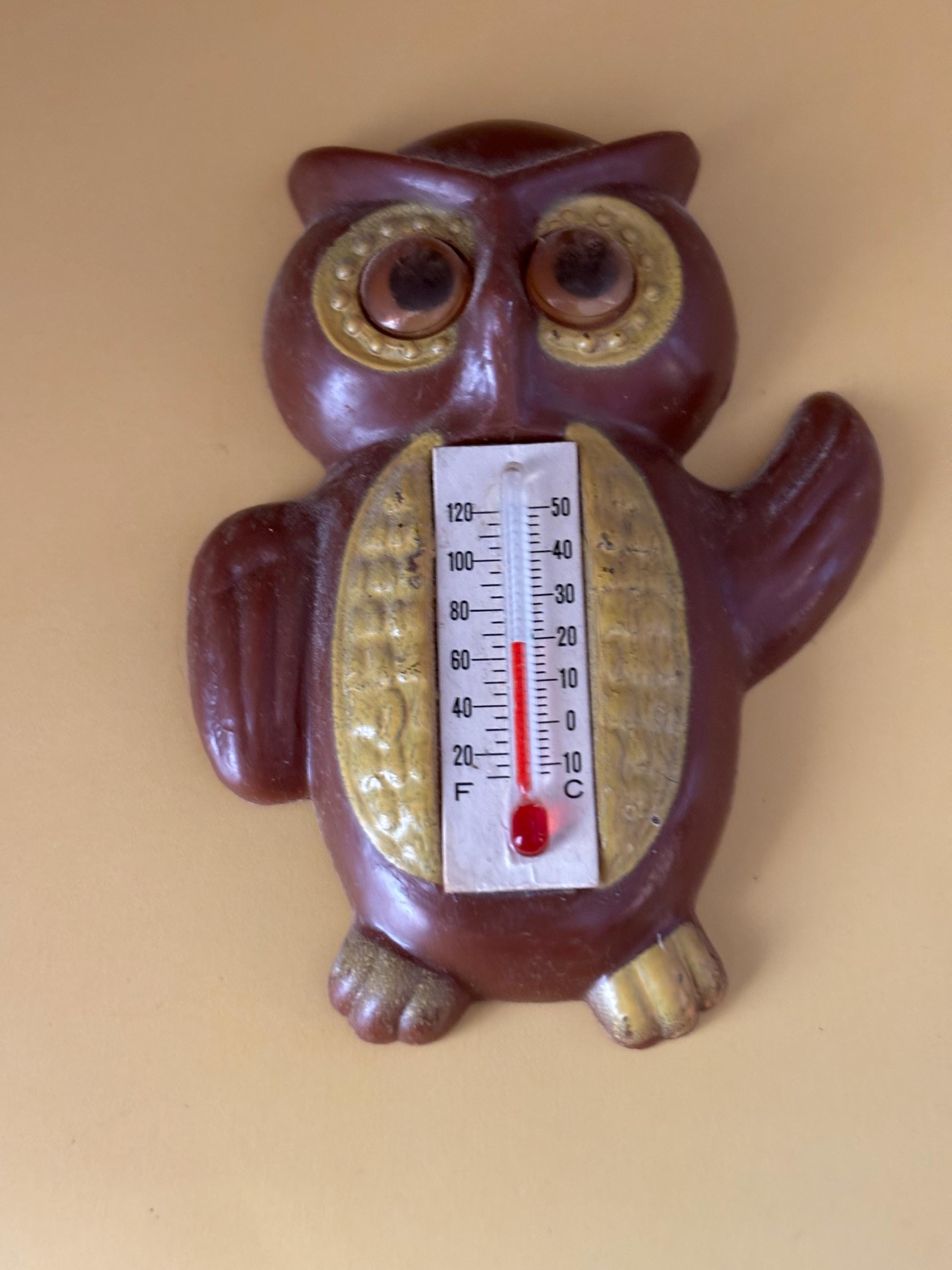 Add a touch of vintage charm to your home or garden with this Vintage Owl Thermometer. Made from brown resin with golden accents, this cute owl-shaped thermometer features easy-to-read Fahrenheit and Celsius scales on its belly. Its cheerful waving wing and wide eyes make it a fun, retro piece that brings character to any space. The thermometer is in good condition with minor signs of age, perfect for collectors or vintage décor enthusiasts.