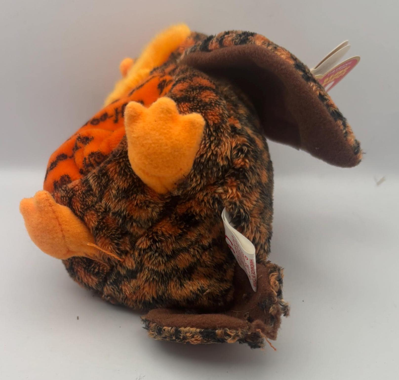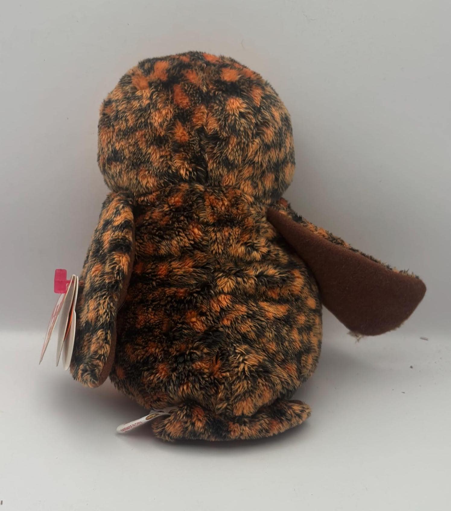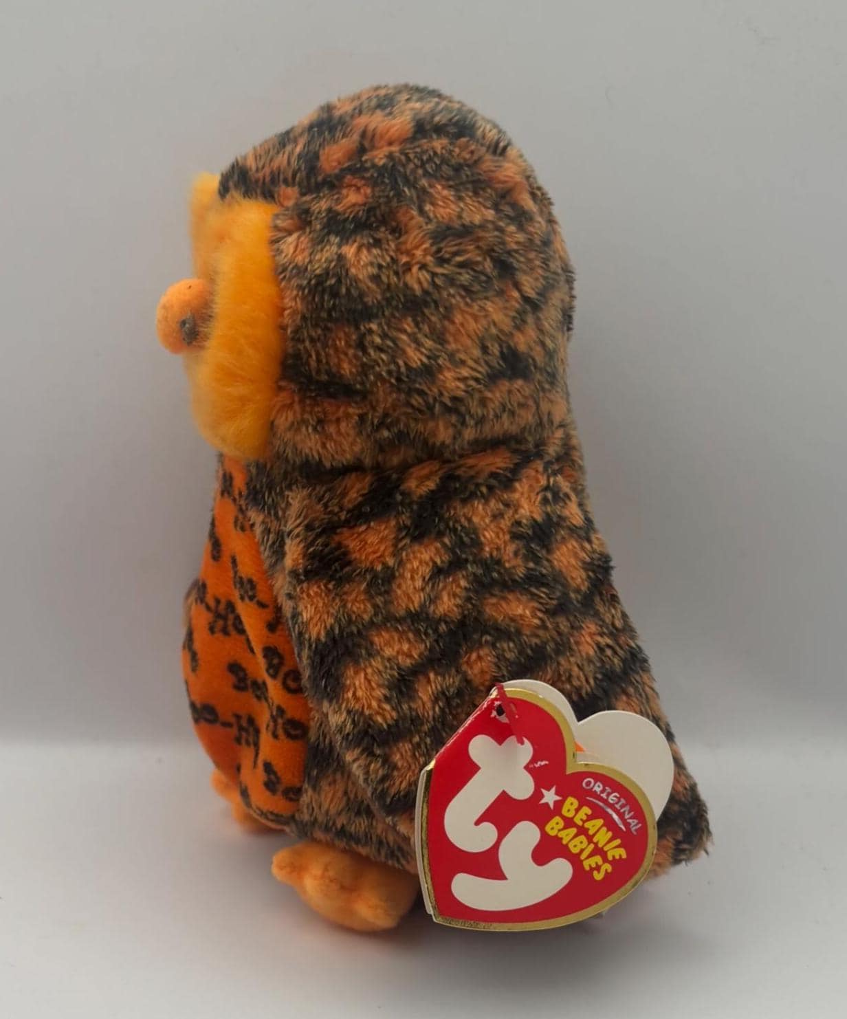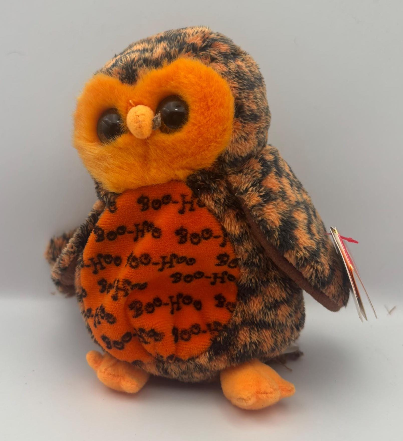 Presenting this Boo Who? The Halloween Owl, Retired Ty Beanie Baby Owl Plush Stuffed Animal. It is a charming collectible plush featuring vibrant orange and brown tones with 'Hoo-Hoo' text on its belly, perfect for any Ty Beanie Baby enthusiast or owl lover. This vintage stuffed animal showcases the classic Ty heart-shaped tag, a must-have for collectors interested in 90s nostalgia and whimsical designs.