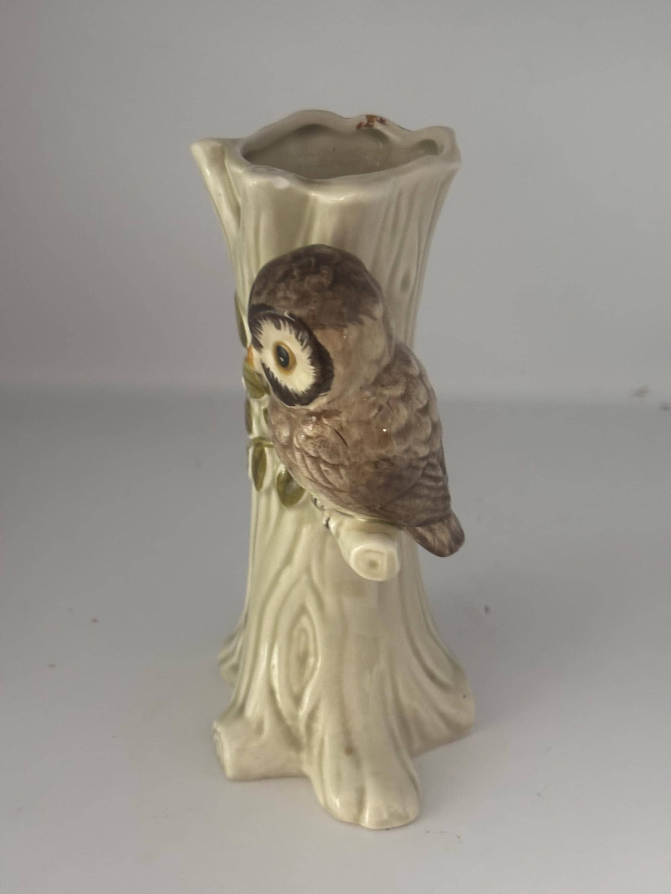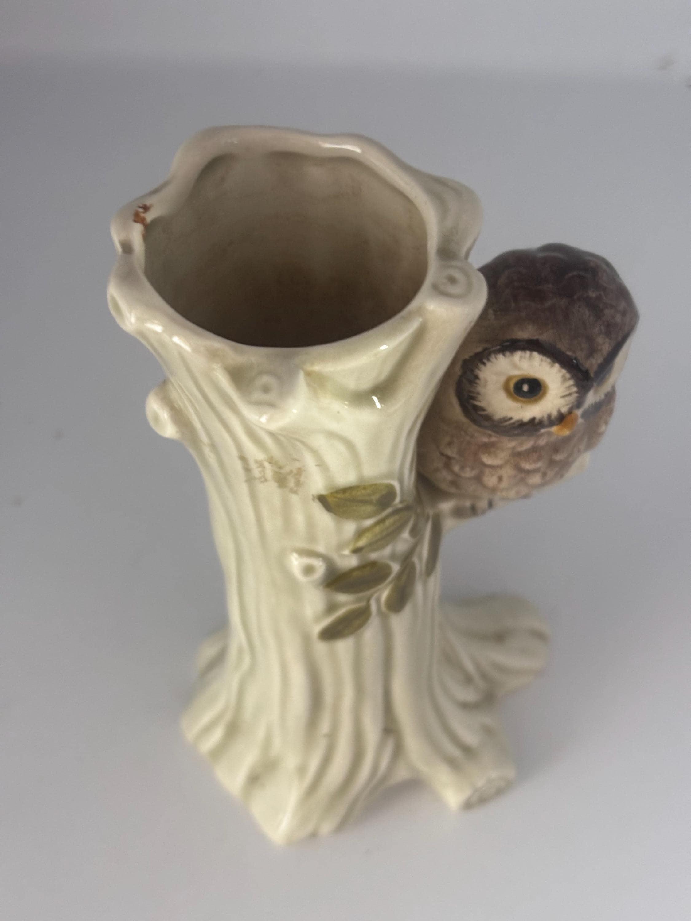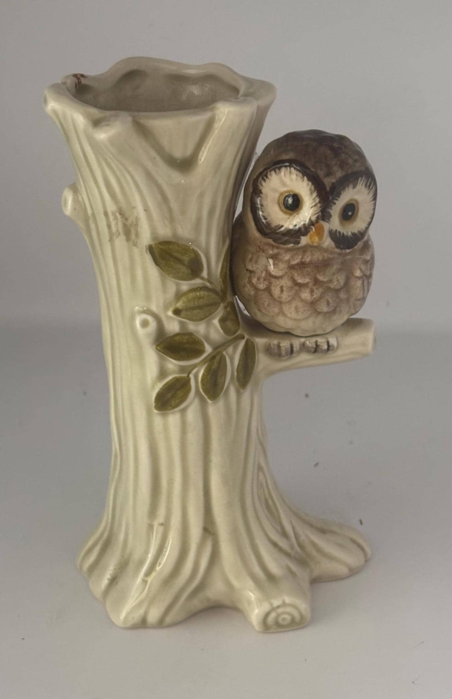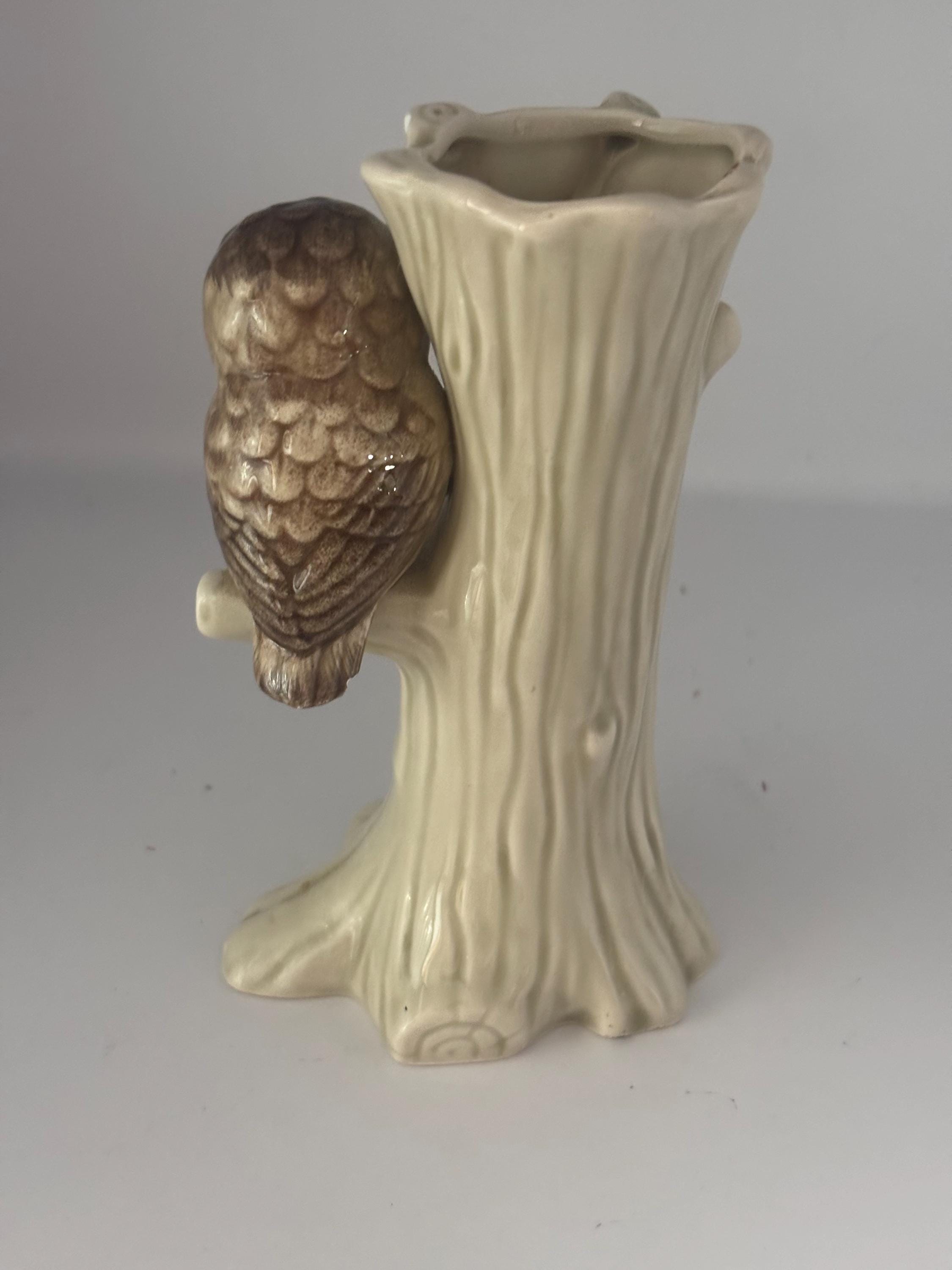 We adore this Vintage Otagiri OMC Owl Vase. Crafted from ceramic, this delightful piece features a detailed tree trunk design with a perched owl, capturing a mid-century aesthetic in soft cream and brown tones. Standing 5 1/2 inches tall, it makes a perfect small planter or decorative vase for succulents, flowers, or greenery.