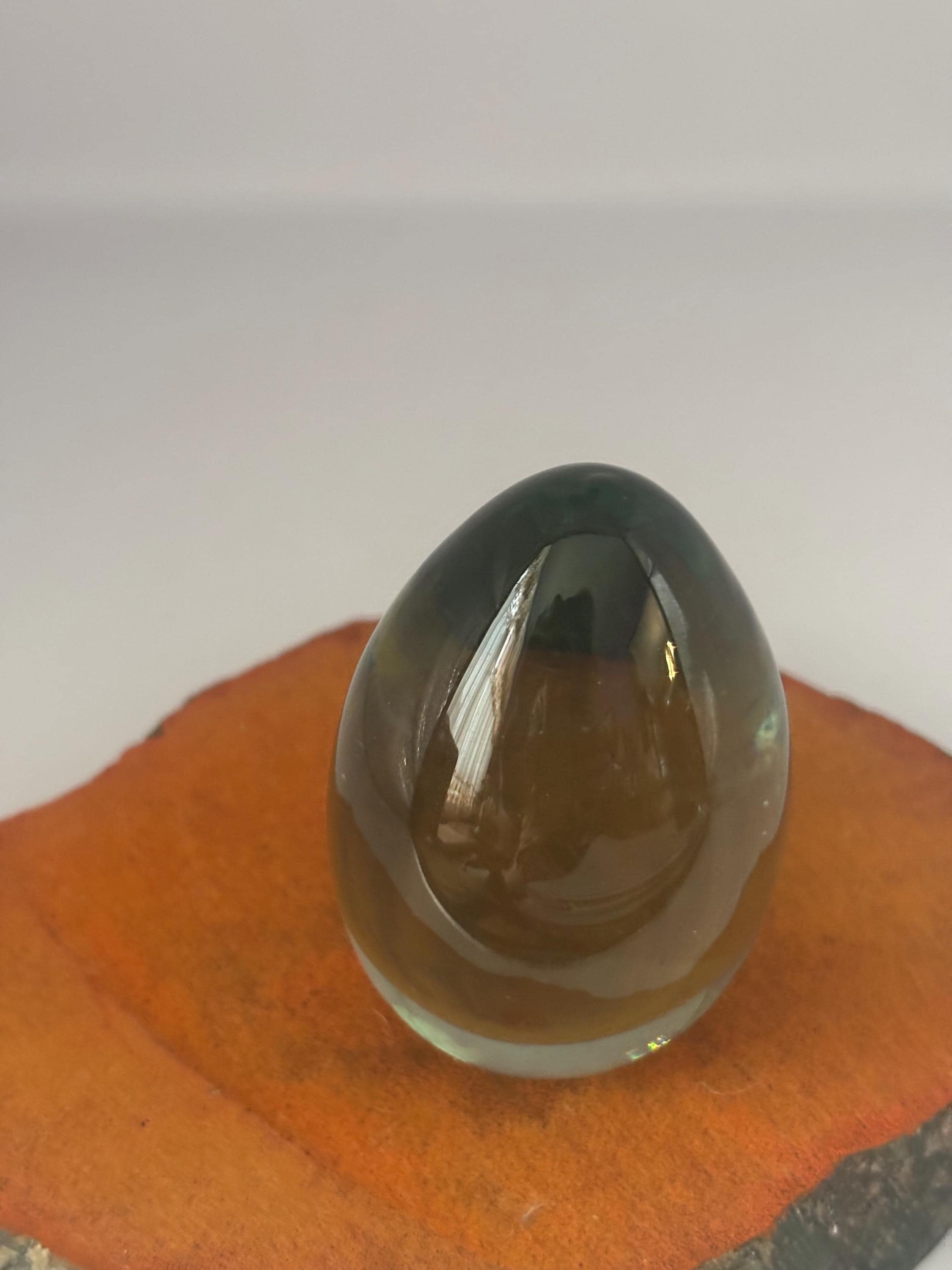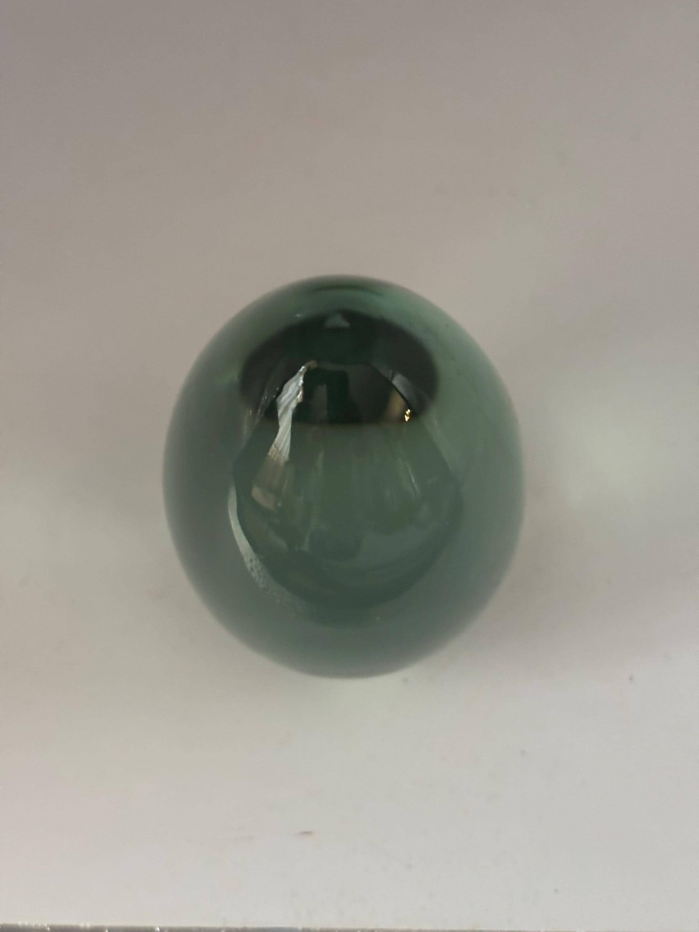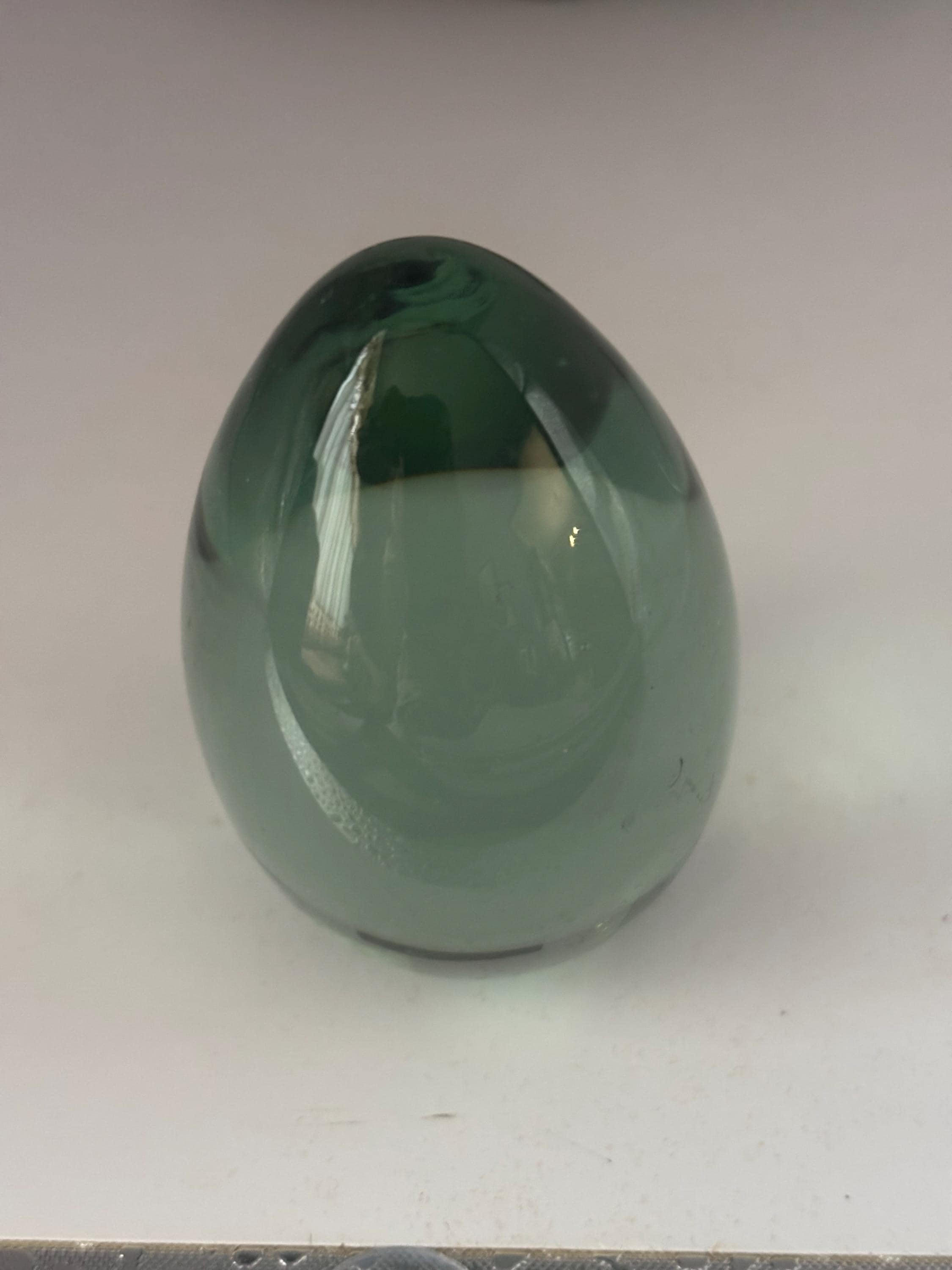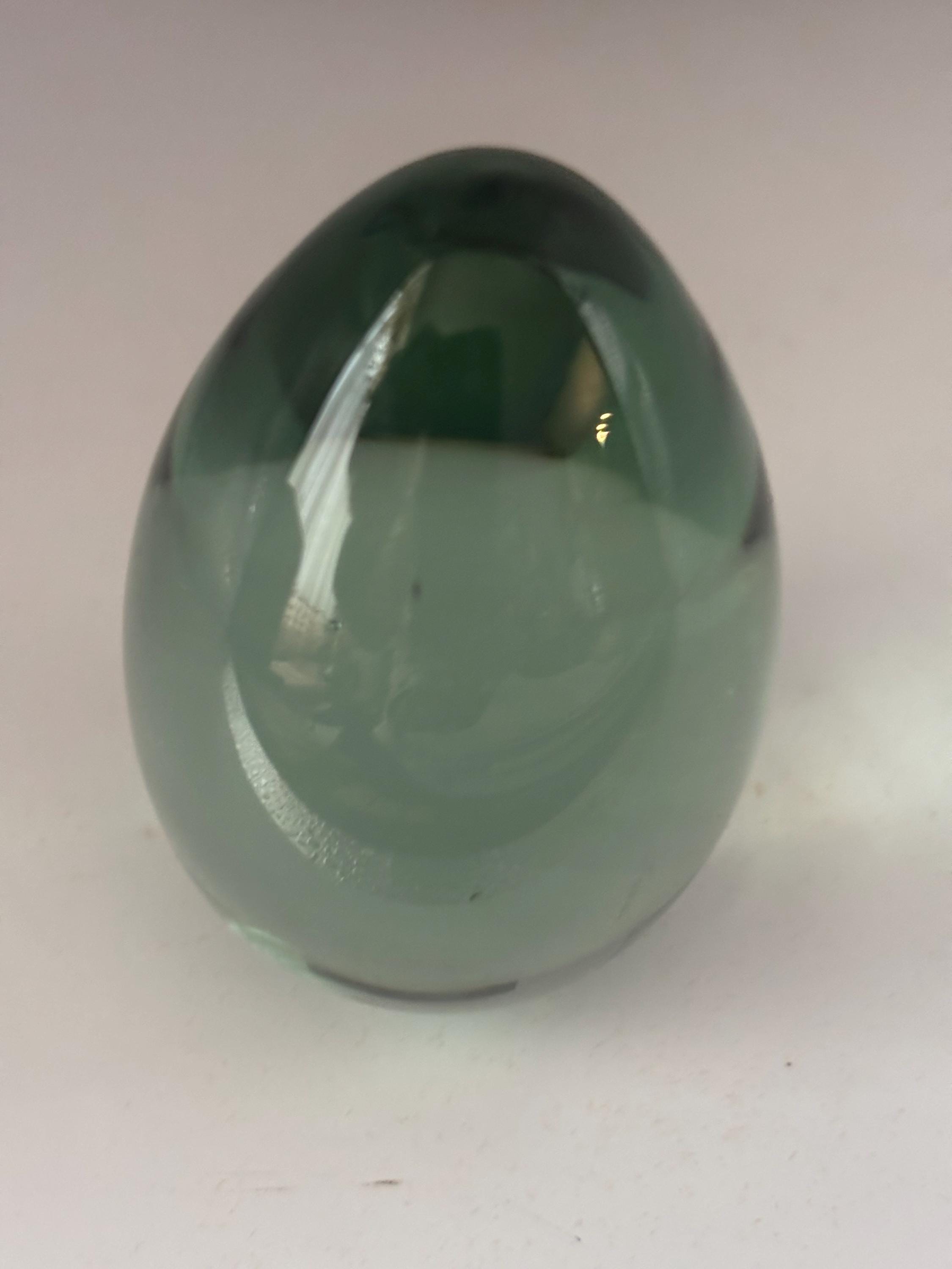 Ideal for collectors or those seeking a unique gift, this green glass paperweight is both heavy and sturdy, ensuring it will keep your papers firmly in place. Its compact size and smooth contours make it an ideal accent piece atop bookshelves, desks, or display cabinets. Add a touch of classic artistry and nostalgic appeal with this vintage glass egg paperweight today.