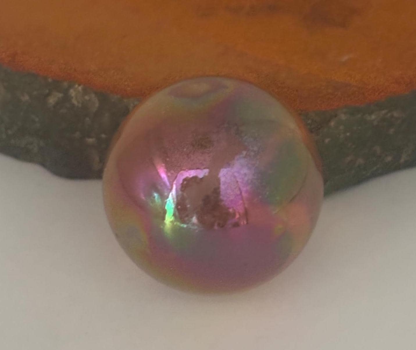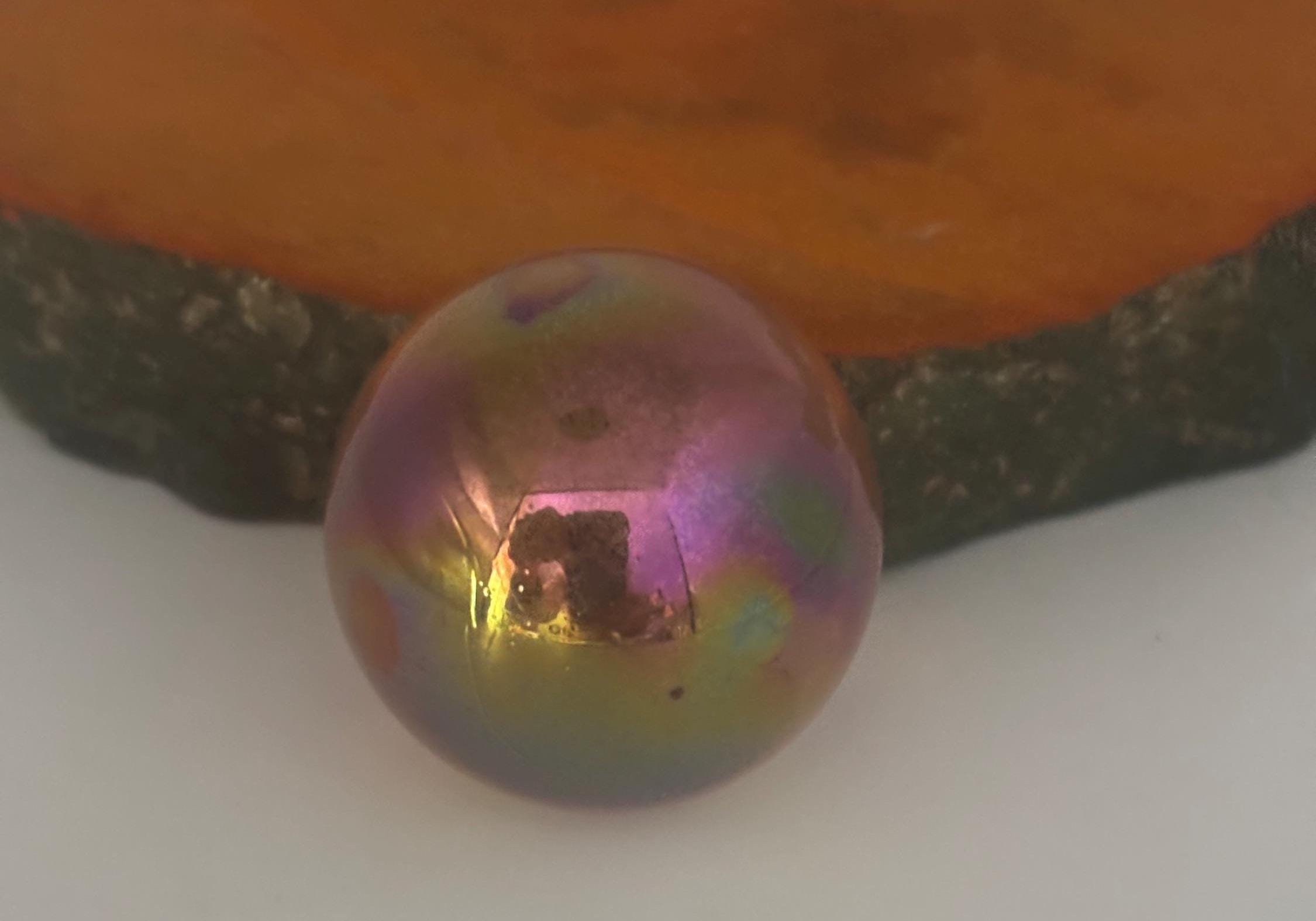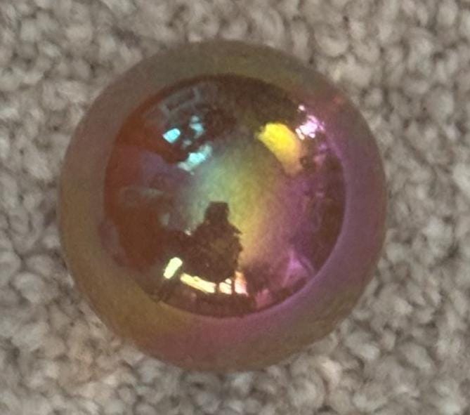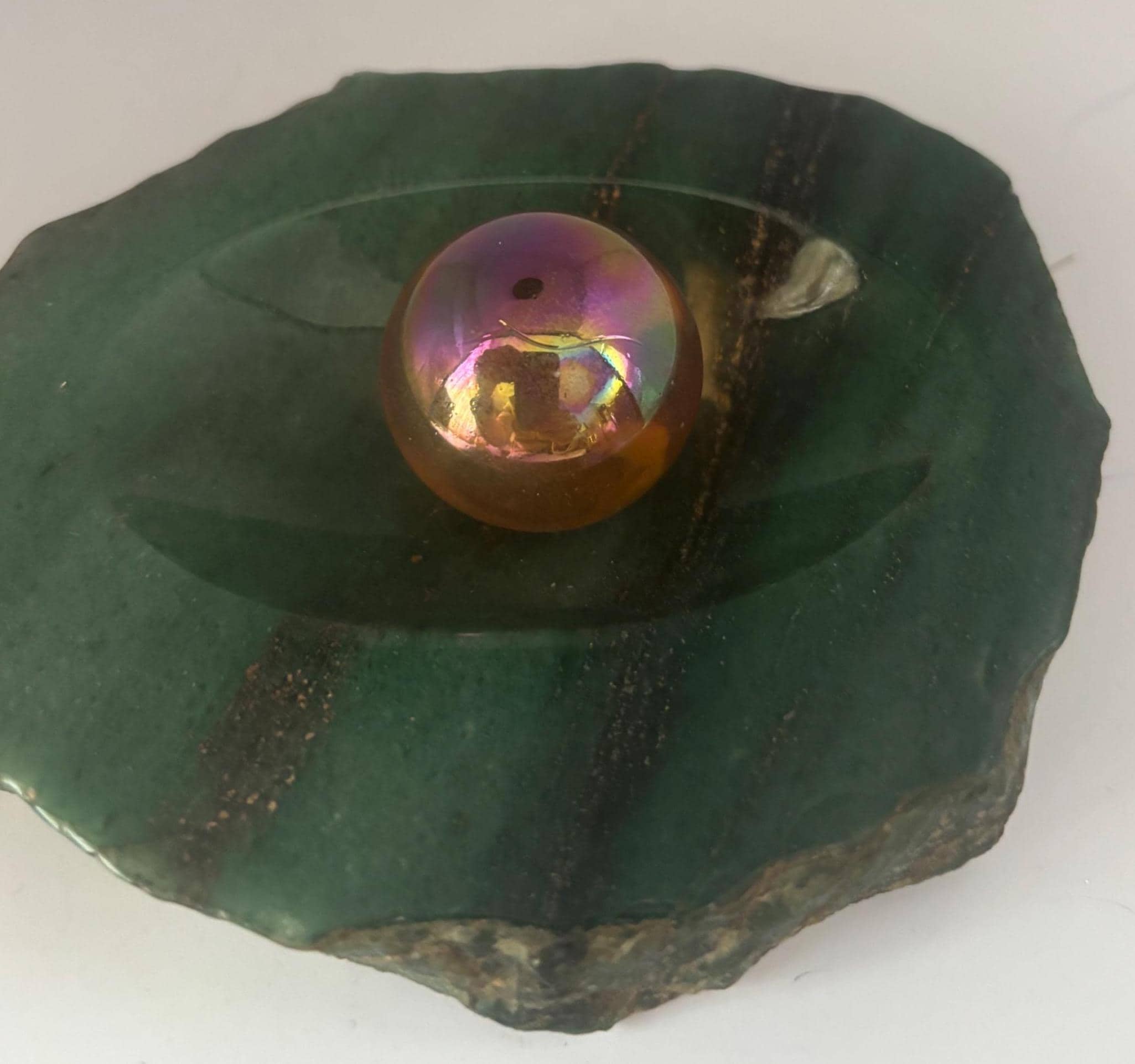 We are delighted in featuring this stunning RAINBOW AURA OCEAN JASPER PAPERWEIGHT SPHERE. It is a mesmerizing iridescent surface with vibrant rainbow hues. Its perfectly rounded form sits atop a rough-cut green jasper base, creating a unique combination of natural earth elements and ethereal aura crystal effects. Ideal as both a collector's mineral specimen and functional paperweight, this piece adds a touch of mystical beauty to any desk or display shelf.