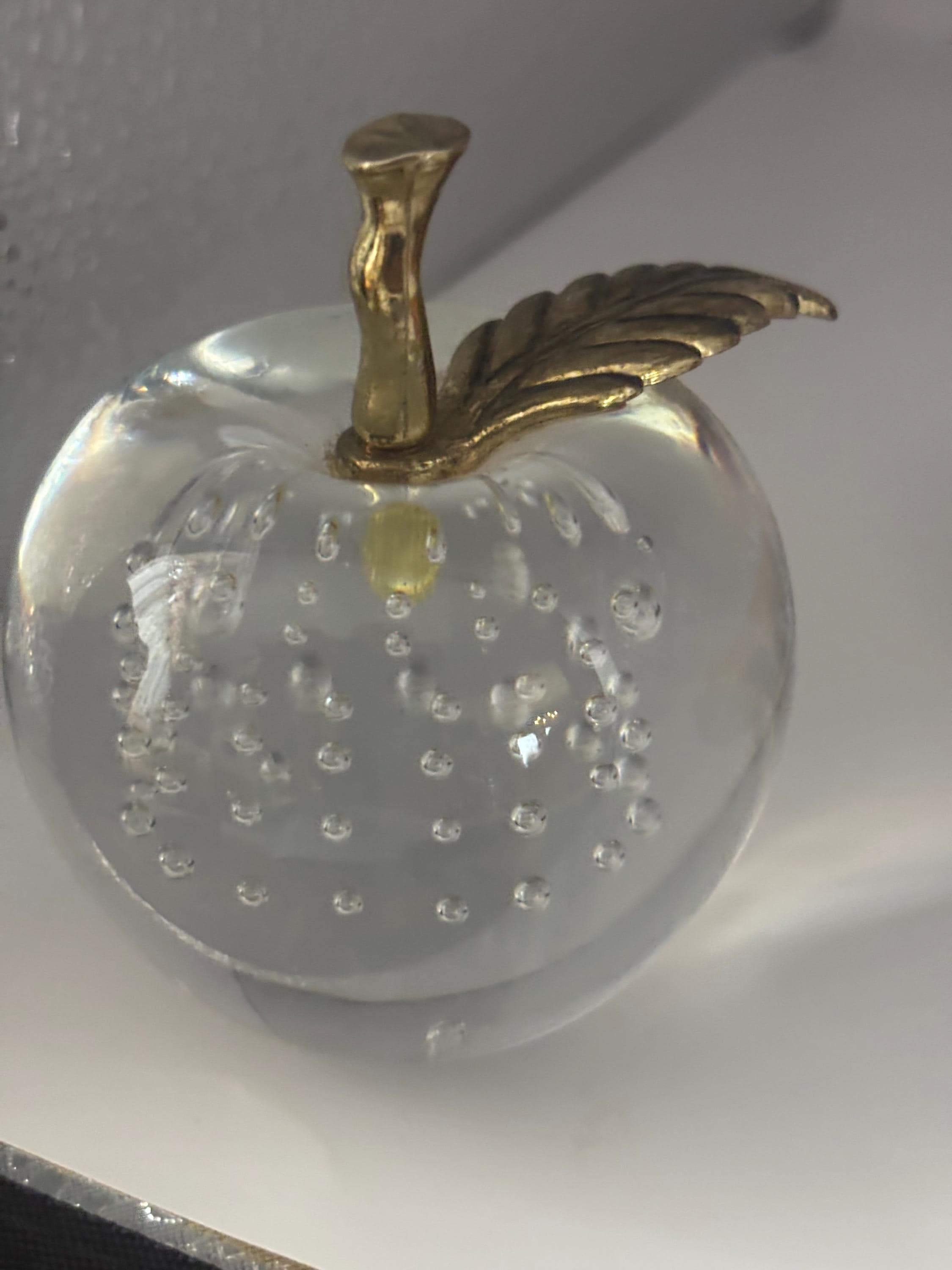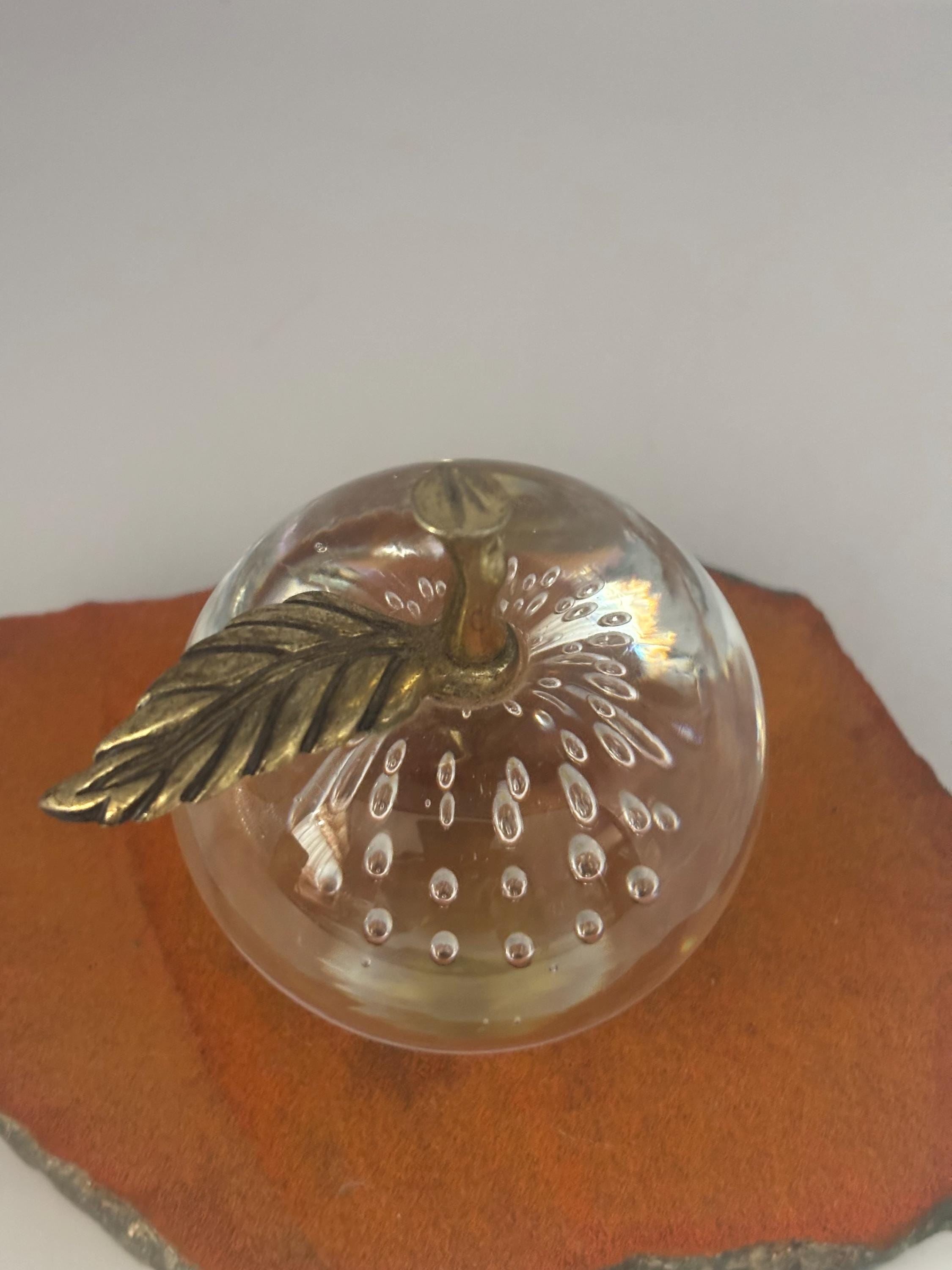 This exquisite SILVESTRI Clear Glass Bullicante Apple Paperweight stands out with its controlled bubble pattern inside the crystal-clear glass body. Measuring 3 inches tall, it features a charming brass stem and leaf that add a vintage elegance to the piece. The artful inclusion of the small bubbles arranged inside the glass gives it an enchanting textured look, ideal for collectors of fine vintage glass or those seeking unique decorative accents.
