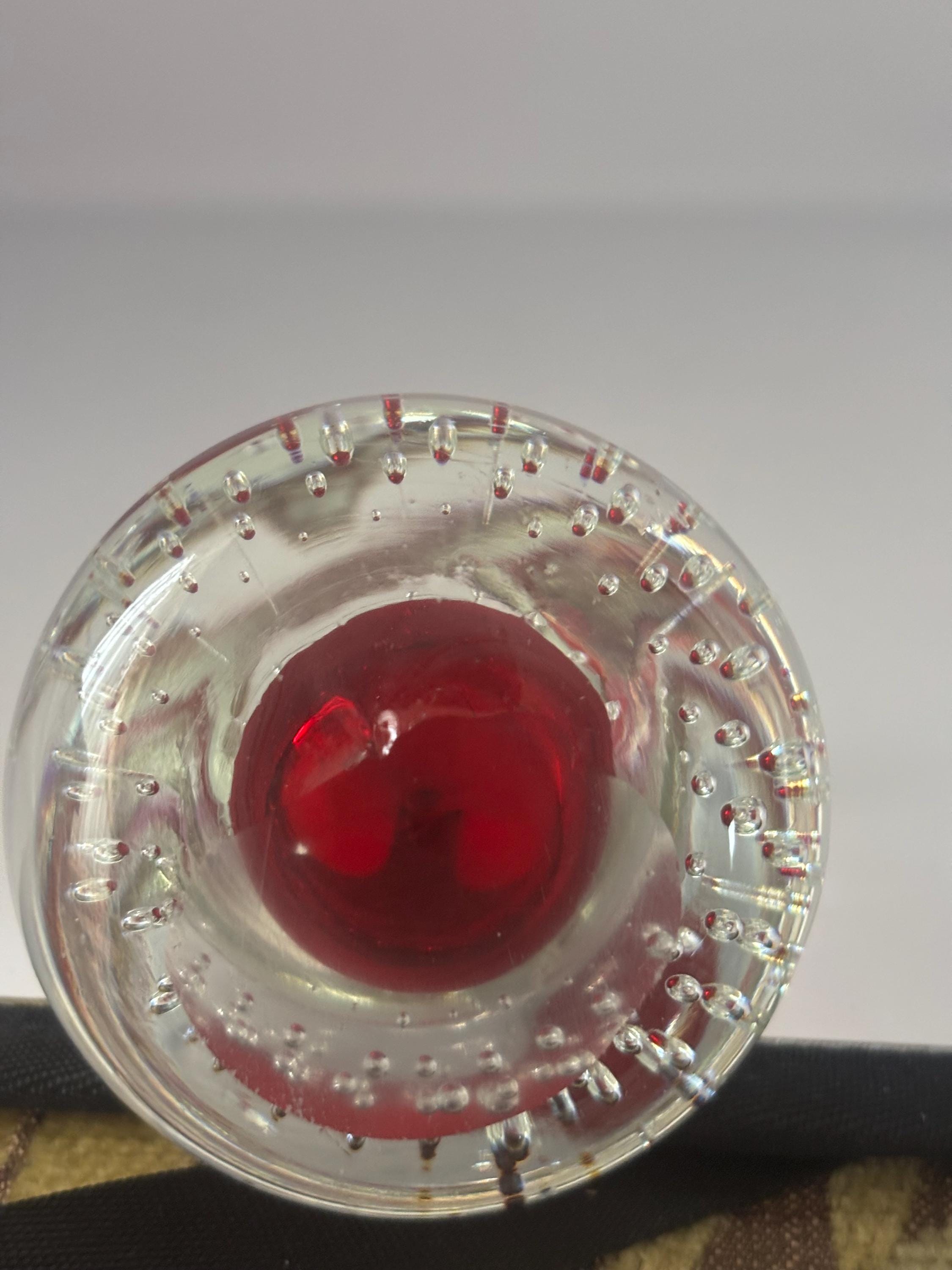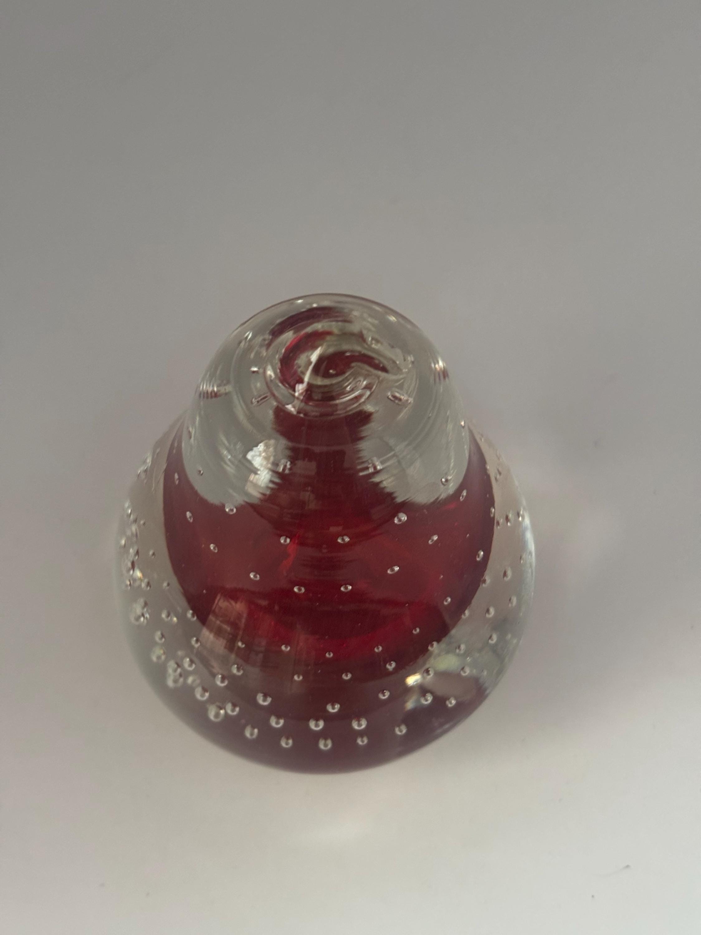 Perfect for collectors or lovers of unique vintage glass, this BULLETIN PAPERWEIGHT not only serves a practical use but also as a captivating art piece. Its clarity, controlled bubble pattern, and deep red coloring make it a standout among vintage glass collectibles and ideal for adding a touch of sophistication to any home or office environment.