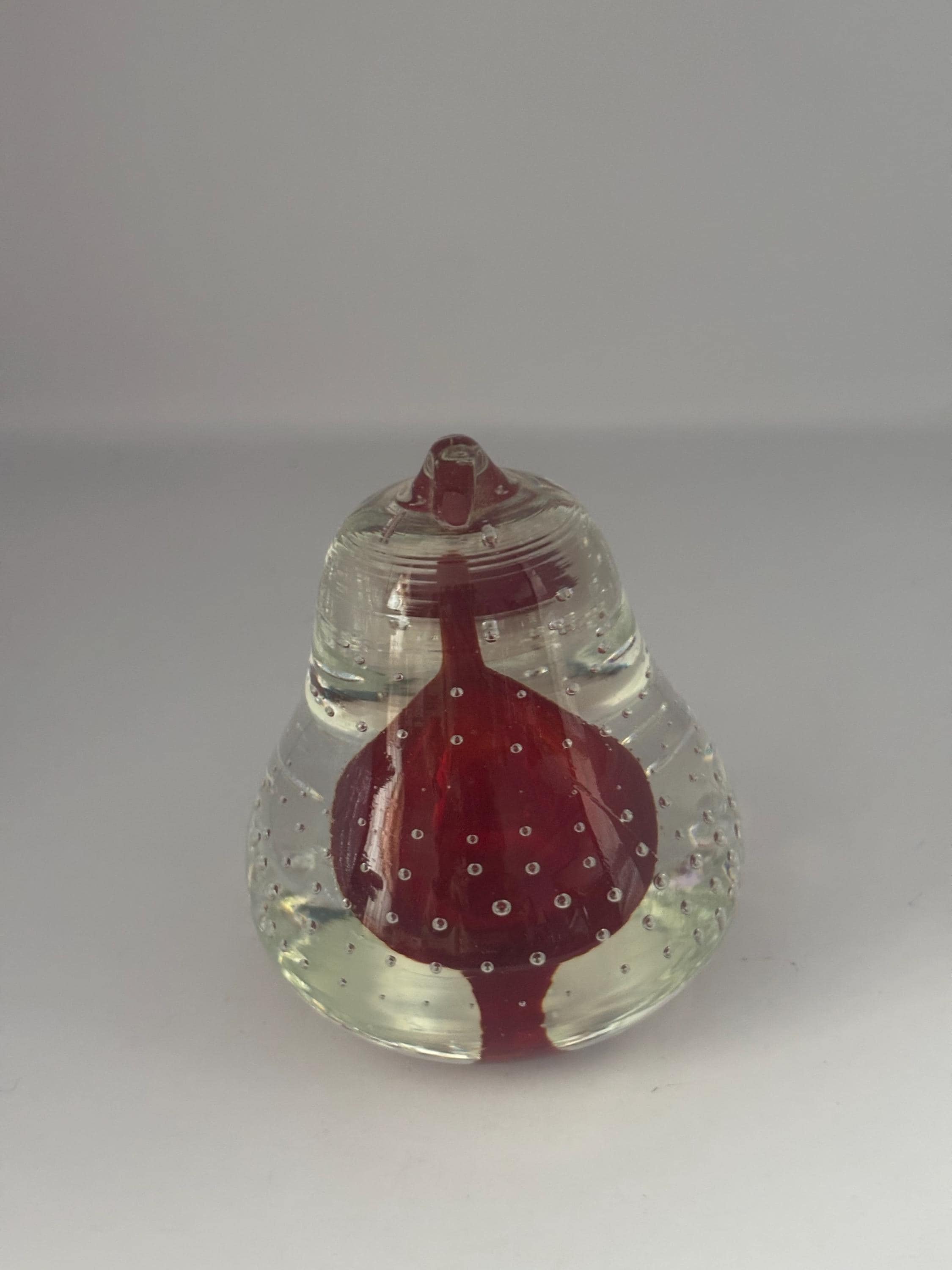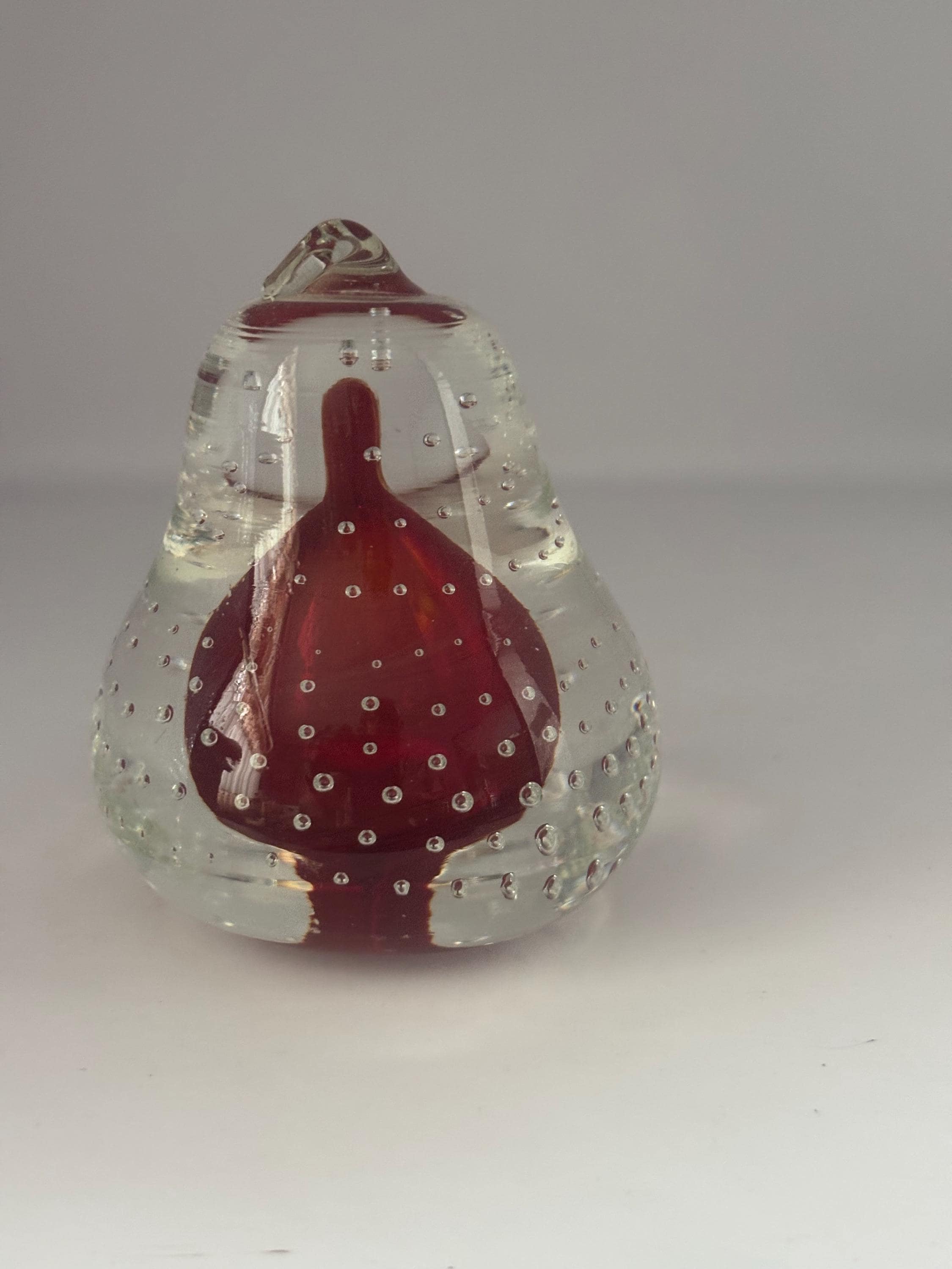 This Vintage Ruby Red Pear Shaped Bullicante Paperweight is a stunning example of mid-century art glass craftsmanship. Standing 4 1/2 inches high, this elegant paperweight features a rich ruby red interior encased in clear glass dotted with perfectly controlled bubbles, a hallmark of the Bullicante technique. The pear shape adds a charming organic form that makes this piece a beautiful decorative accent for any desk or display shelf.