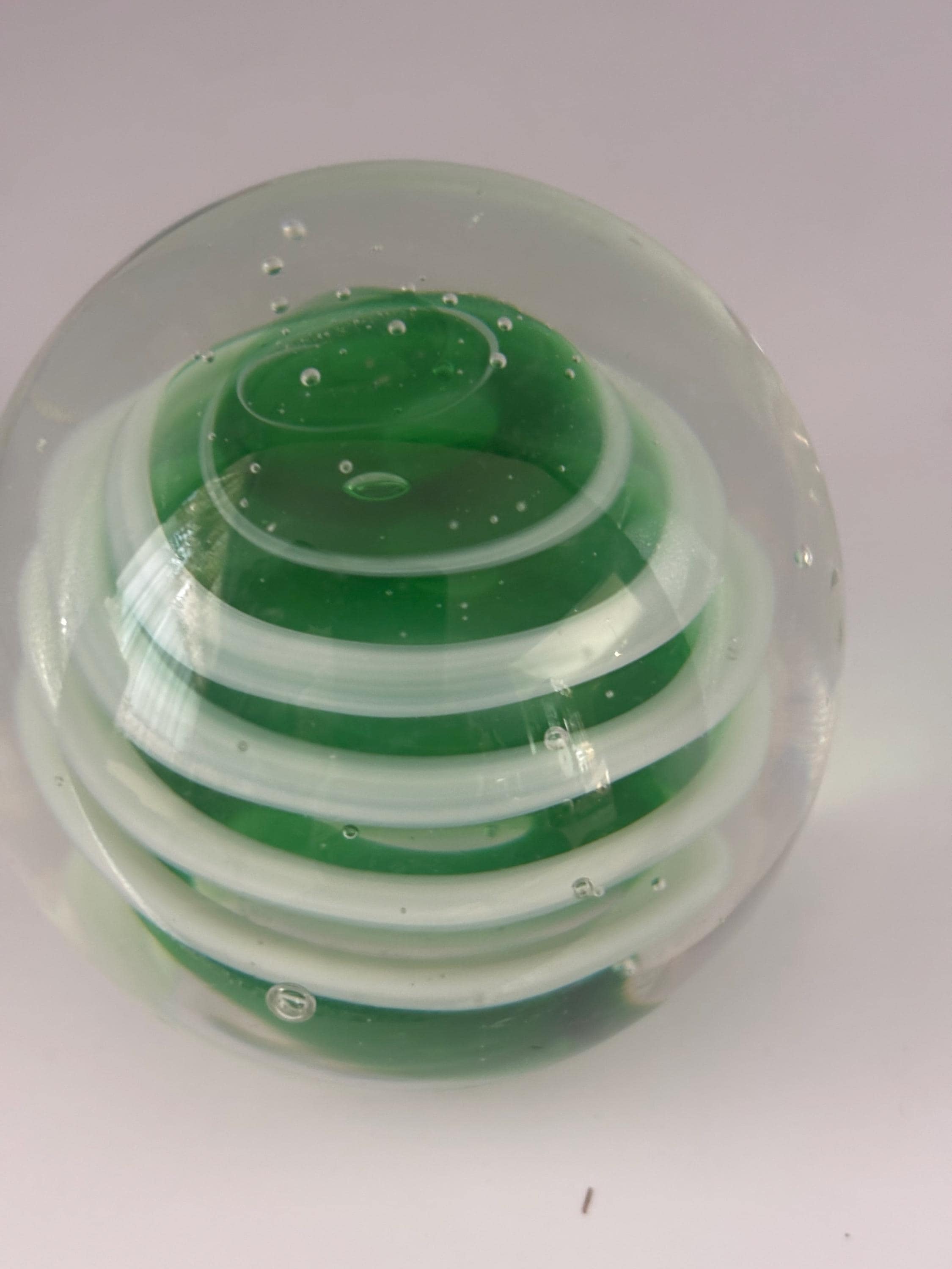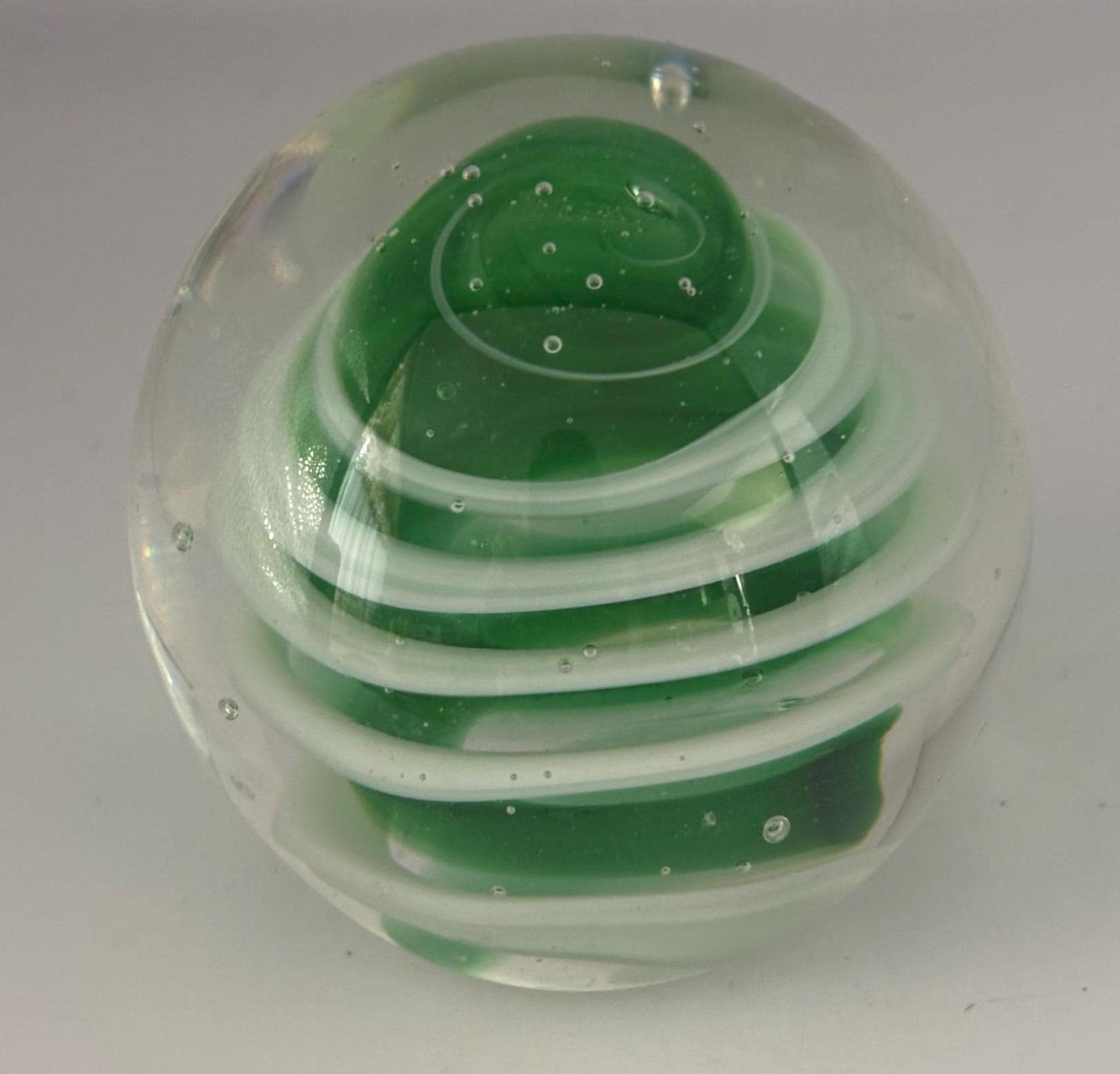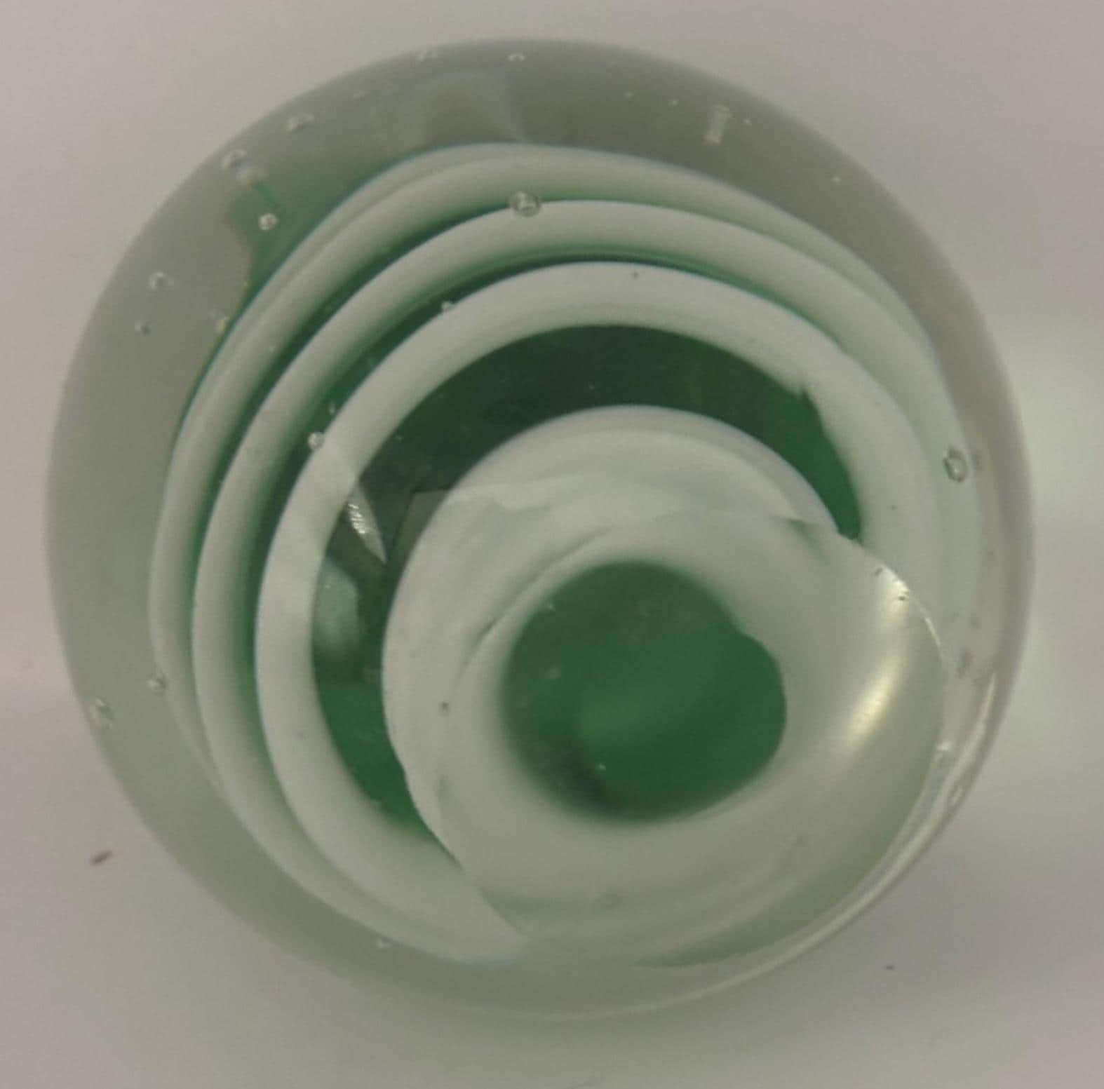 Add a touch of classic elegance to your desk with this Vintage Marble Look Paperweight. Measuring 3 inches in diameter, this solid glass paperweight features beautiful green and white swirls that mimic the timeless appearance of marble. Its smooth rounded form and delicate bubble accents showcase vintage glassmaking craftsmanship, making it a charming collector's piece as well as a functional office accessory.