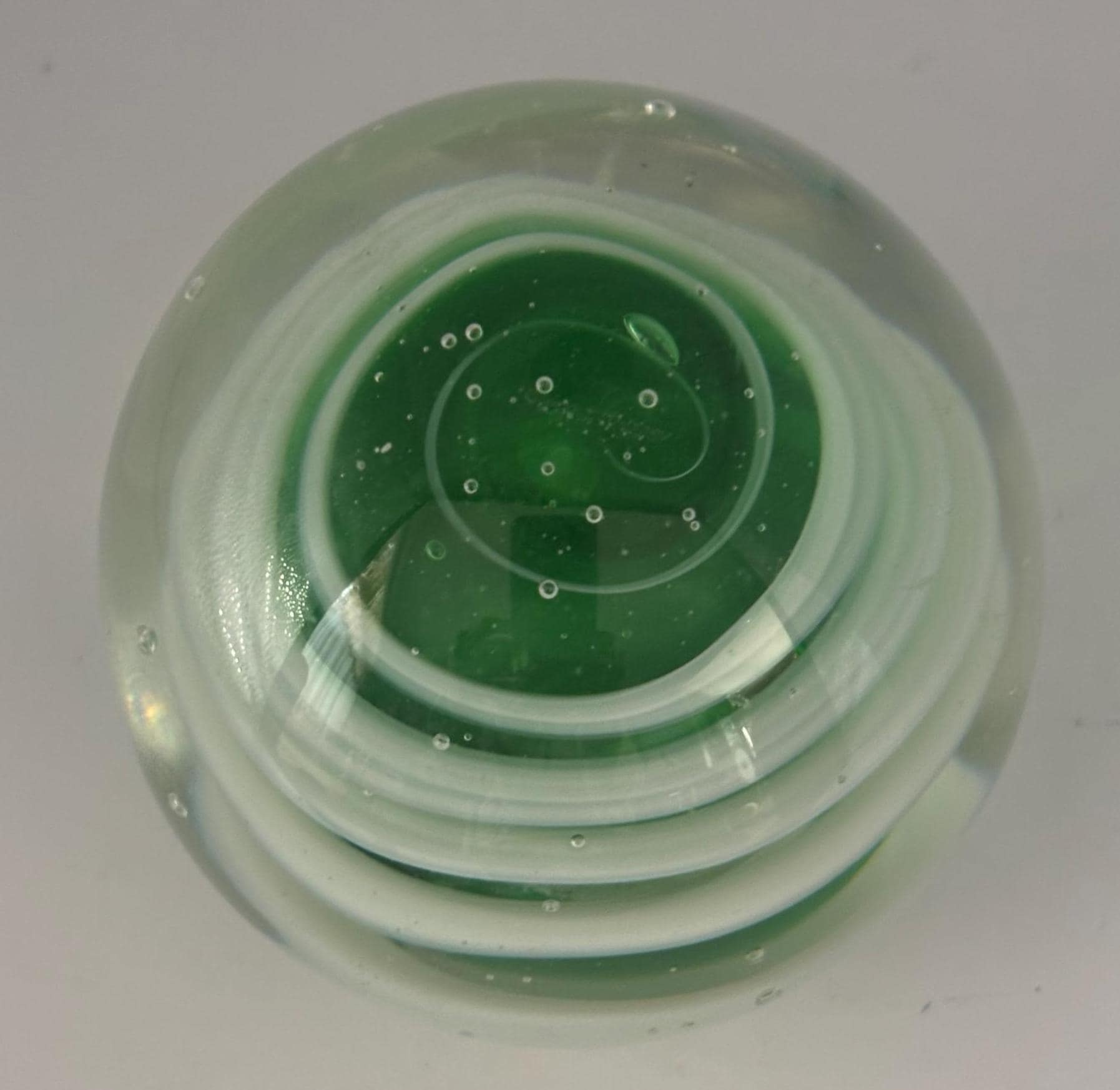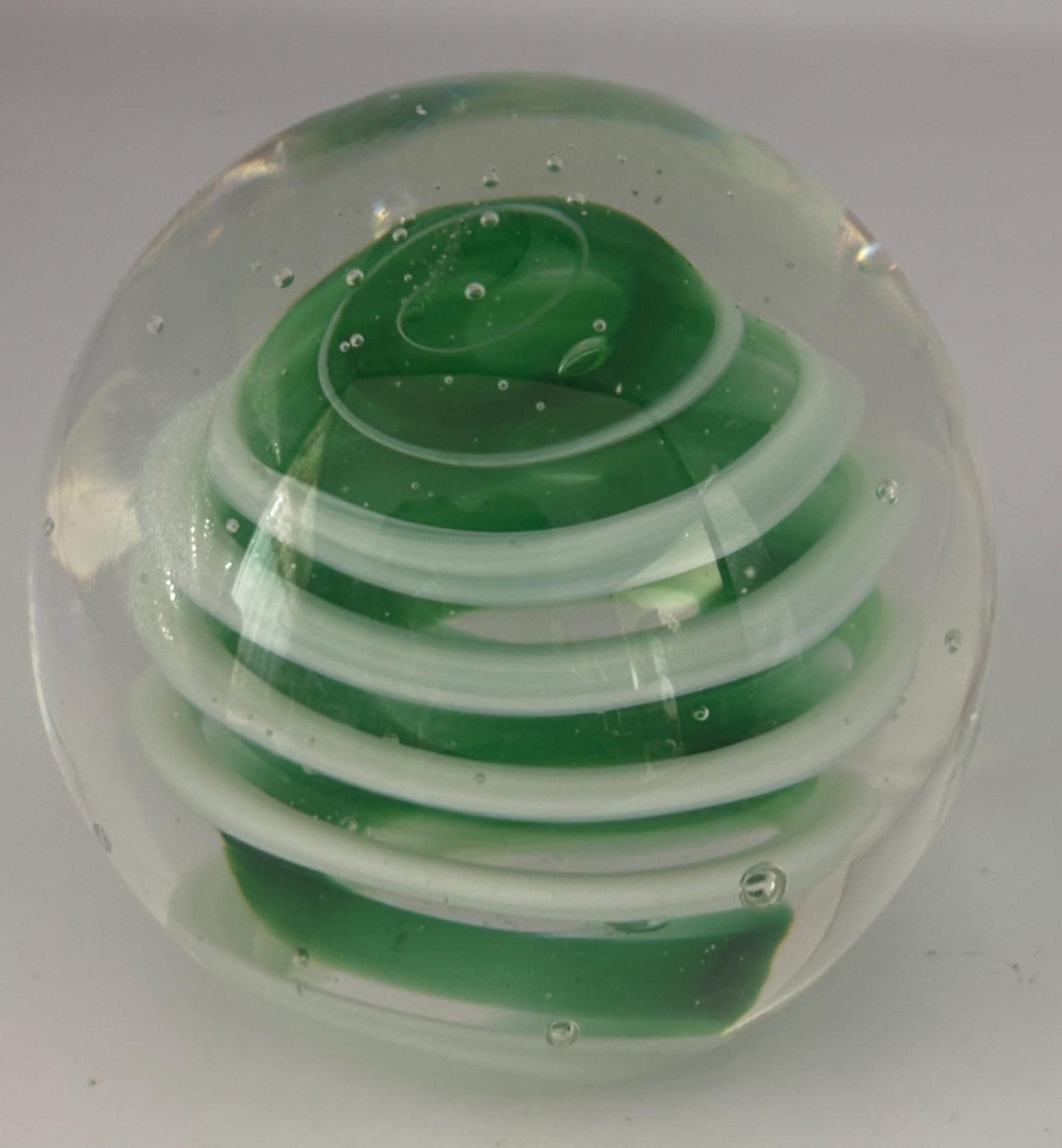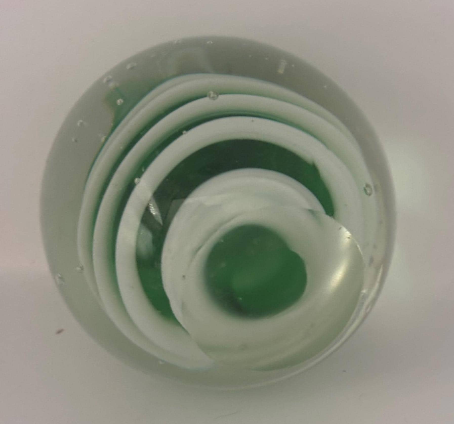 Add a touch of classic elegance to your desk with this Vintage Marble Look Paperweight. Measuring 3 inches in diameter, this solid glass paperweight features beautiful green and white swirls that mimic the timeless appearance of marble. Its smooth rounded form and delicate bubble accents showcase vintage glassmaking craftsmanship, making it a charming collector's piece as well as a functional office accessory.
