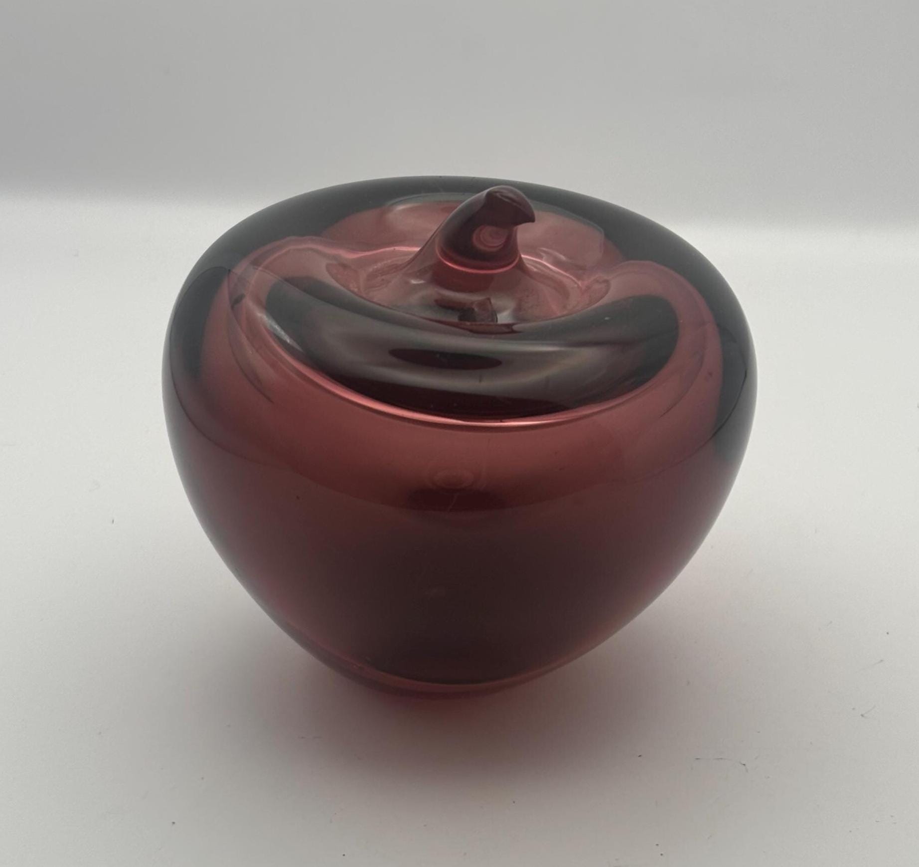 This stunning BLENKO AMETHYST GLASS APPLE PAPERWEIGHT features a rich, deep purple hue and smooth hand-blown design, measuring 3 1/2 inches in diameter and 3 inches high. Its intricate stem detail perfectly captures the essence of an apple, making it a distinctive decorative piece for any vintage glass collection or desktop display.