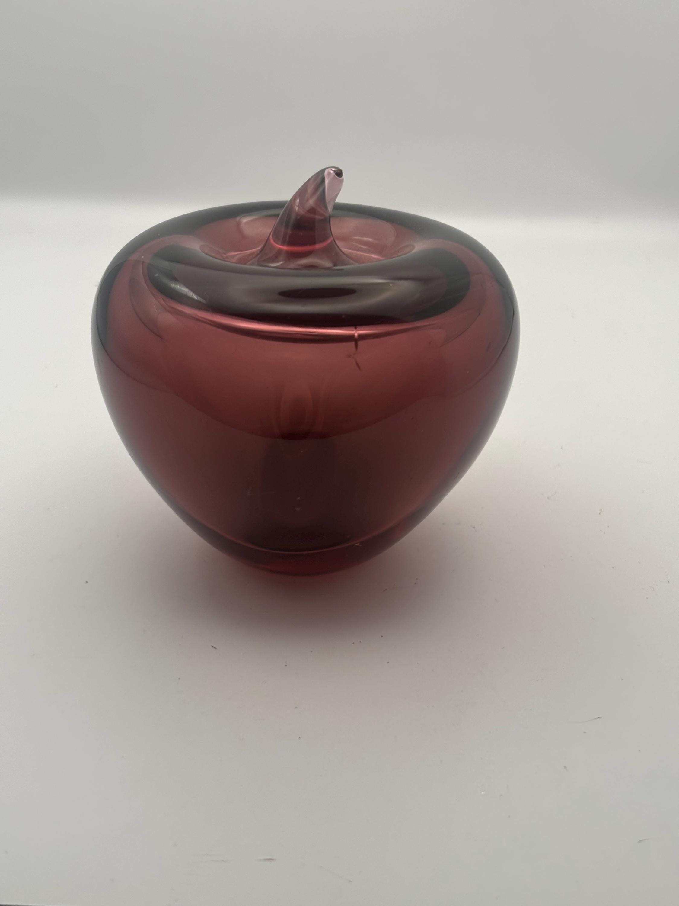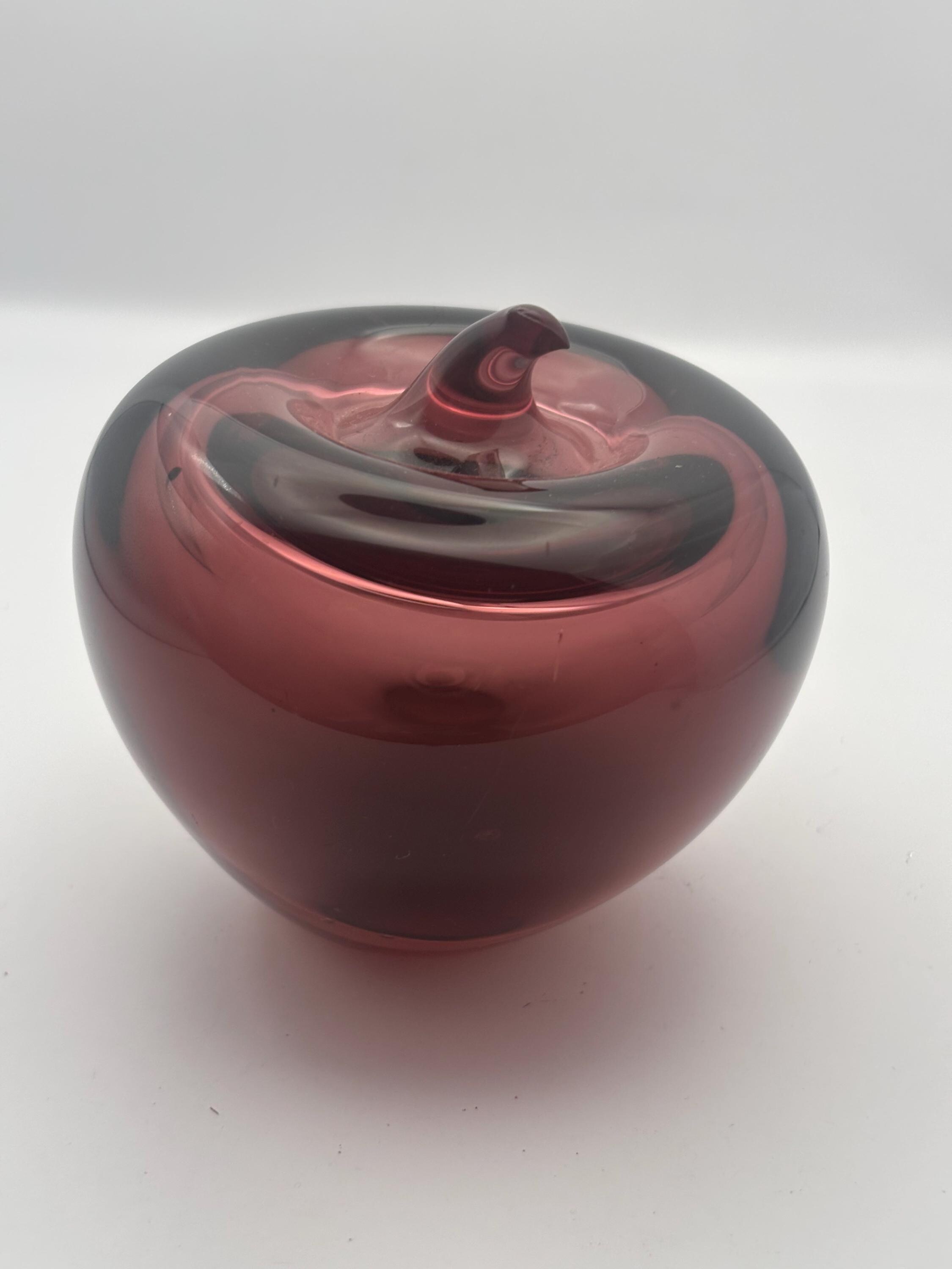 Crafted with exquisite artistry and timeless charm, this BLENKO AMETHYST GLASS APPLE PAPERWEIGHT serves as both a functional desk accessory and a beautiful collectible. Its vibrant amethyst color adds a splash of elegance to your home or office, making it a perfect gift for lovers of vintage glass art and unique paperweights.