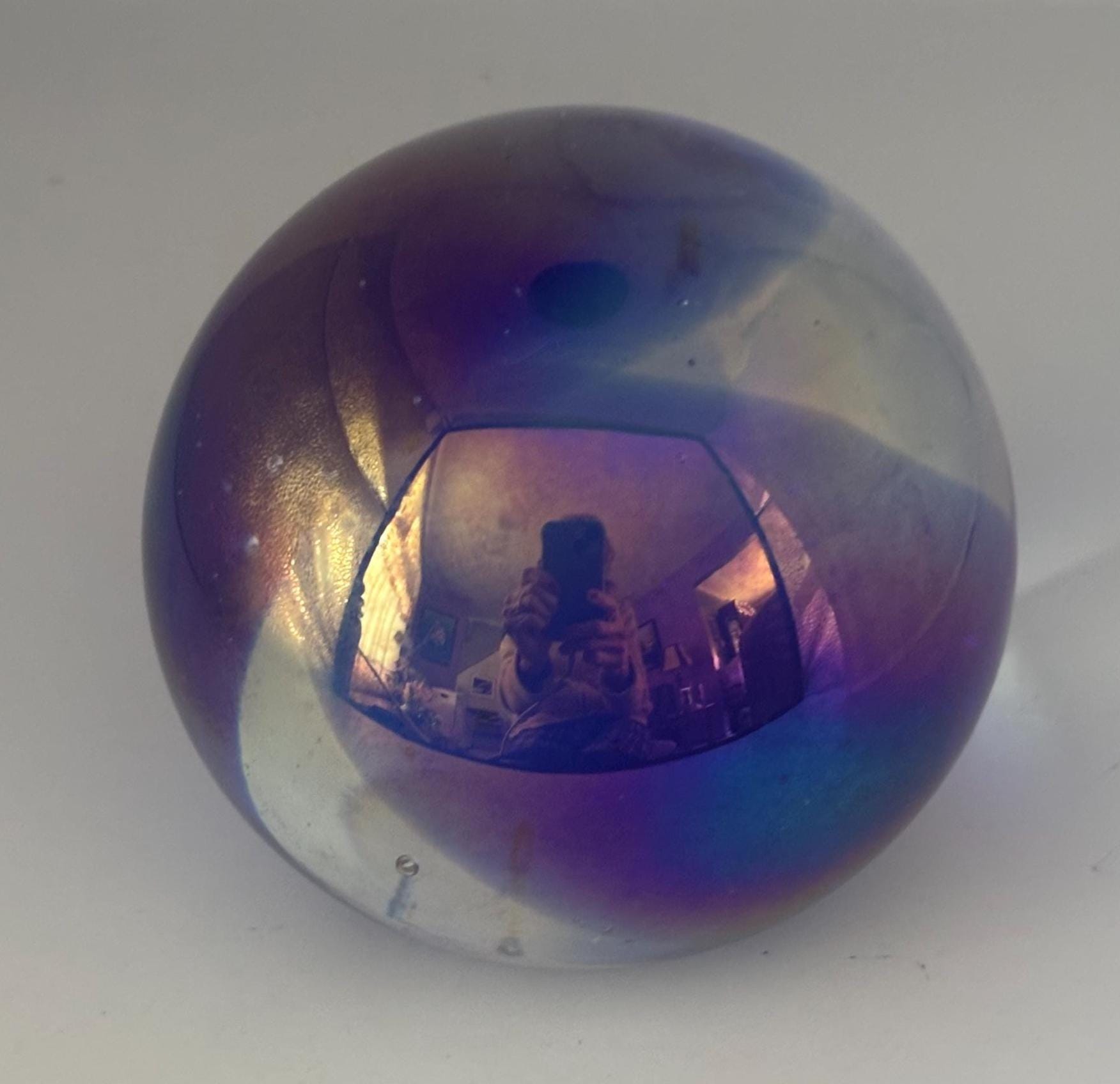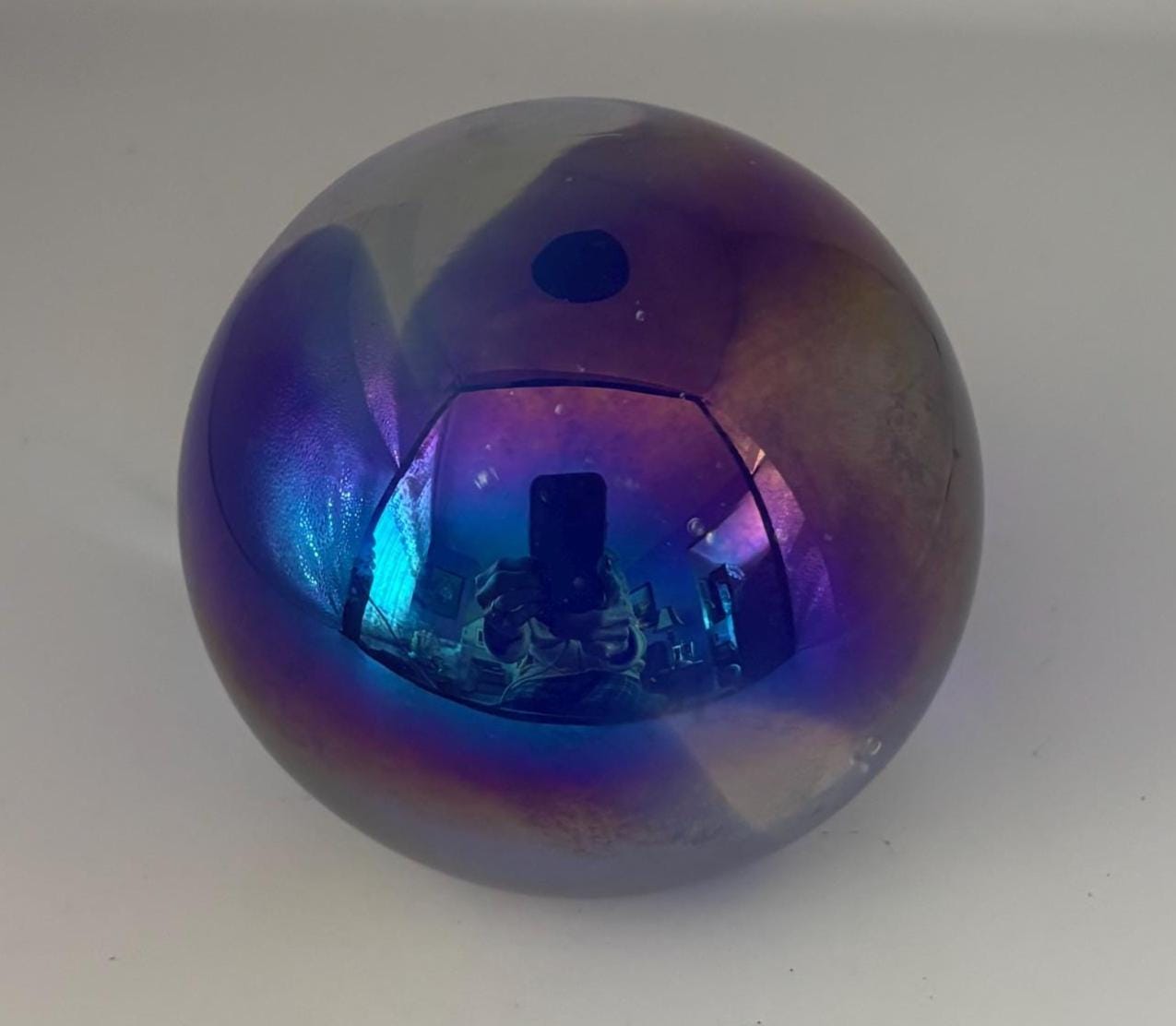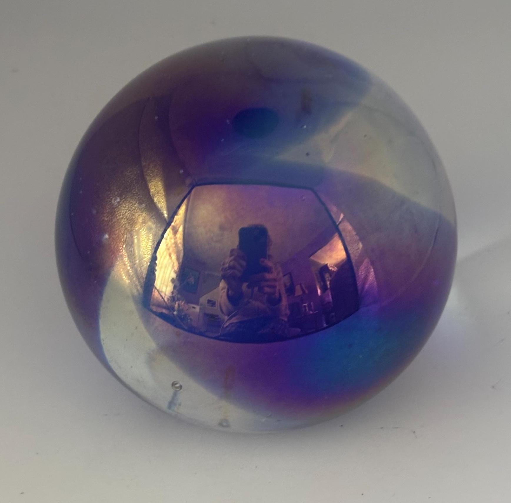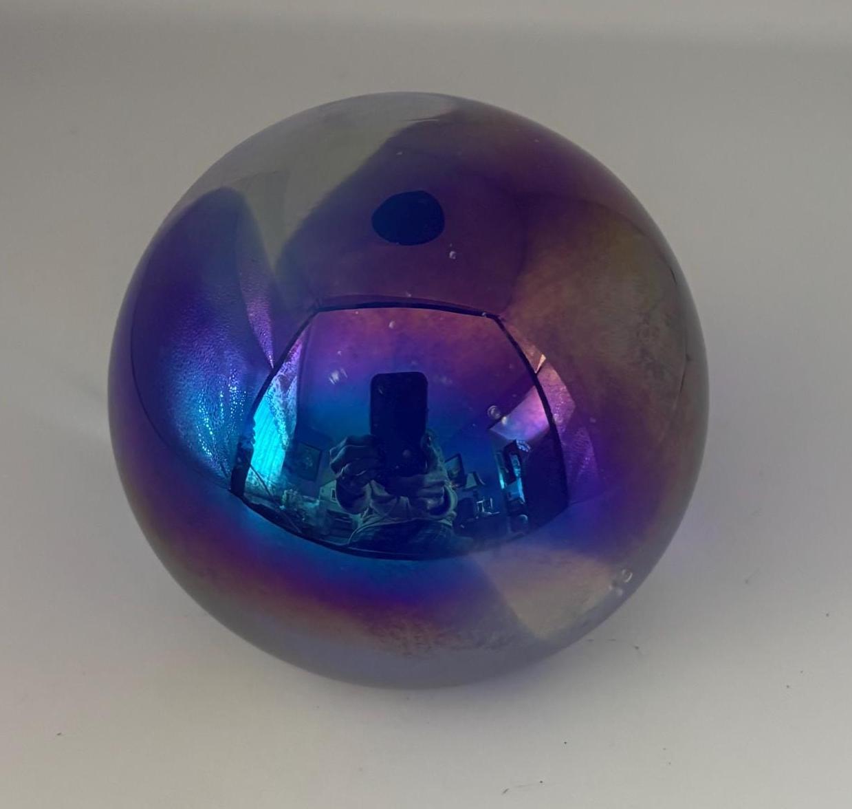 This Vintage Gary Levi Metallic Blue and Purple Paperweight is a stunning mid-century art glass piece that will elevate any collection or home decor. Featuring a rich blend of metallic blue and purple hues, this spherical paperweight showcases a sleek, reflective surface that catches the light beautifully. Its solid glass form has a smooth finish and subtle internal swirls that add depth and character to the design.