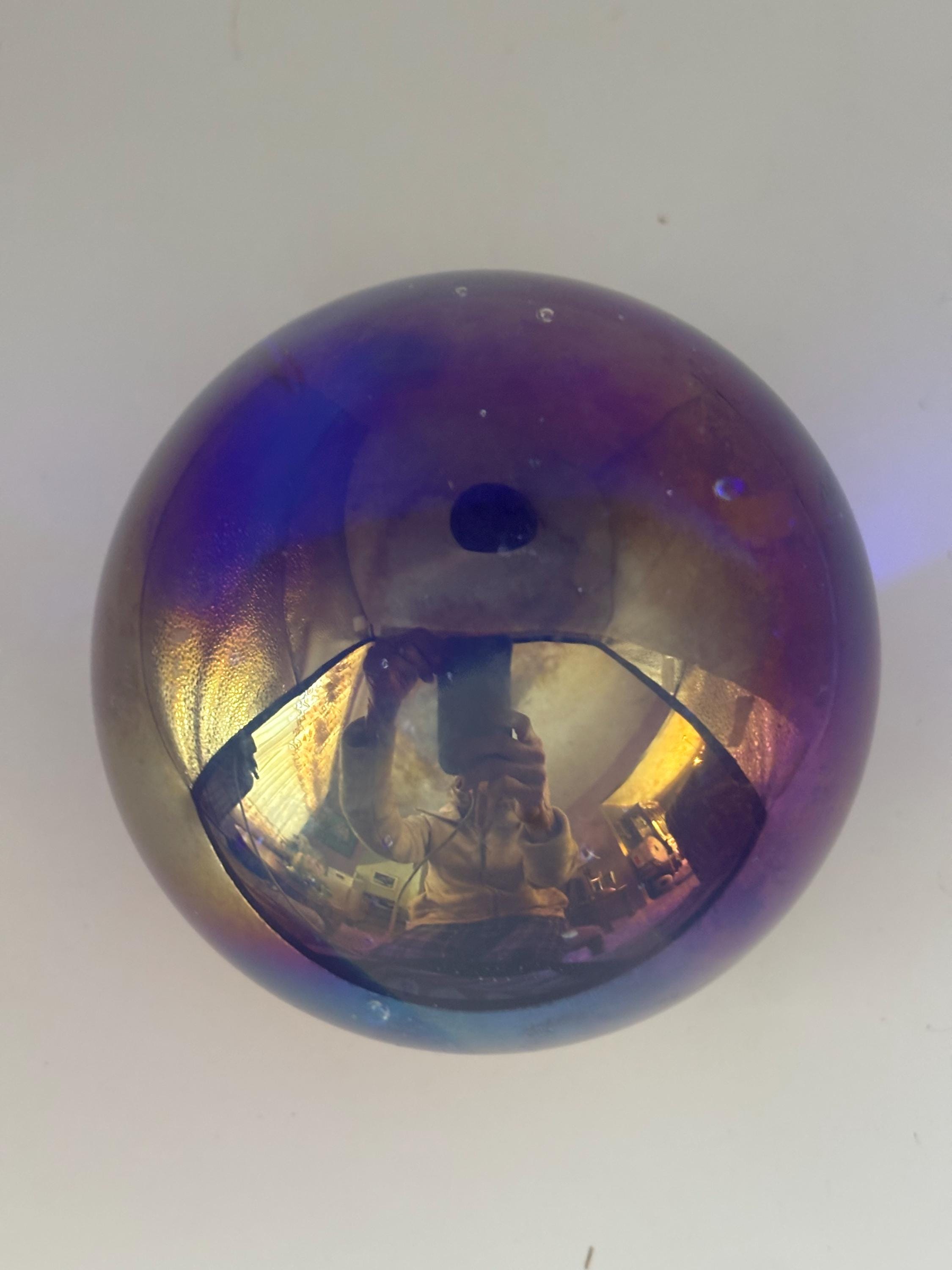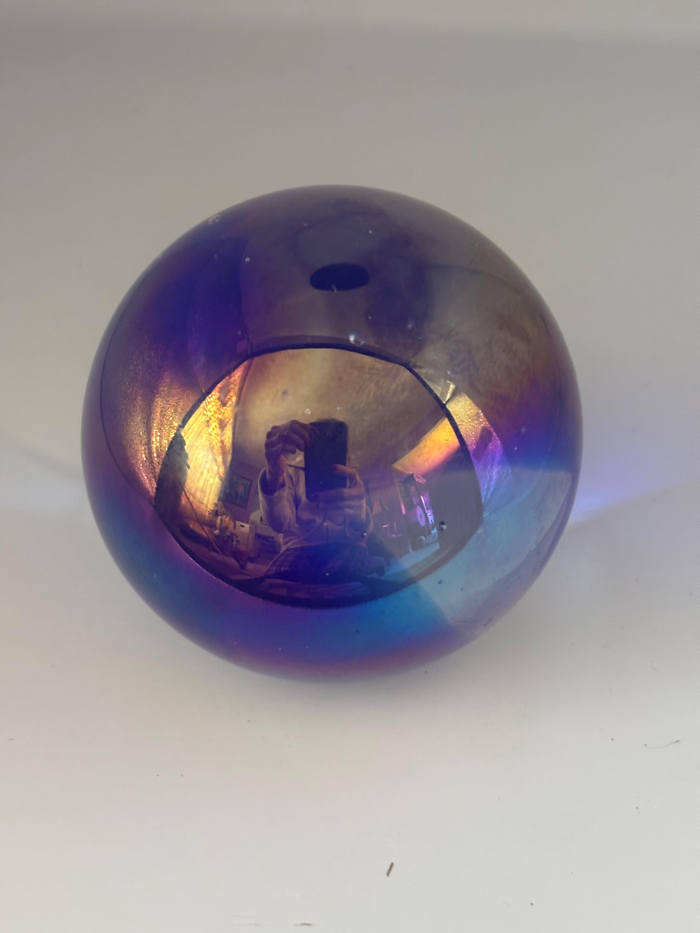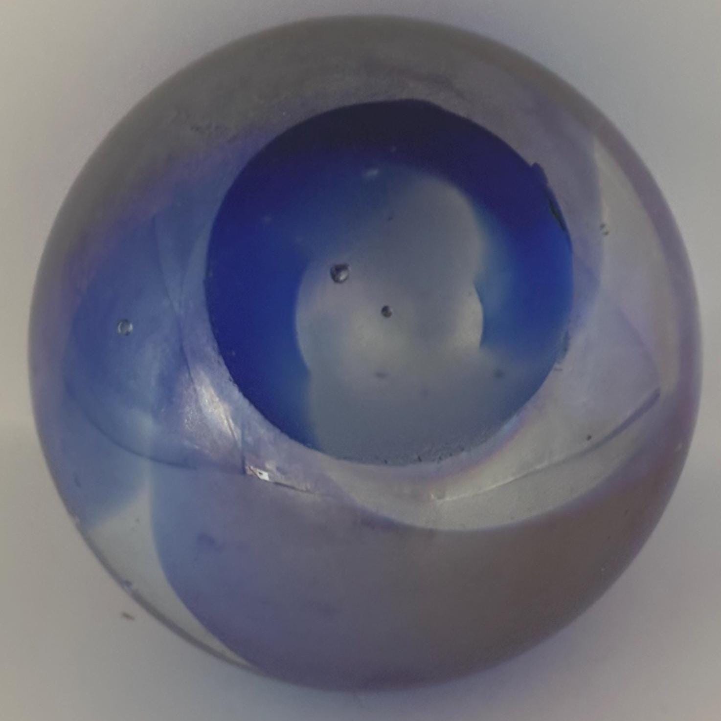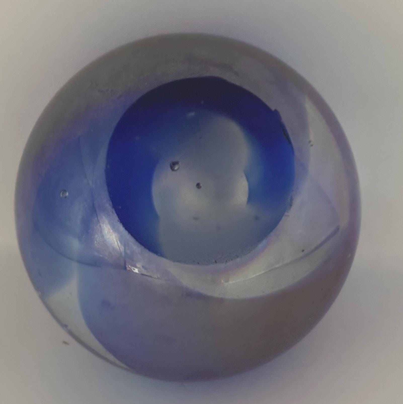 This Vintage Gary Levi Metallic Blue and Purple Paperweight is a stunning mid-century art glass piece that will elevate any collection or home decor. Featuring a rich blend of metallic blue and purple hues, this spherical paperweight showcases a sleek, reflective surface that catches the light beautifully. Its solid glass form has a smooth finish and subtle internal swirls that add depth and character to the design.