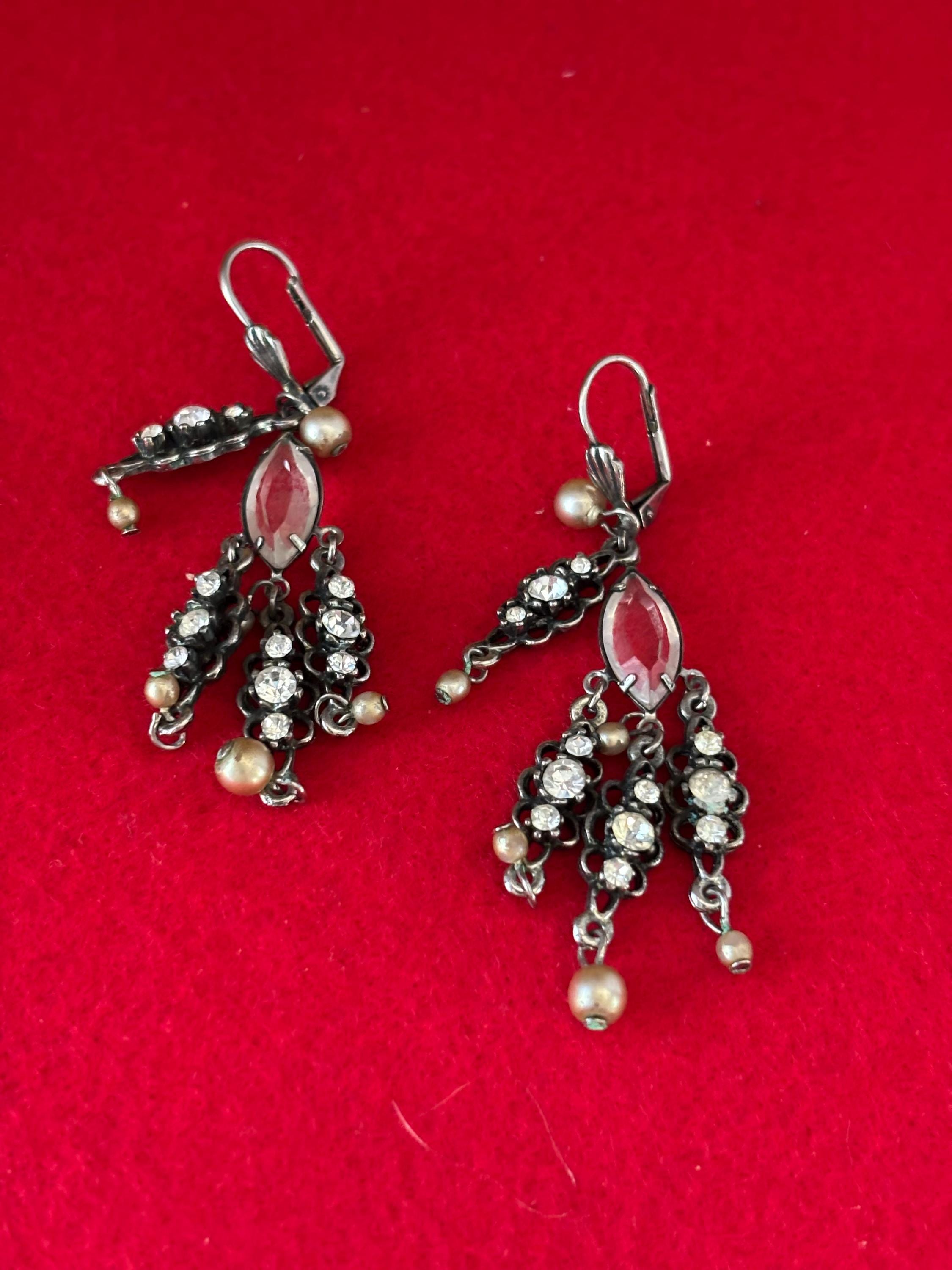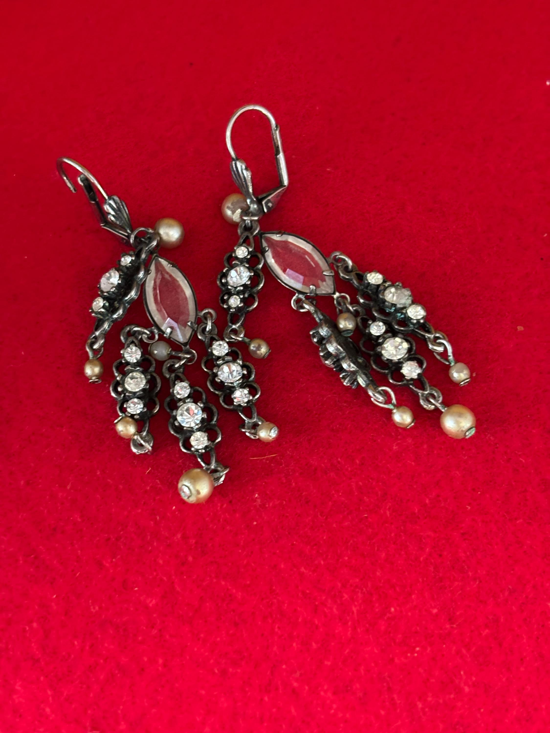 These Vintage Crystal Rhinestones and Pearls Chandelier Earrings are a timeless accessory perfect for adding a touch of elegance to any outfit. Featuring sparkling clear rhinestones and delicate faux pearls, these earrings create a dazzling effect with their multi-tiered chandelier design. The lever back closure ensures a secure fit while providing comfort for extended wear.