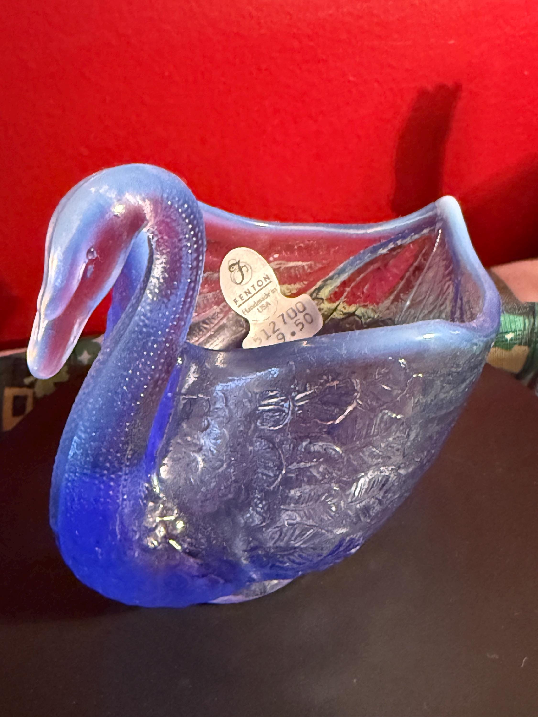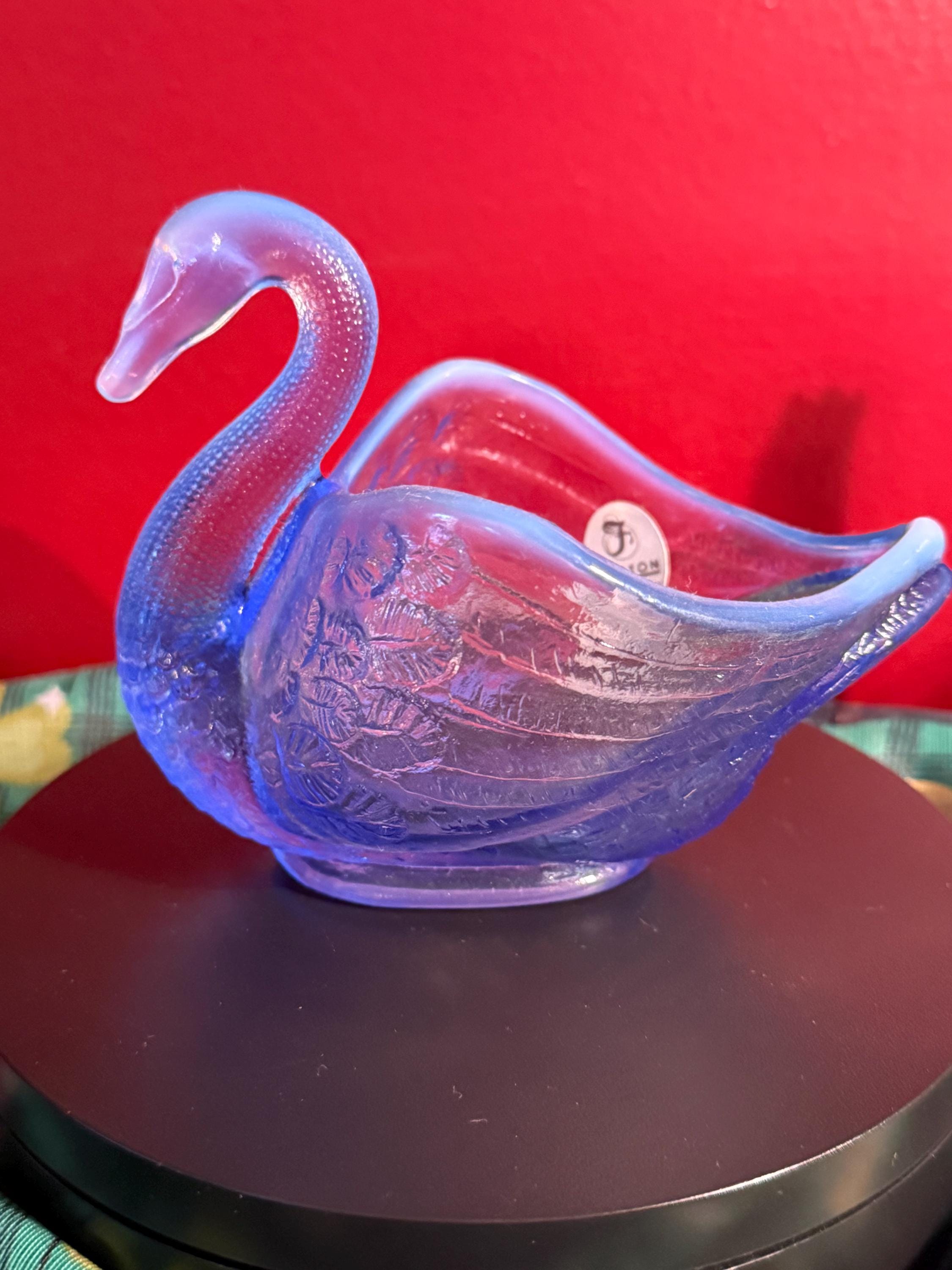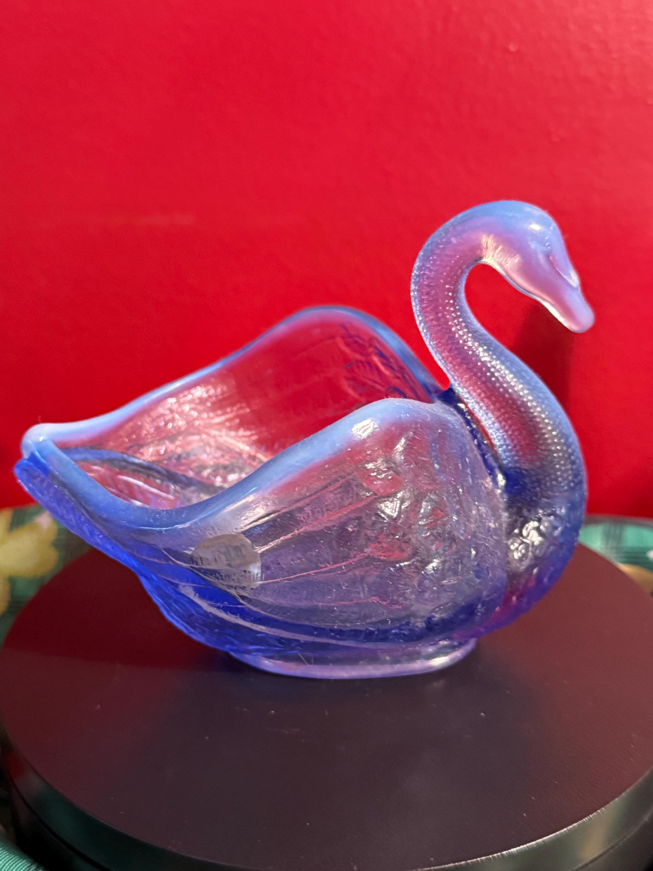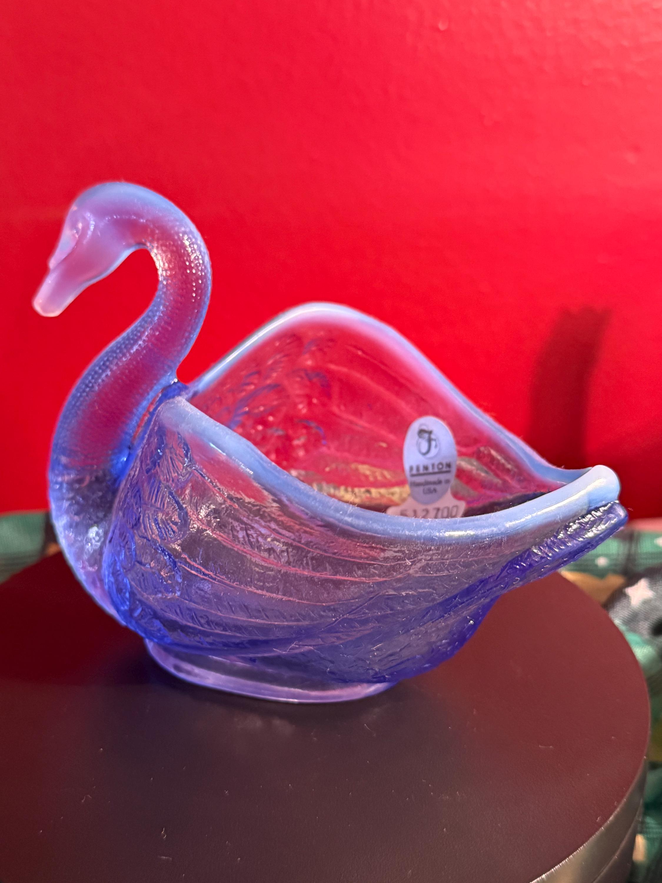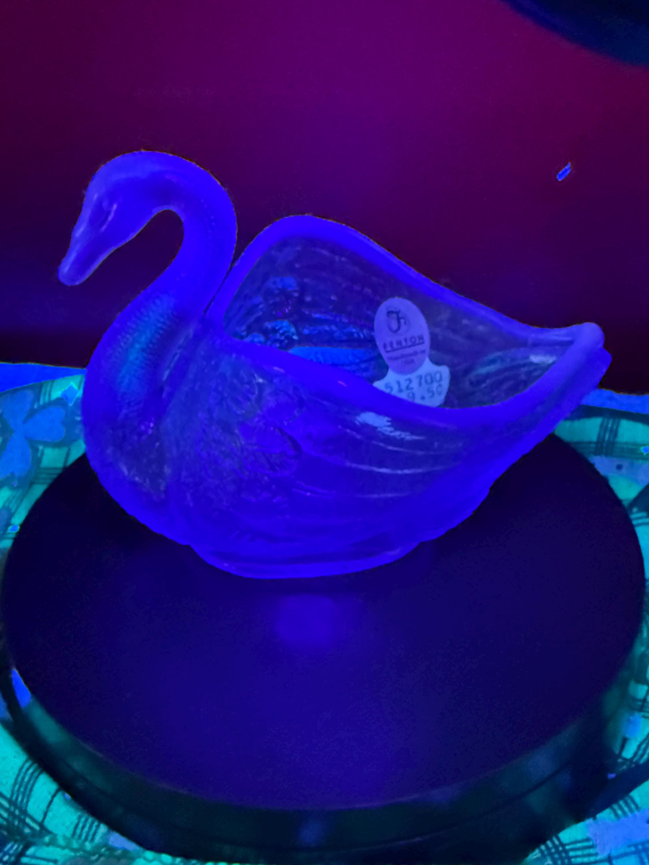 We have a wonderful vintage Fenton Blue Opalescent Glass Swan. It has the original Fenton label too. It lights up a beautiful purple when using a black light, as seen in pictures.