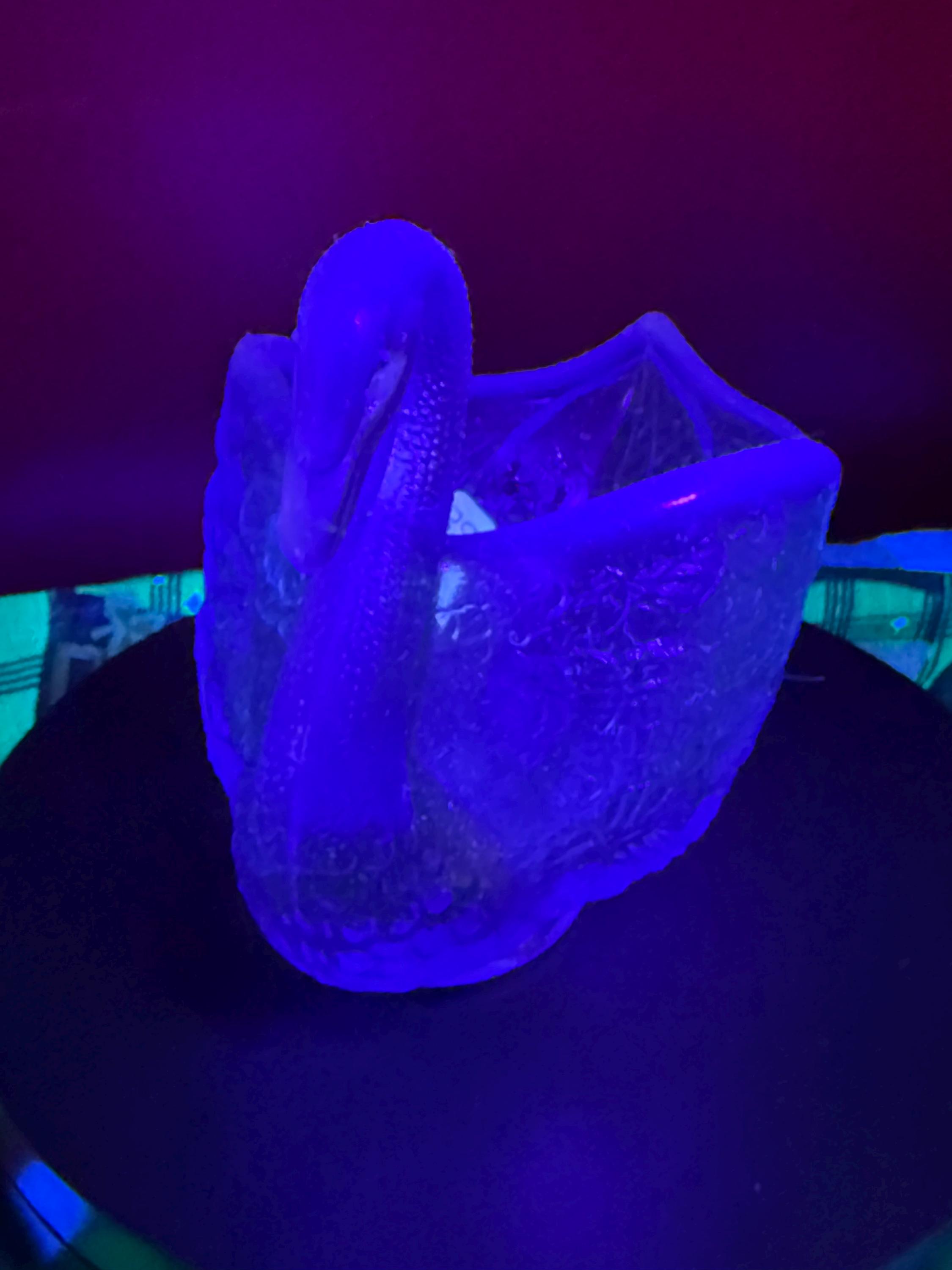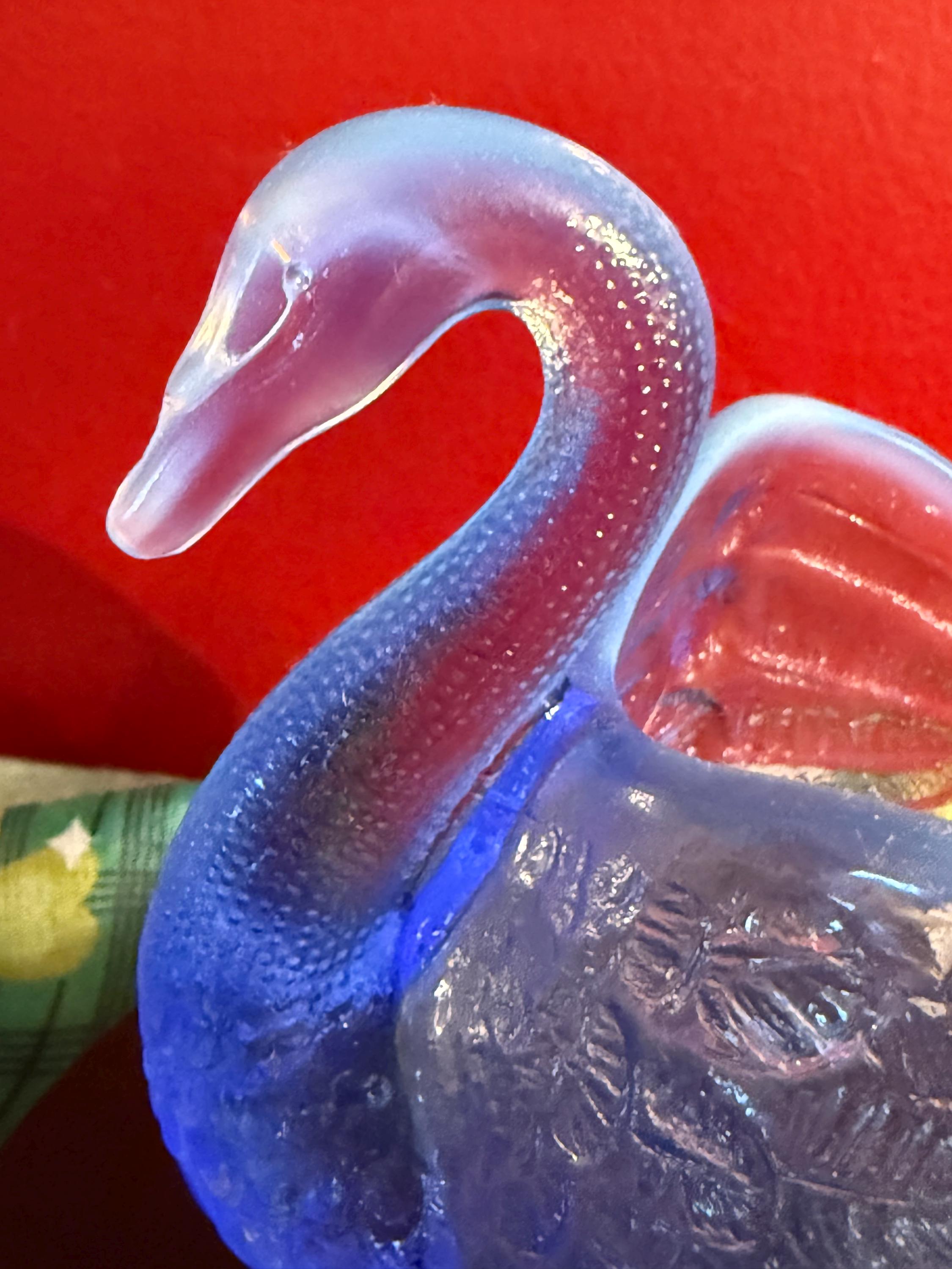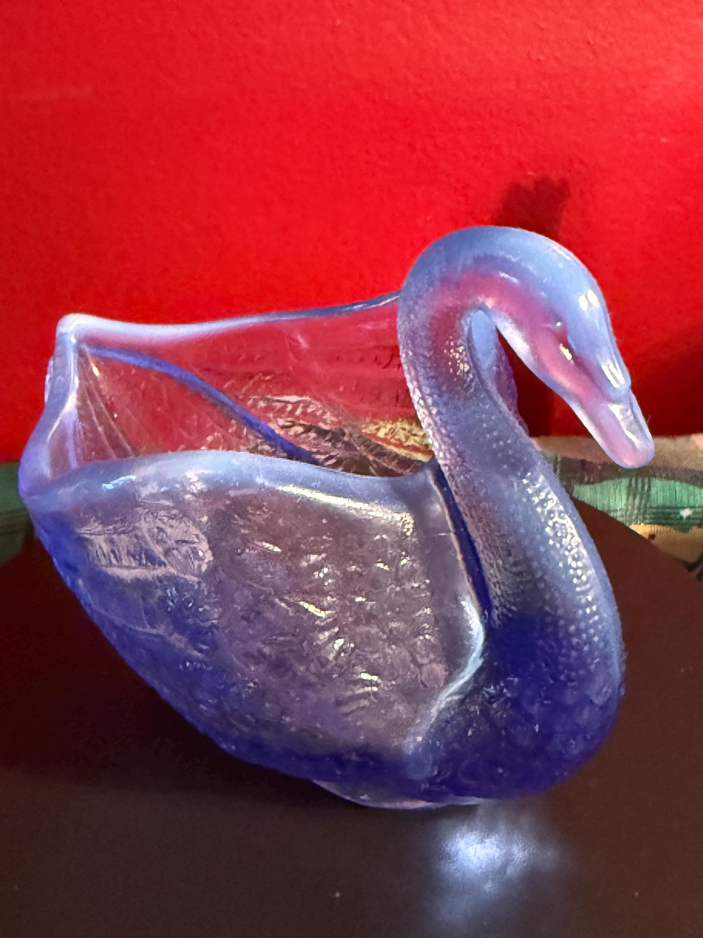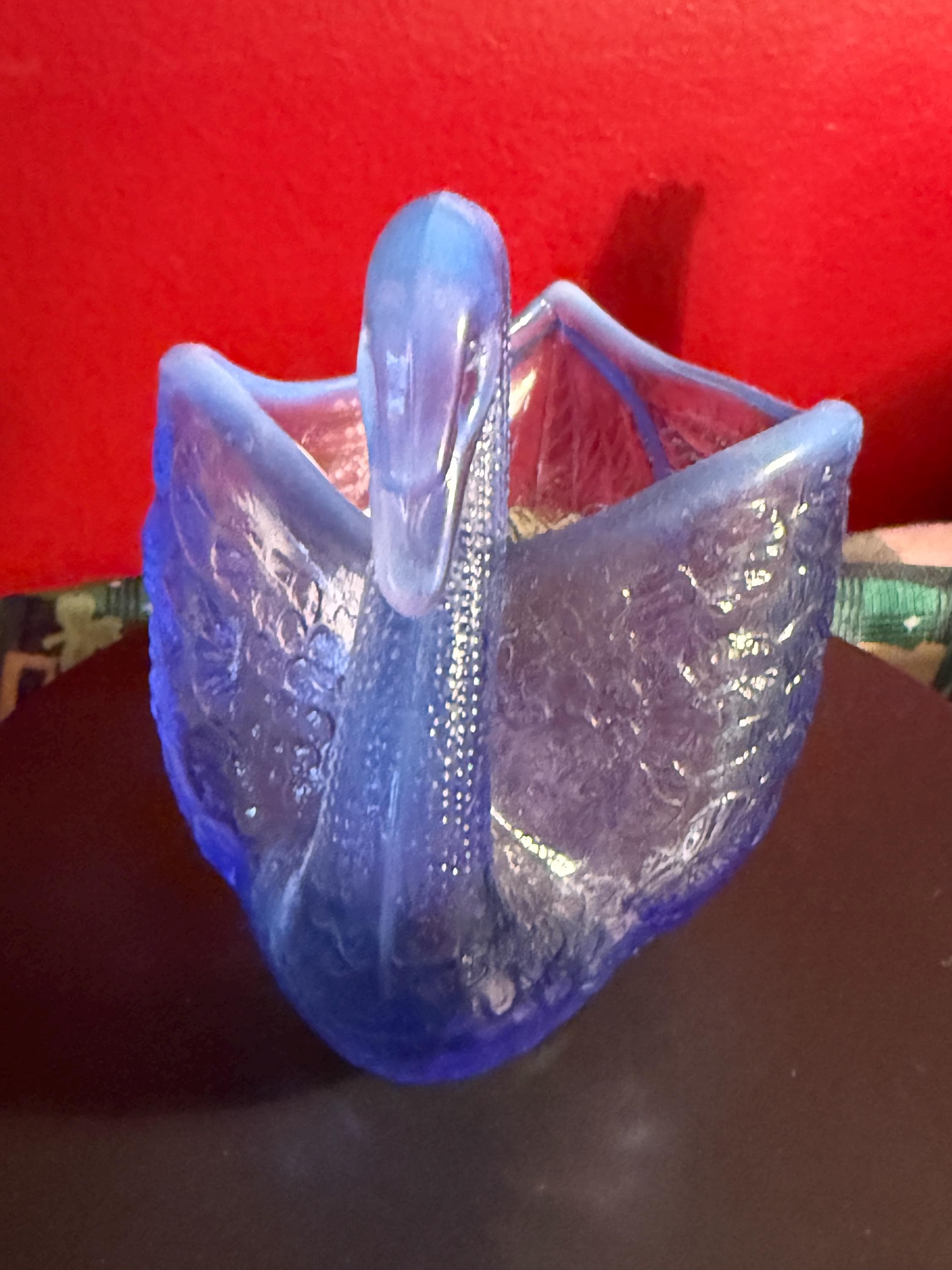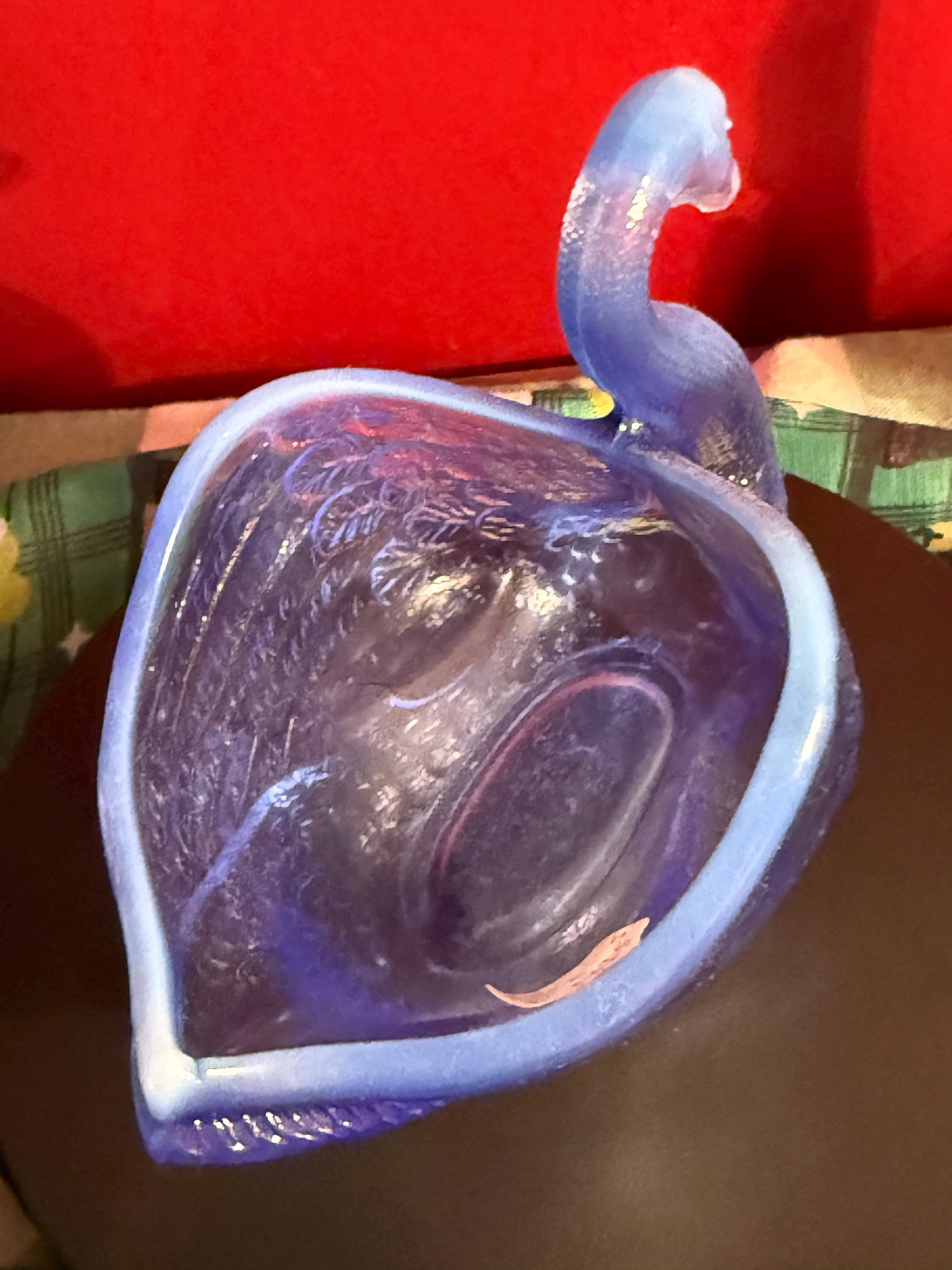 We have a wonderful vintage Fenton Blue Opalescent Glass Swan. It has the original Fenton label too. It lights up a beautiful purple when using a black light, as seen in pictures.
