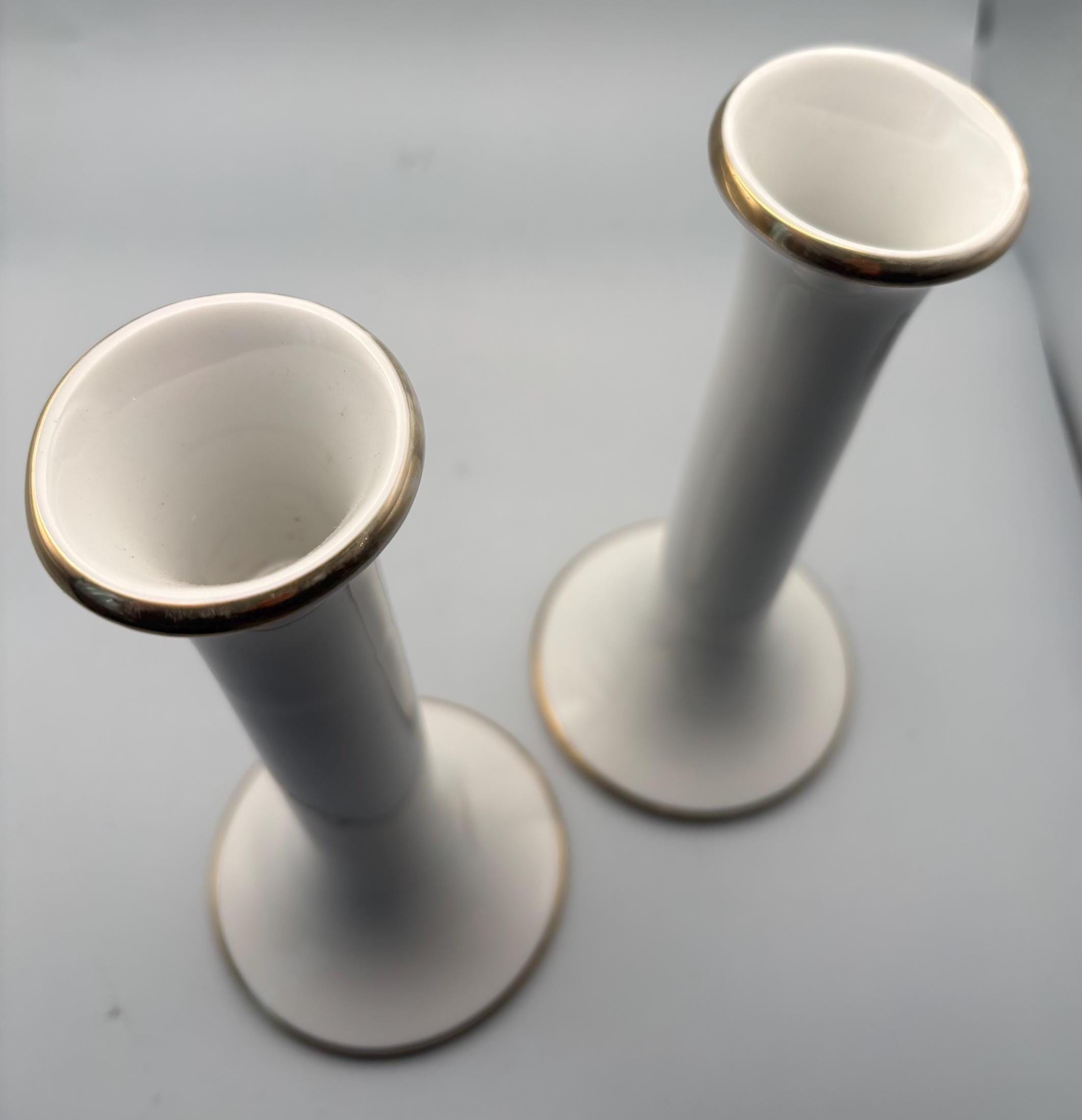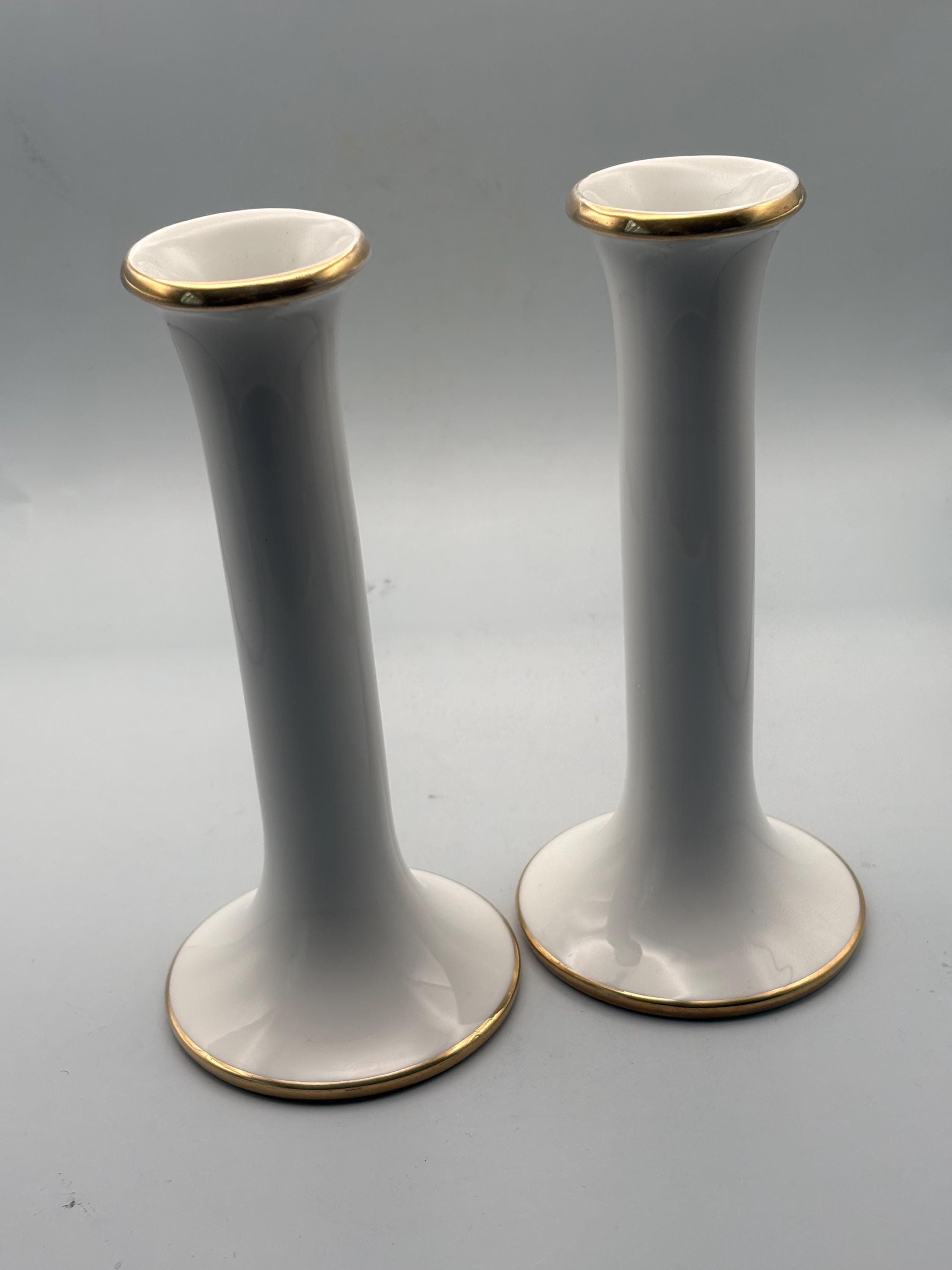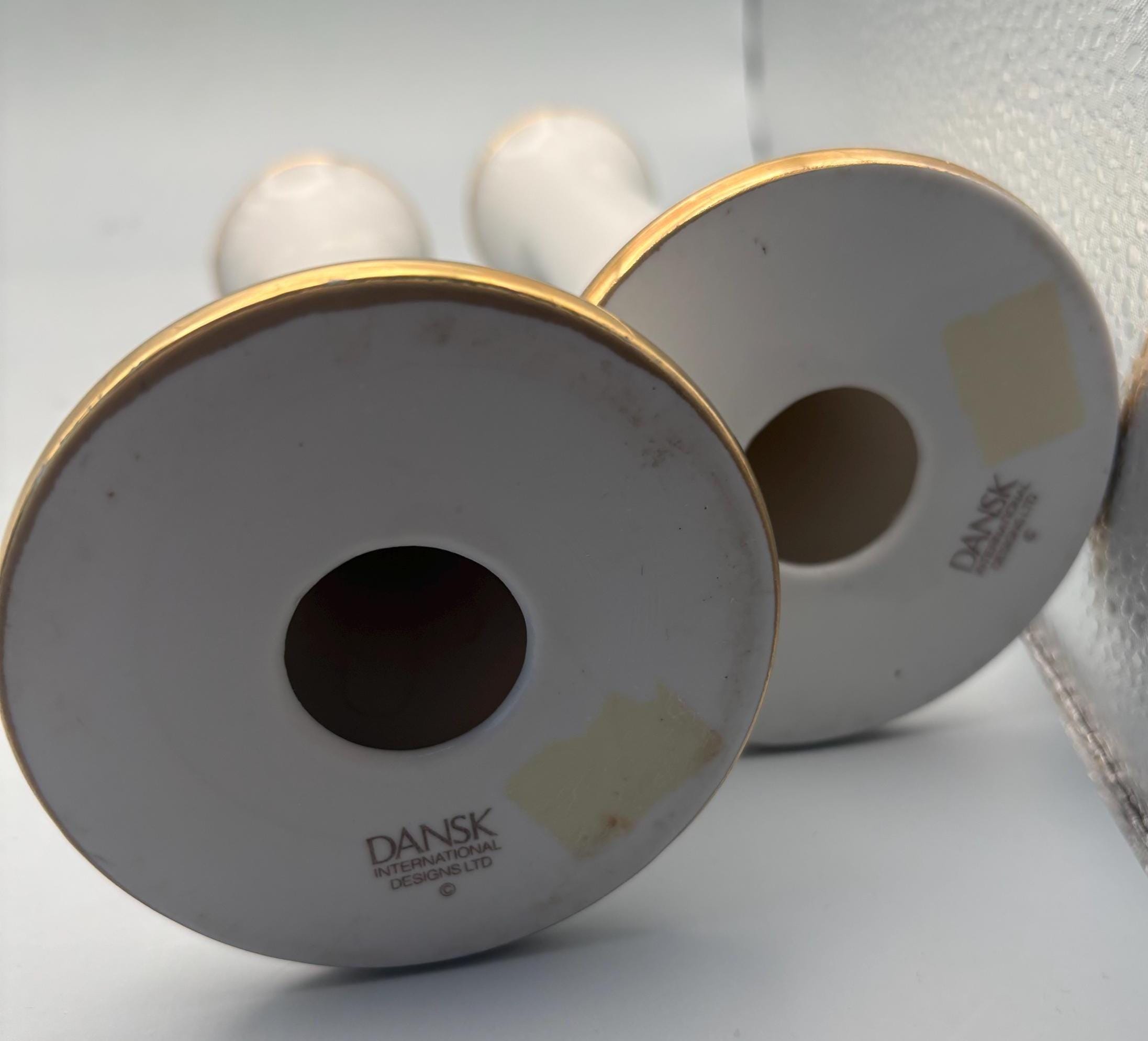 This exquisite pair of VINTAGE DANSK PORCELAIN CANDLE HOLDERS showcases classic mid-century modern elegance with their sleek white porcelain bodies accented by delicate gold trim around the rims and bases. They each measure approximately 7 1/4" high, 3 3/8" at its base. They are signed Dansk on the bottom as shown in picture.