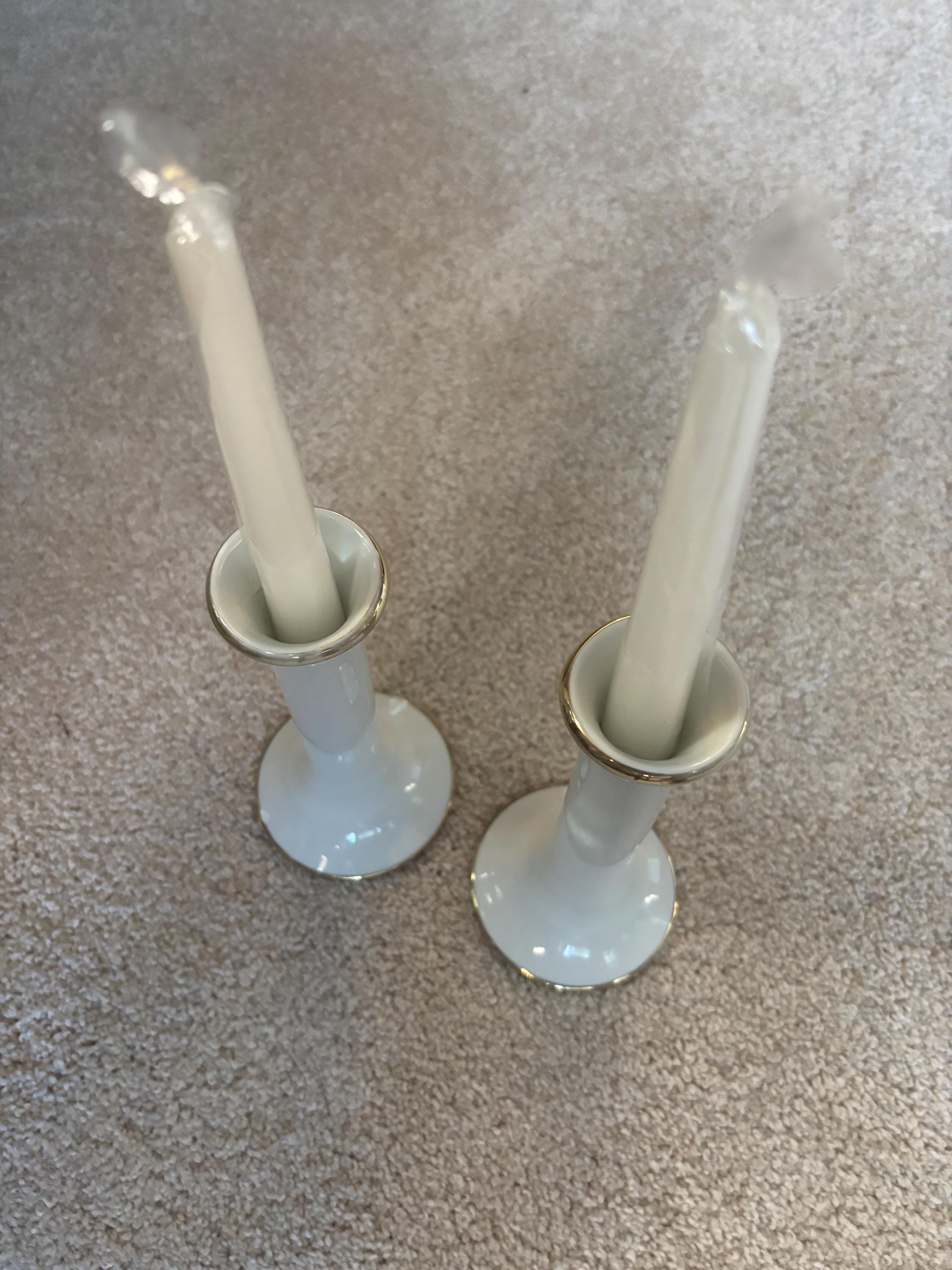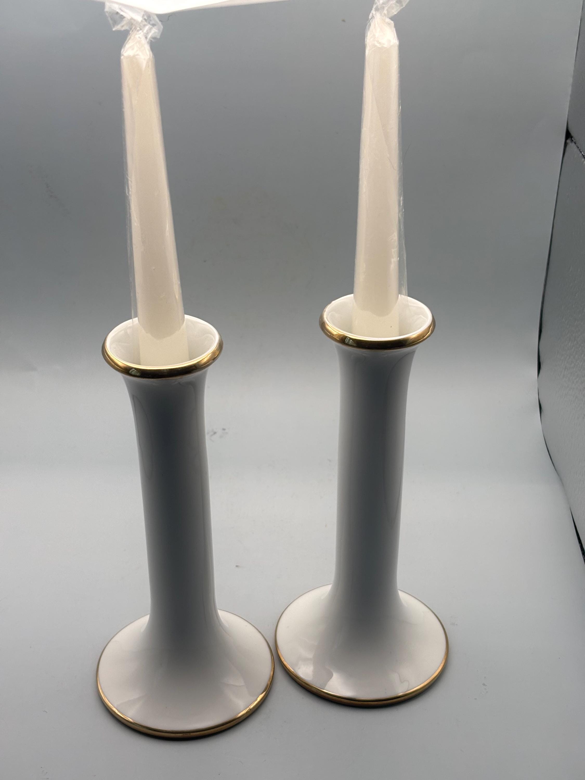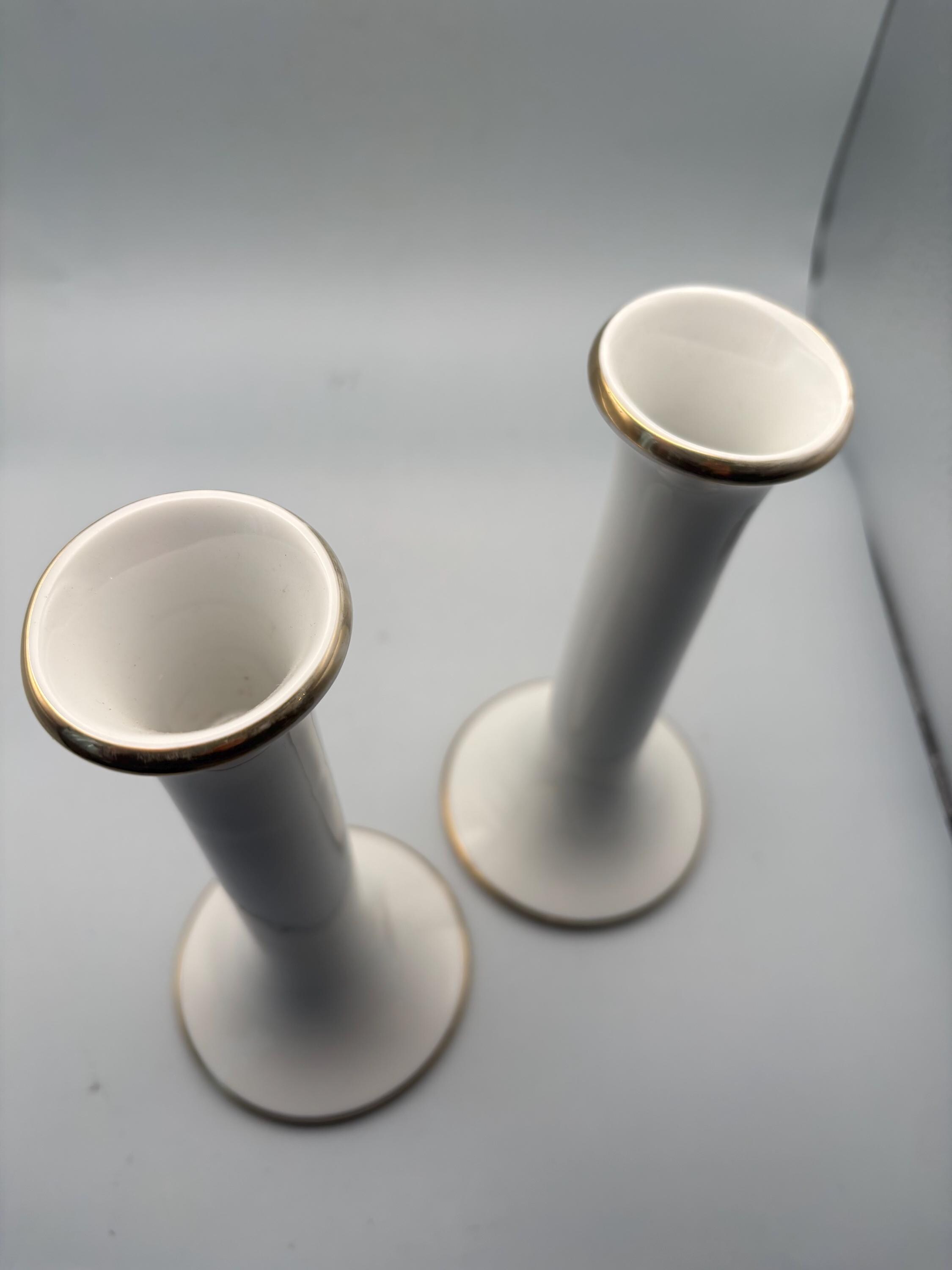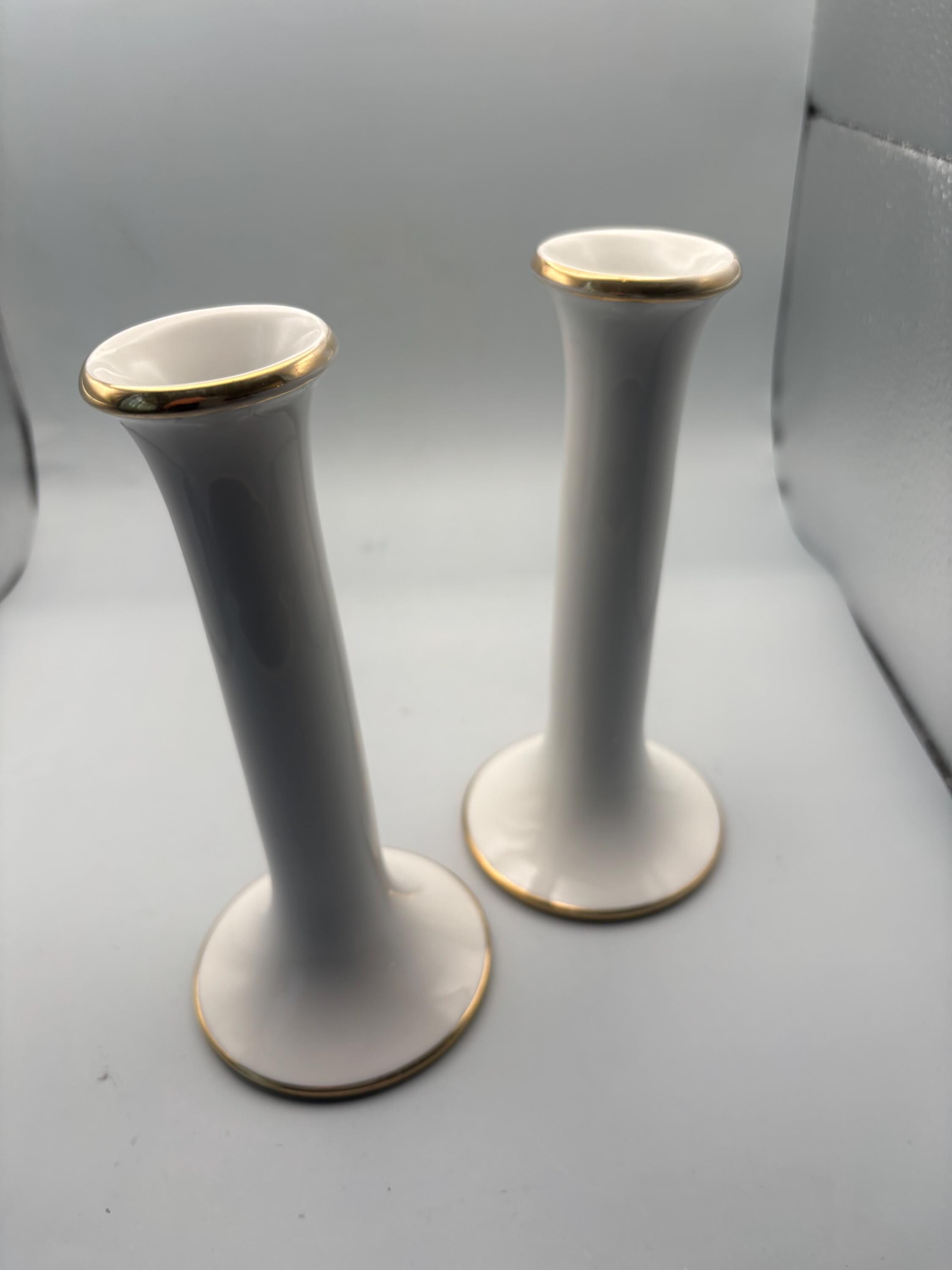 This exquisite pair of VINTAGE DANSK PORCELAIN CANDLE HOLDERS showcases classic mid-century modern elegance with their sleek white porcelain bodies accented by delicate gold trim around the rims and bases. They each measure approximately 7 1/4" high, 3 3/8" at its base. They are signed Dansk on the bottom as shown in picture.