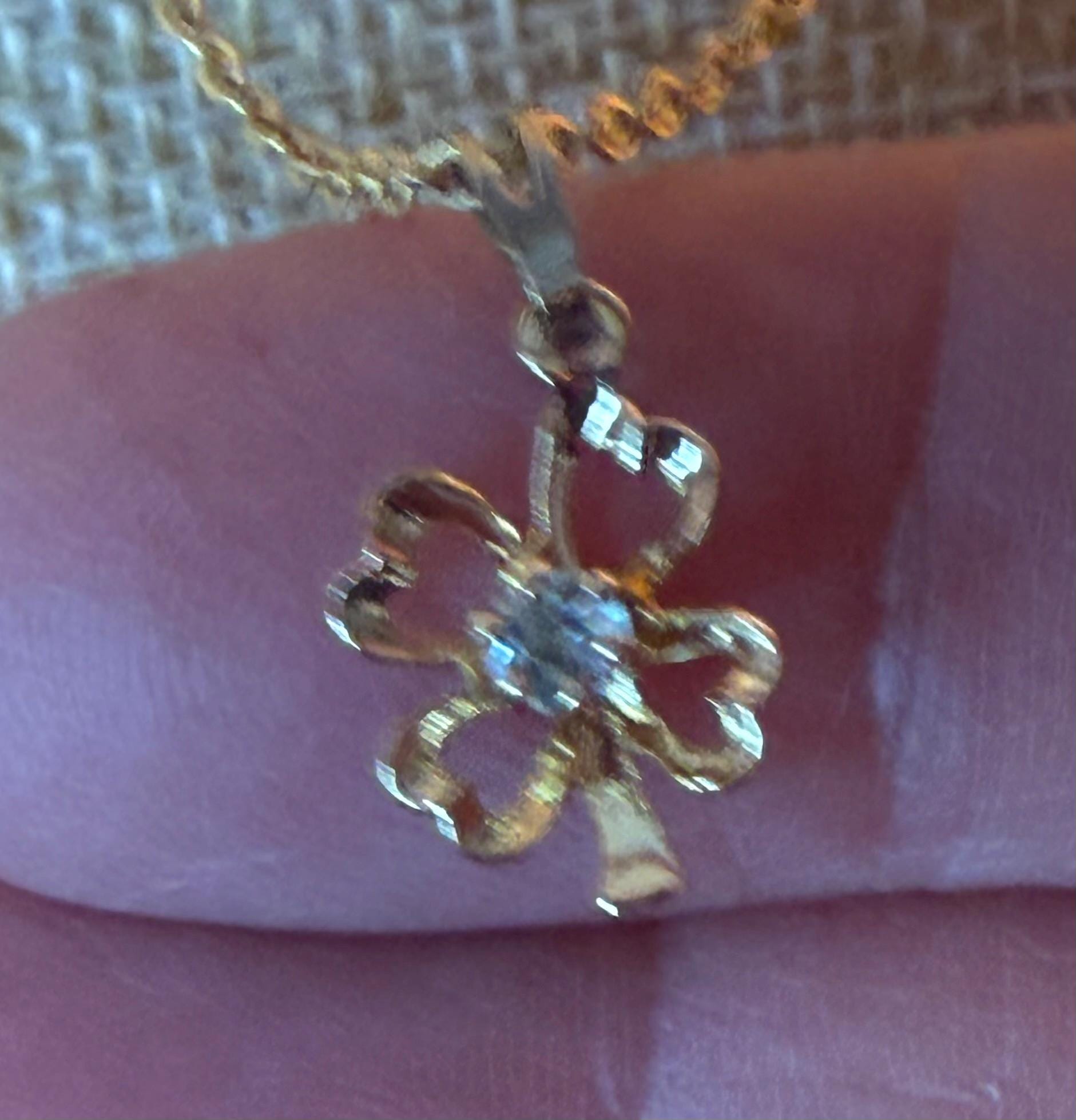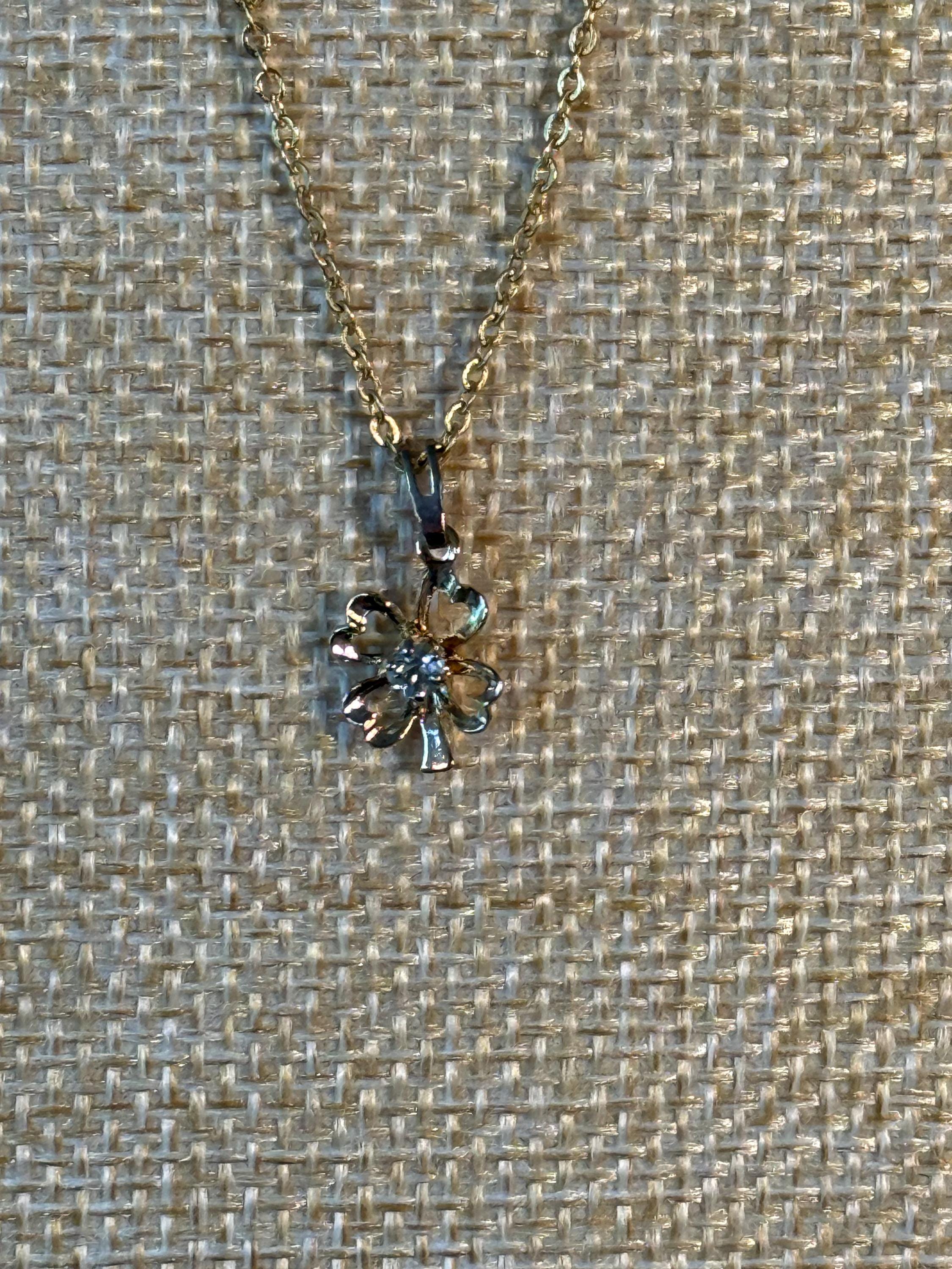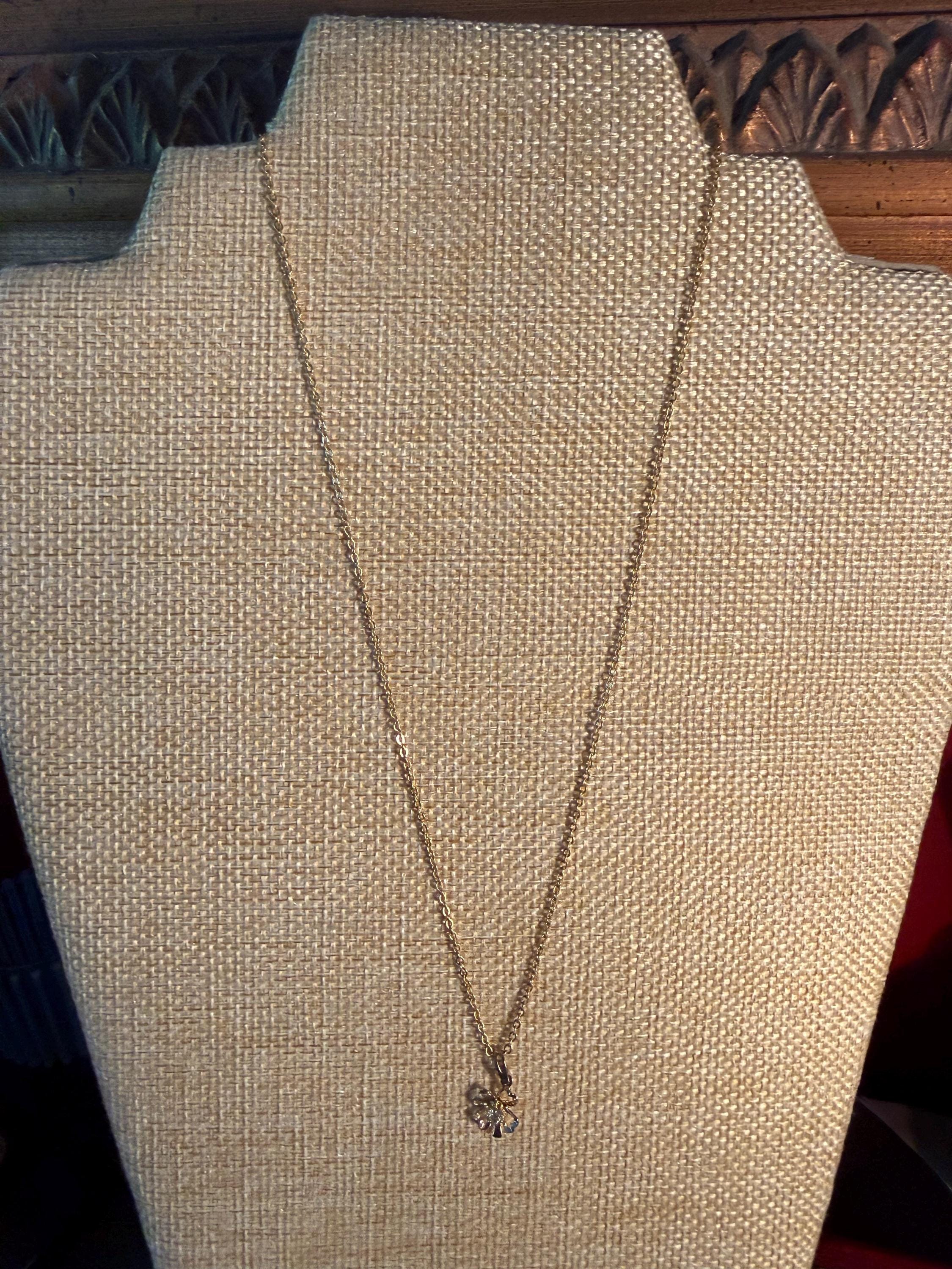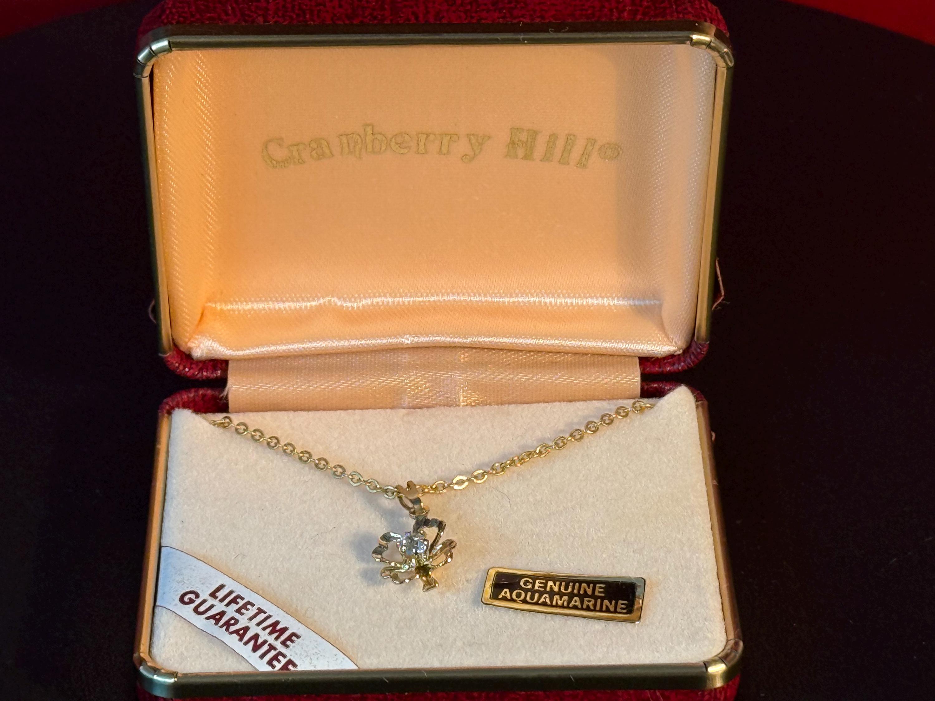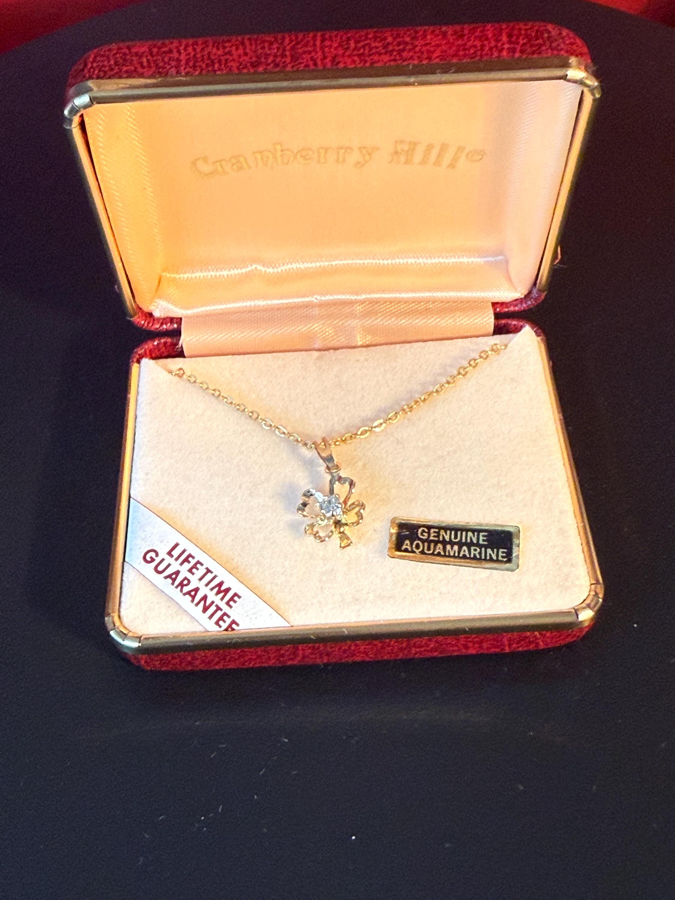 This Genuine Aquamarine Shamrock Necklace features a delicate gold-tone chain measuring 9 1/4 inches, designed to rest elegantly on the chest. The pendant showcases a finely crafted shamrock flower design, embedded with a genuine aquamarine stone at the center, capturing a soft blue hue that symbolizes tranquility and luck. Housed in its original Cranberry Hill® box, this necklace promises a lifetime guarantee, making it a treasured keepsake or a meaningful gift.