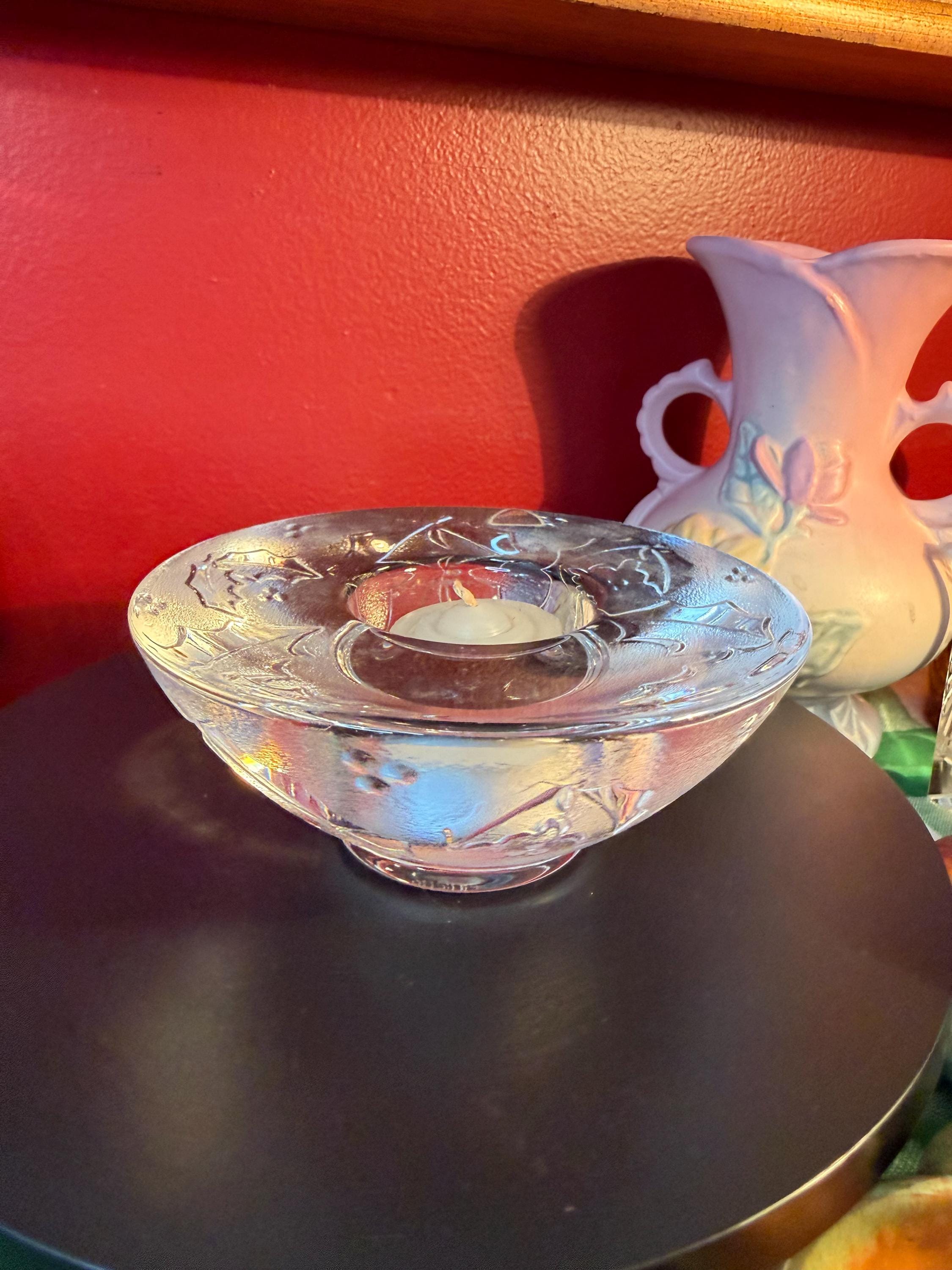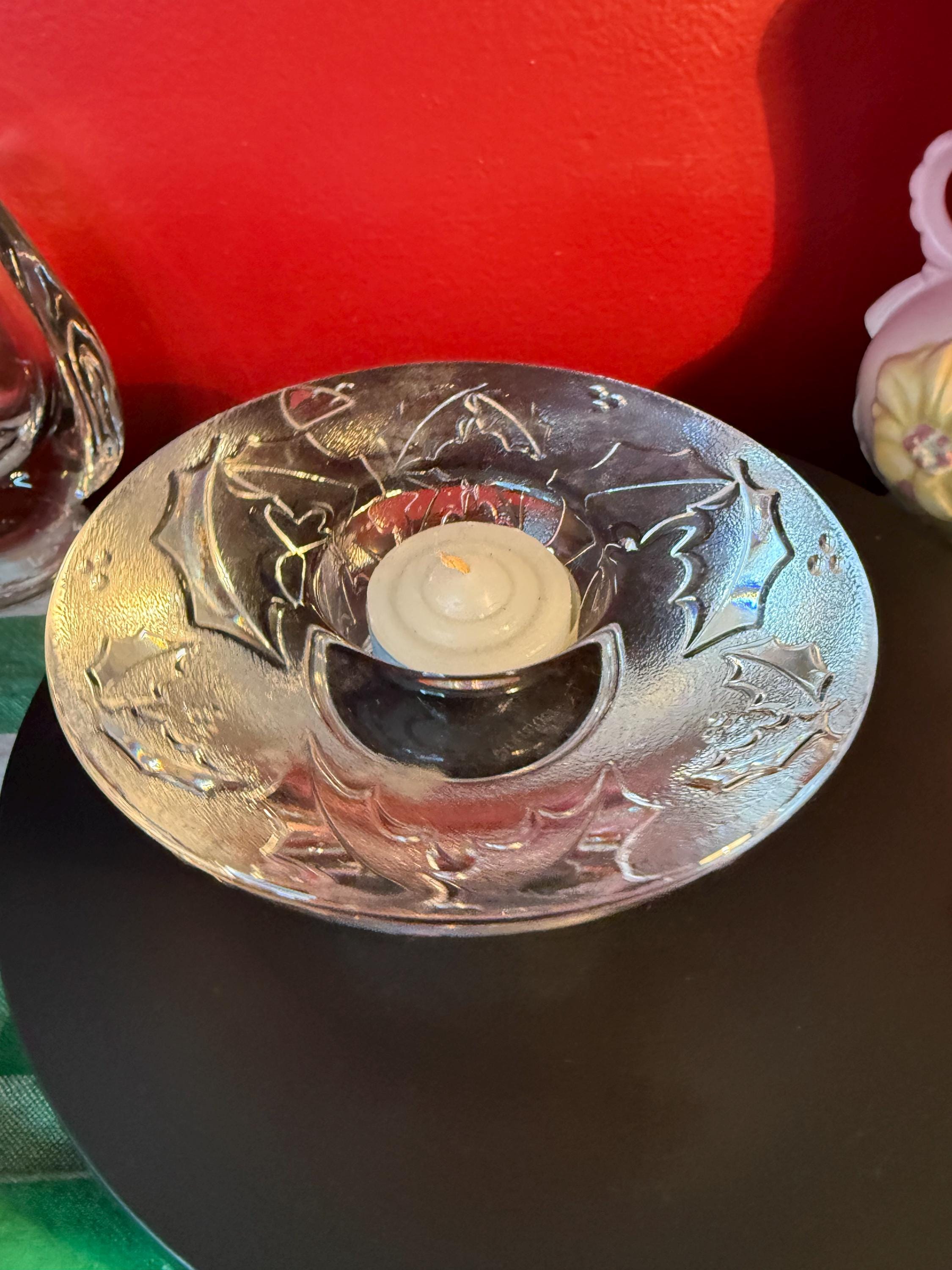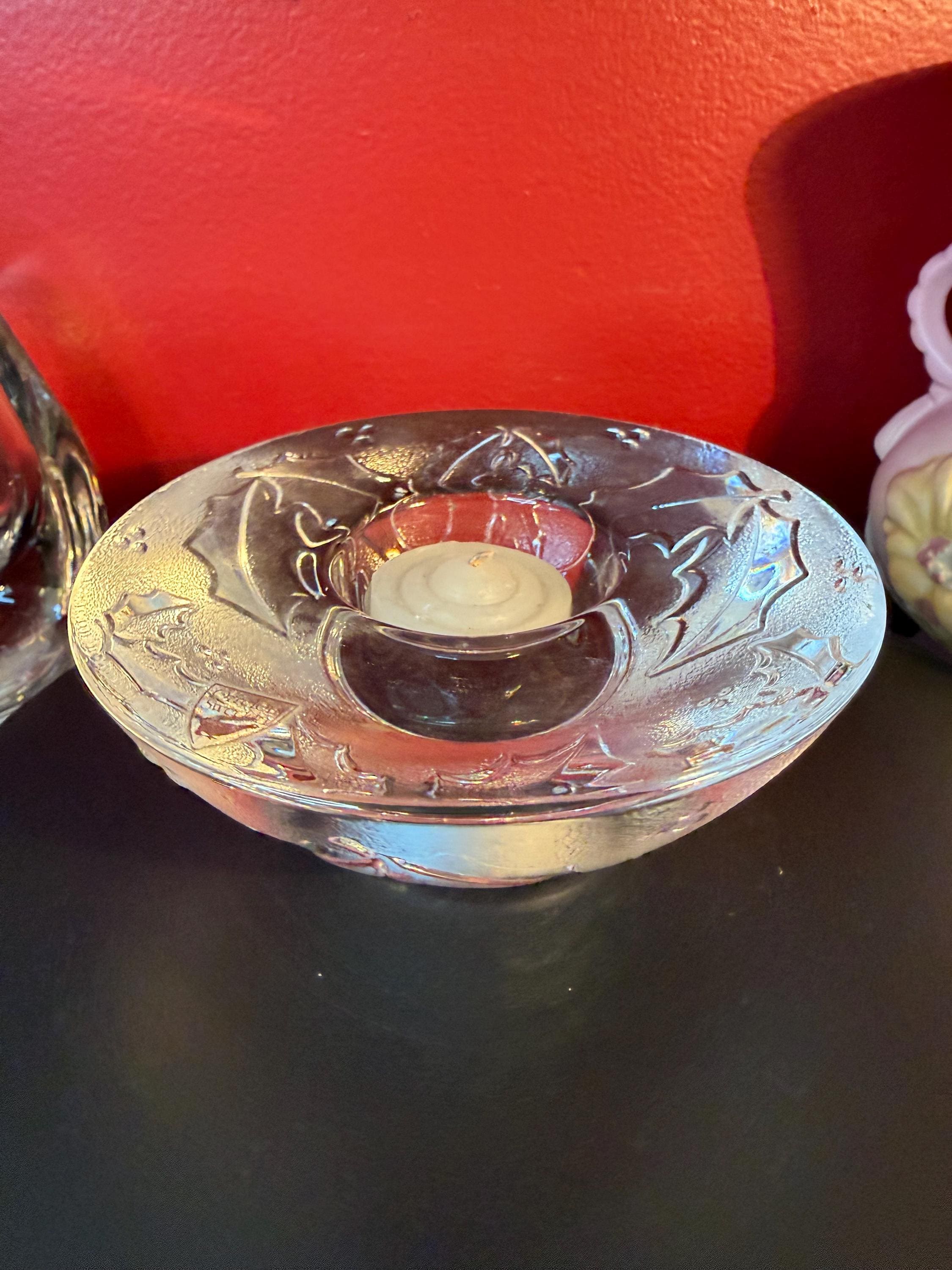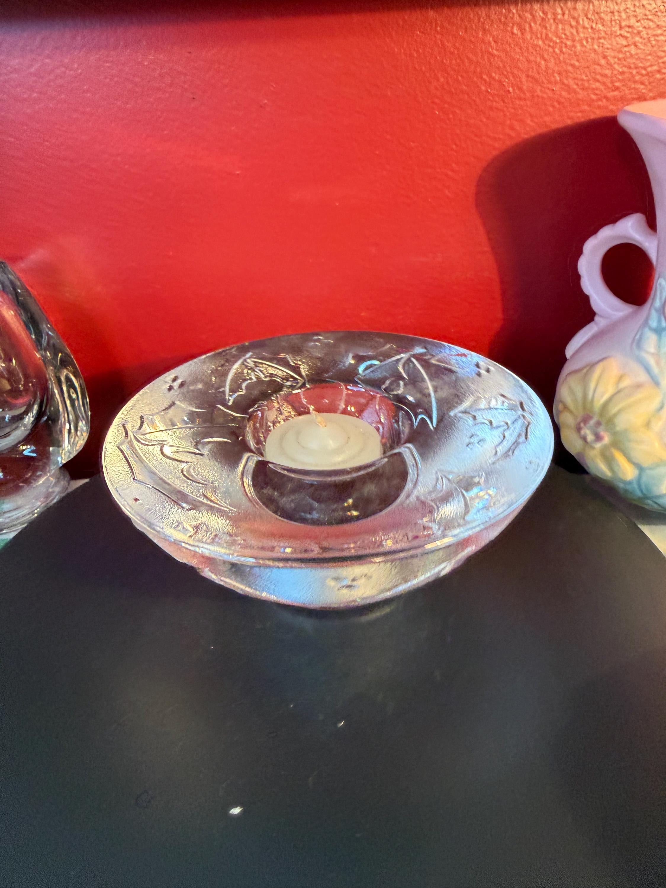 This Vintage Glass Votive Candle Holder is a charming accent piece measuring 5 inches wide and 2 inches high. Crafted from clear glass with a textured, embossed design around the rim, it adds subtle elegance to any tabletop or mantel. Perfect for votive or tealight candles, this holder beautifully reflects candlelight through its delicately patterned glass.