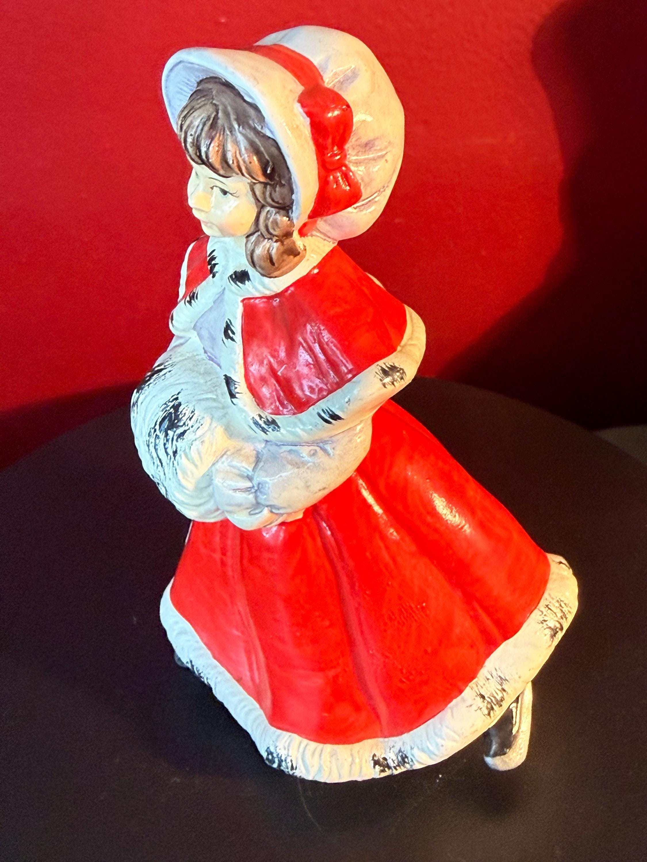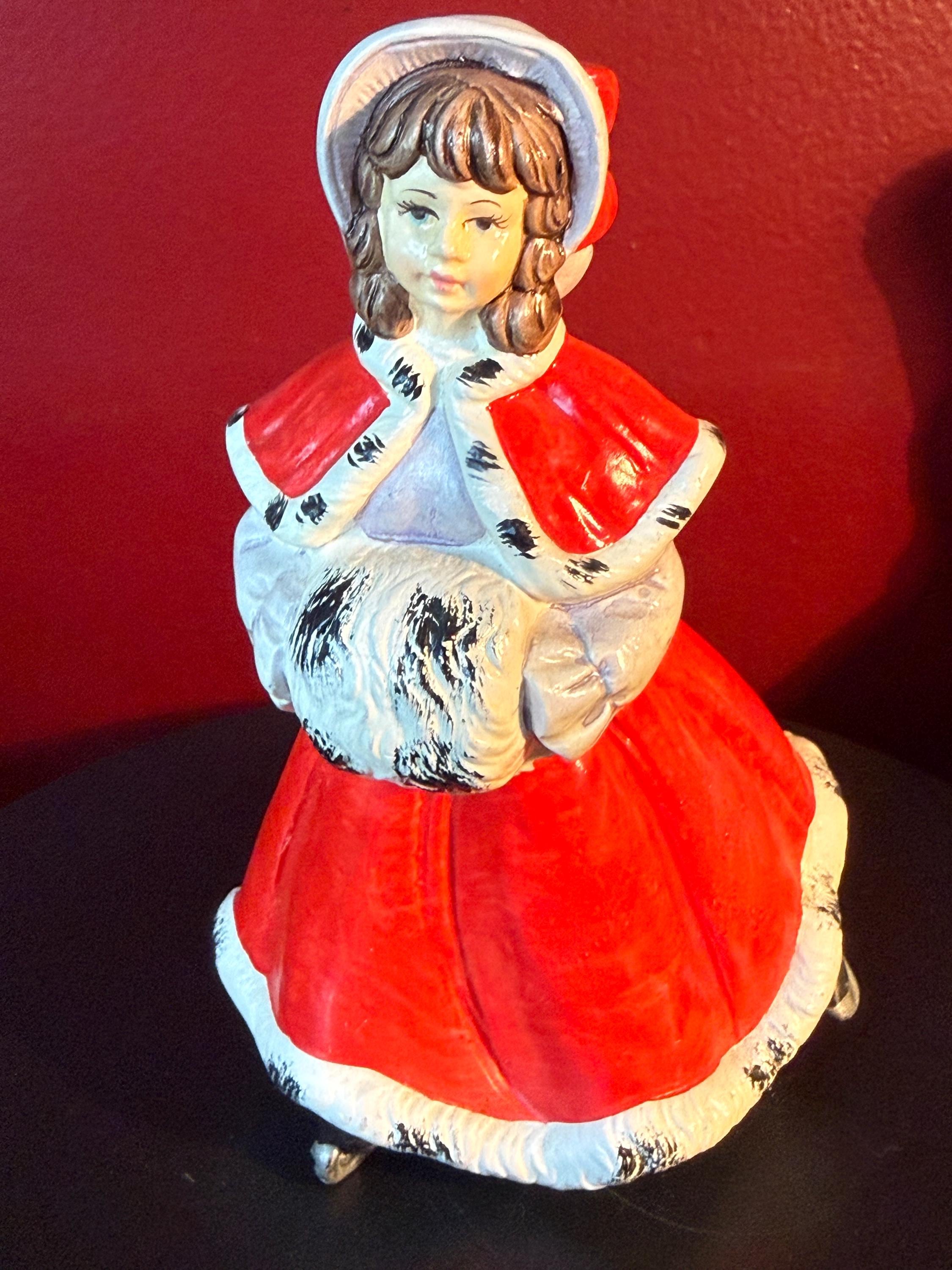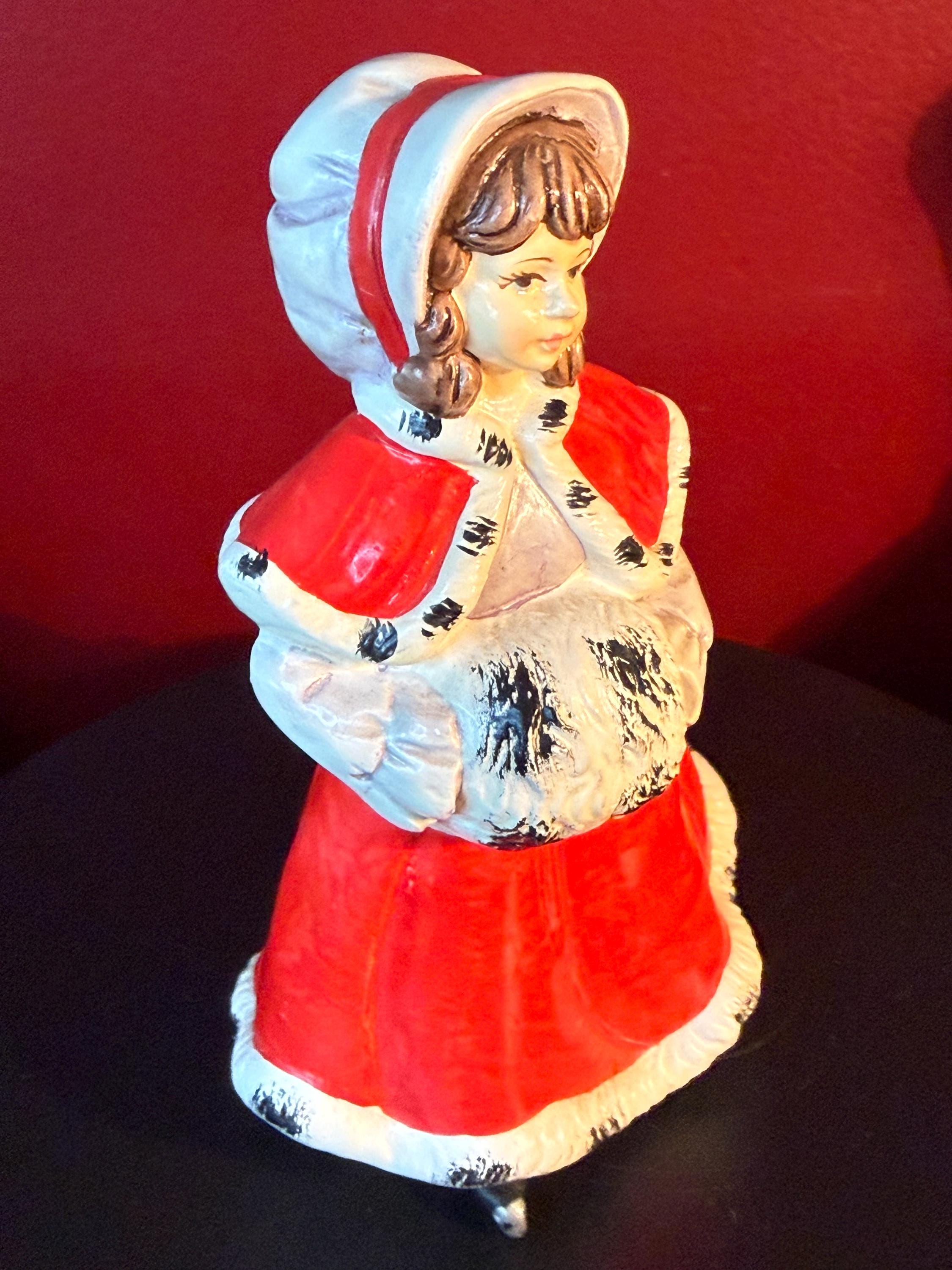 This charming Vintage Christmas Caroler Woman figurine showcases a beautiful hand-painted ceramic woman dressed in a striking red cloak trimmed with white and black fur detail. Made in Japan, this collectible captures the nostalgic holiday spirit with its delicate craftsmanship and traditional winter attire. It stands as a lovely seasonal decoration or a unique addition to any vintage Christmas collection.