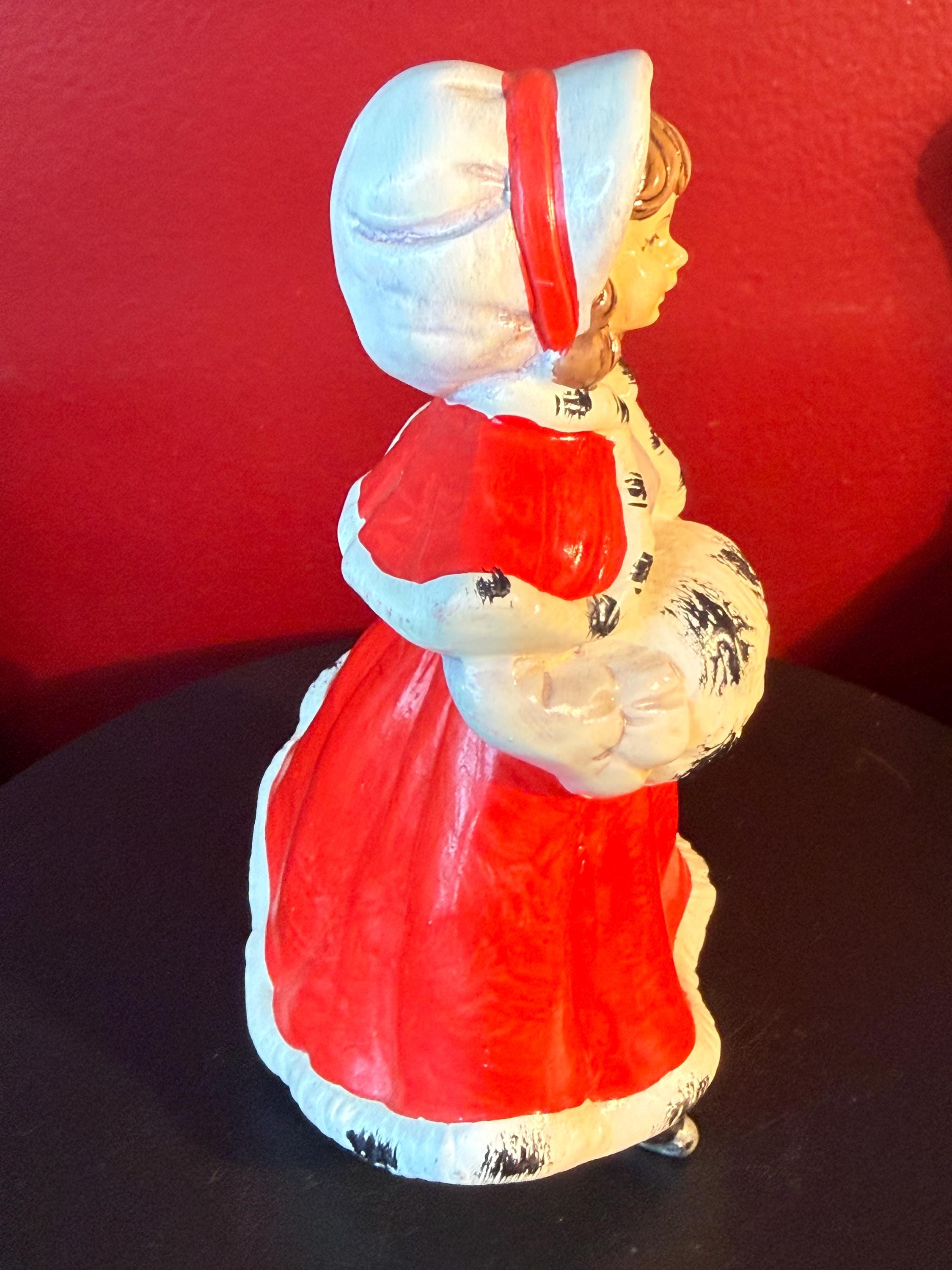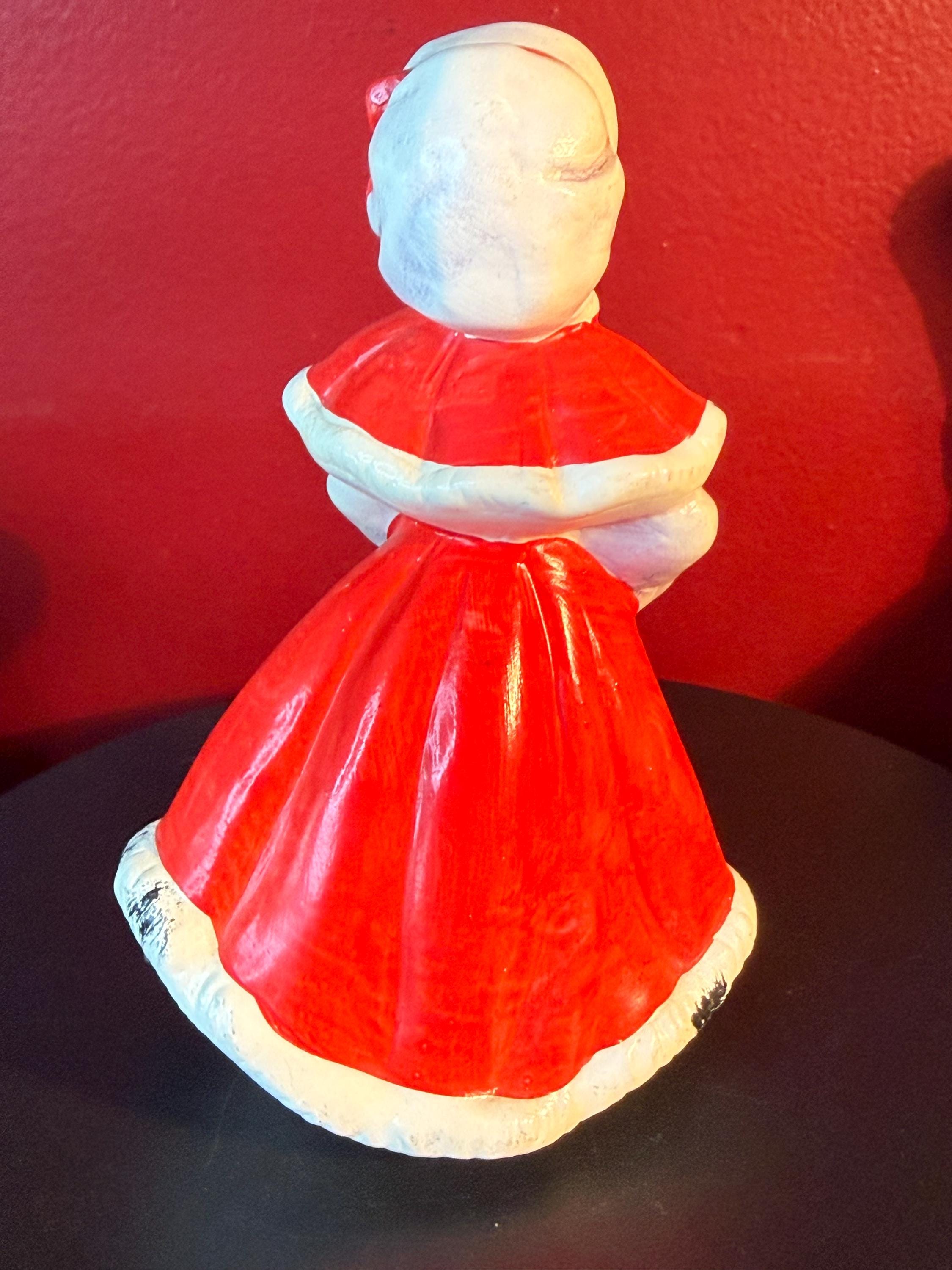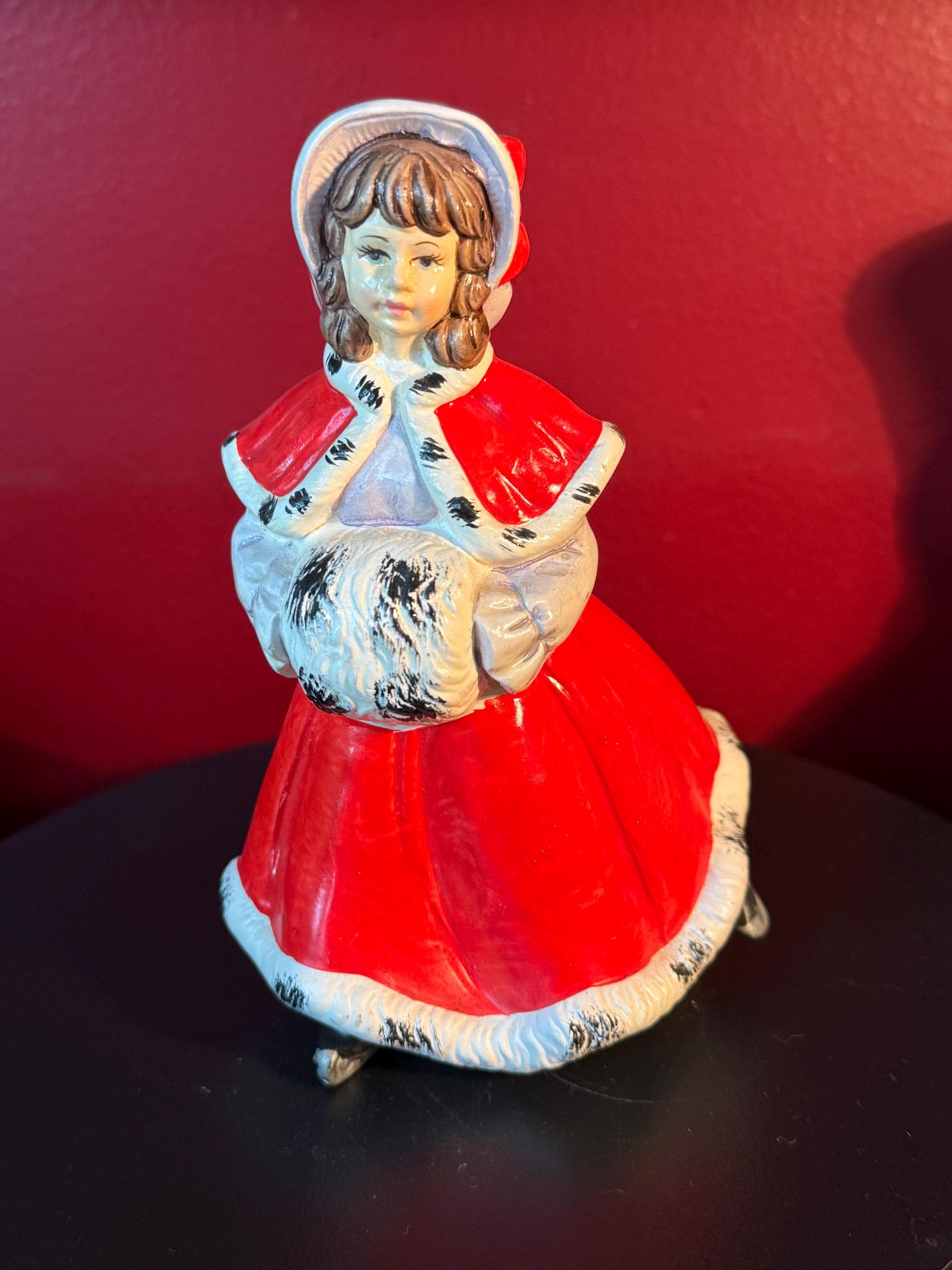 This charming Vintage Christmas Caroler Woman figurine showcases a beautiful hand-painted ceramic woman dressed in a striking red cloak trimmed with white and black fur detail. Made in Japan, this collectible captures the nostalgic holiday spirit with its delicate craftsmanship and traditional winter attire. It stands as a lovely seasonal decoration or a unique addition to any vintage Christmas collection.