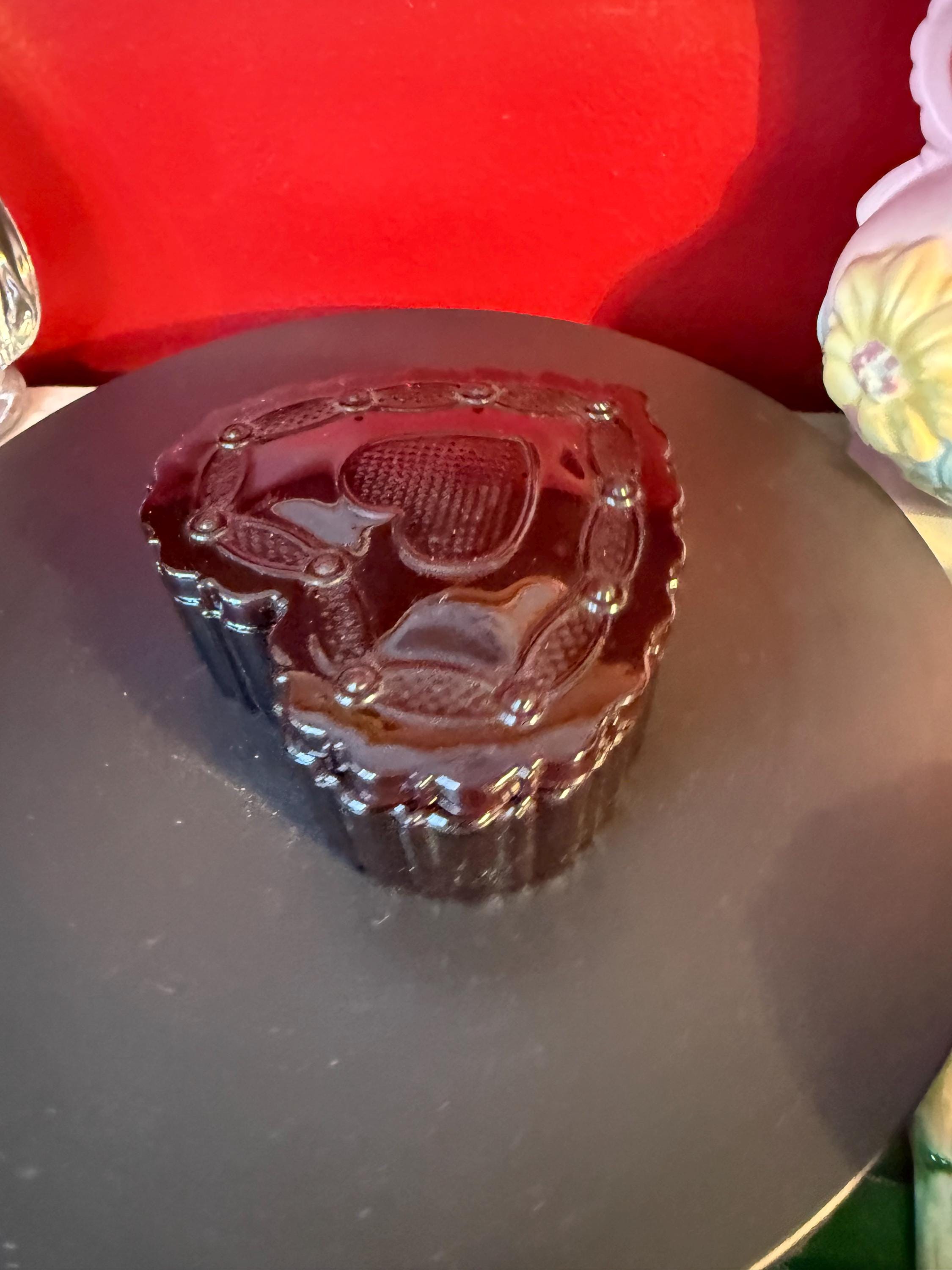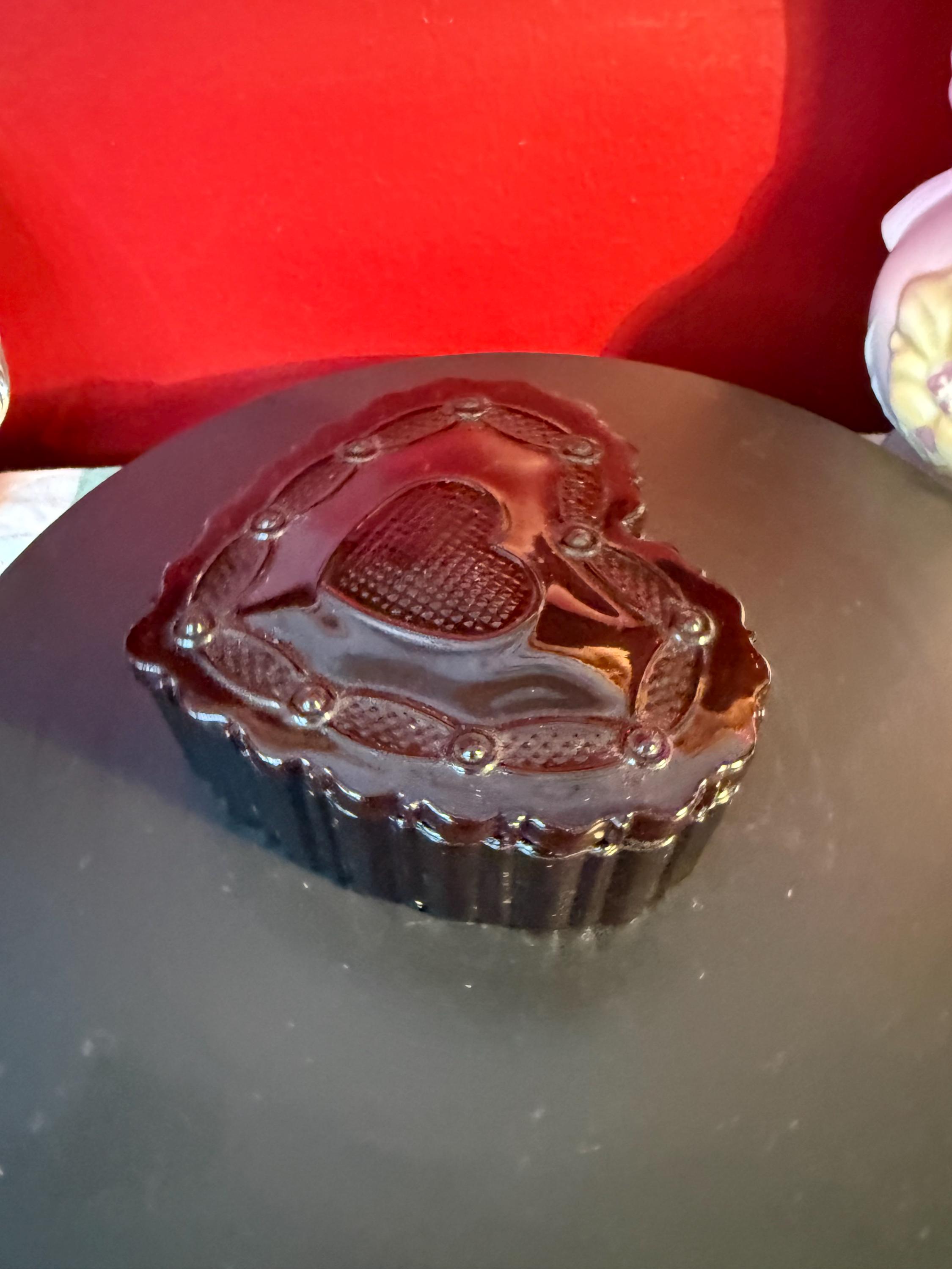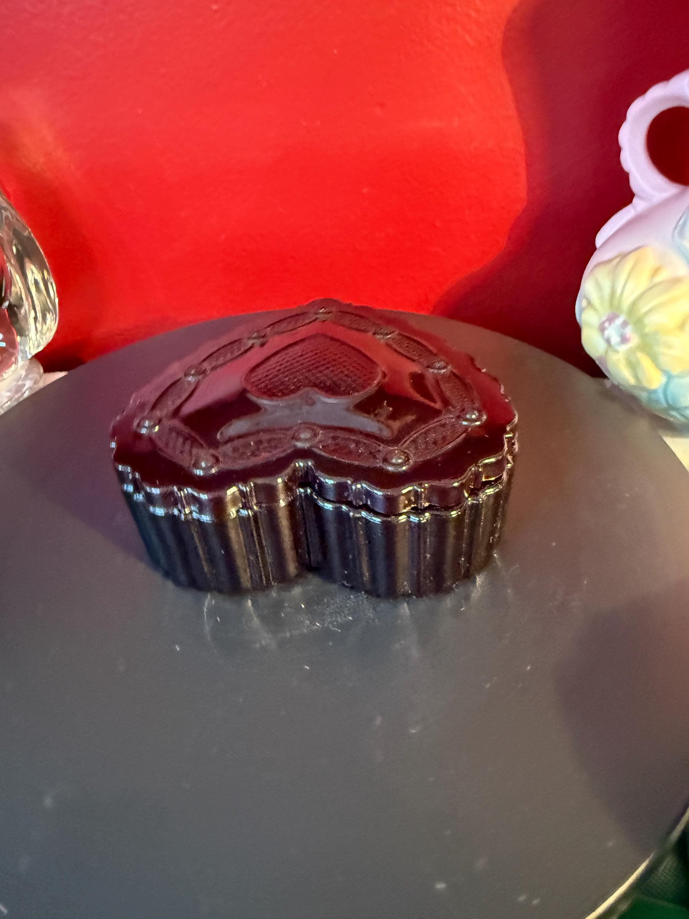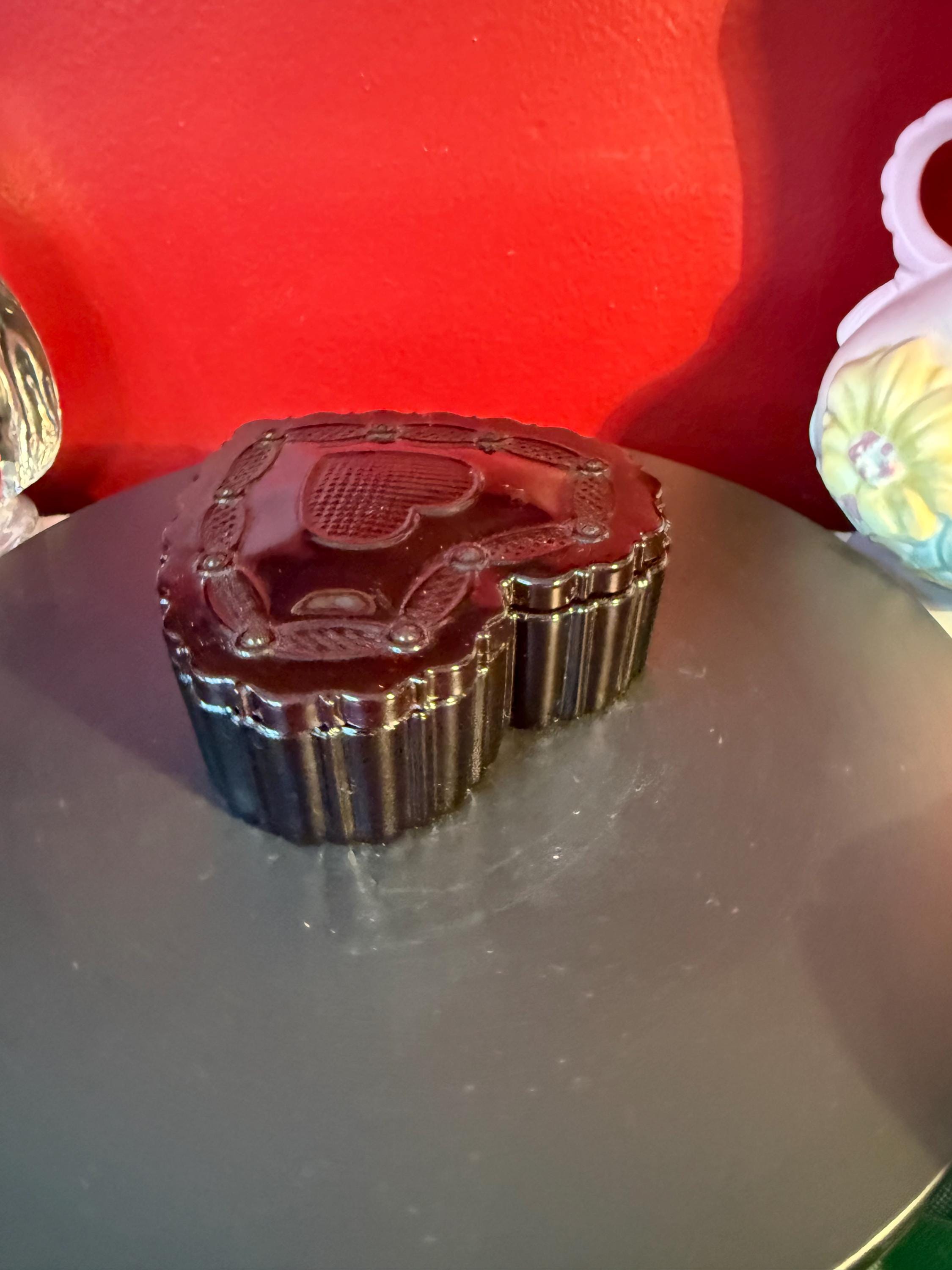 This Vintage Ruby Red Heart Trinket Box is a charming and elegant collectible that adds a touch of nostalgia to any space. Crafted from rich ruby red glass, this heart-shaped box features intricate embossed detailing on the lid, creating a beautiful textured pattern that catches the light effortlessly. Its compact size makes it perfect for storing small keepsakes, jewelry, or special mementos.