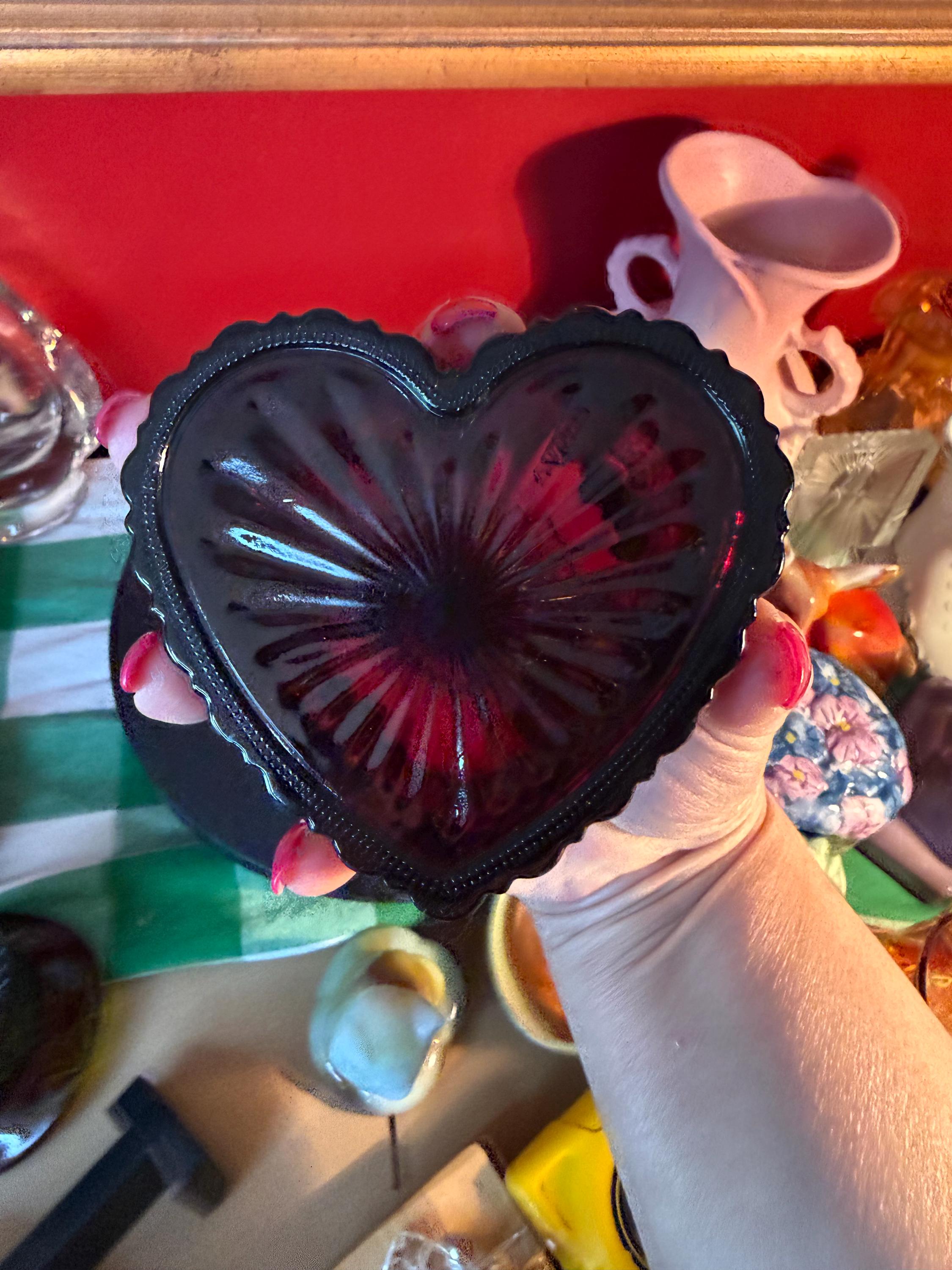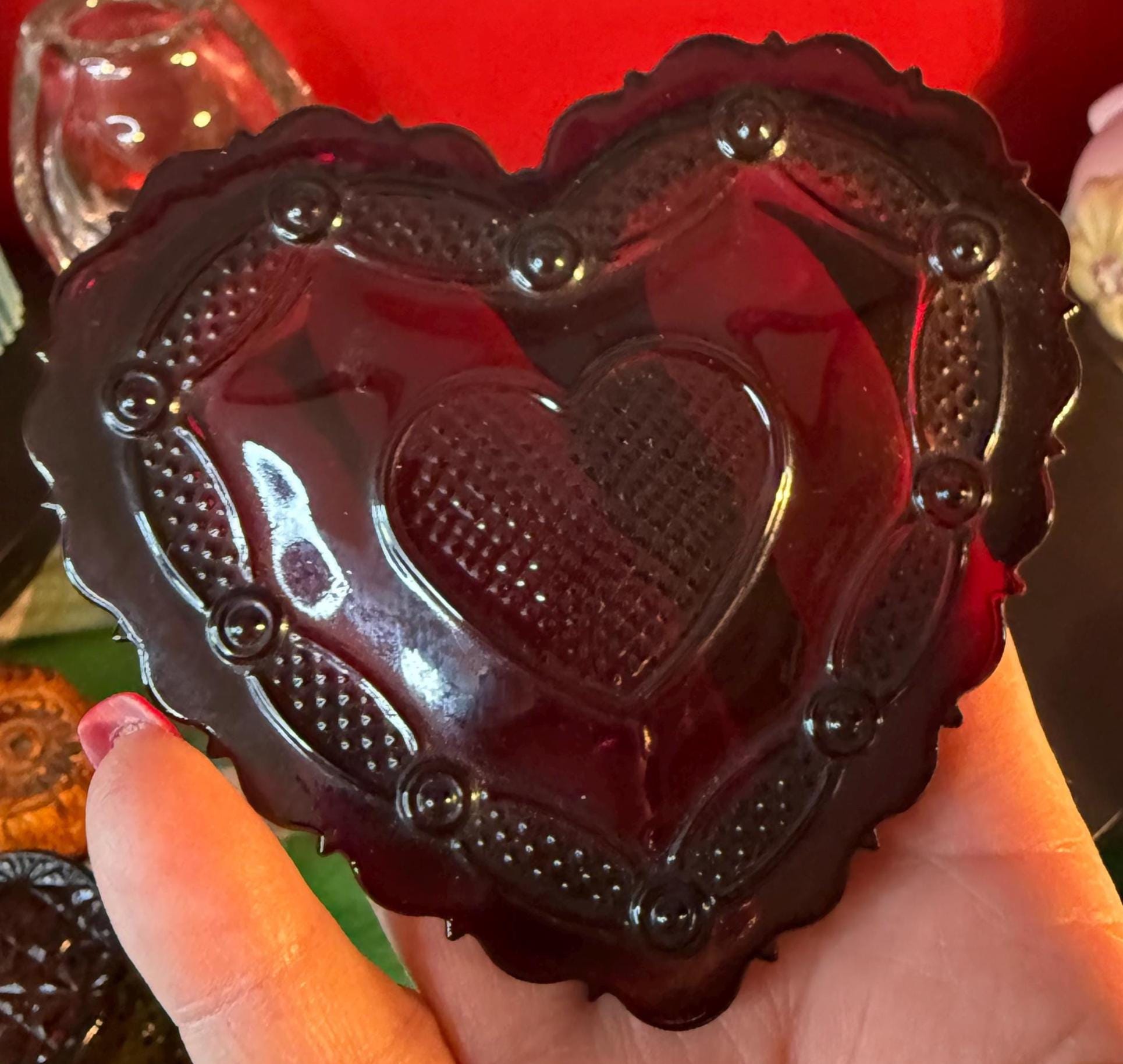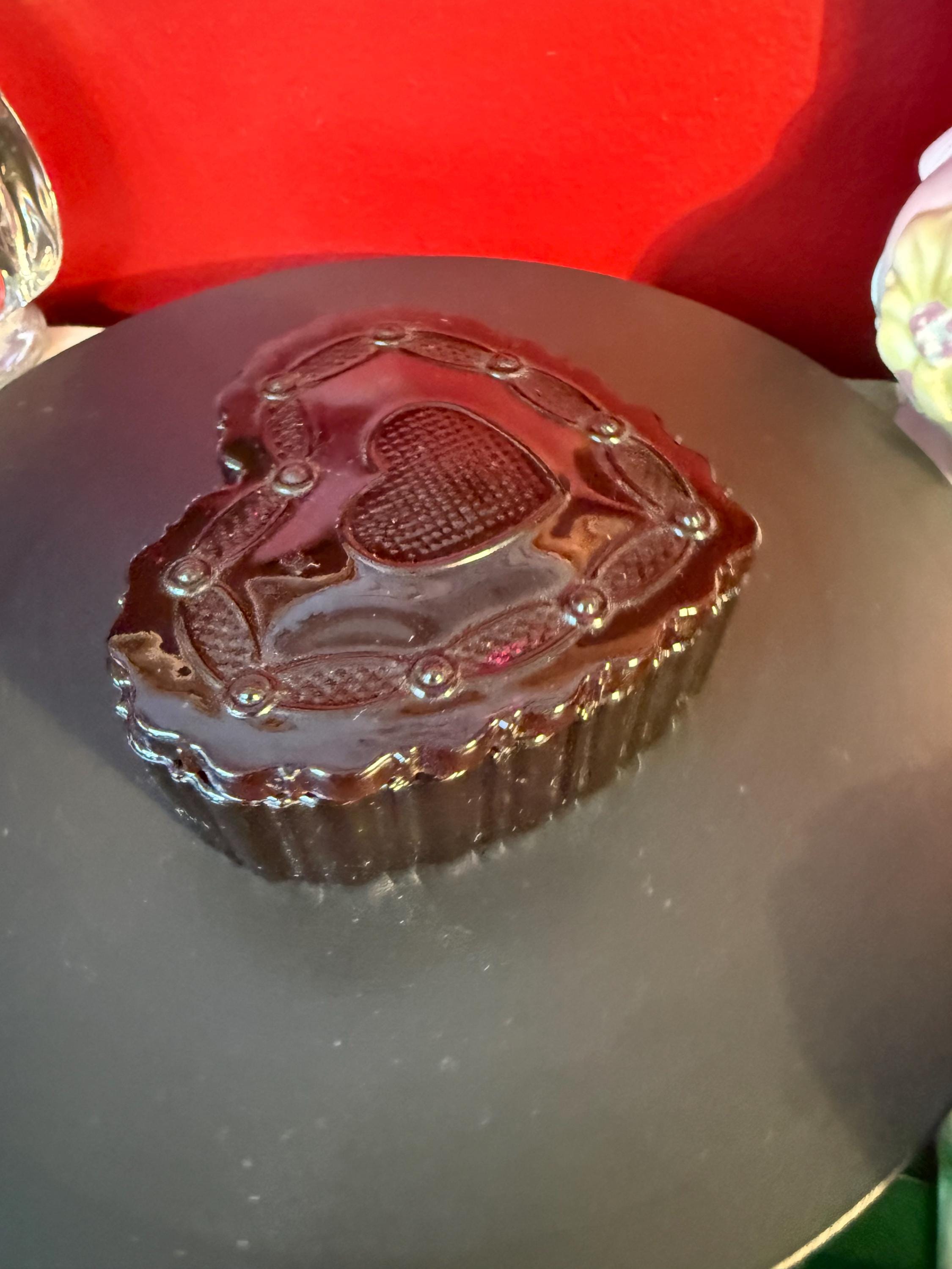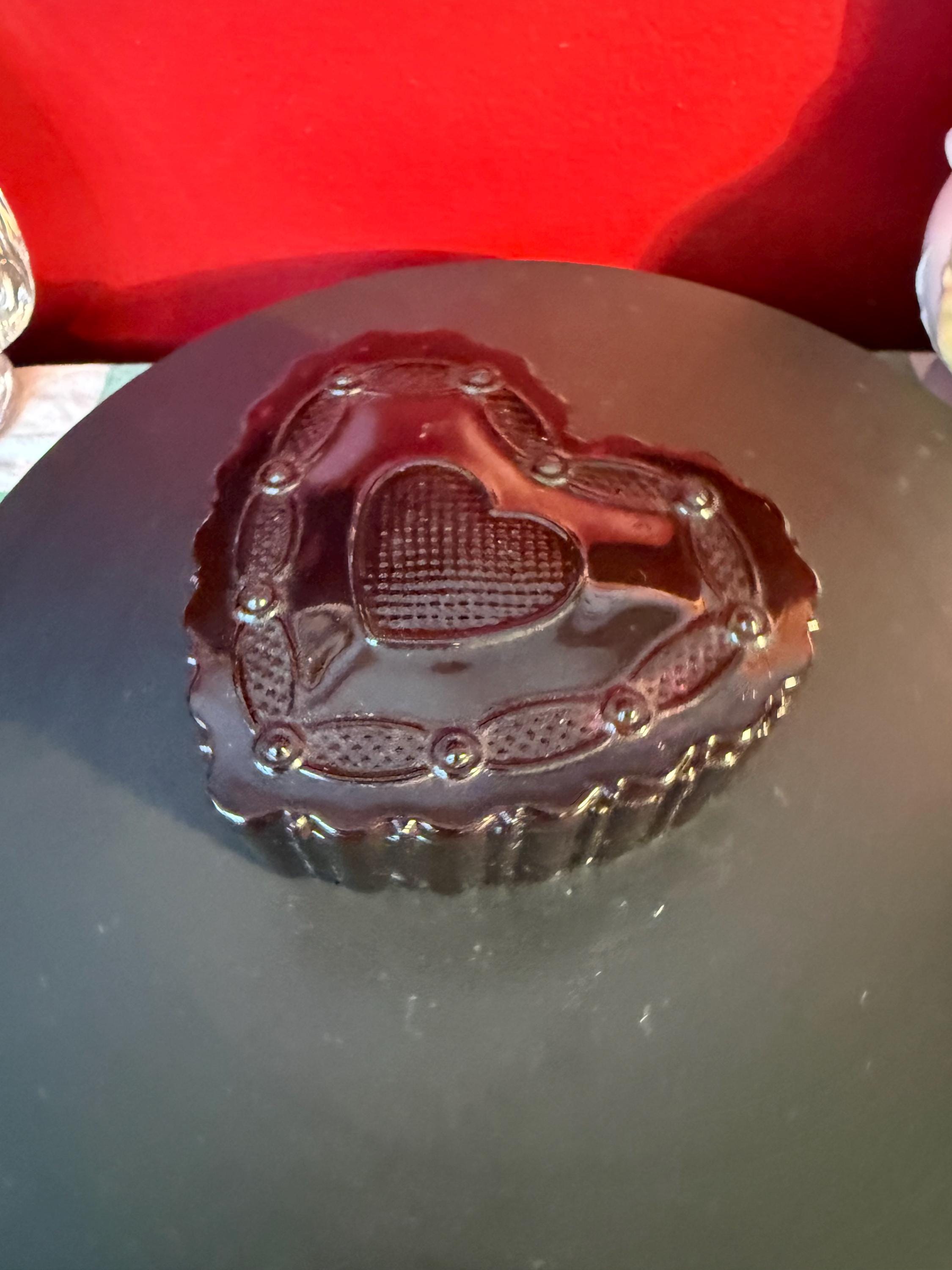 This Vintage Ruby Red Heart Trinket Box is a charming and elegant collectible that adds a touch of nostalgia to any space. Crafted from rich ruby red glass, this heart-shaped box features intricate embossed detailing on the lid, creating a beautiful textured pattern that catches the light effortlessly. Its compact size makes it perfect for storing small keepsakes, jewelry, or special mementos.
