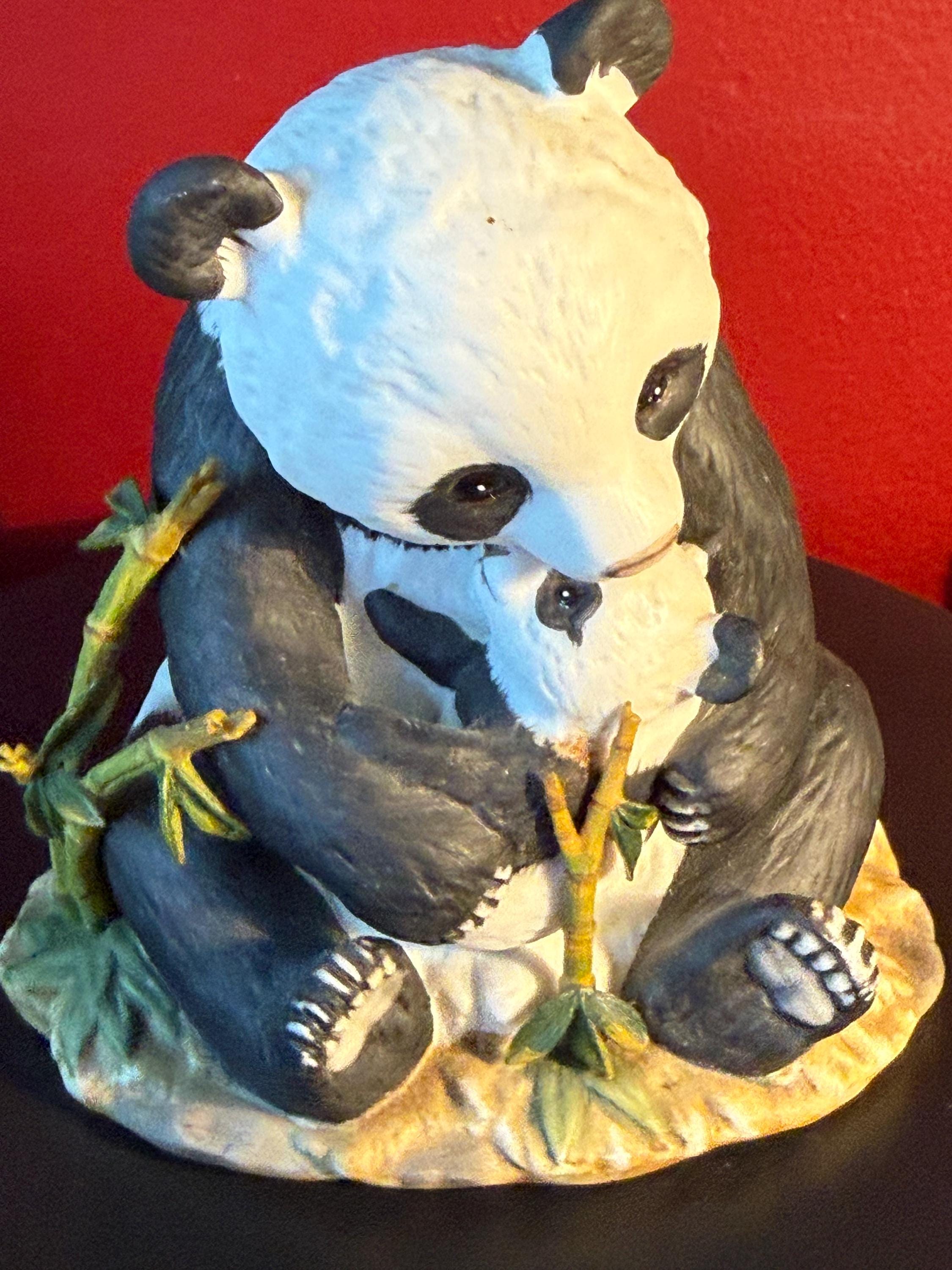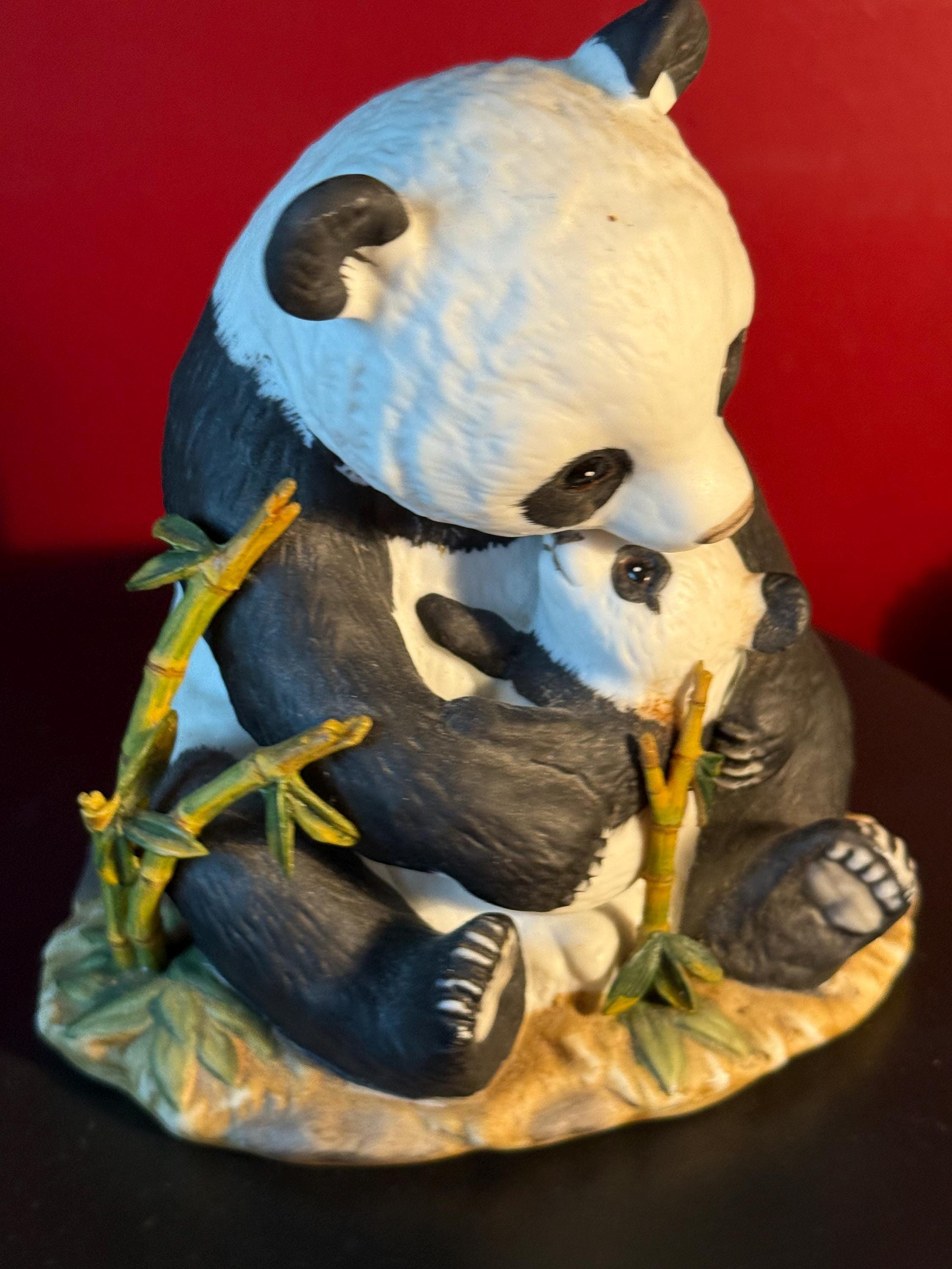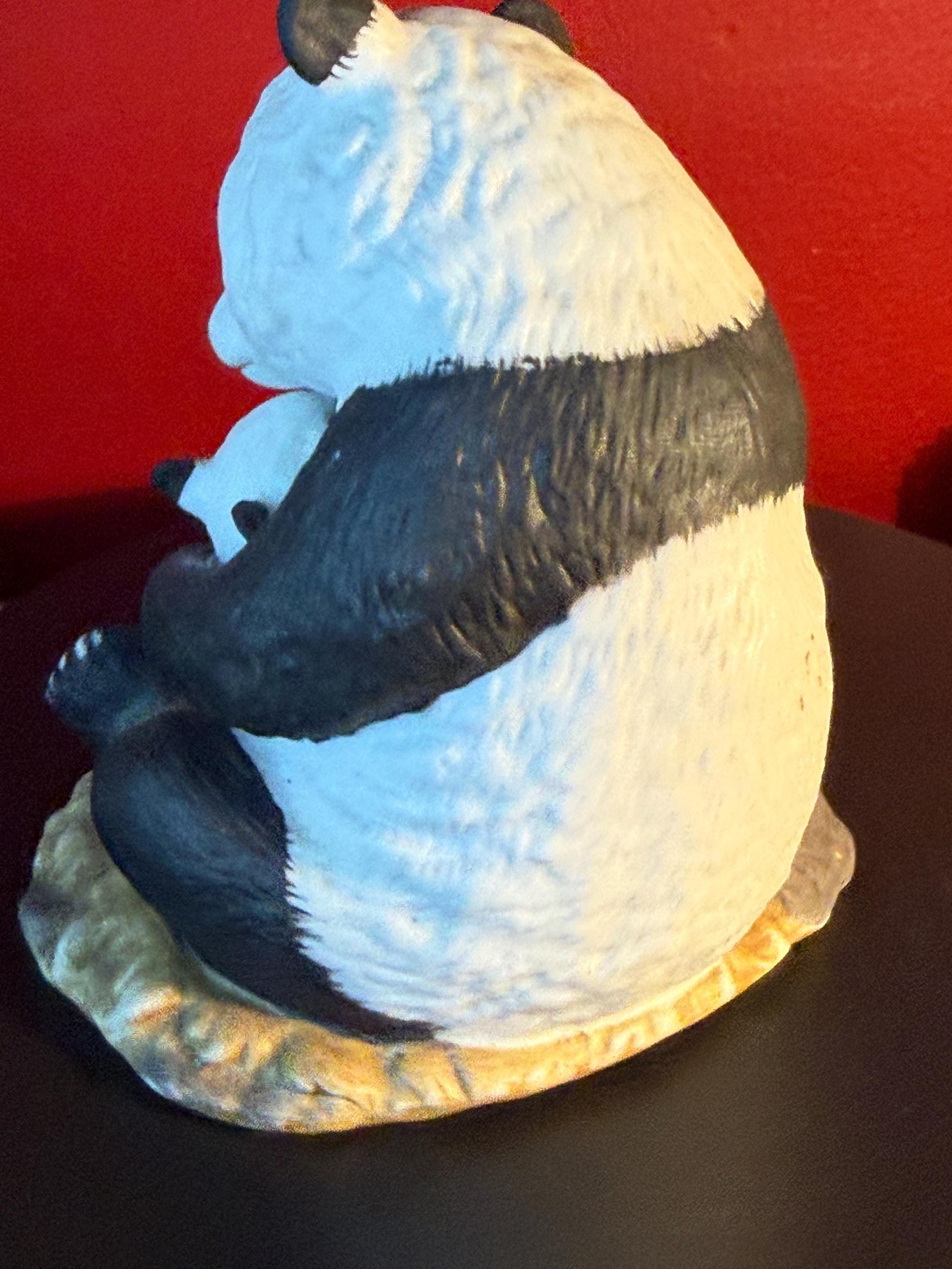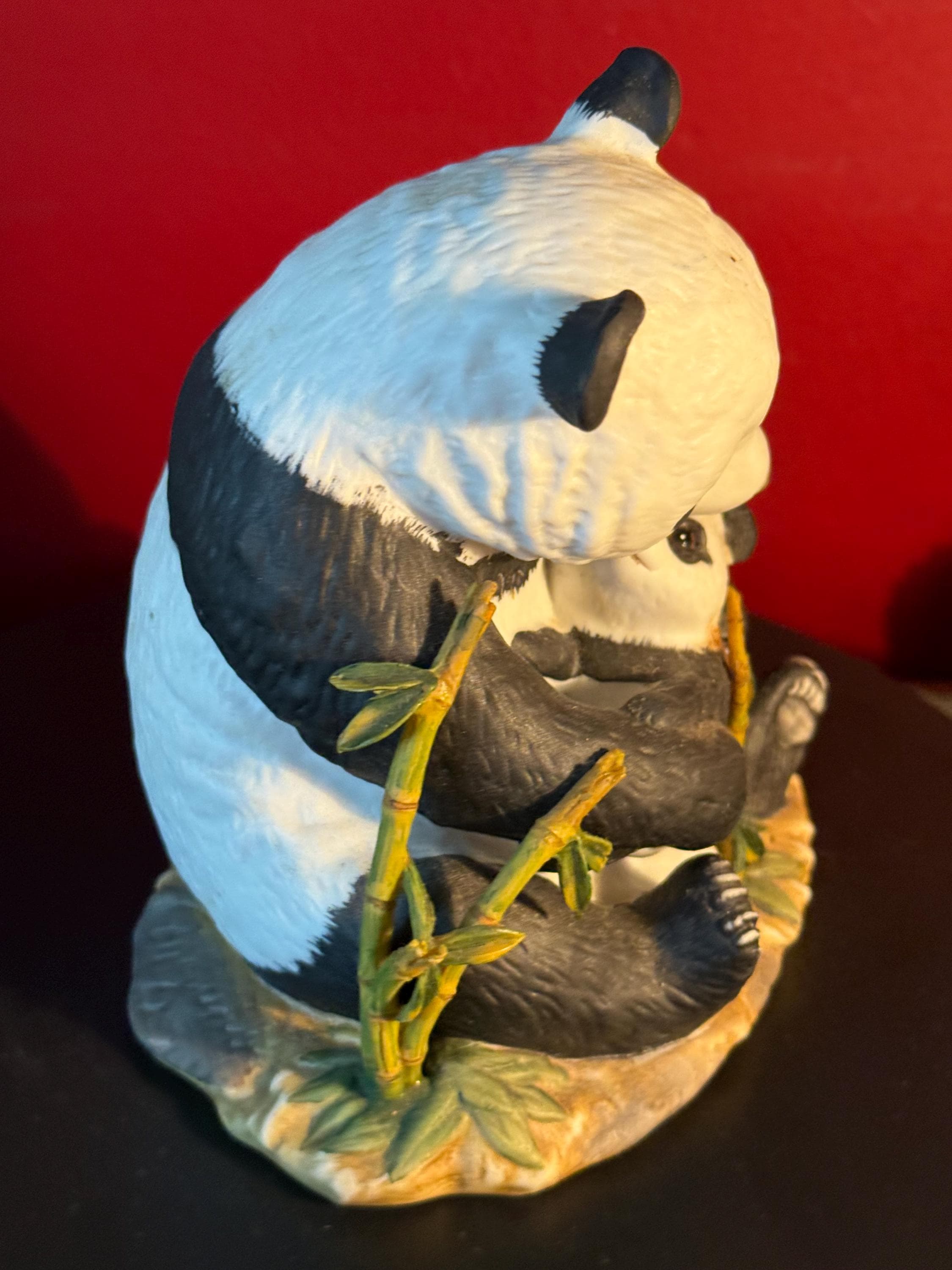 This Vintage Panda Bear Mother and Cub by Masterpiece Porcelain Homco is a charming collectible figurine that captures the tender moment between a panda mother and her cub. Crafted from high-quality porcelain and featuring exquisite black and white detailing, this piece is a beautiful example of Homco's artistry and attention to detail. The sculpted bamboo accents add to the naturalistic design, making it a perfect addition to any animal lover's collection.