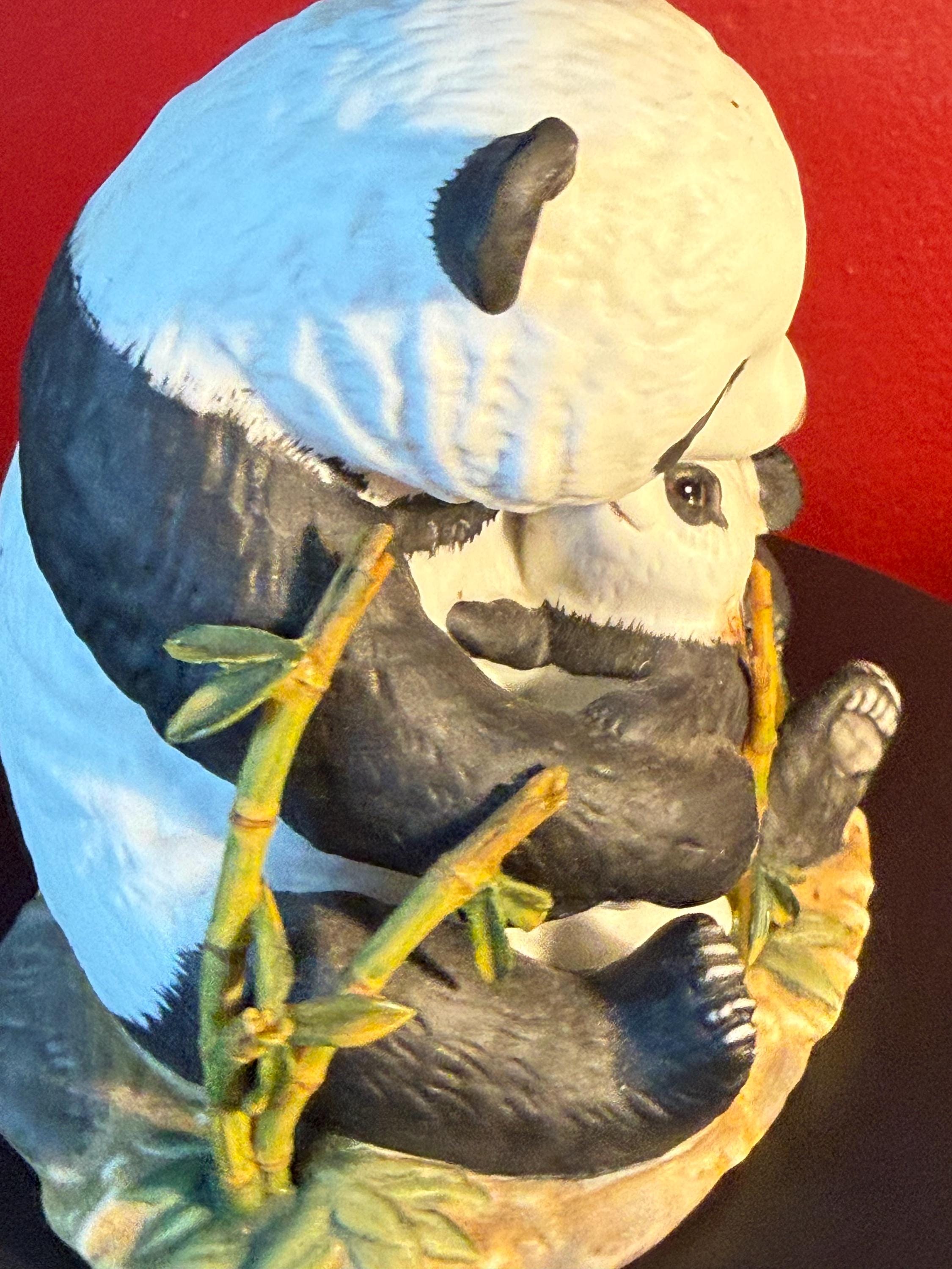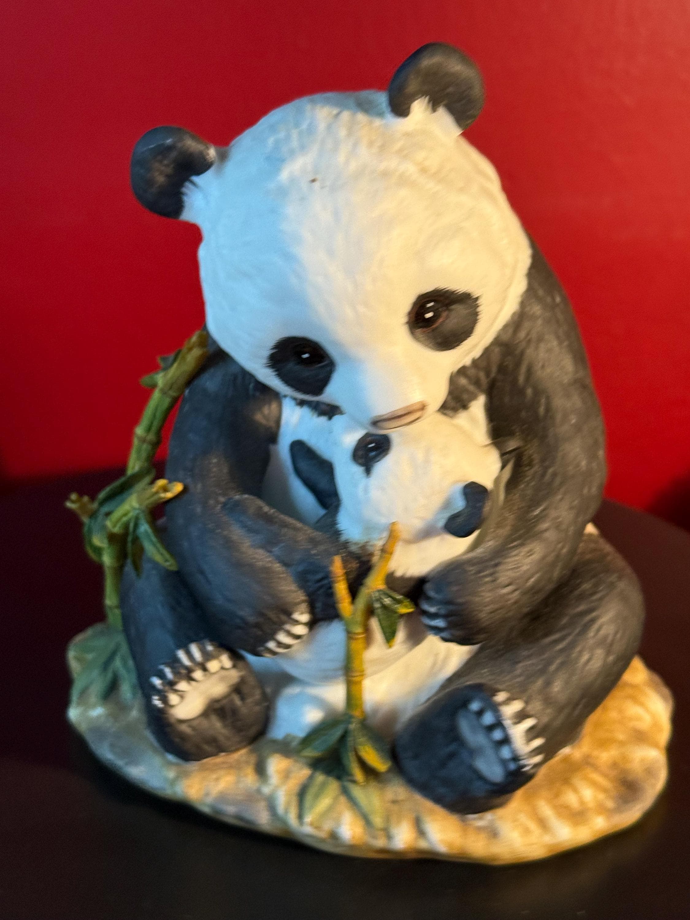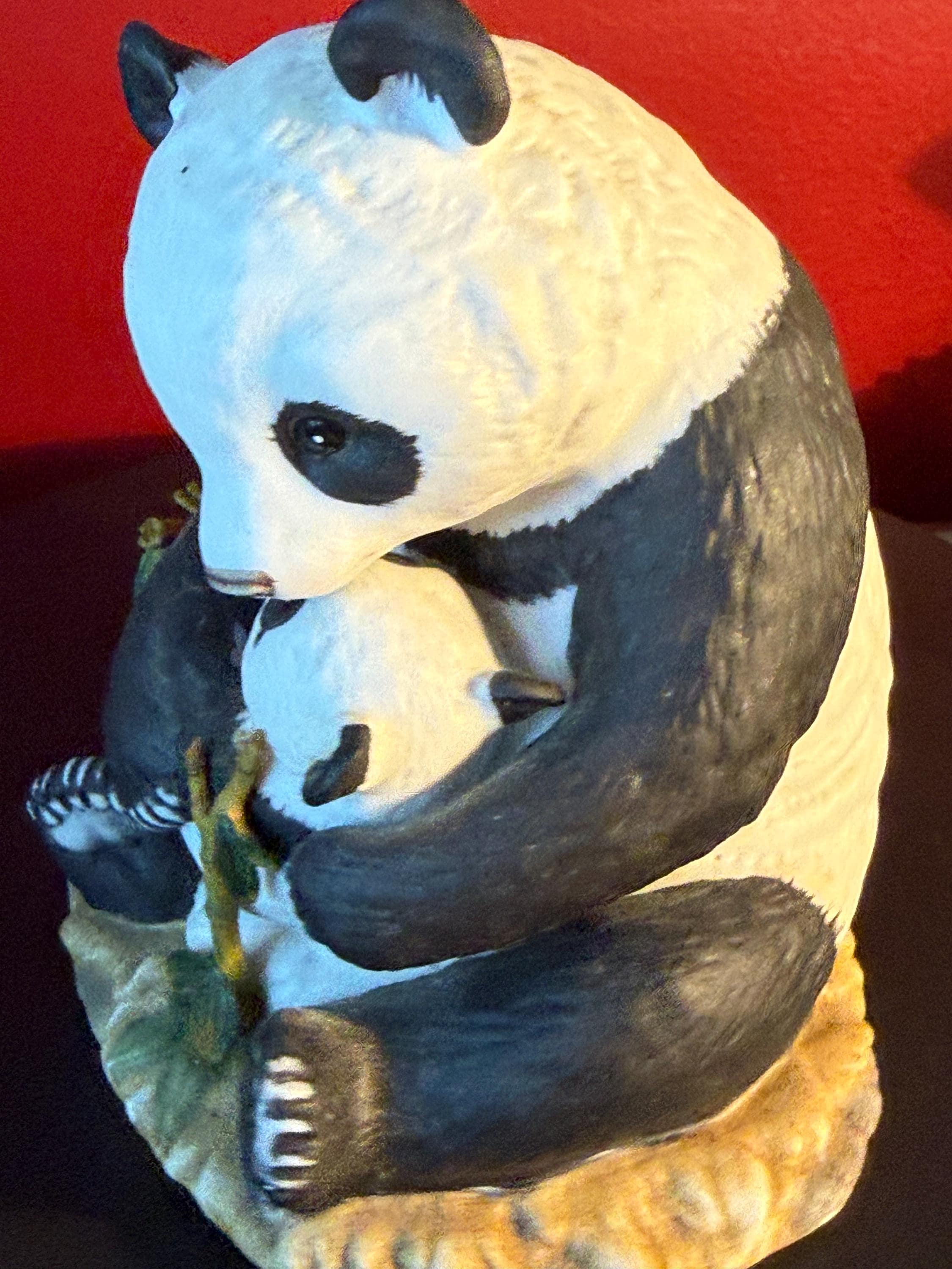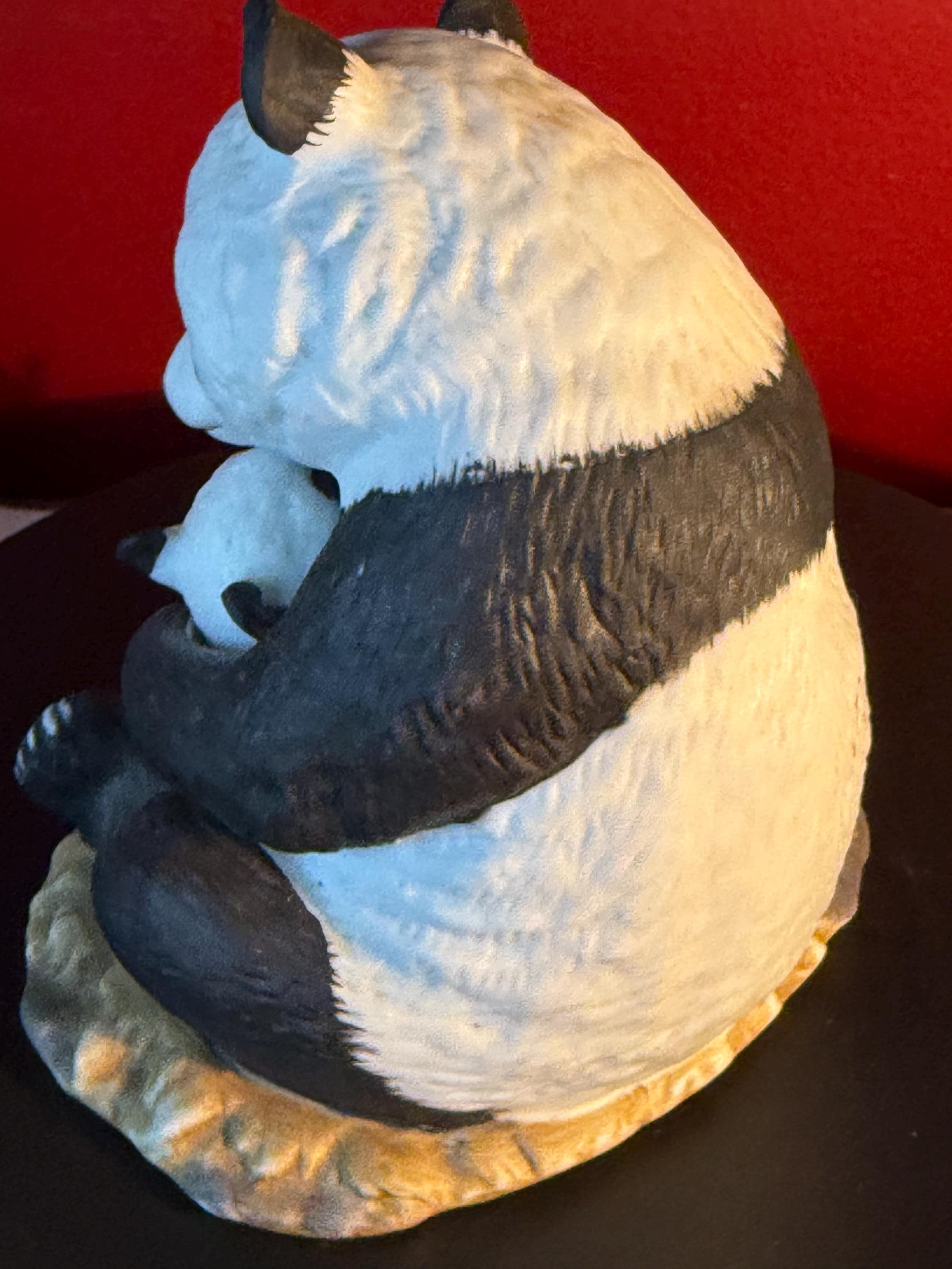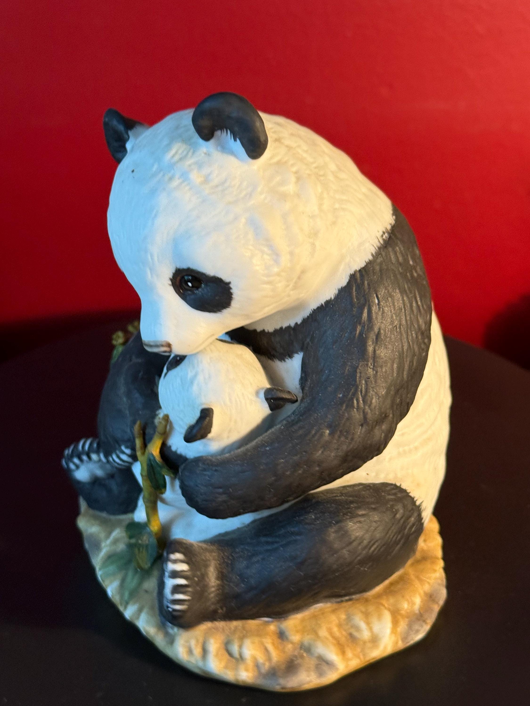 This Vintage Panda Bear Mother and Cub by Masterpiece Porcelain Homco is a charming collectible figurine that captures the tender moment between a panda mother and her cub. Crafted from high-quality porcelain and featuring exquisite black and white detailing, this piece is a beautiful example of Homco's artistry and attention to detail. The sculpted bamboo accents add to the naturalistic design, making it a perfect addition to any animal lover's collection.